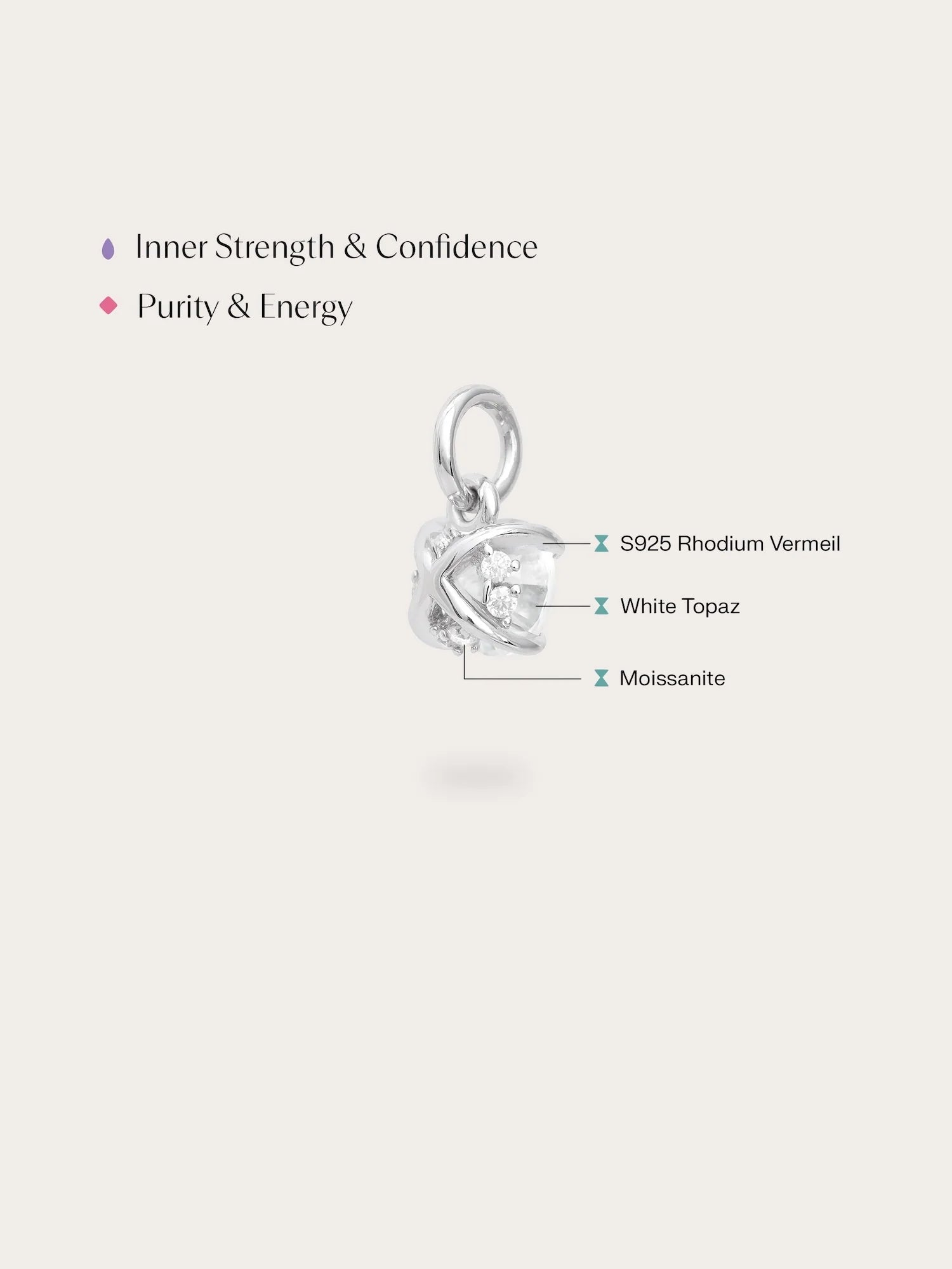 Adding a modern twist, the charm features a hidden "X" design on the back. Accent moissanite stones are delicately set to peek out from beneath the focal stone. These embellishments create a dazzling profile, adding depth and brilliance to this meaningful piece. Handcrafted in S925 rhodium vermeil.