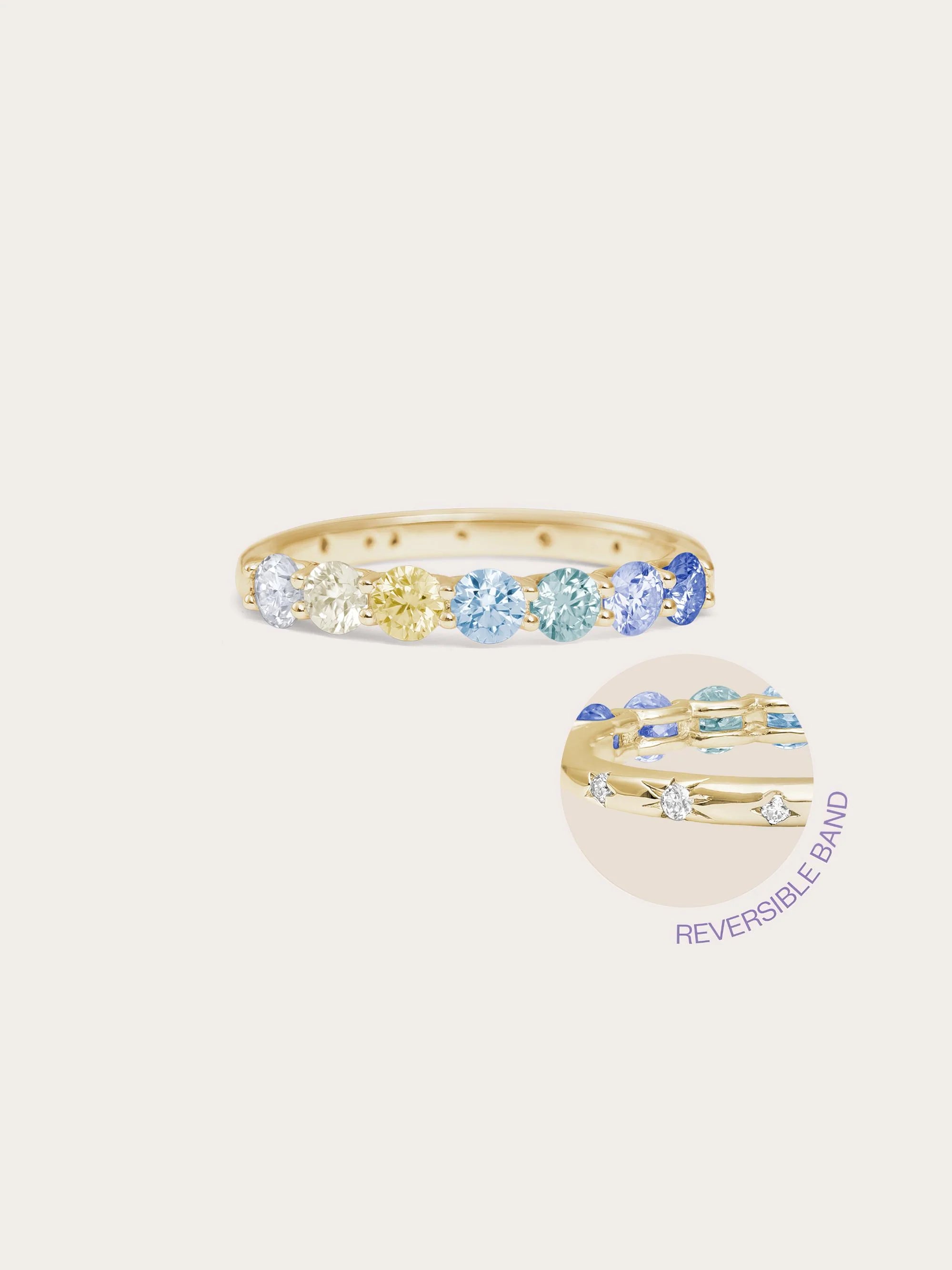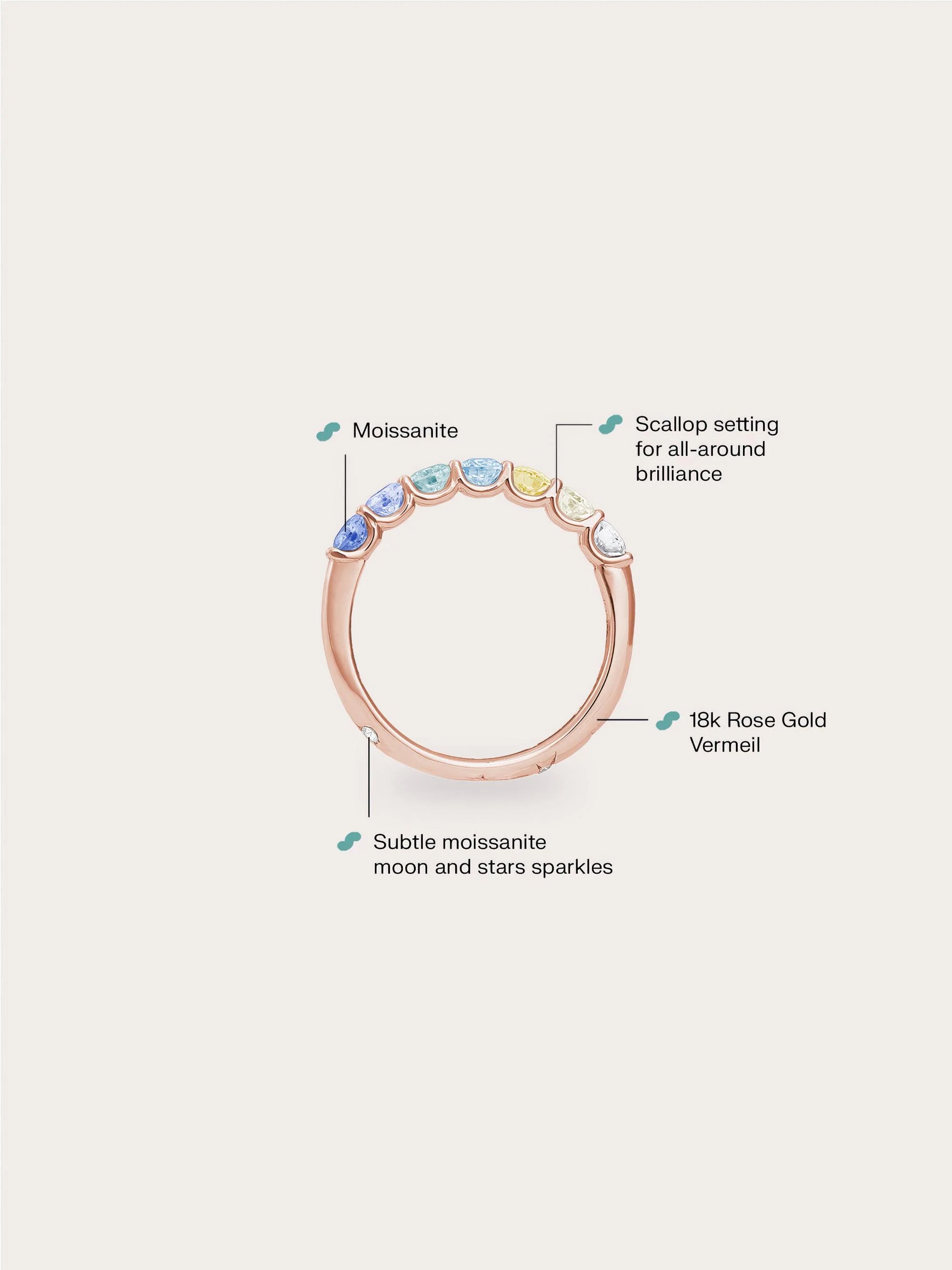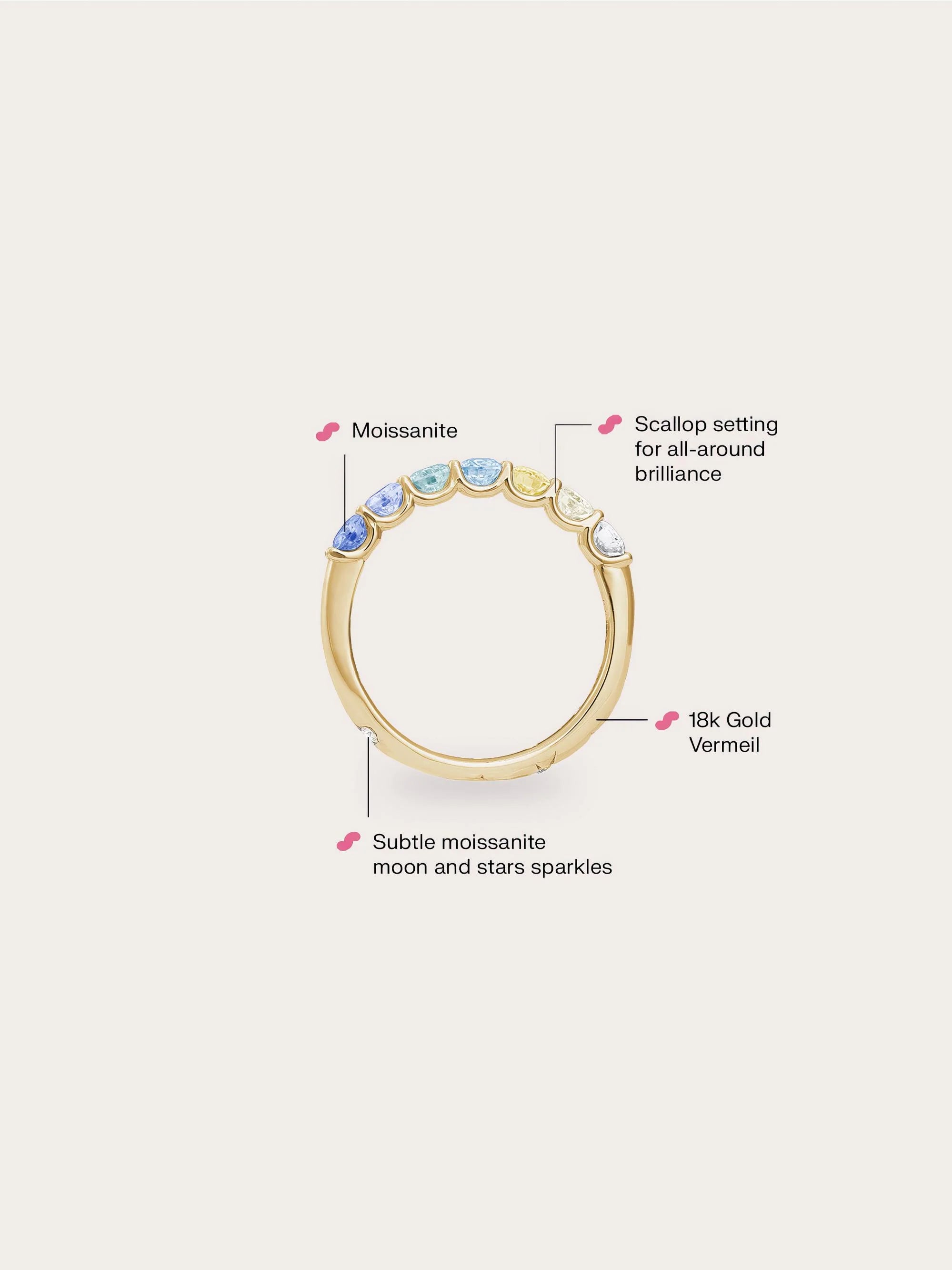 Immerse yourself in coastal allure with this beach-themed moissanite eternity band. It features a gradient of bright blue, cyan, and yellow moissanites, bringing to mind the allure of beach strolls, whether taken solo or with a special someone. Handmade in 18k gold vermeil.