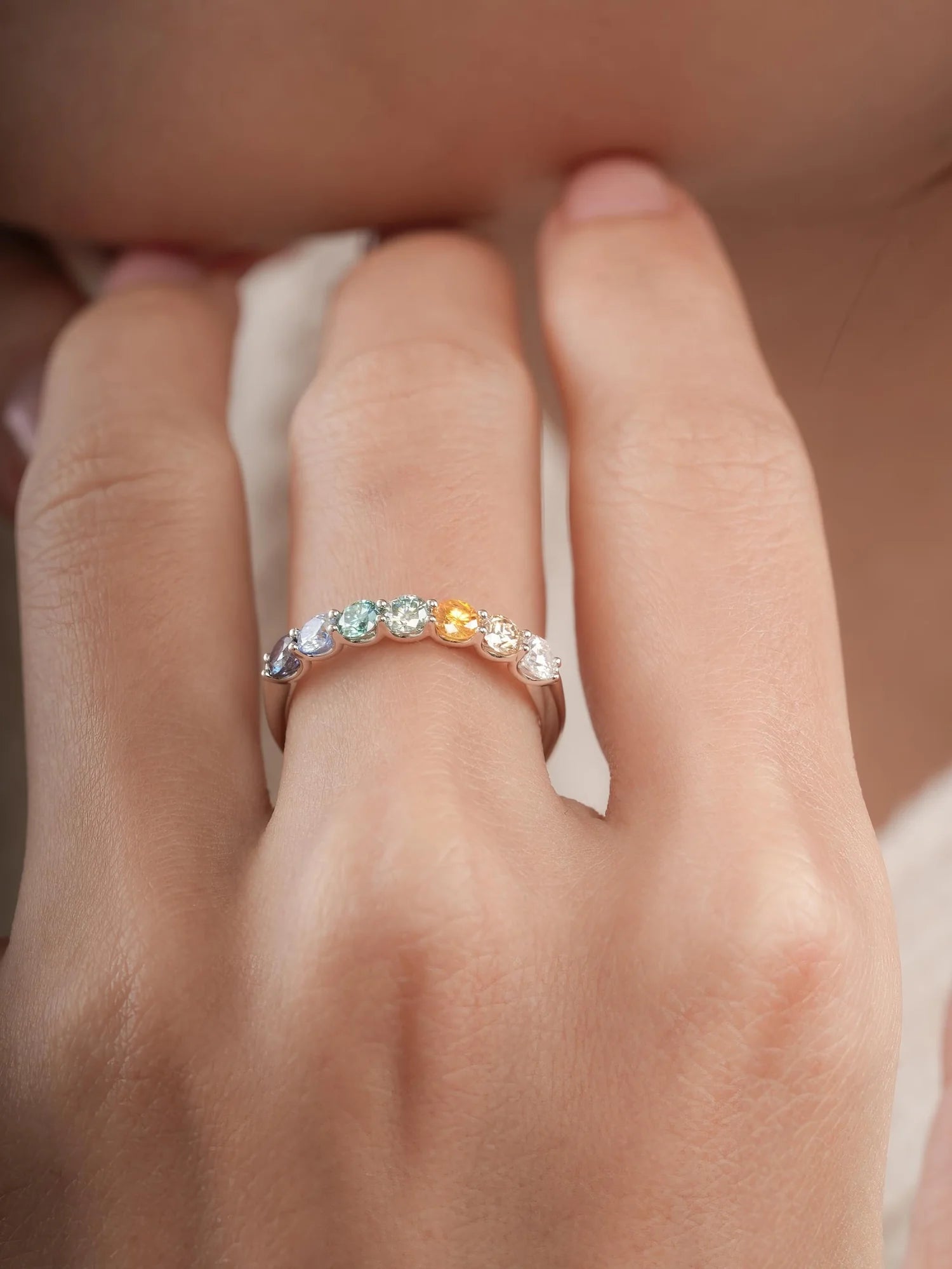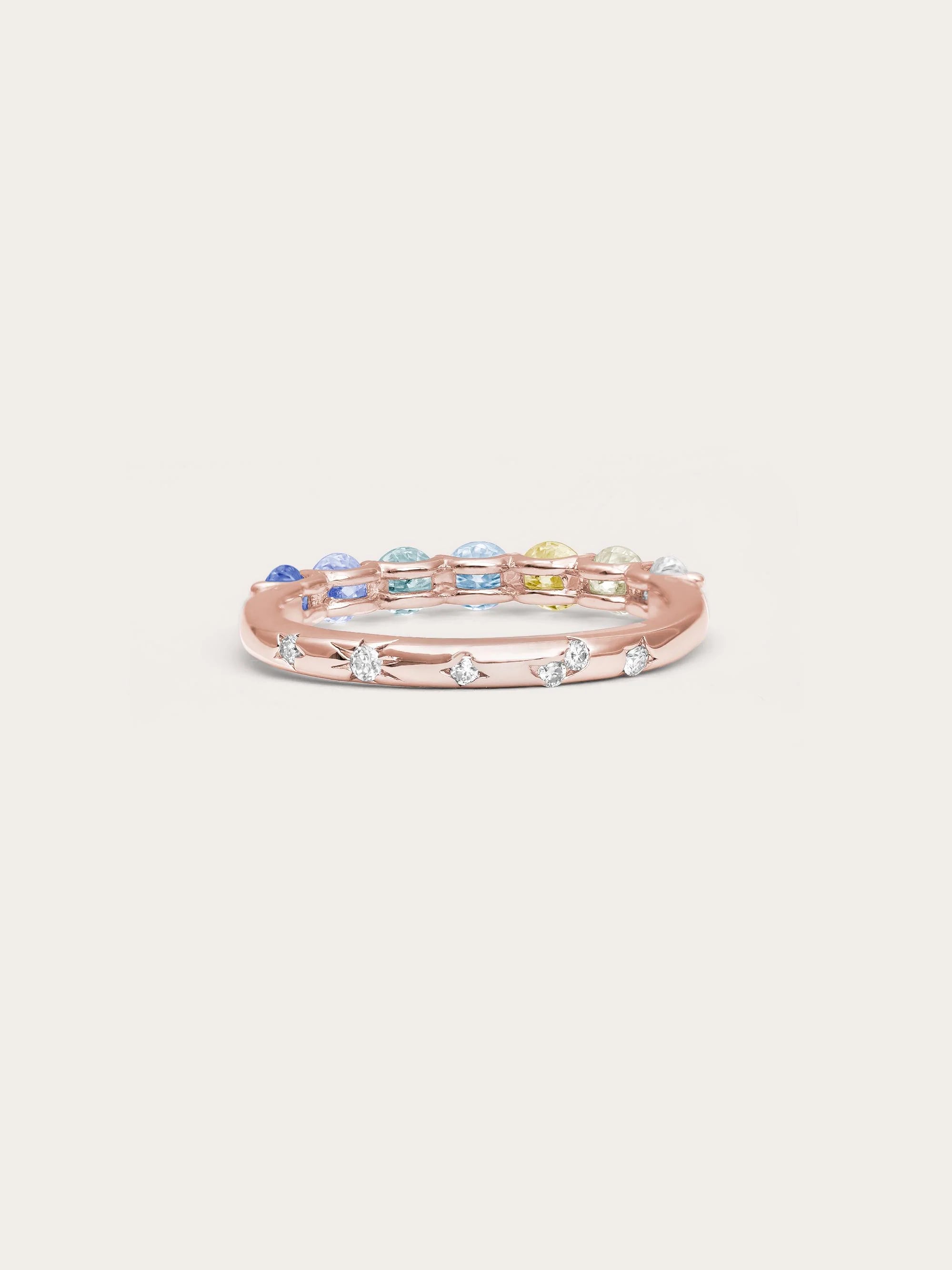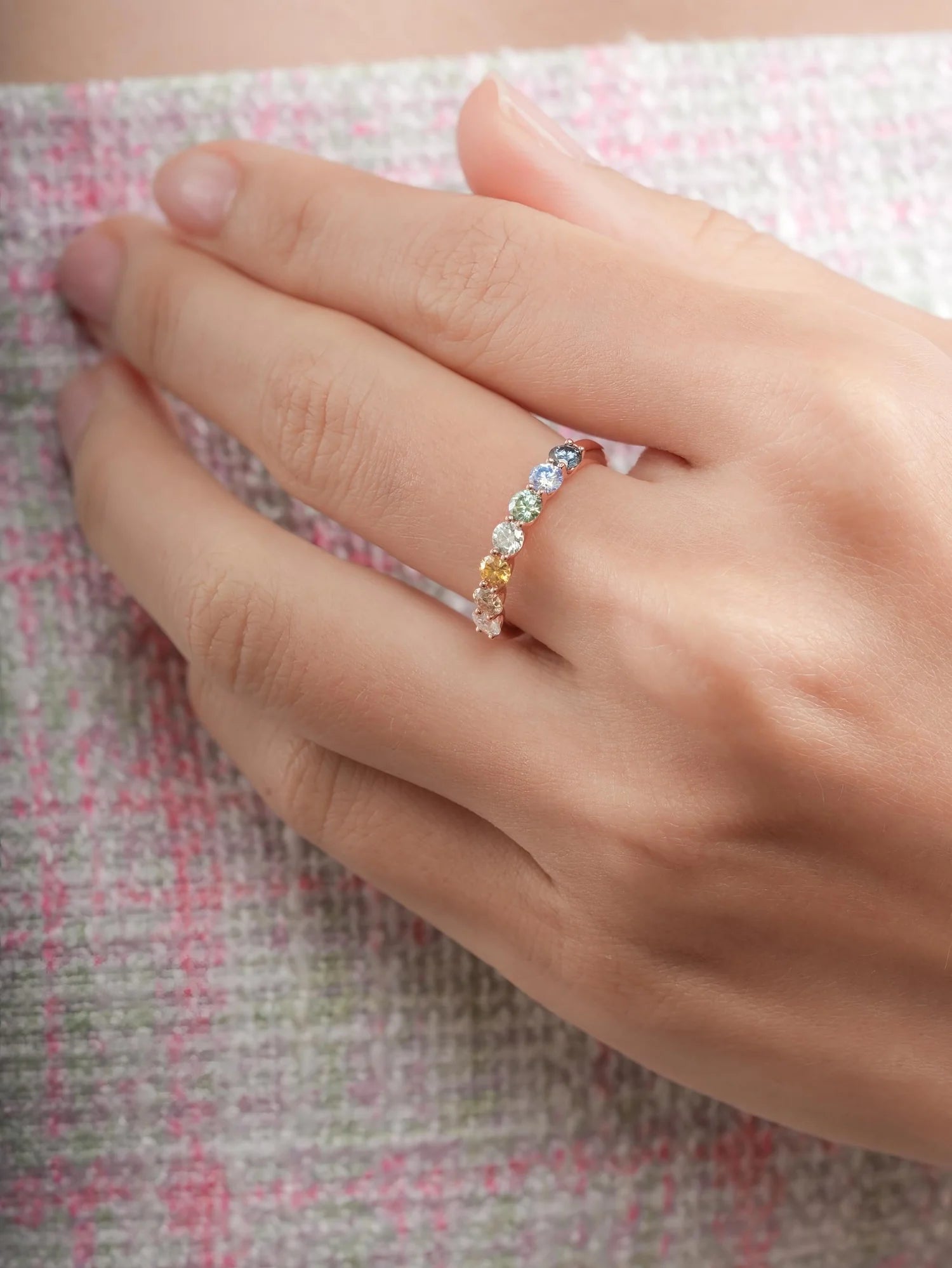 Immerse yourself in coastal allure with this beach-themed moissanite eternity band. It features a gradient of bright blue, cyan, and yellow moissanites, bringing to mind the allure of beach strolls, whether taken solo or with a special someone. Handmade in 18k gold vermeil.