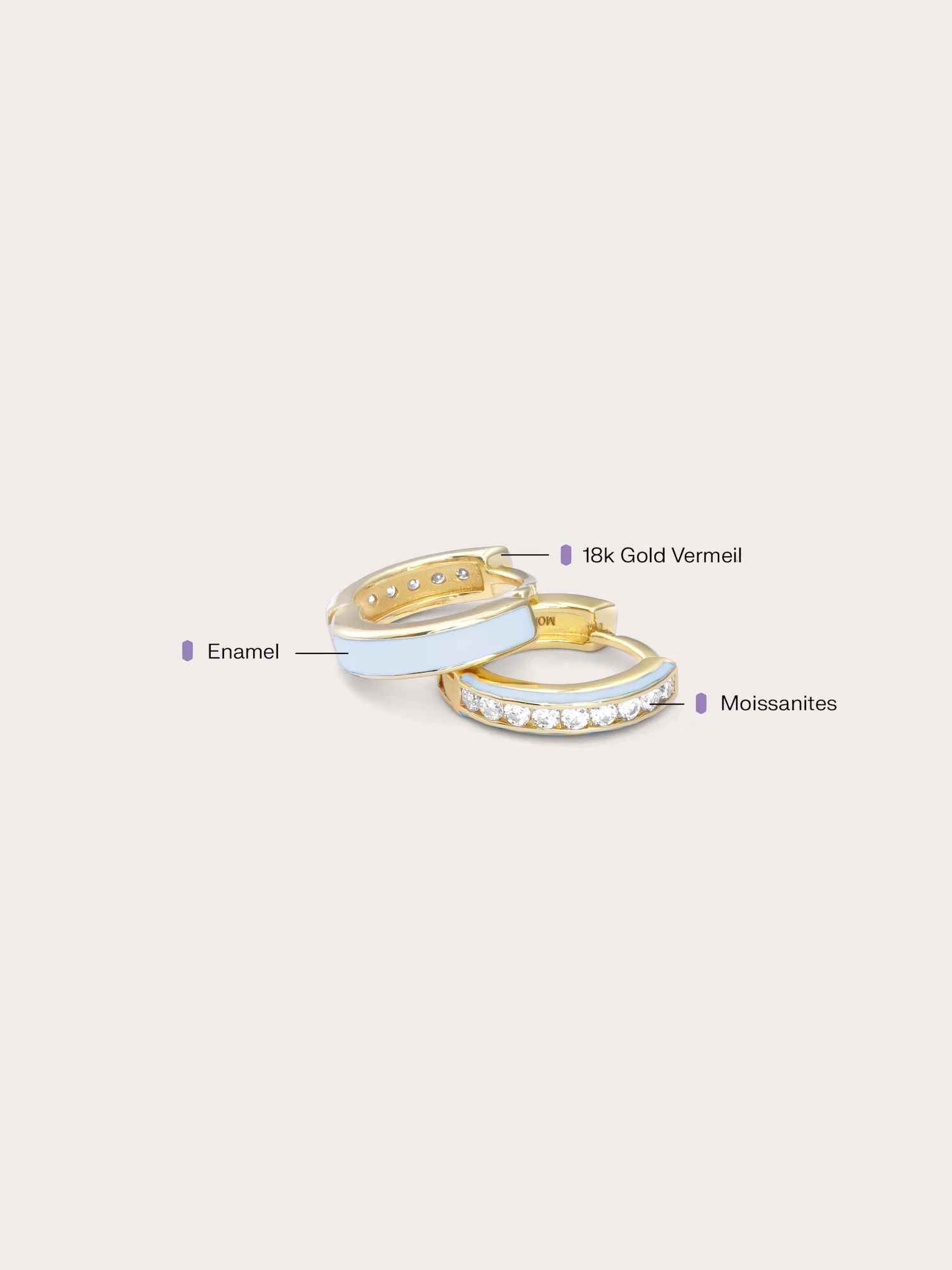 The blue enamel moissanite reversible huggie earrings offer two styles in a single piece. You can wear these reversible huggie earrings in two ways: one side sparkles with pavé moissanites (accented with a touch of color), and the other side features a simple pastel blue enamel finish. They are hand - crafted with 18k gold vermeil.