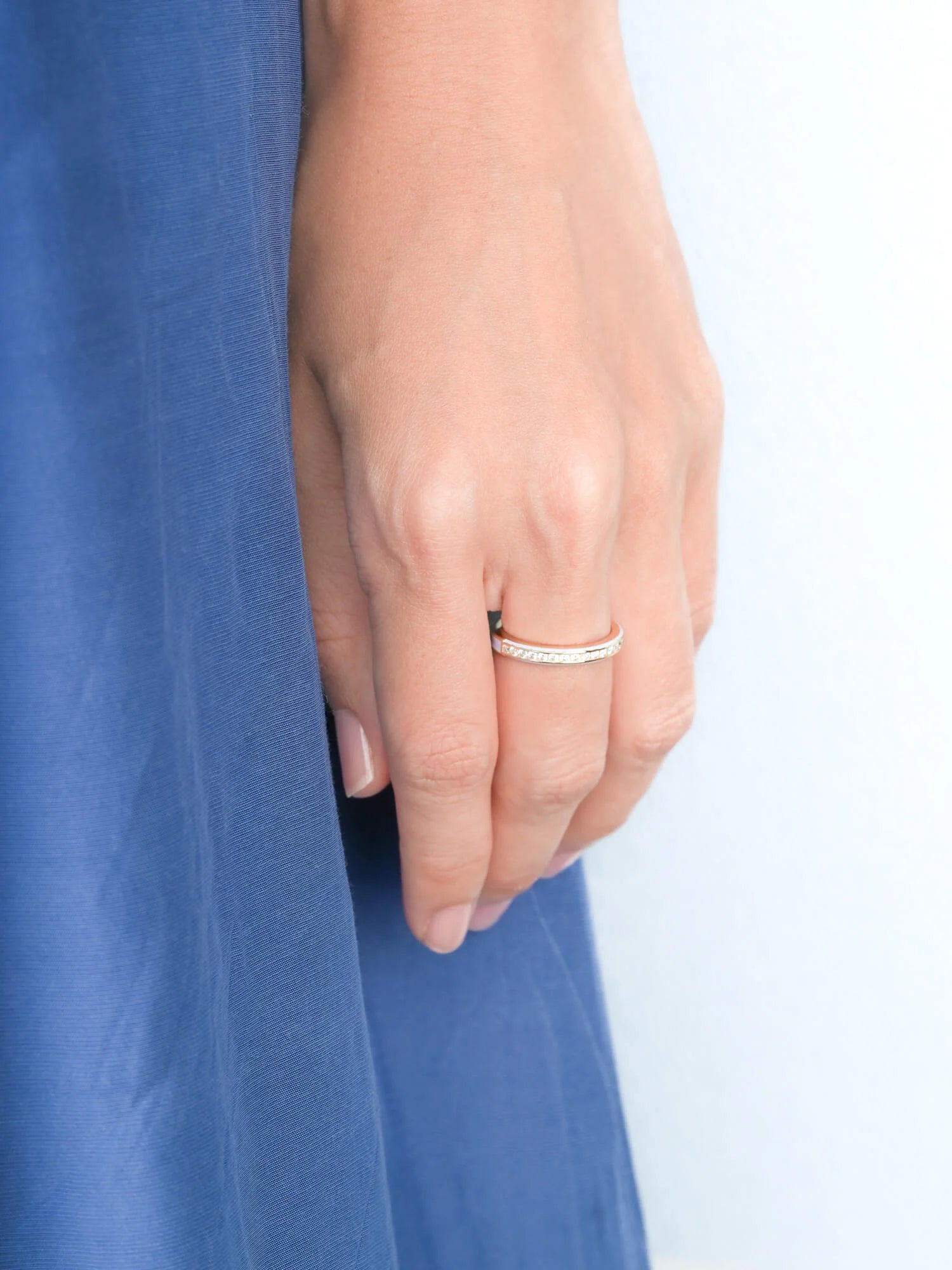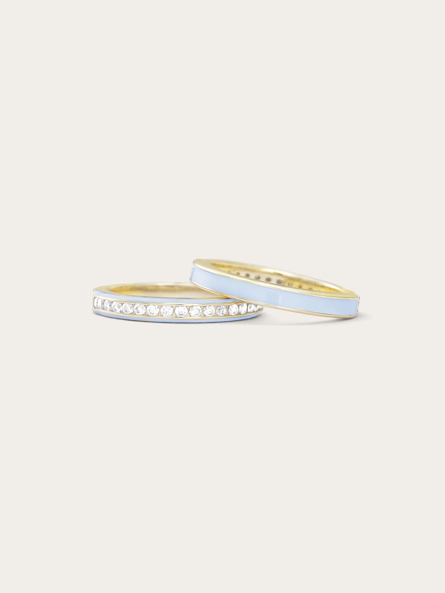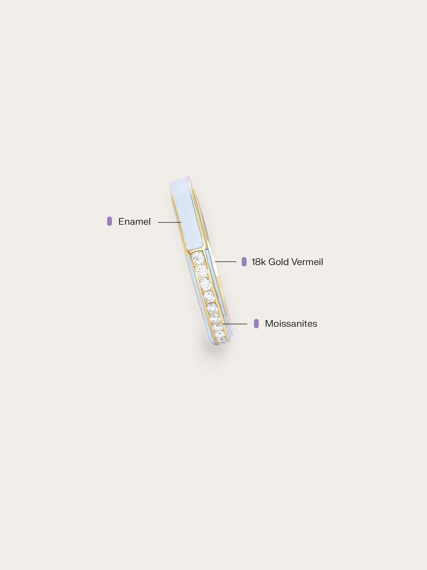 This reversible blue enamel ring offers two styles in one piece. One side has a smooth pastel blue enamel surface, and the other side is adorned with a row of pavé moissanites that sparkle brightly. It is hand - crafted using 18k gold vermeil.