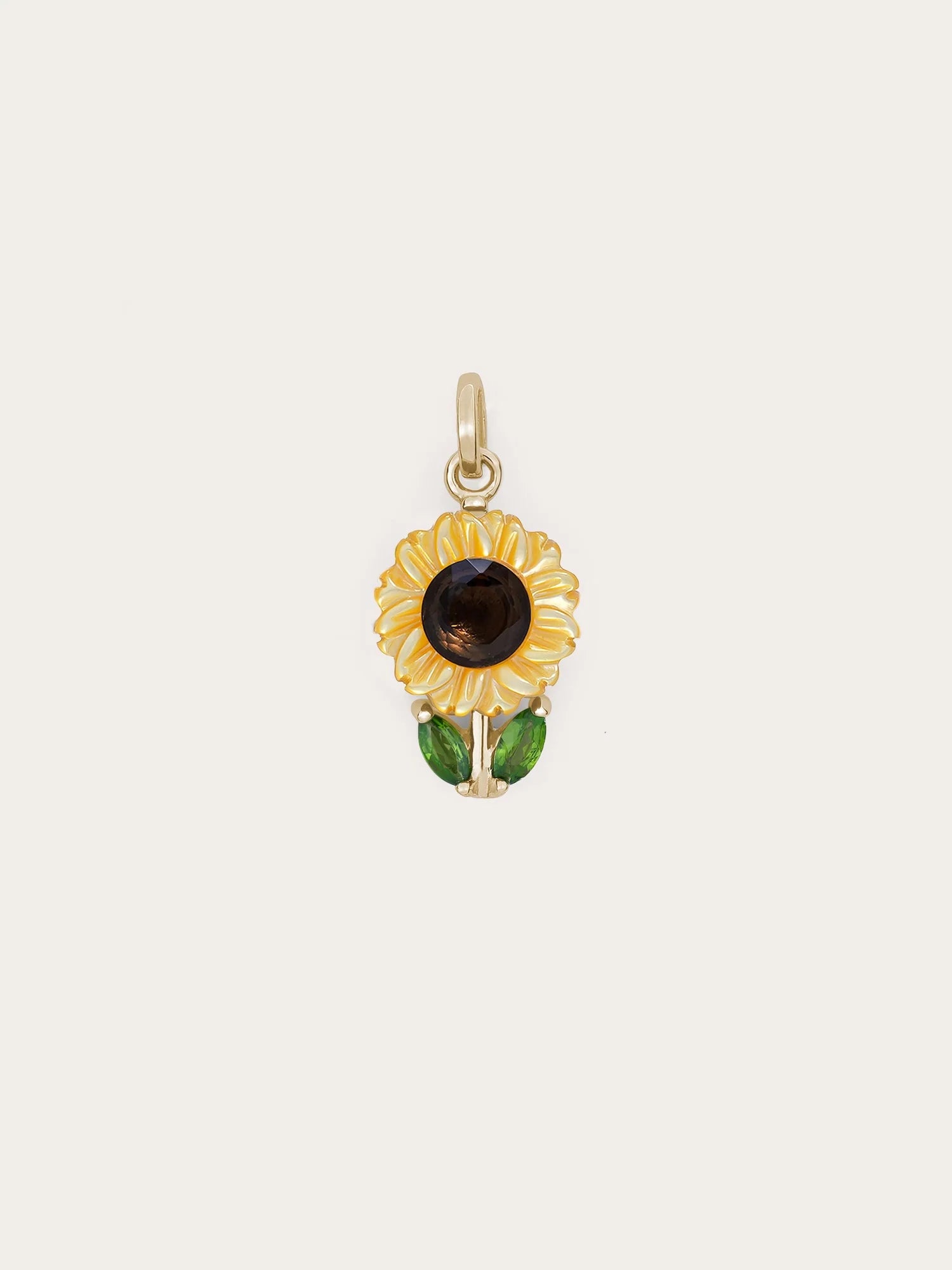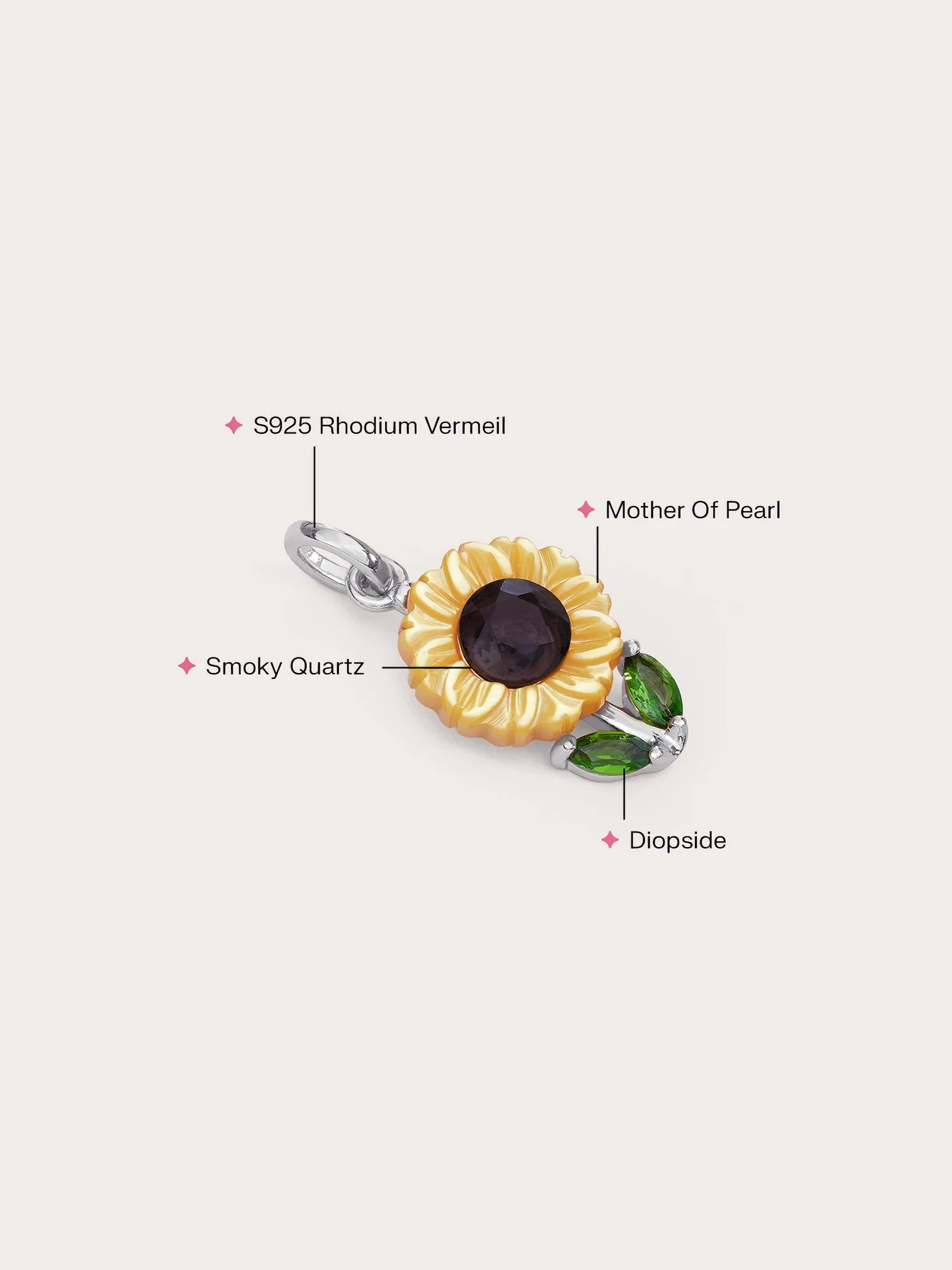 This hand-carved floral charm is made from mother-of-pearl, featuring a smoky quartz center and colored leaves to add color and texture. It's handcrafted with a gold-plated finish.