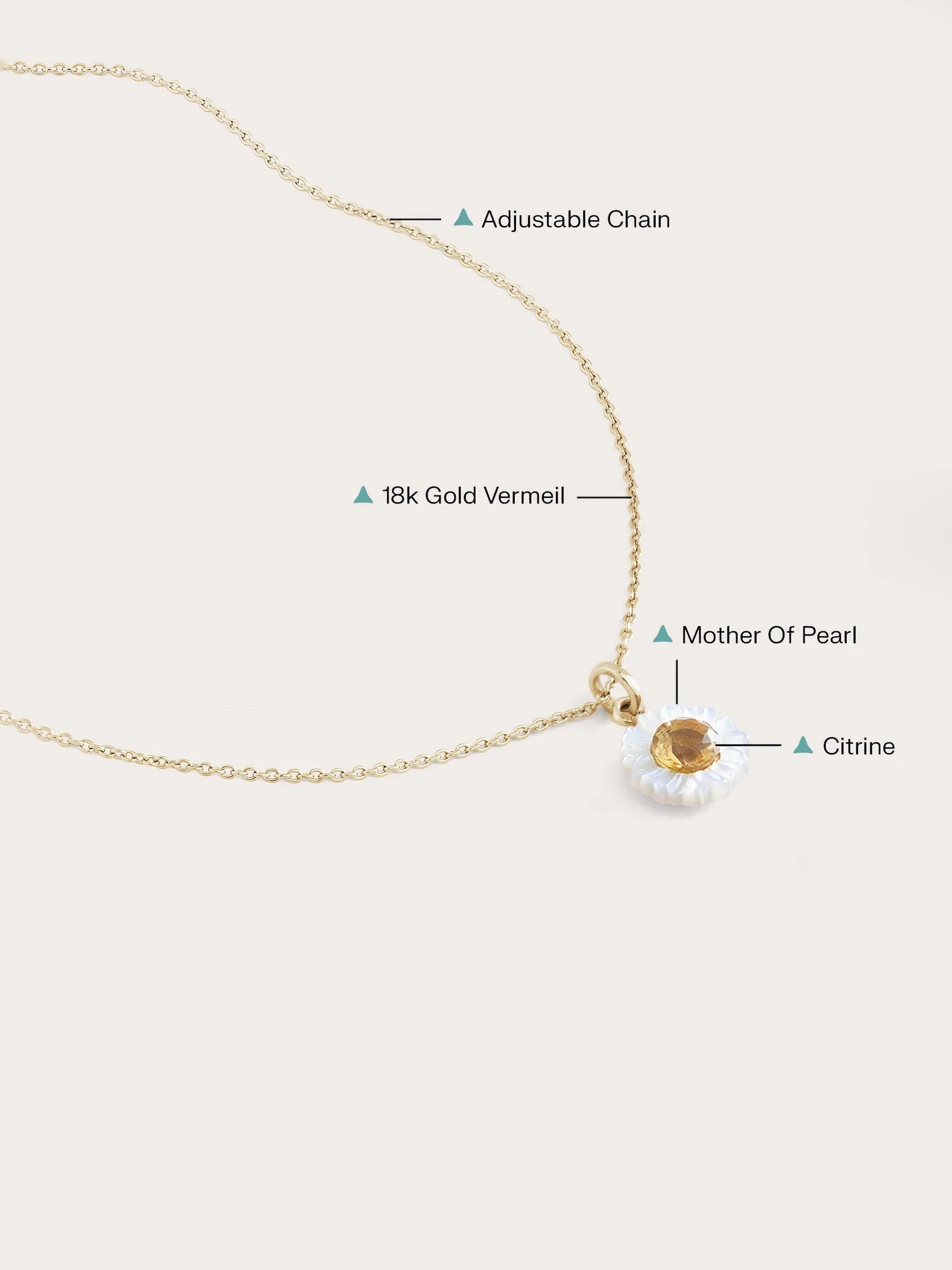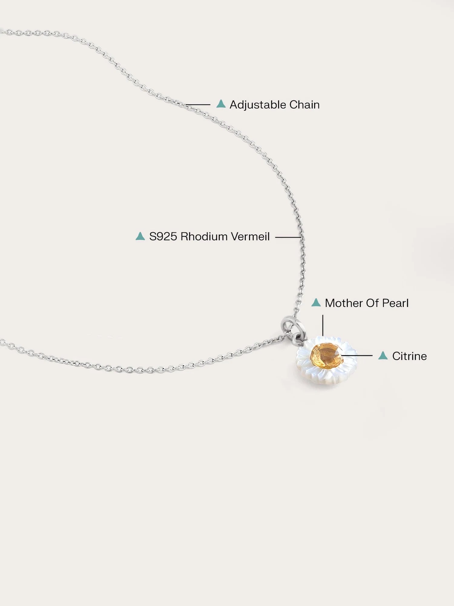 The pendant is attached to an adjustable necklace that can be set to various lengths. A small, glittering stone dangles at the end of the necklace, adding a sparkle to your neck. Click here to view how the necklace looks at different lengths.