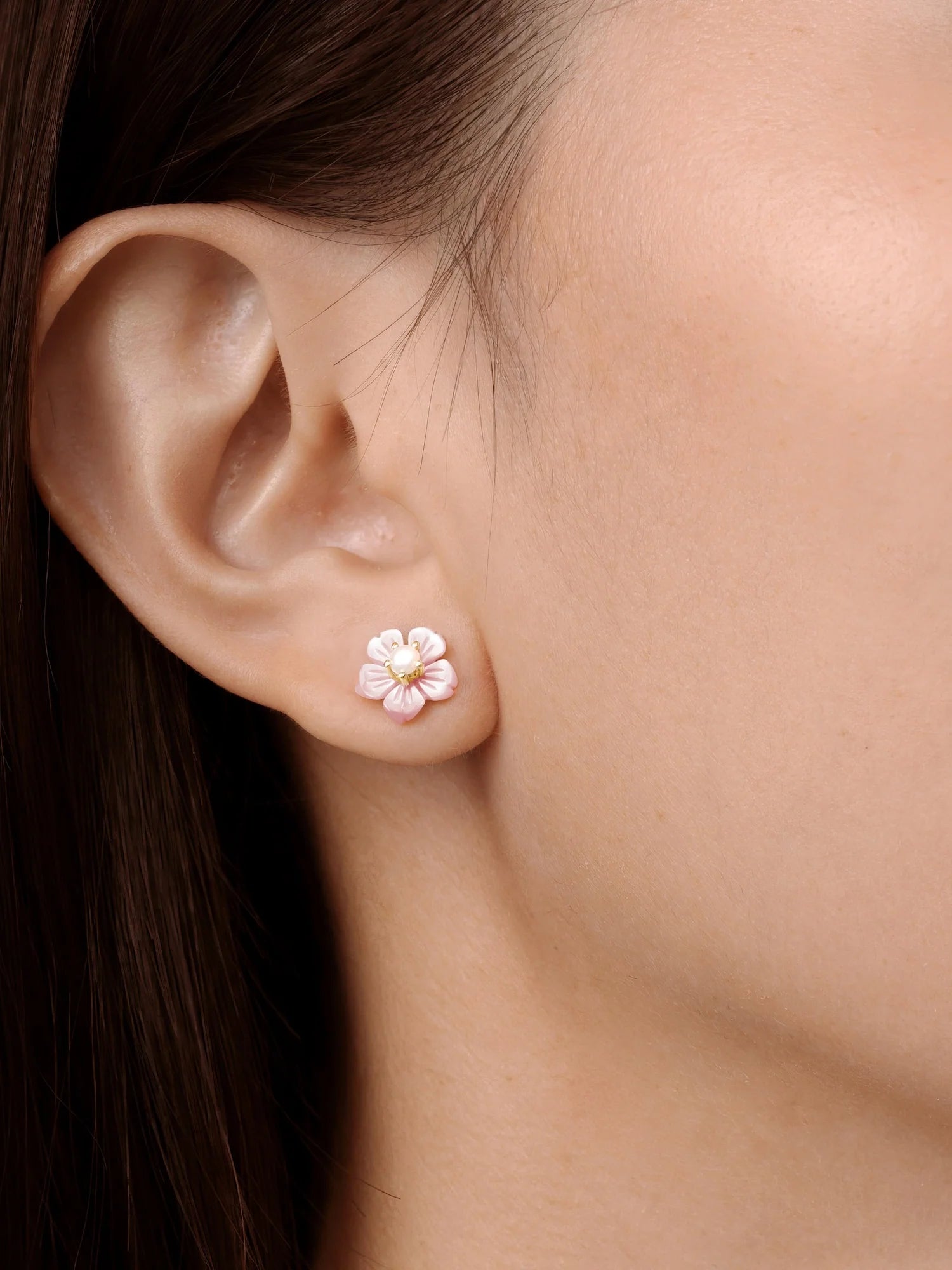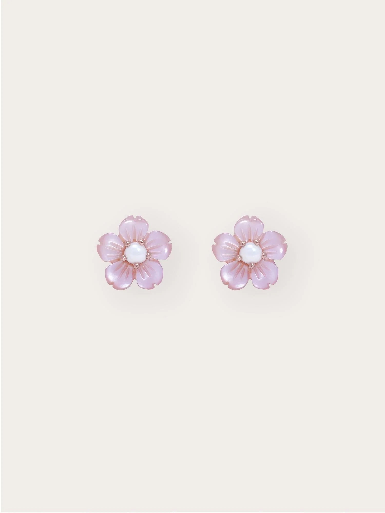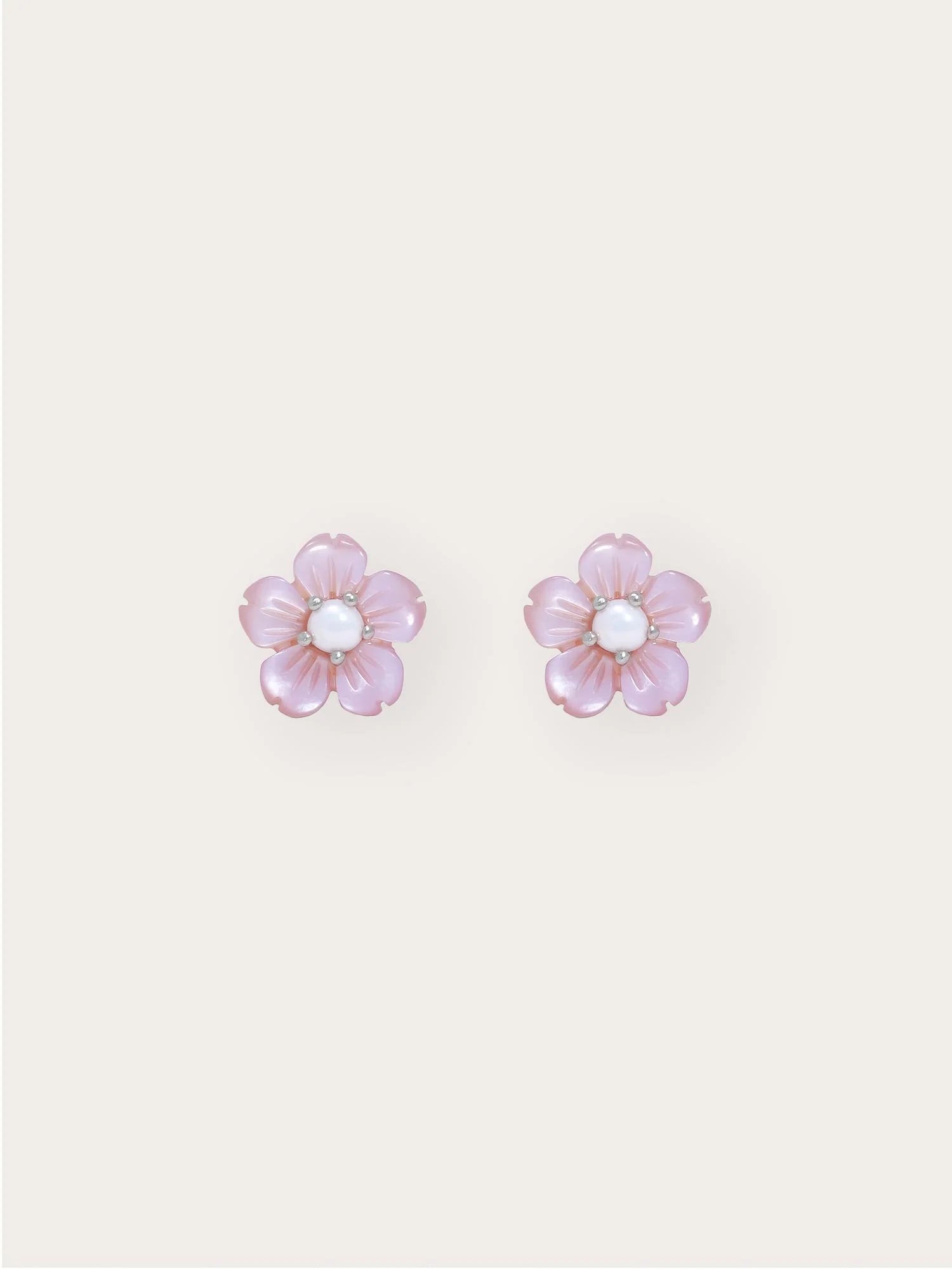 These carved flower stud earrings are hand-carved from mother-of-pearl, capturing the timeless beauty of a flower. A freshwater pearl in the center adds a delicate, feminine touch. Handcrafted with a gold-plated finish.