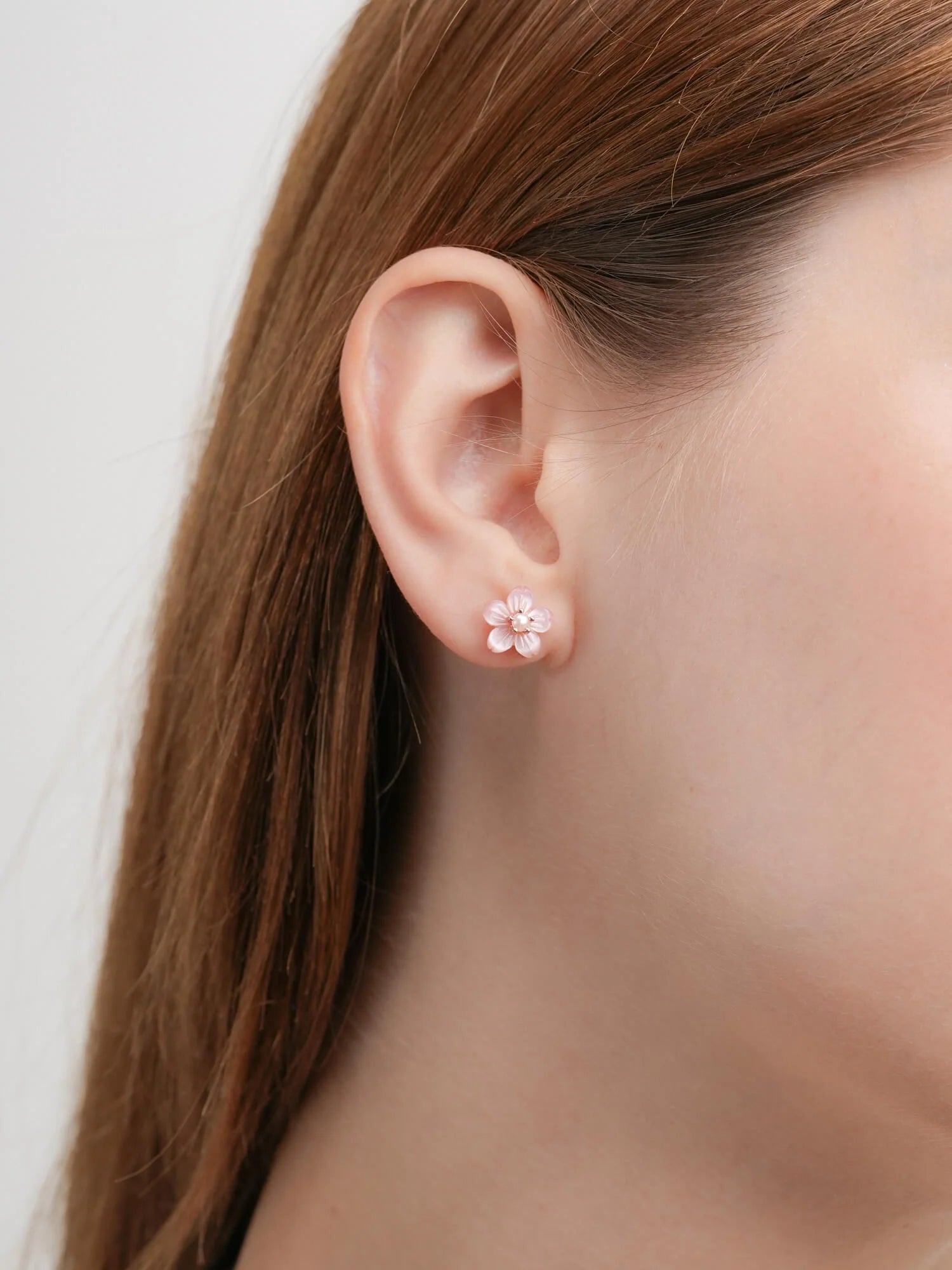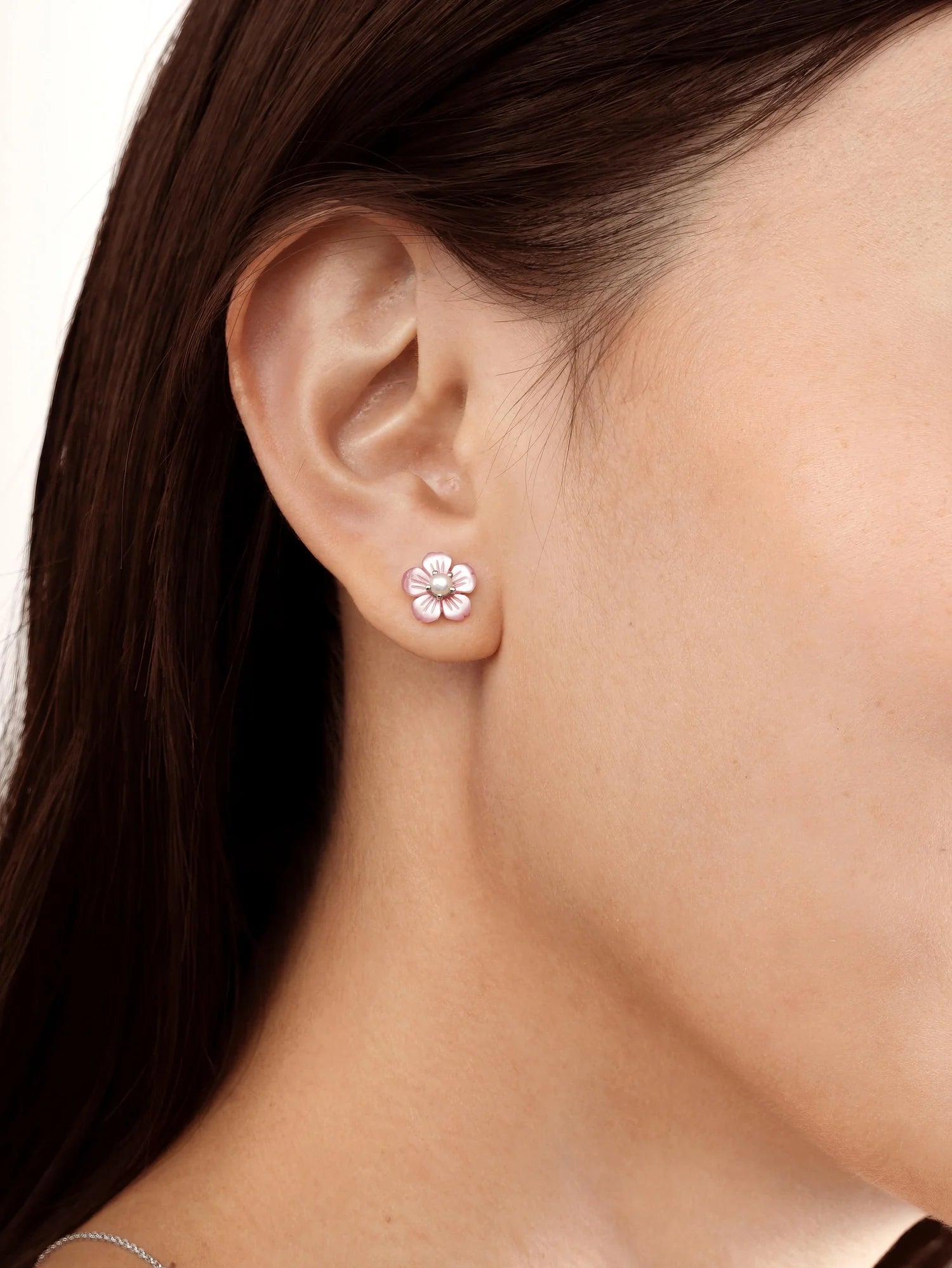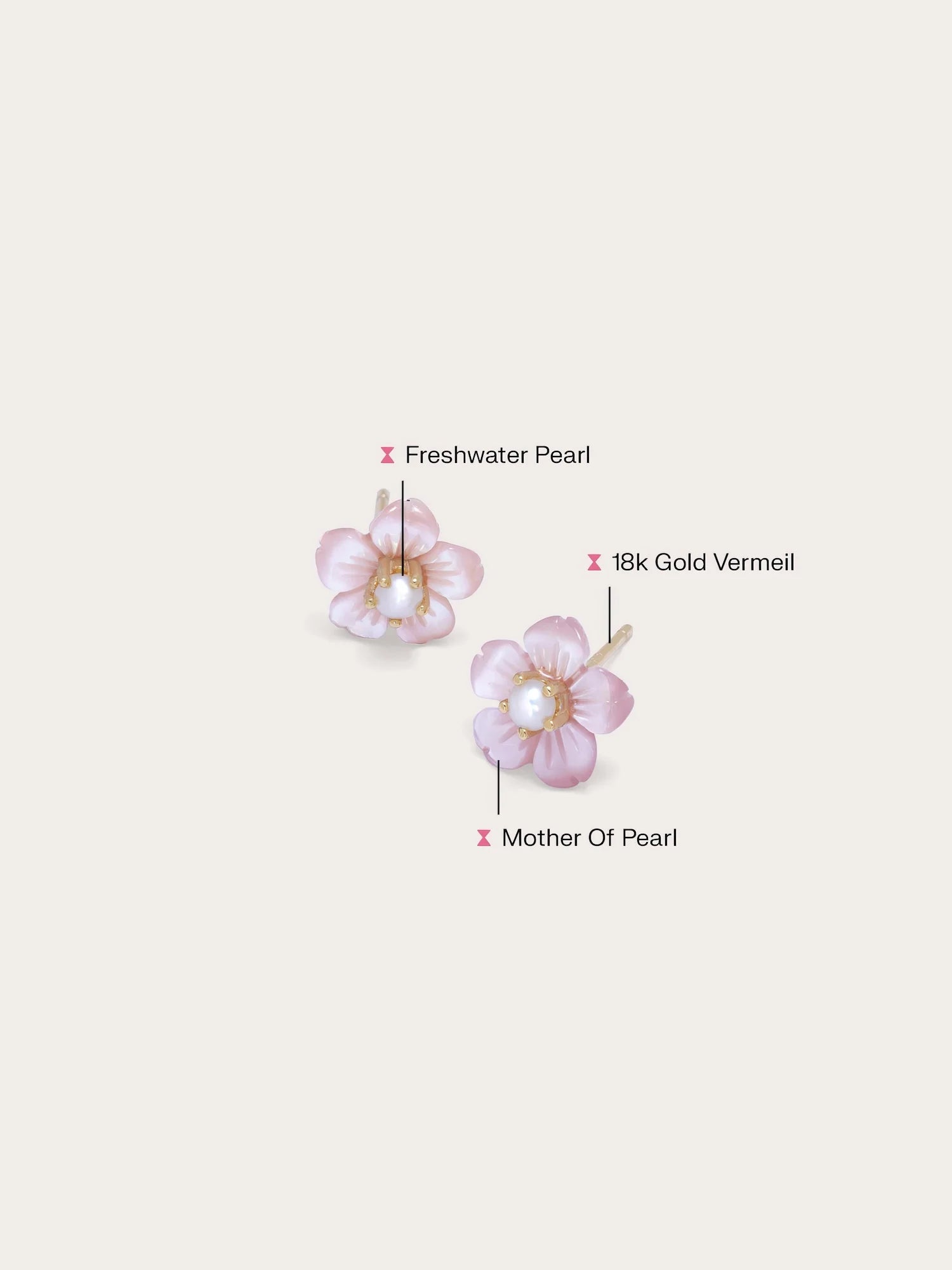 These carved flower stud earrings are hand-carved from mother-of-pearl, capturing the timeless beauty of a flower. A freshwater pearl in the center adds a delicate, feminine touch. Handcrafted with a gold-plated finish.
