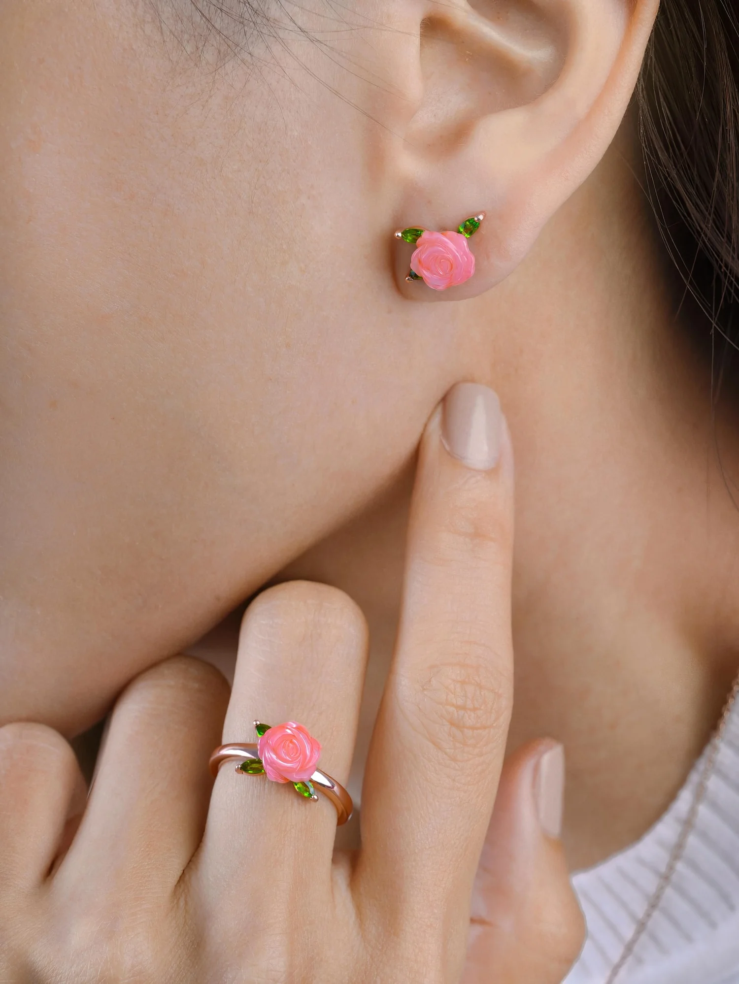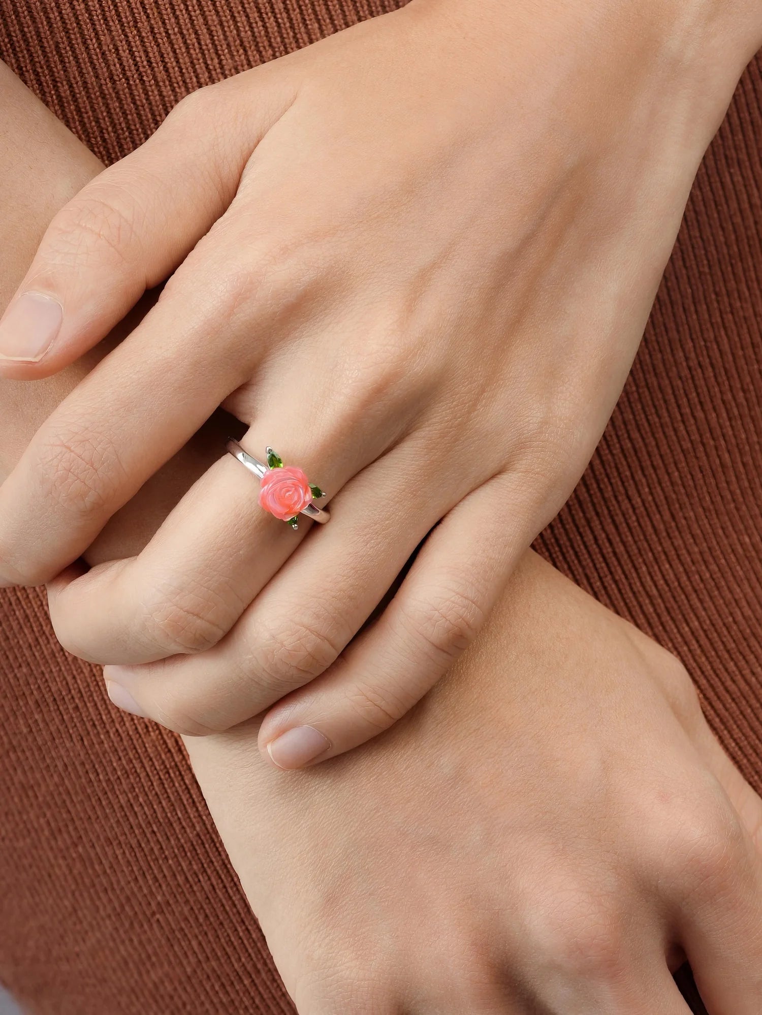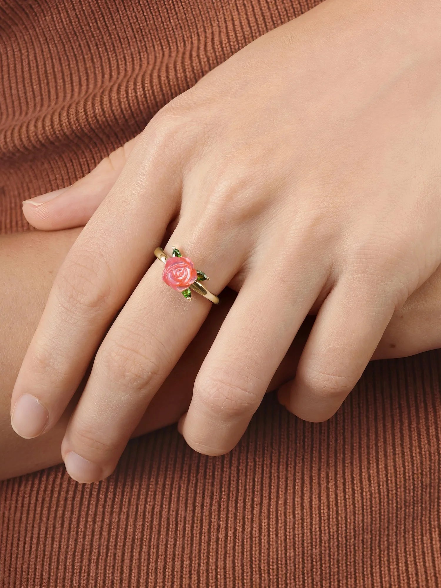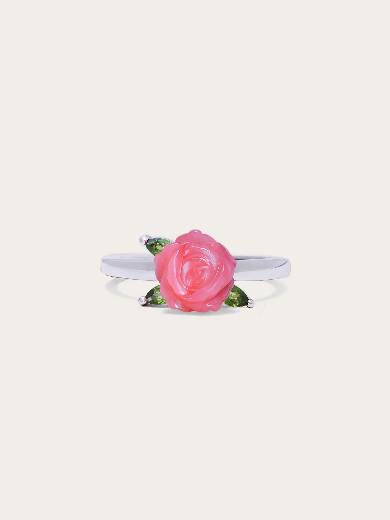 Let your charm shine with this carved rose ring. It features mother - of - pearl intricately carved into an elegant rose shape, with accent stones resembling leaves. Handmade with 18k rose gold vermeil.