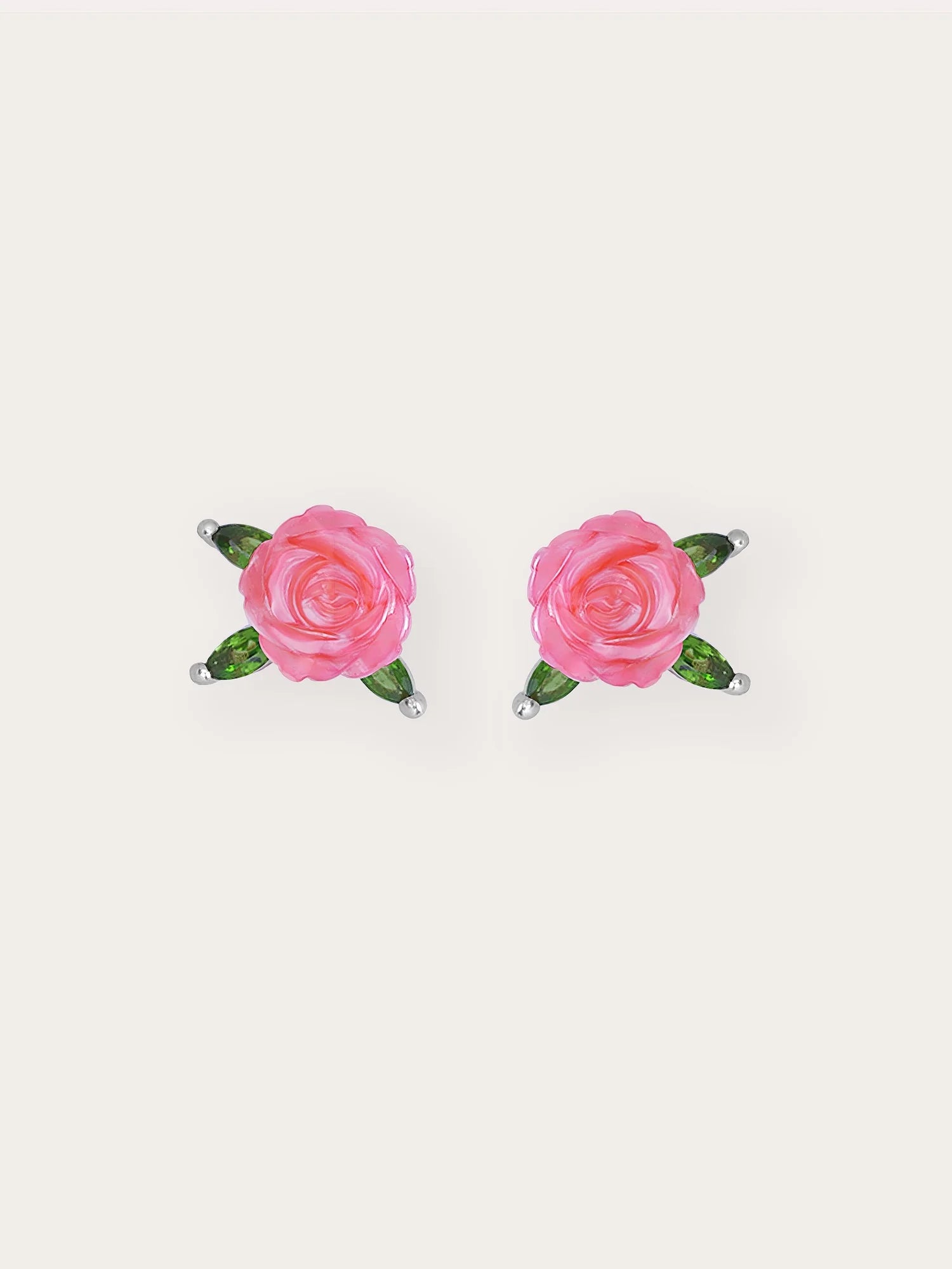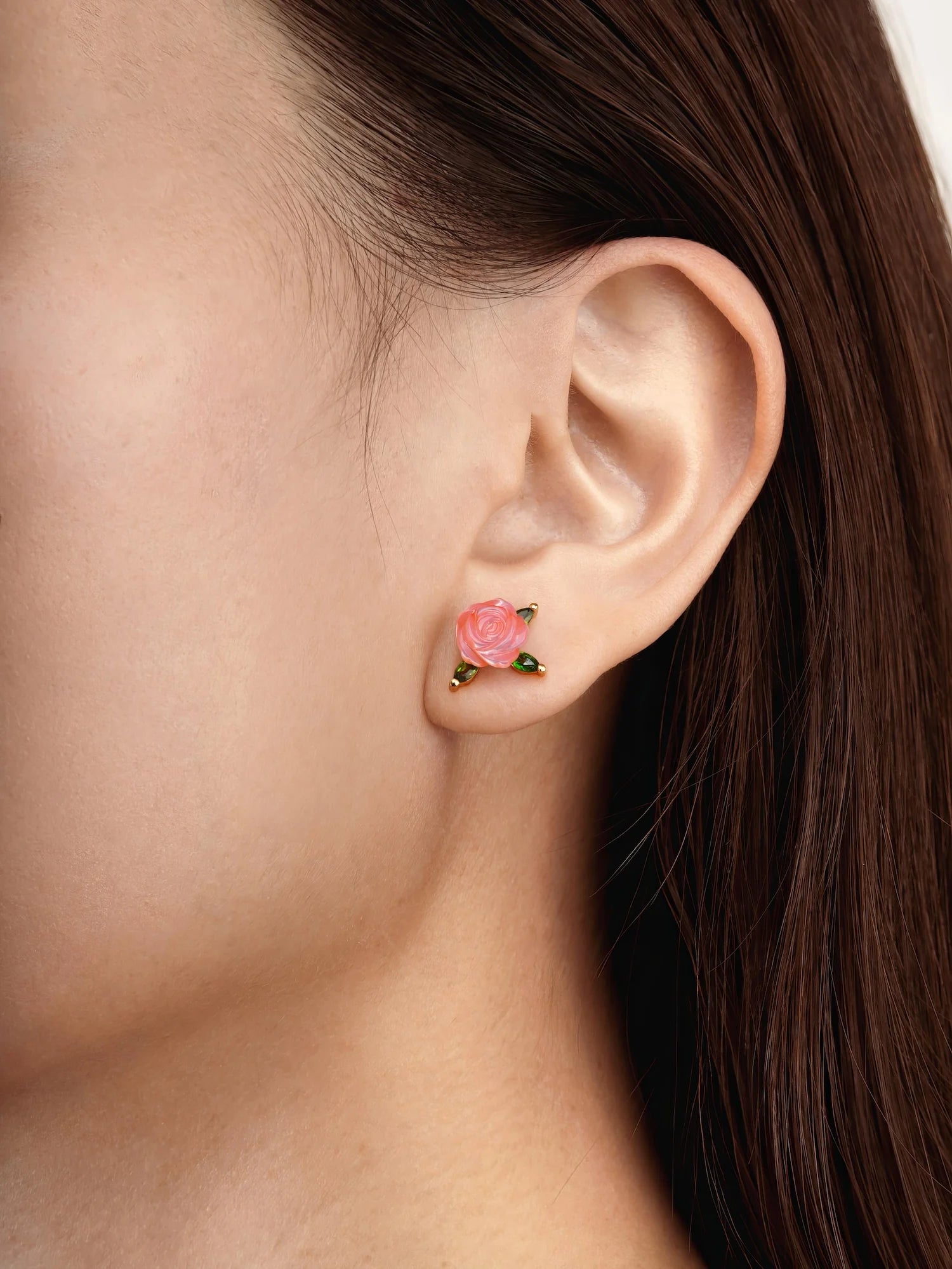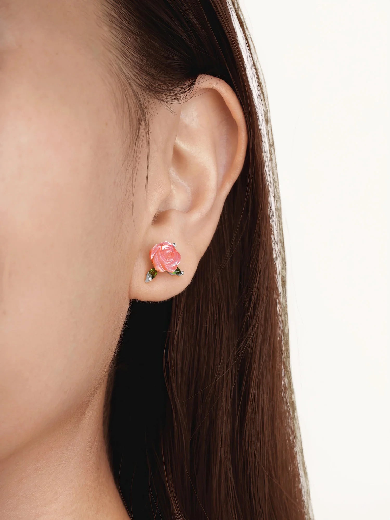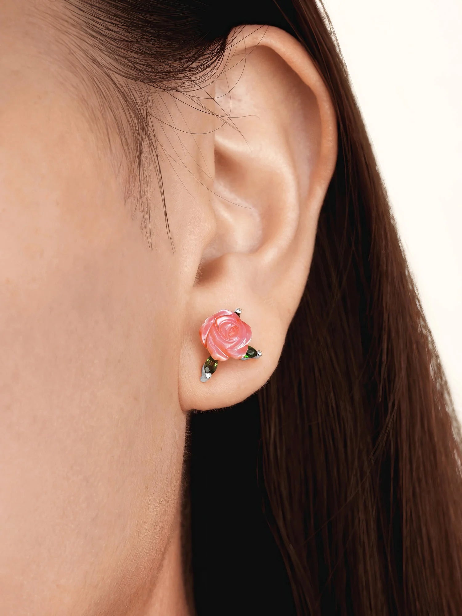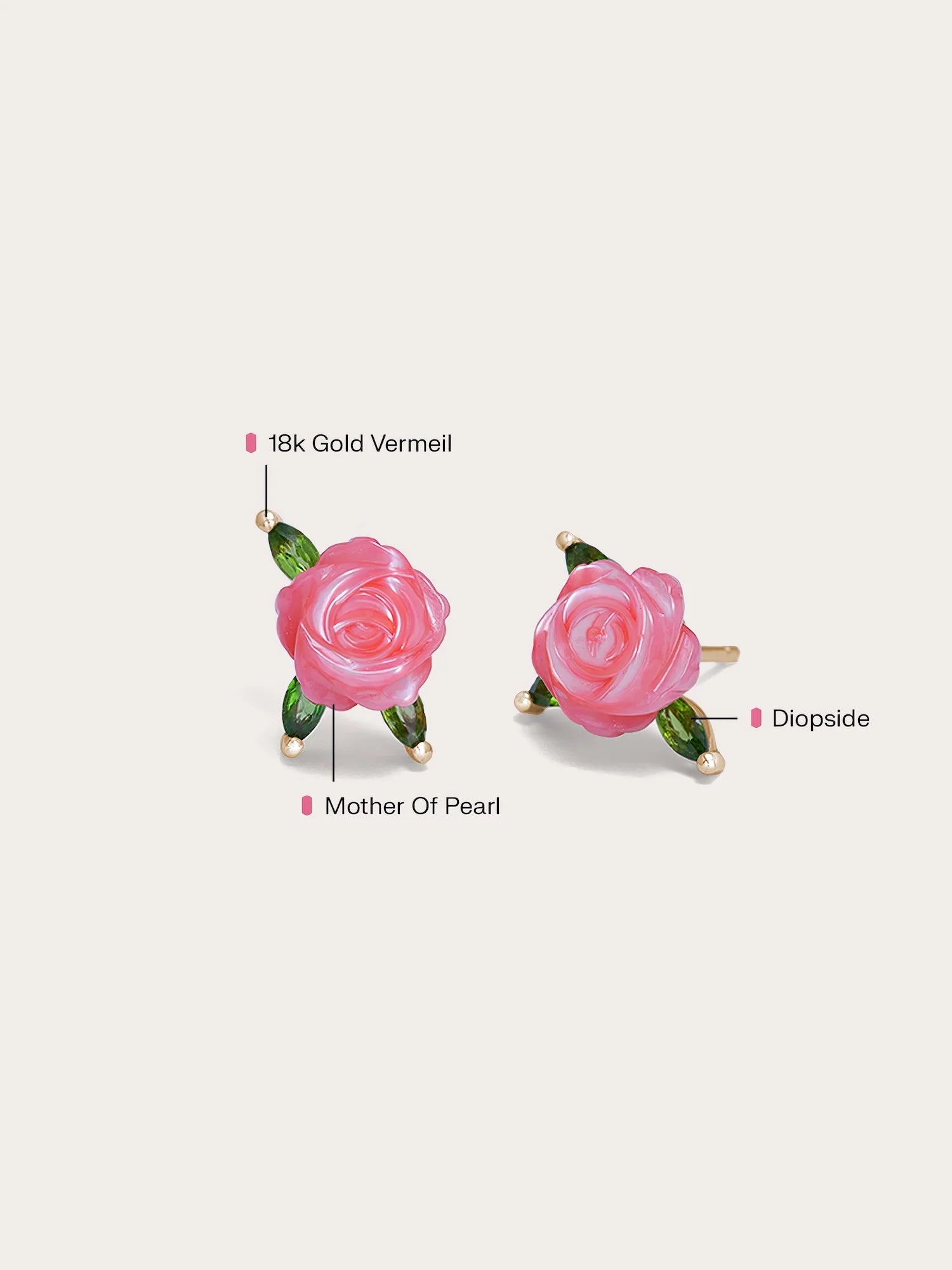 These carved rose stud earrings feature mother-of-pearl, intricately hand-carved into graceful roses. Diopside stones mimic the appearance of leaves. They add a touch of refinement to any ensemble, capturing the essence of the beauty and love associated with roses. Handmade with 18k rose gold vermeil.