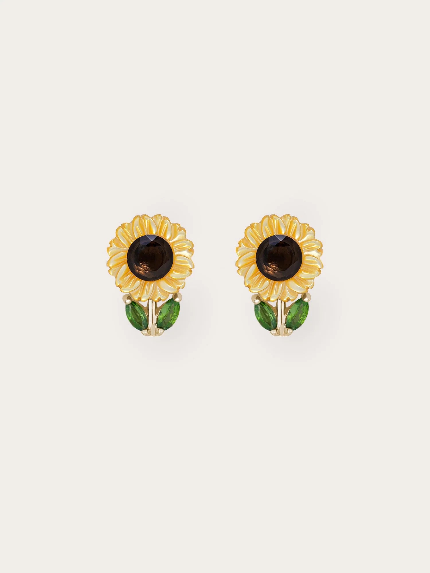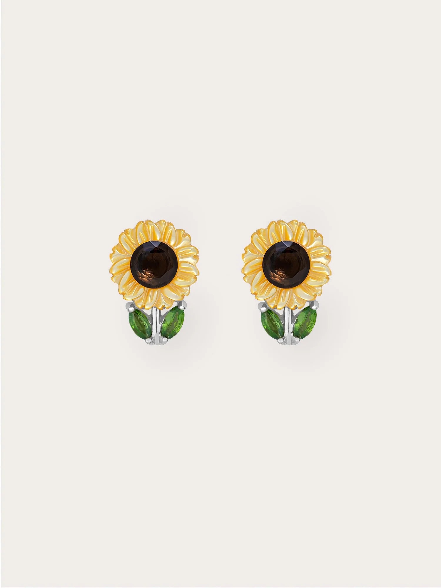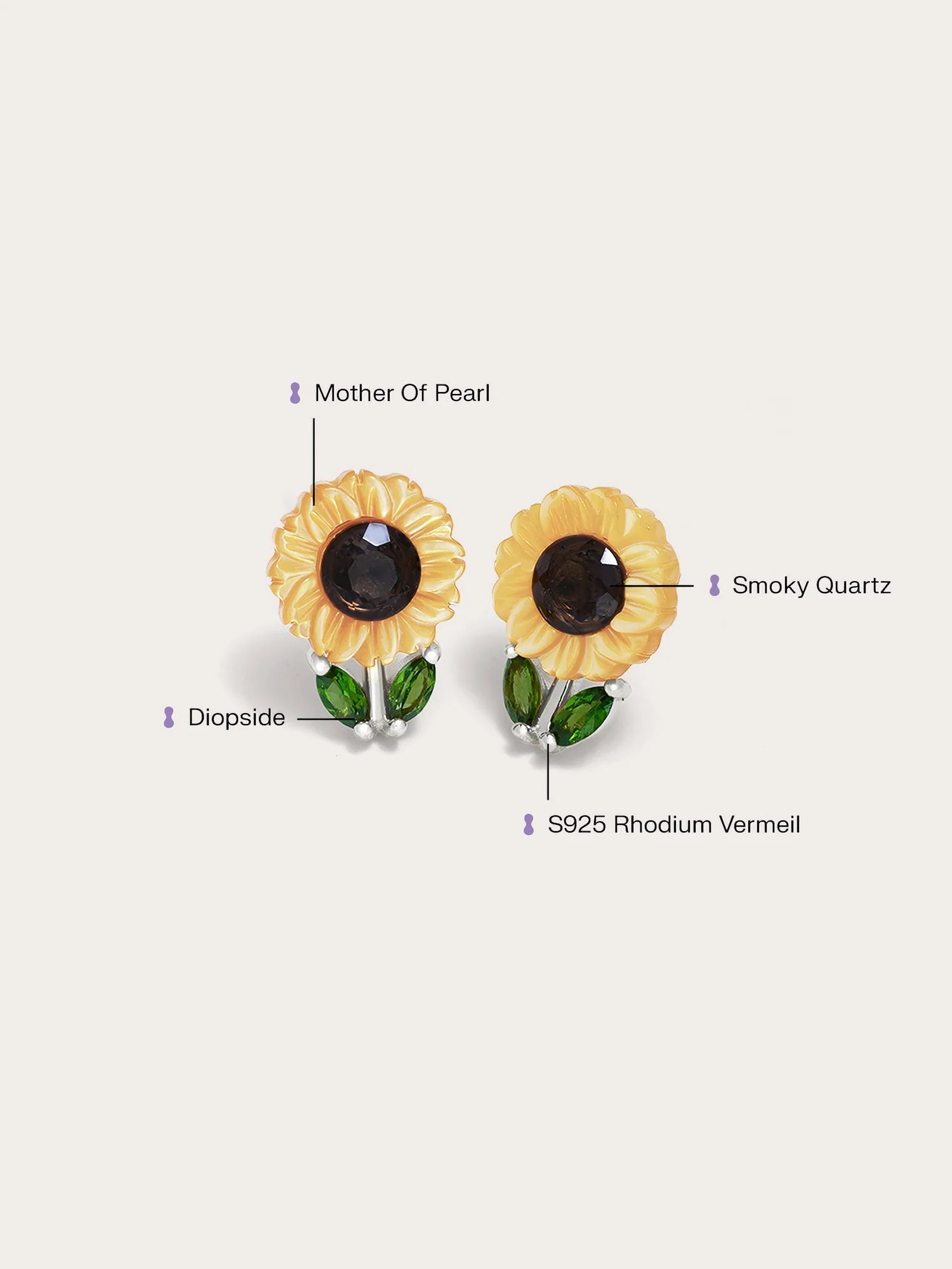 Capture the sun’s joyful energy with our Carved Sunflower Stud Earrings. The flower petals are hand-carved from iridescent Mother of Pearl, centered with a warm, earthy smoky quartz gemstone. Accented by deep green diopside leaves, these sunflower earrings adds a subtle touch of nature’s beauty to your everyday style. Handcrafted in 18k gold vermeil, these sunflower earrings embody sophistication that carry a touch of whimsy.