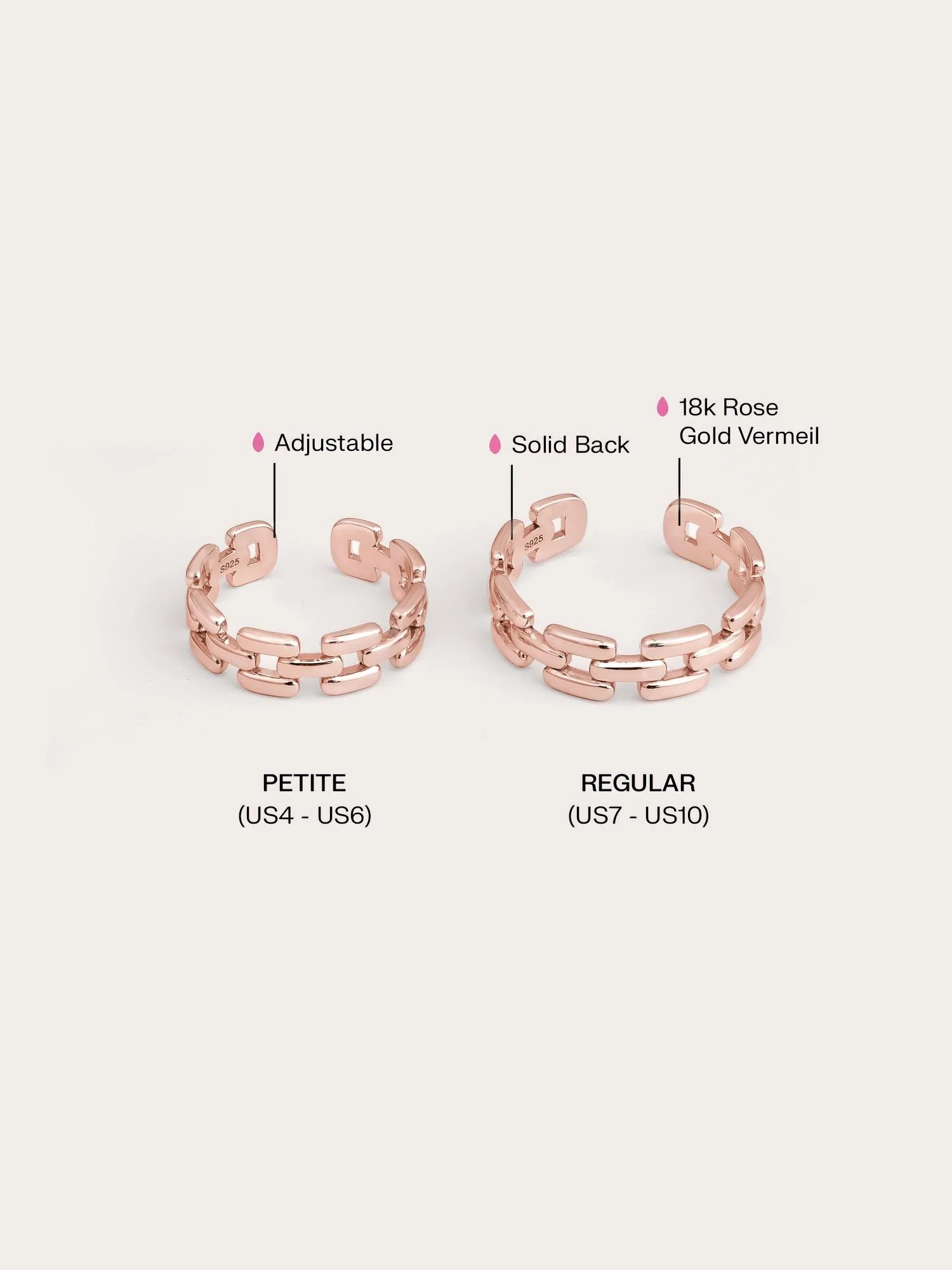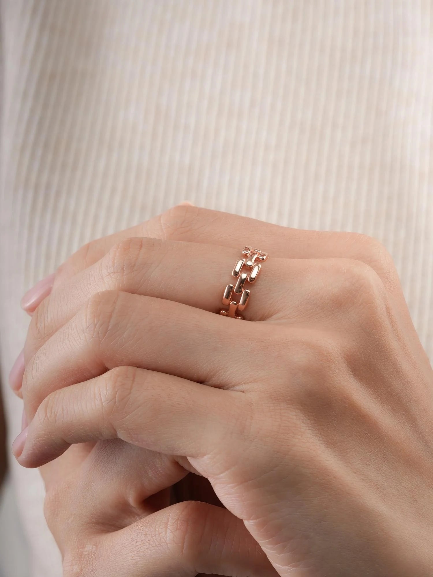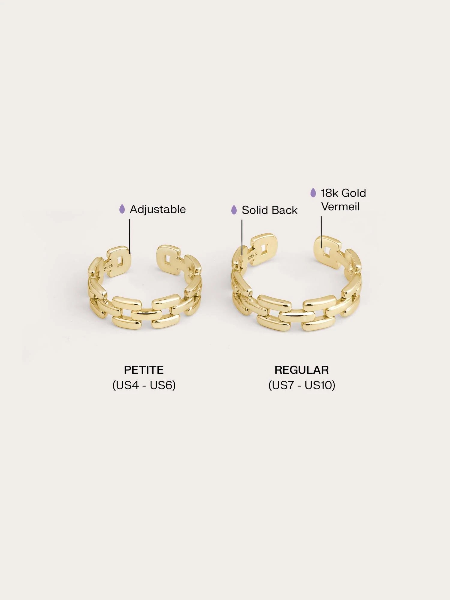 This ring features chain links inspired by watches. It's ideal for daily wear, combining classic allure with modern fashion. Handmade in 18k gold vermeil.