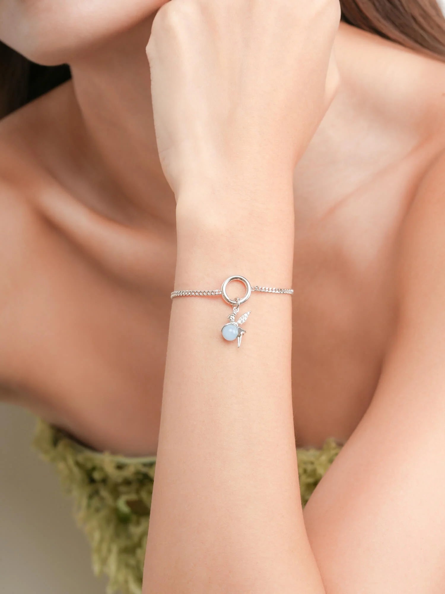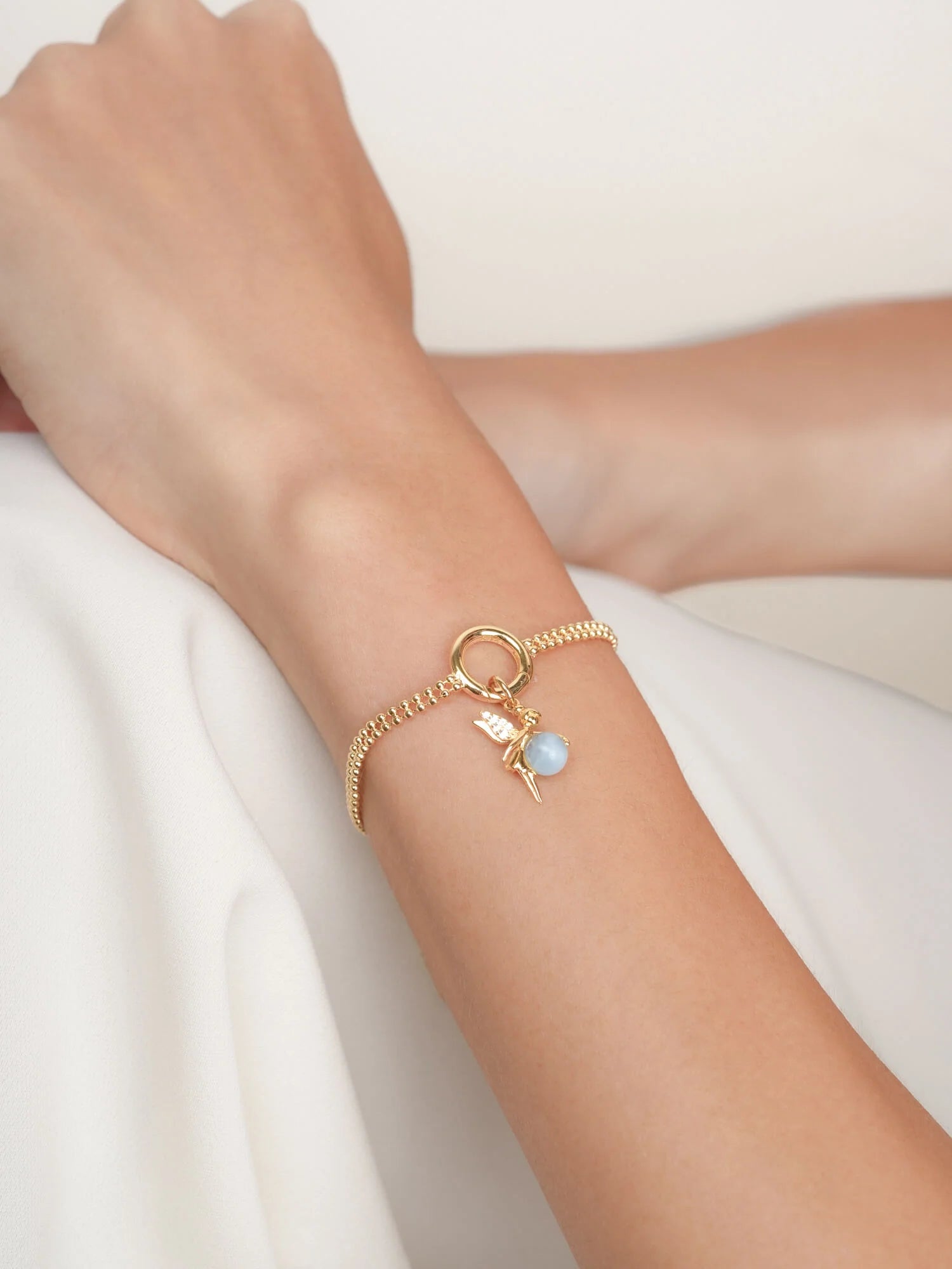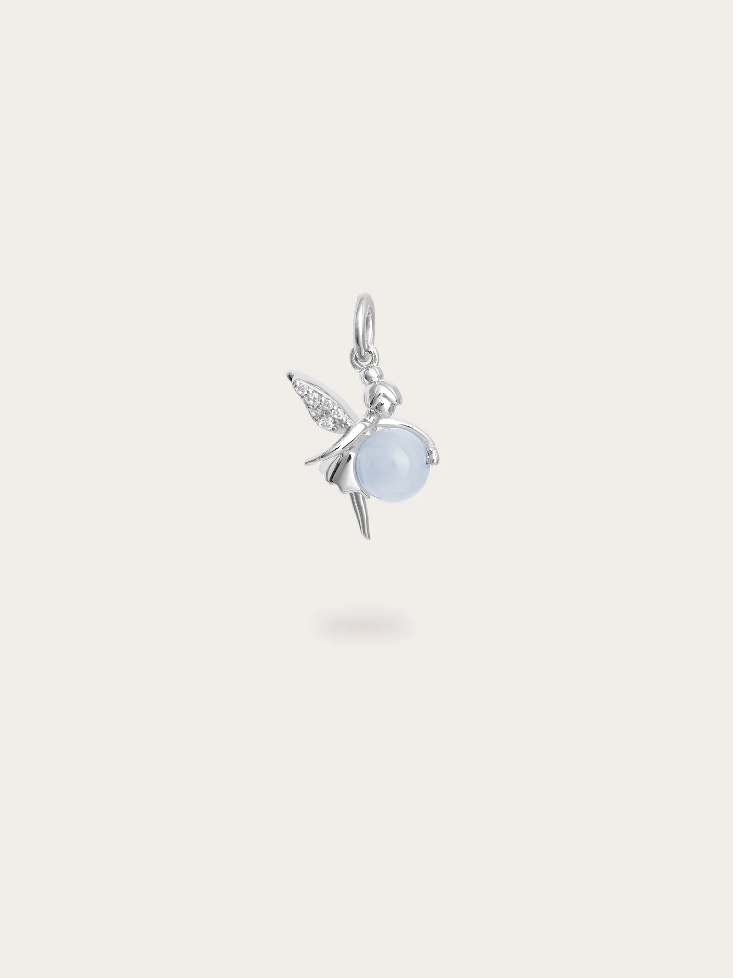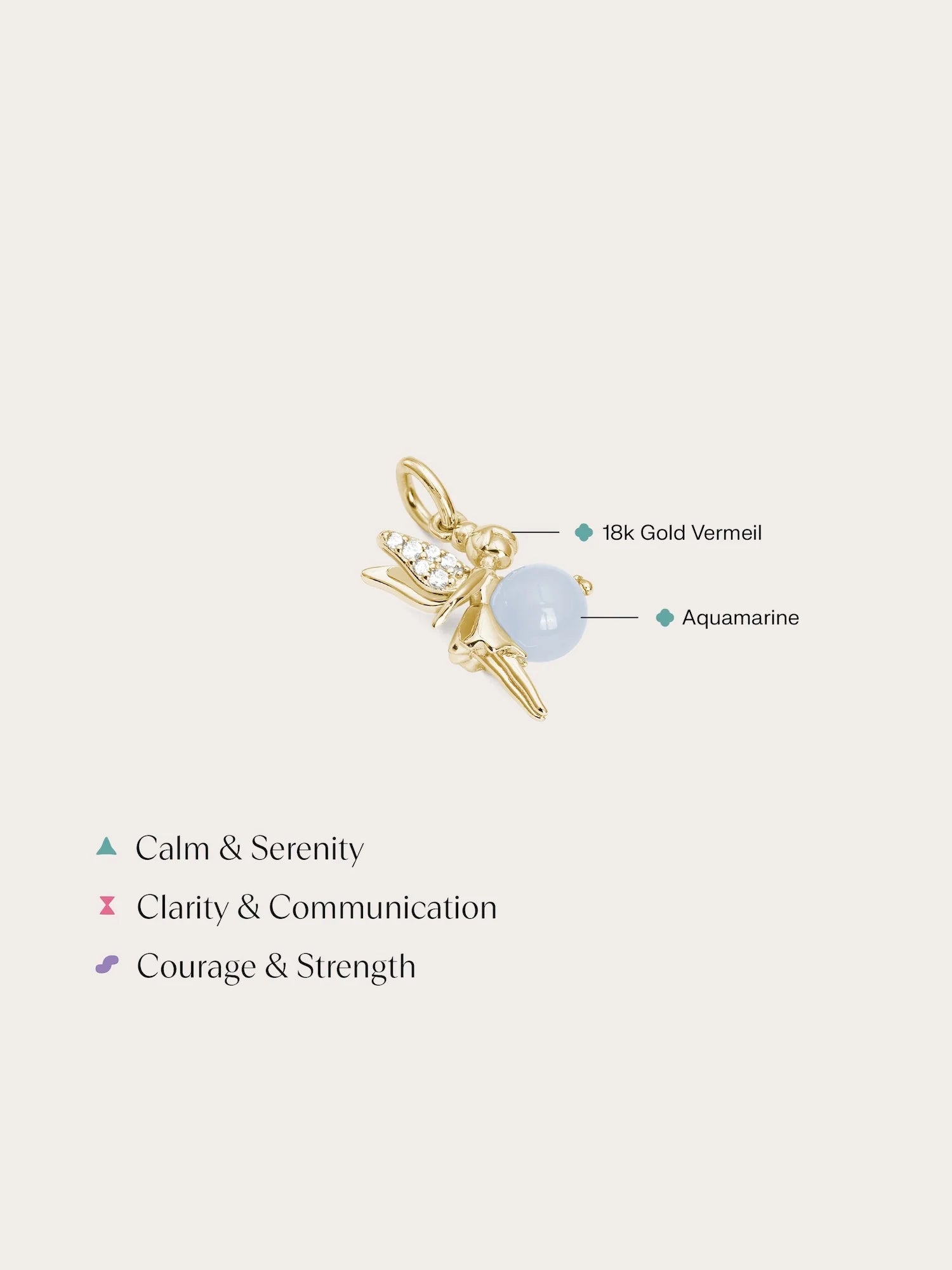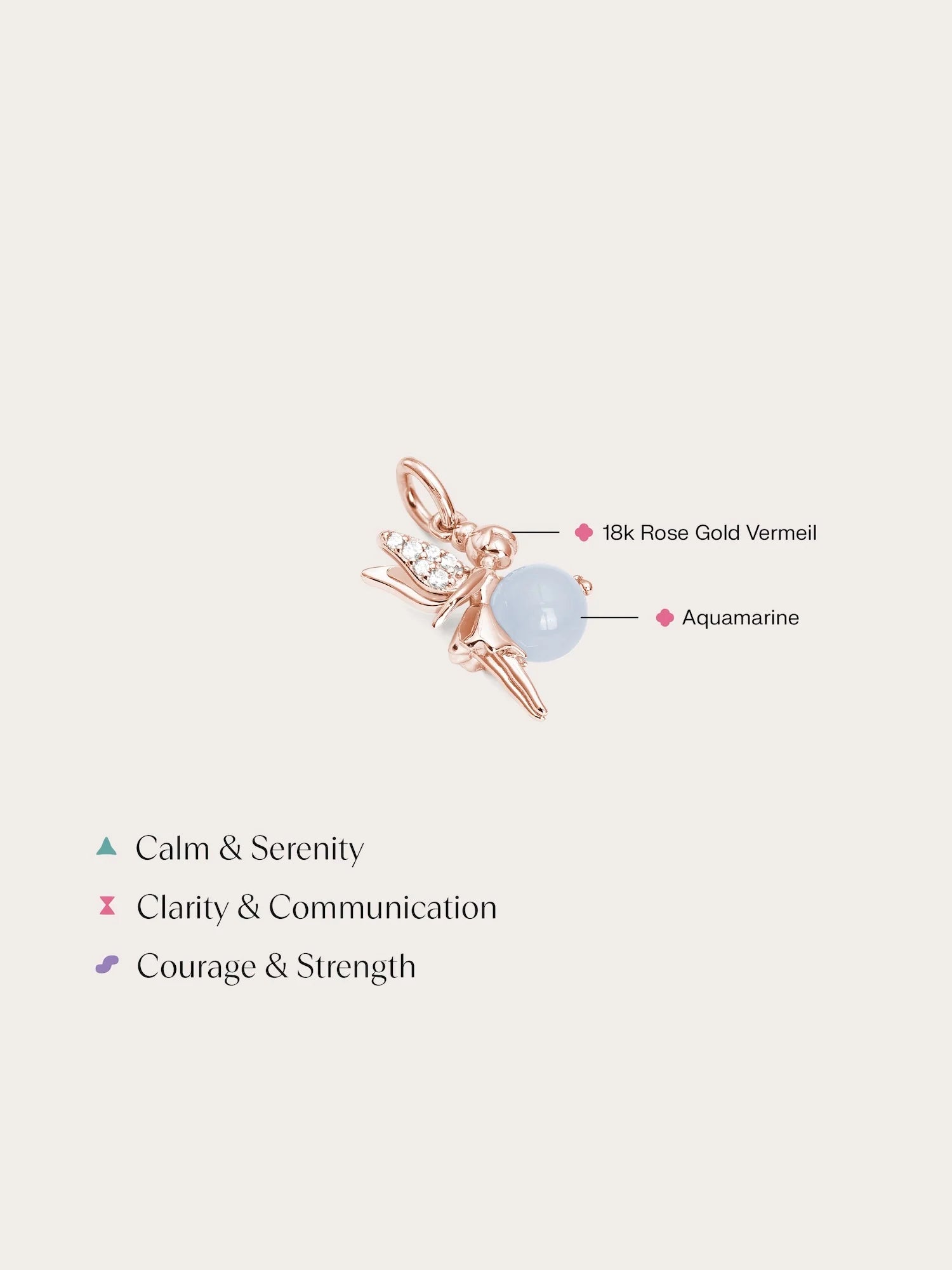 Skillfully crafted, this charm depicts a charming fairy holding a glowing aquamarine stone, symbolizing tranquility, clarity, and courage. It serves as a meaningful memento or a considerate gift, carrying your wishes and making them come true. Handmade with 18k rose gold vermeil.
