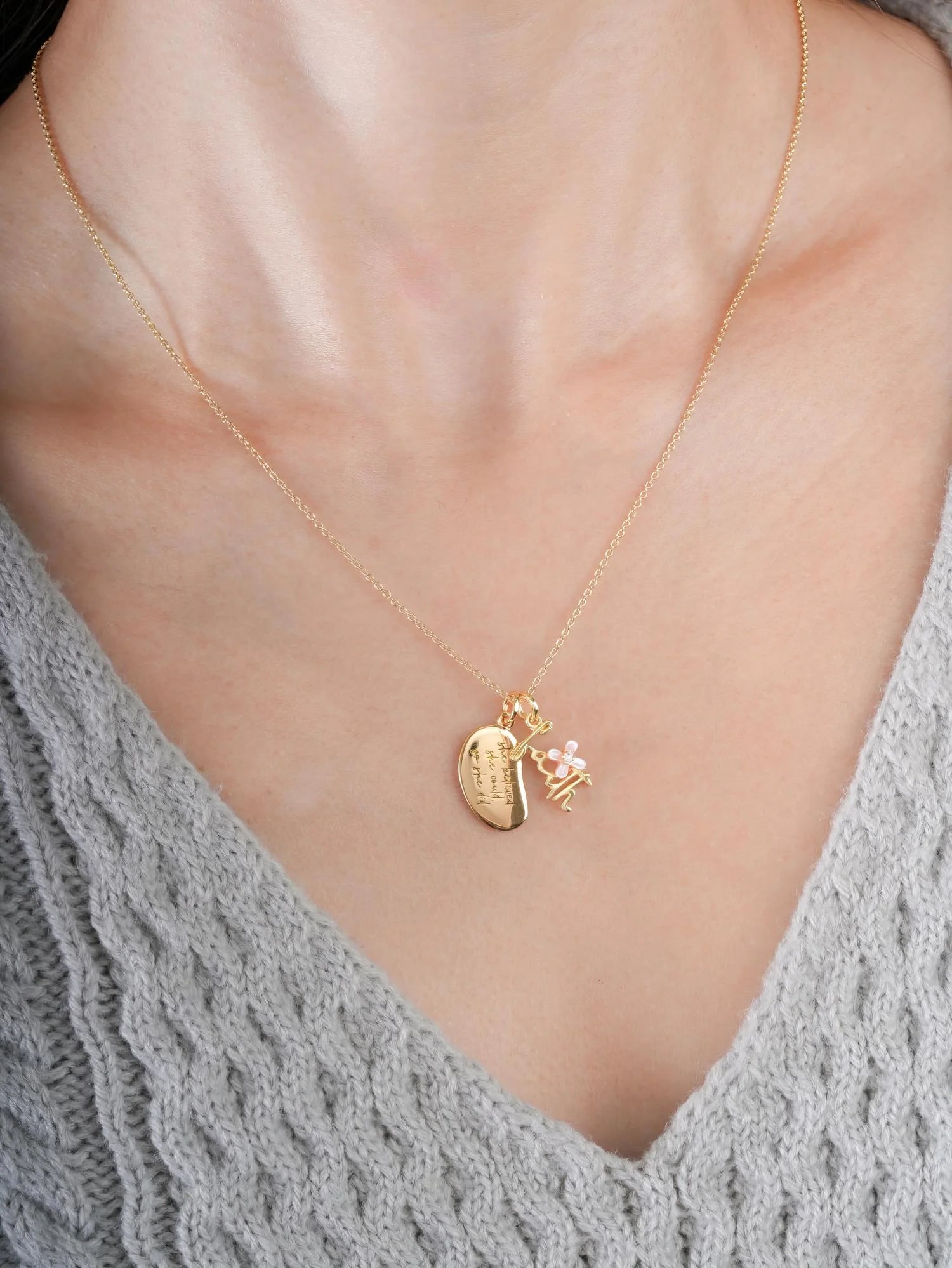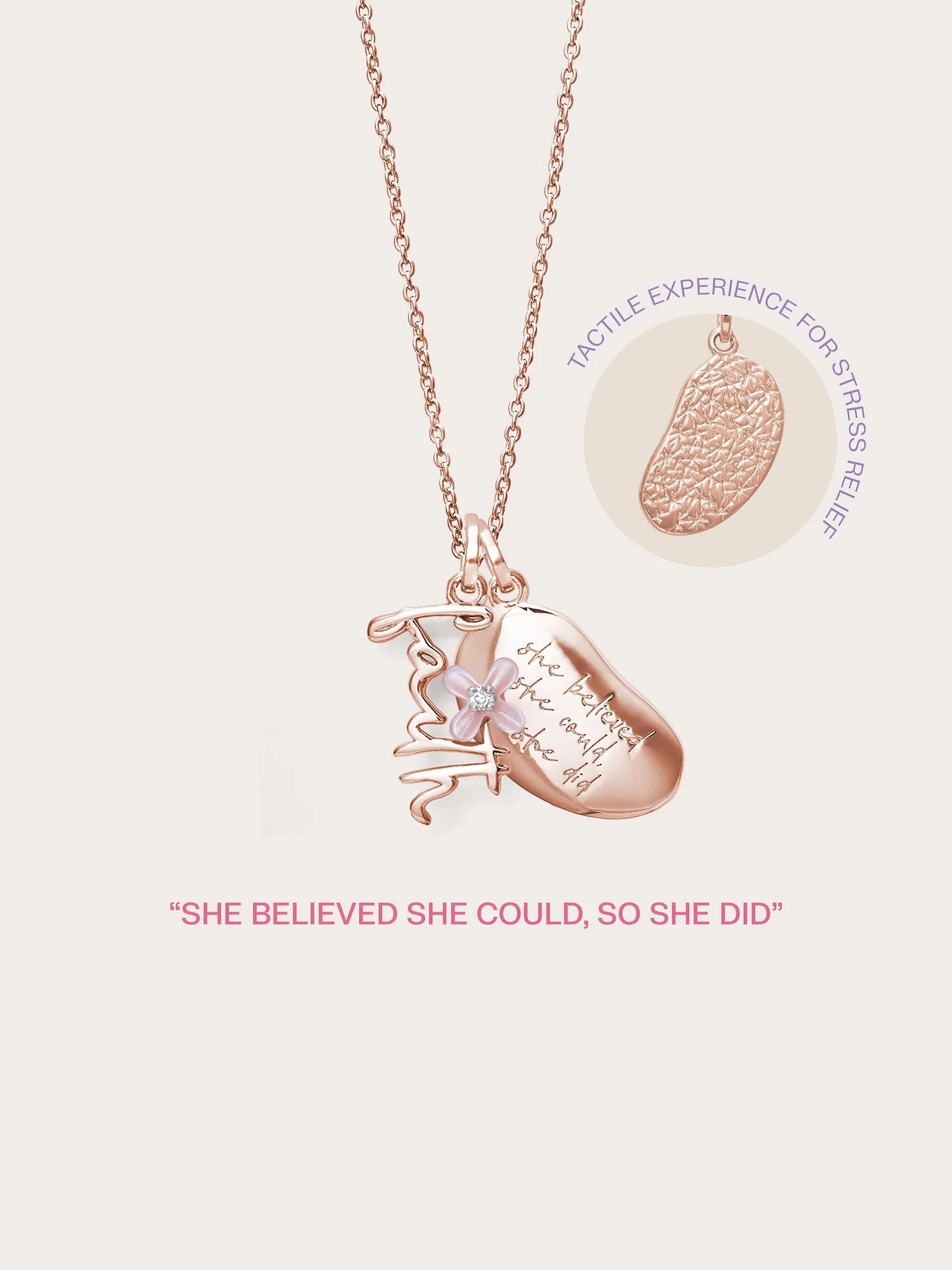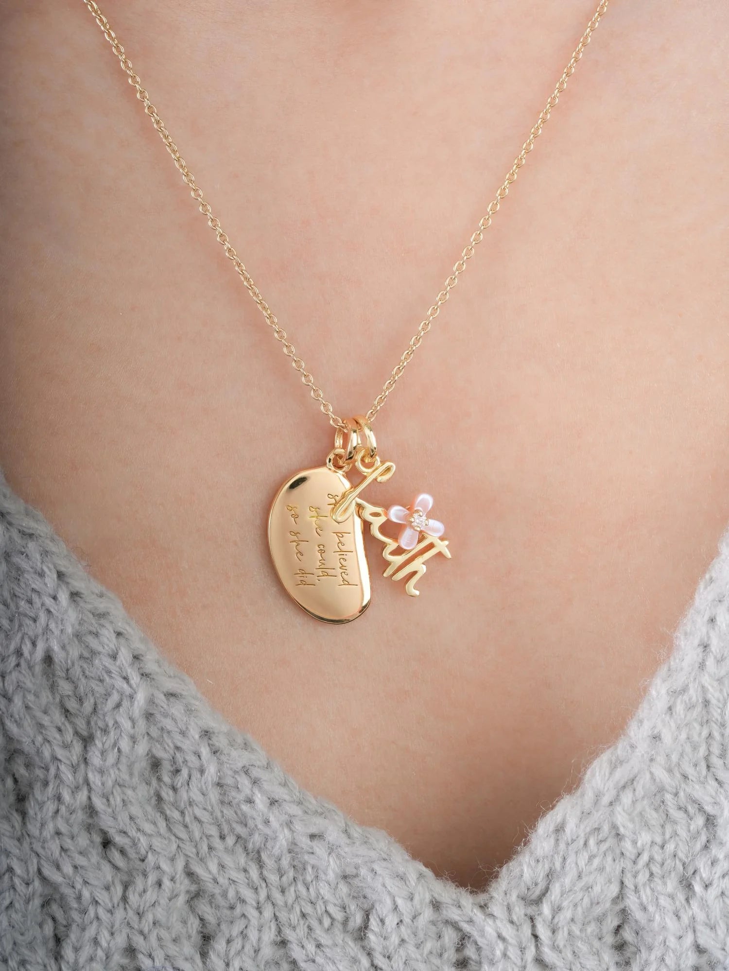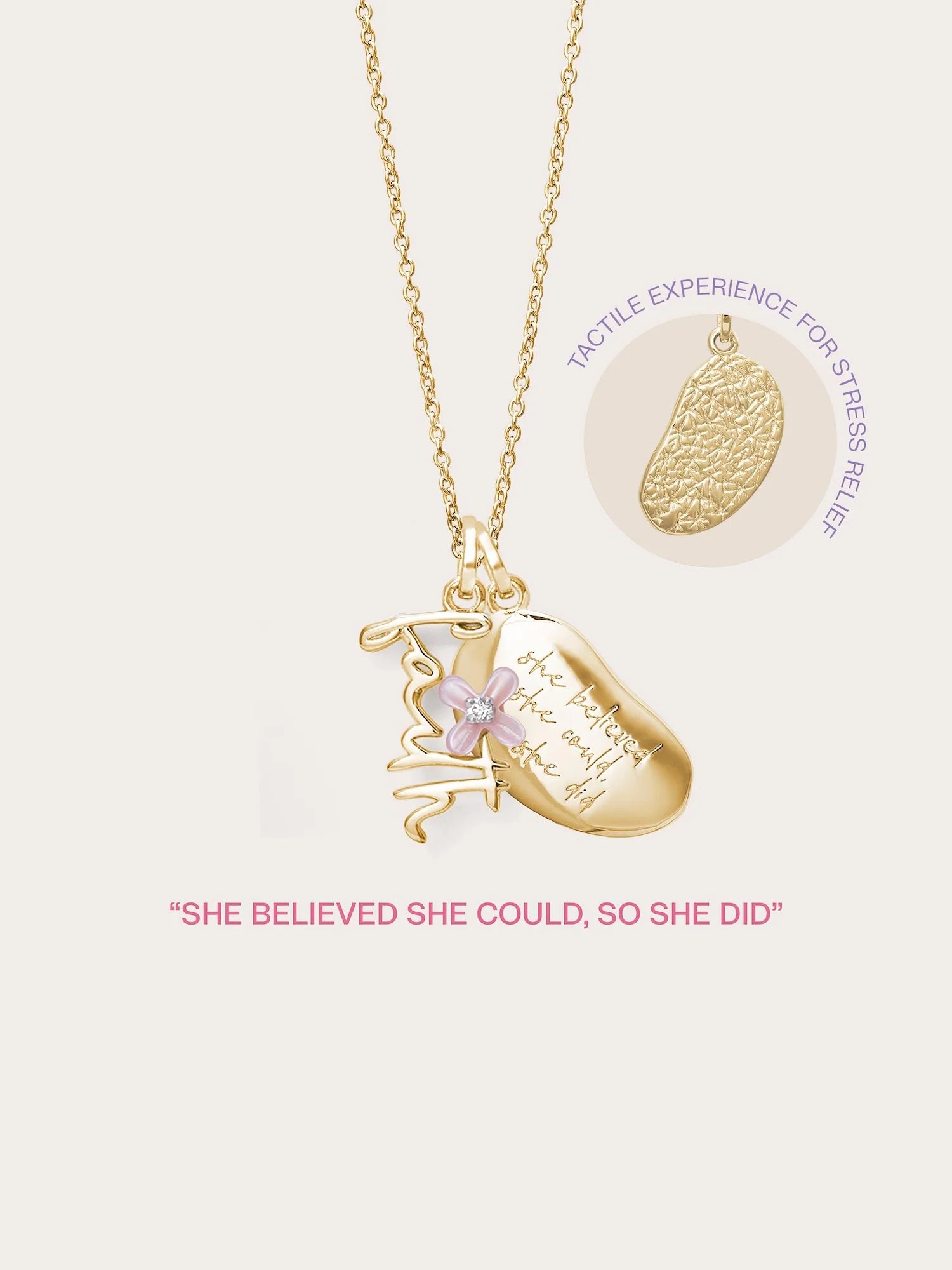 This two-piece necklace set features a "Faith" word charm* and a bean-shaped pendant. The bean pendant is engraved with a mantra for faith on the front, and has a textured back for a soothing, tactile experience.