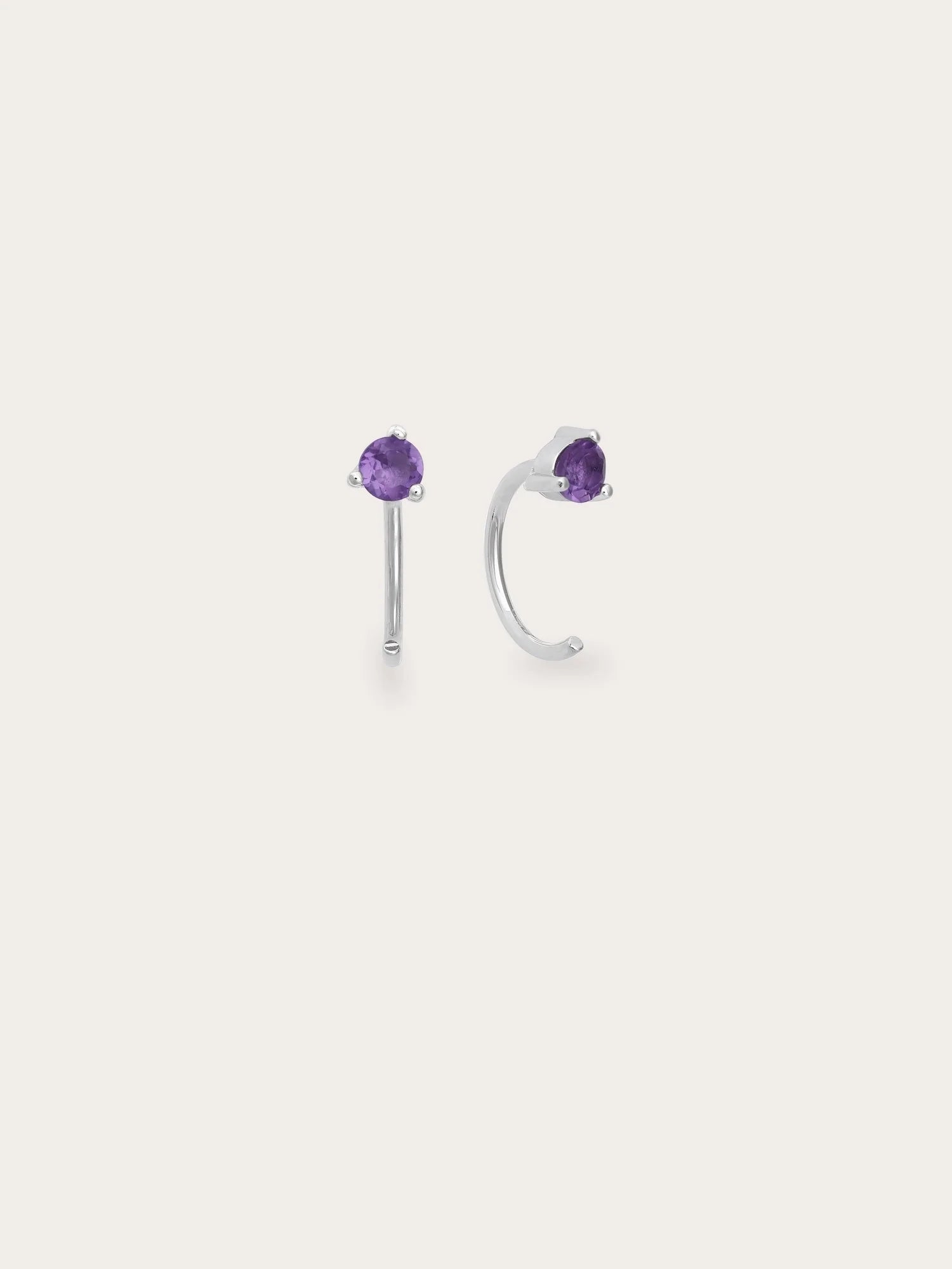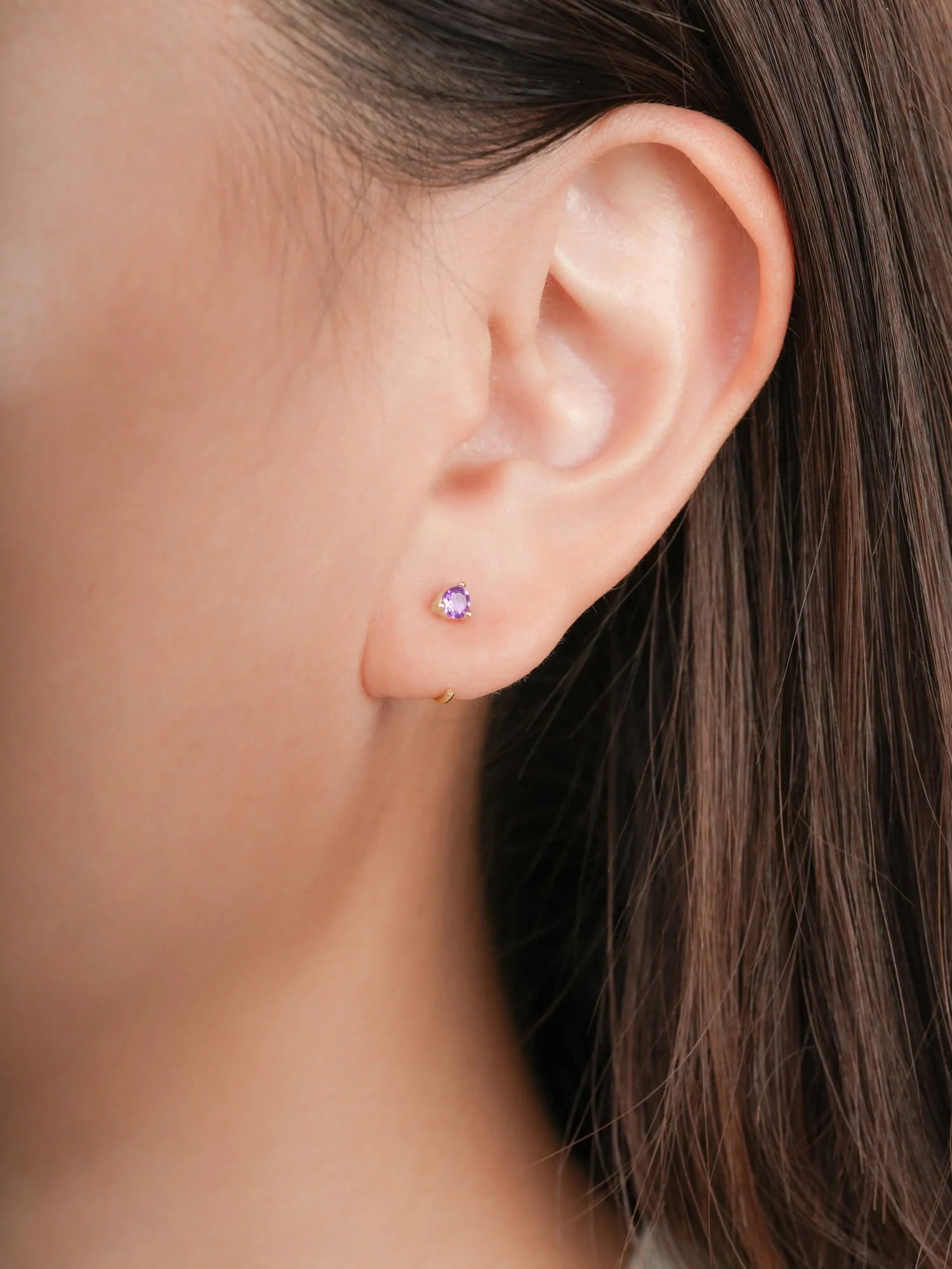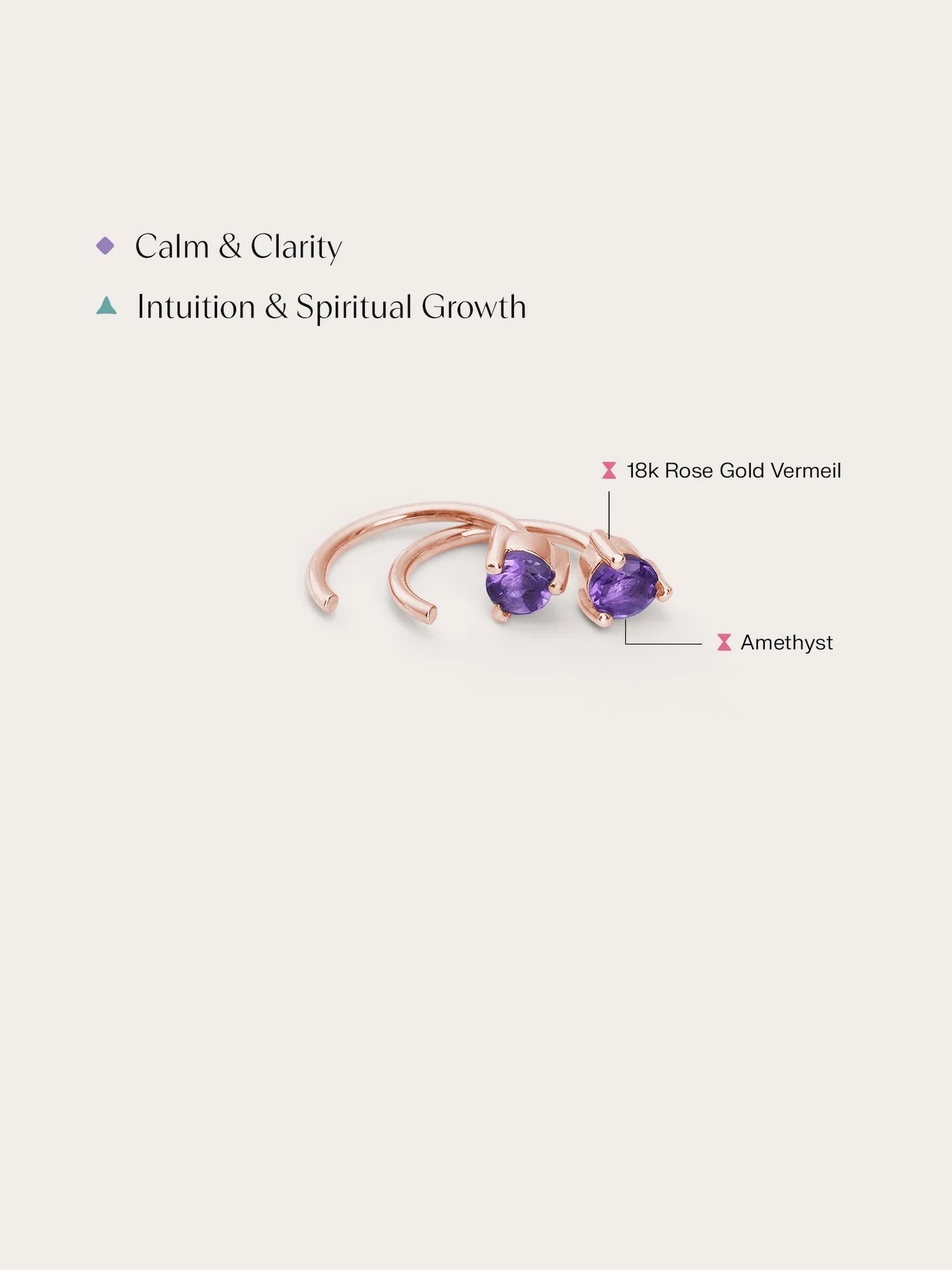The February Birthstone Mini Hoop Earrings feature natural amethyst stones. Designed for everyday wear, these open hoops are easy to put on, lightweight, versatile and comfortable to wear. Suitable for 1st, 2nd, and 3rd piercings. Handcrafted in 18k rose gold vermeil.