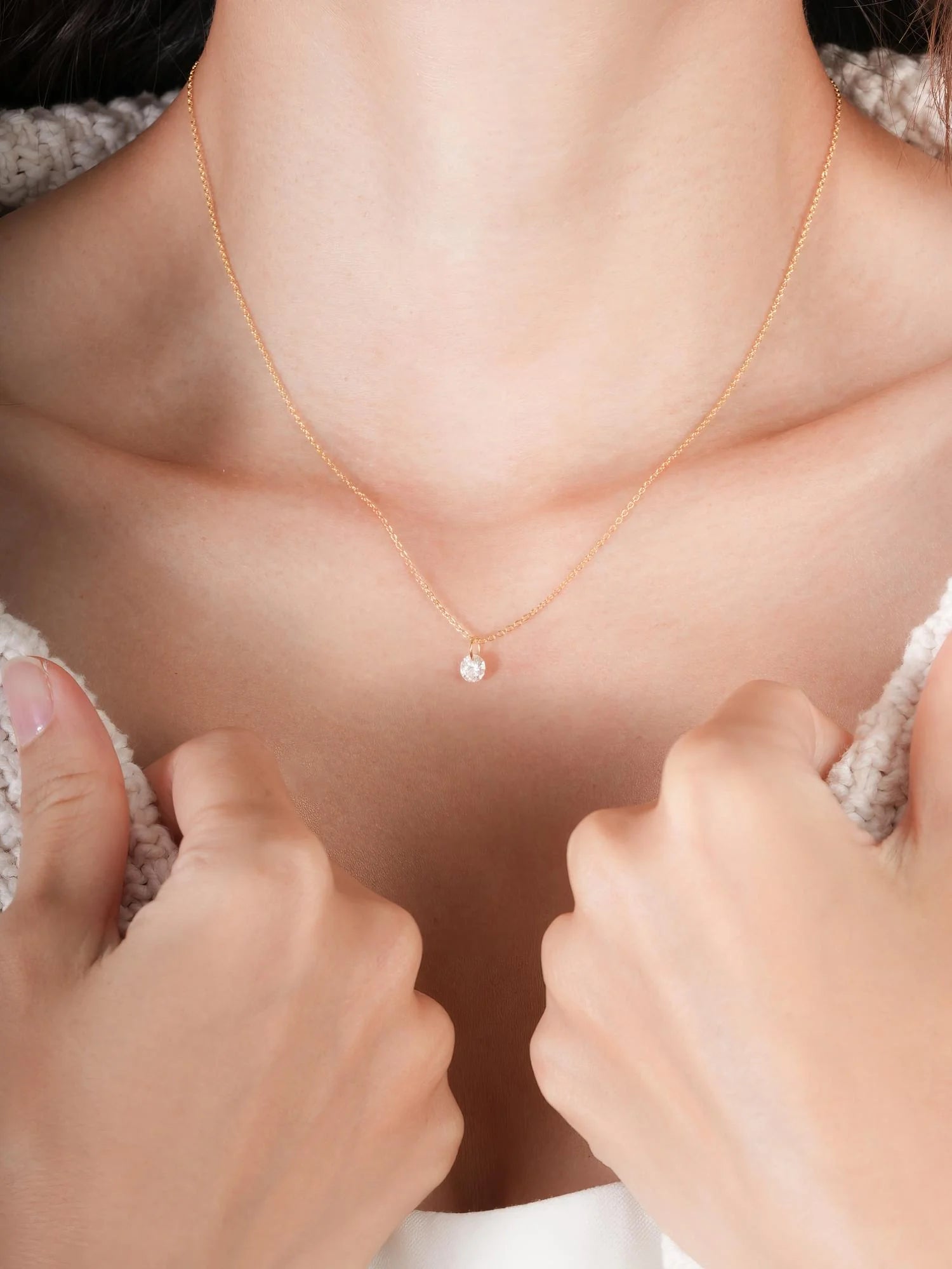 The necklace's length can be easily adjusted. There's a moissanite at the end to add some sparkle. See how it looks at different lengths here.