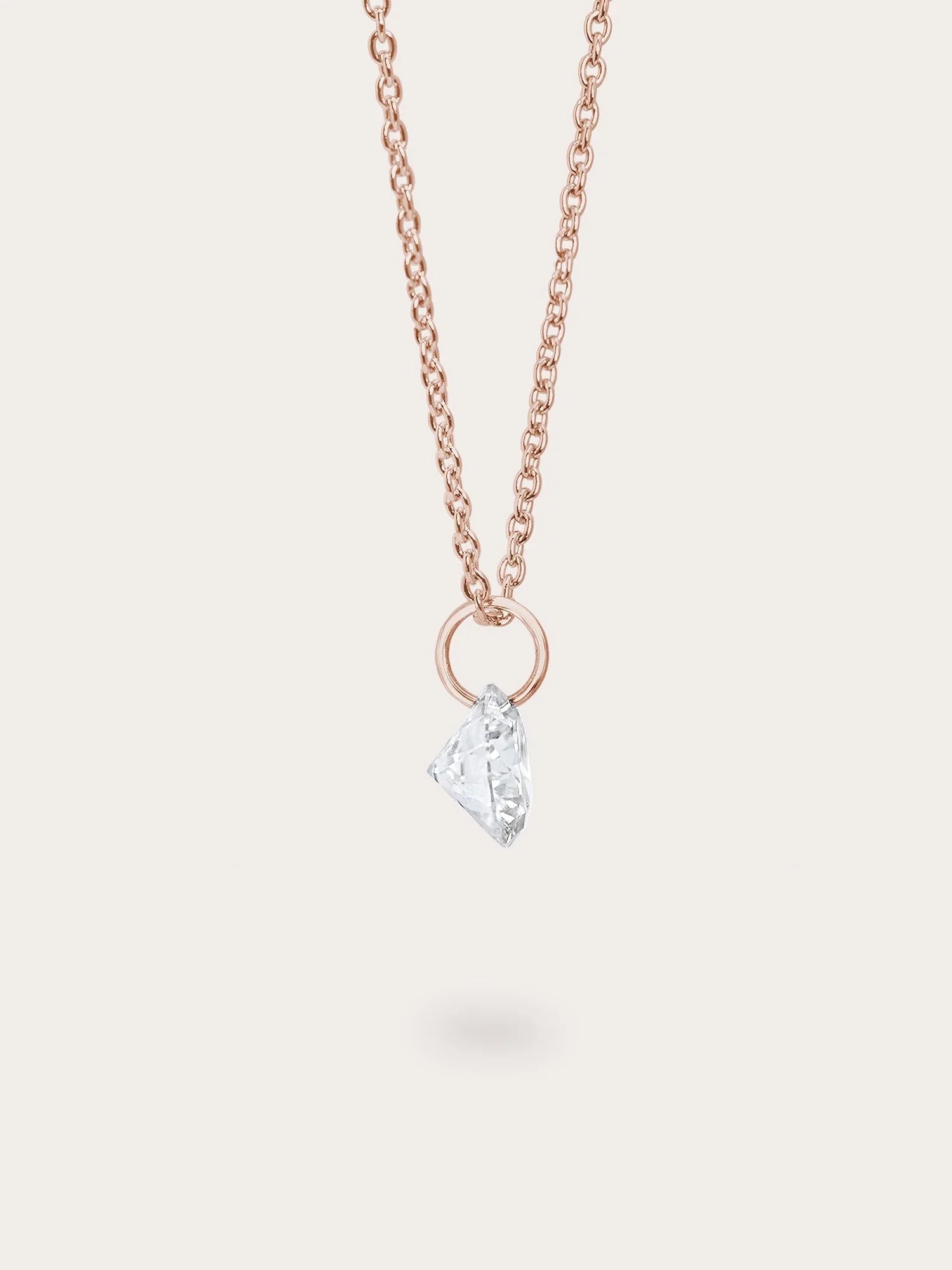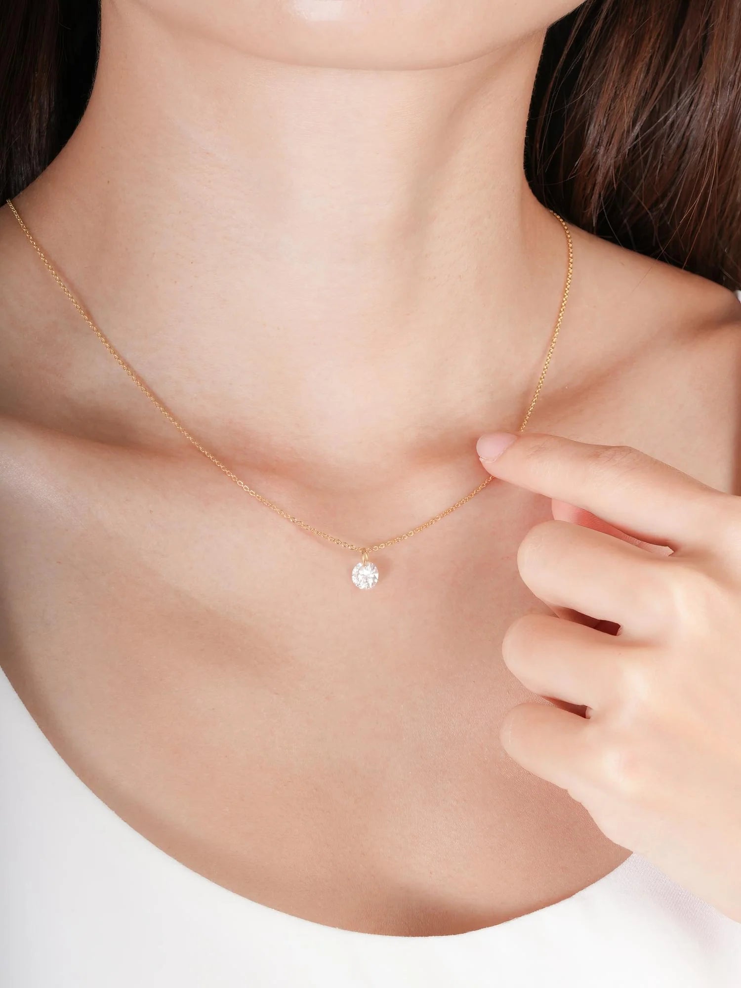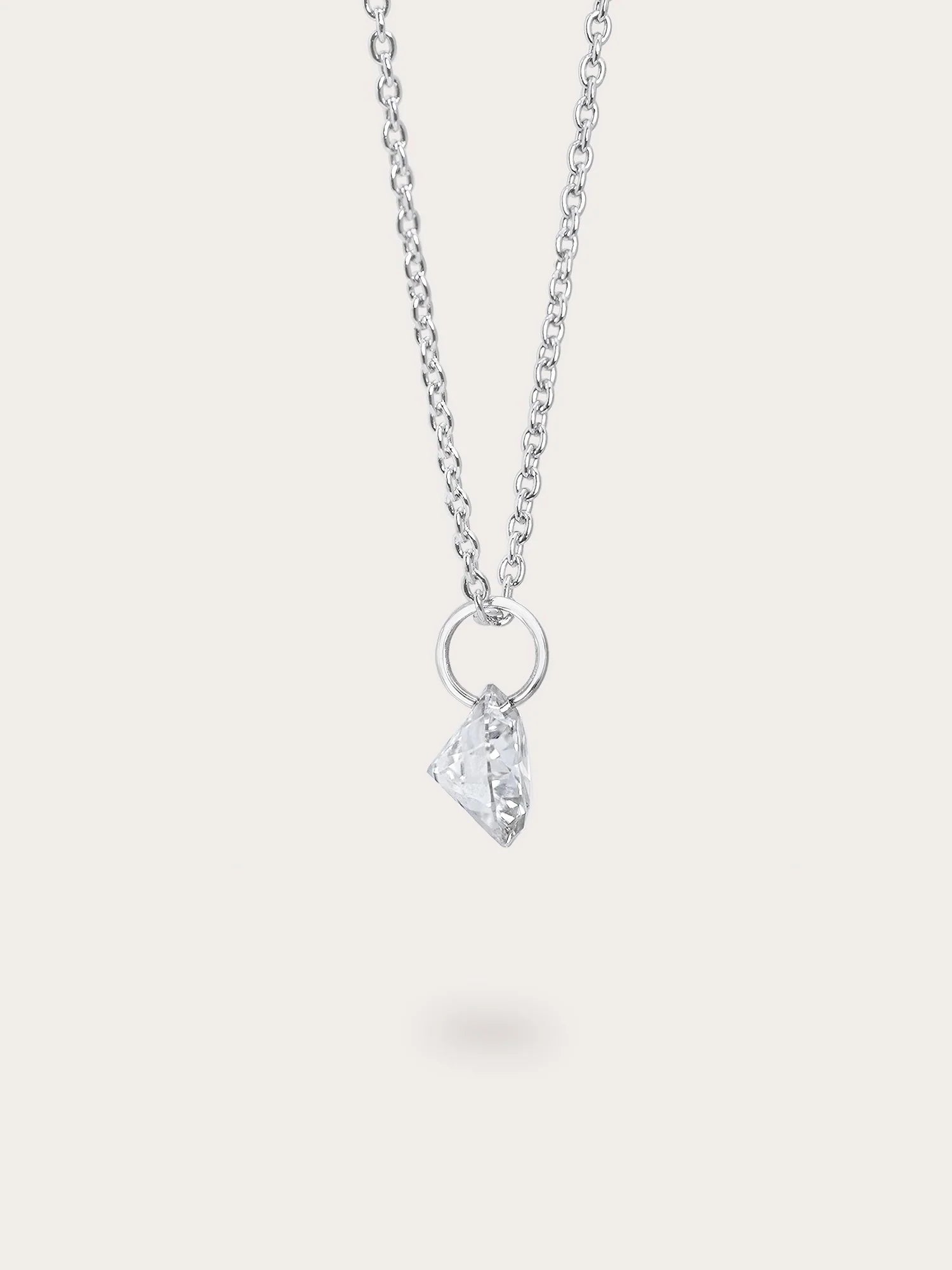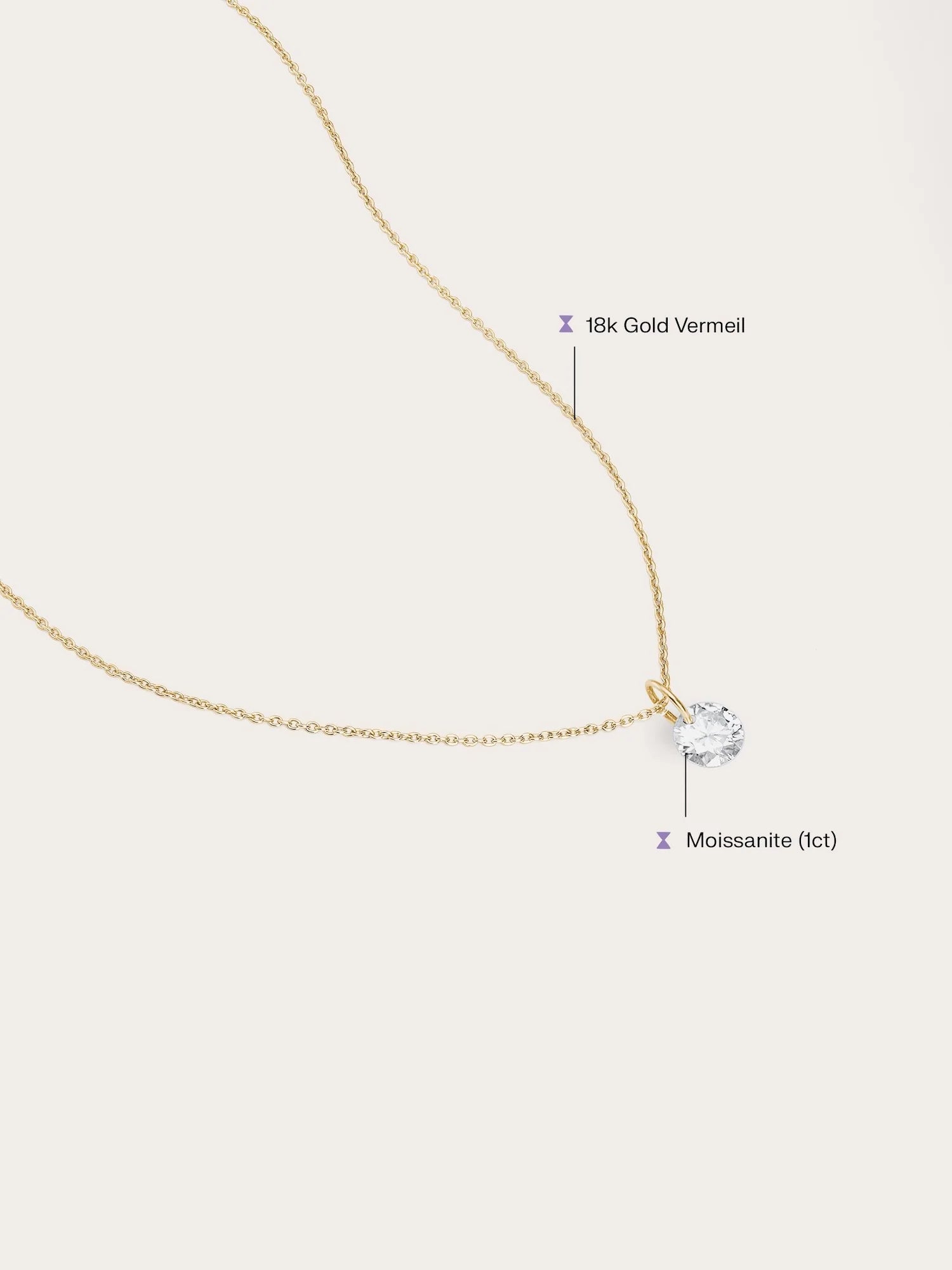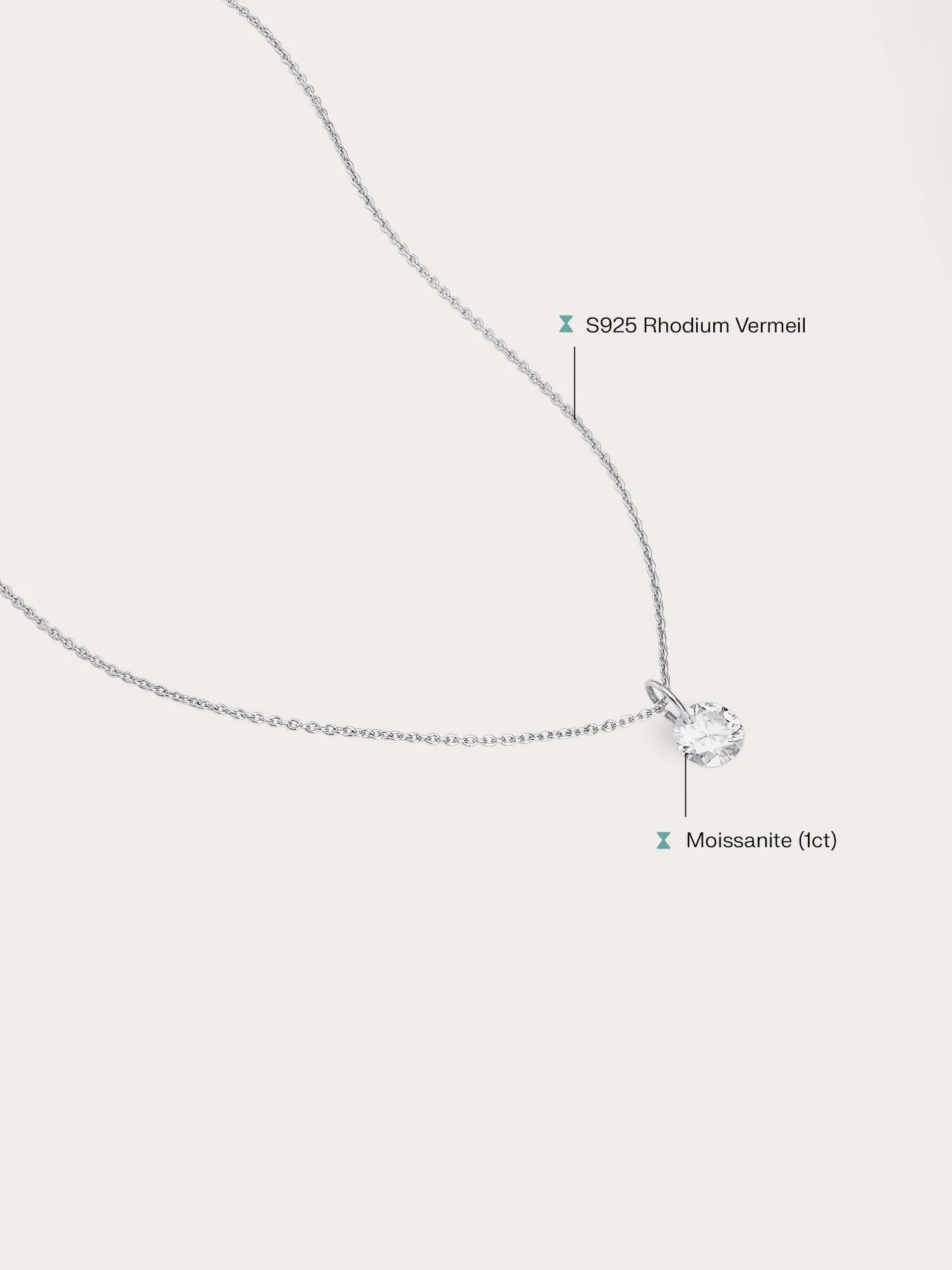 The Floating Moissanite Necklace (1ct) features a single moissanite stone, delicately suspended in a floating setting. Free of prongs, this innovative design allows light to illuminate the stone from every angle, enhancing its brilliance. Handcrafted in S925 rhodium vermeil.