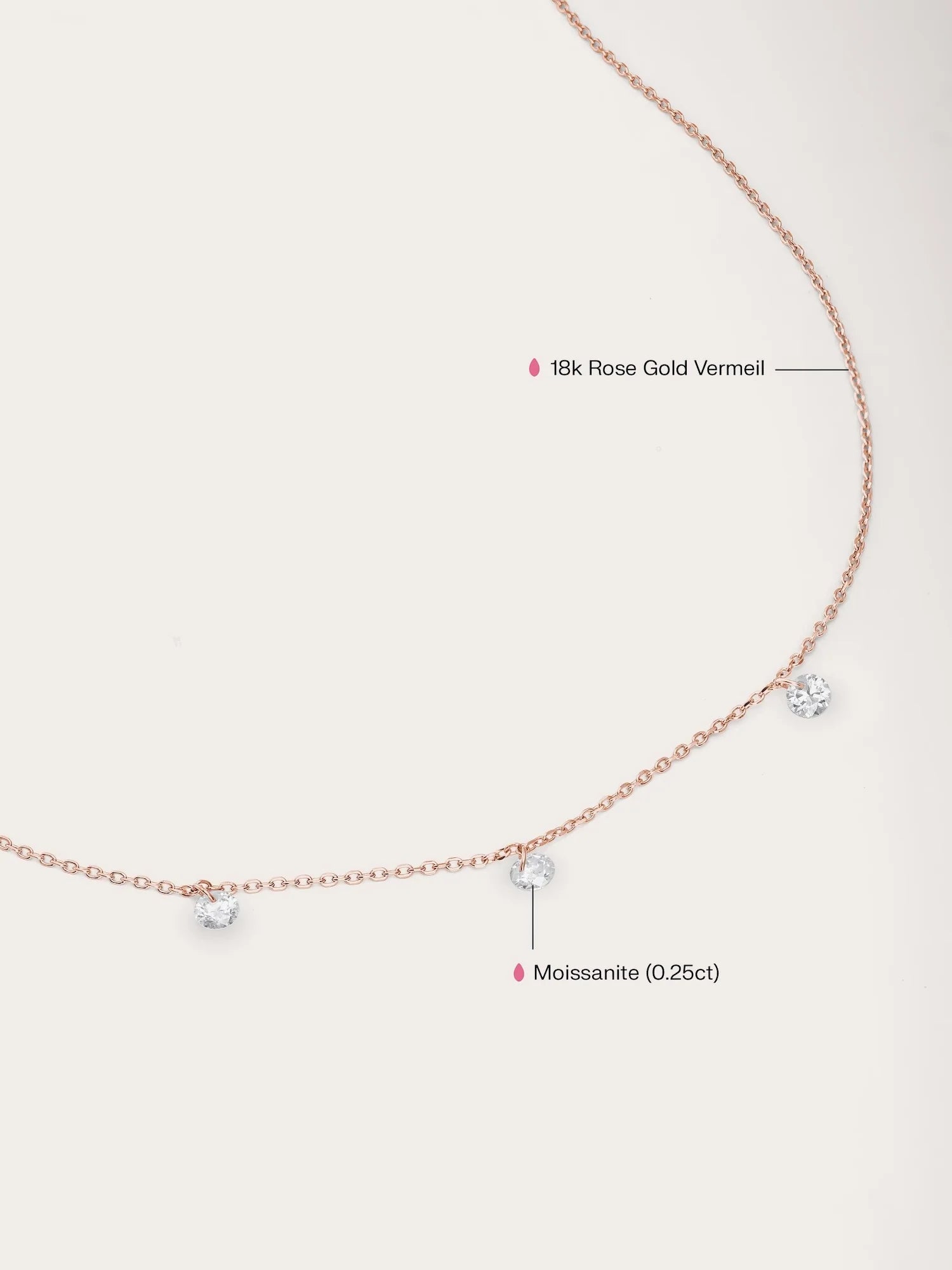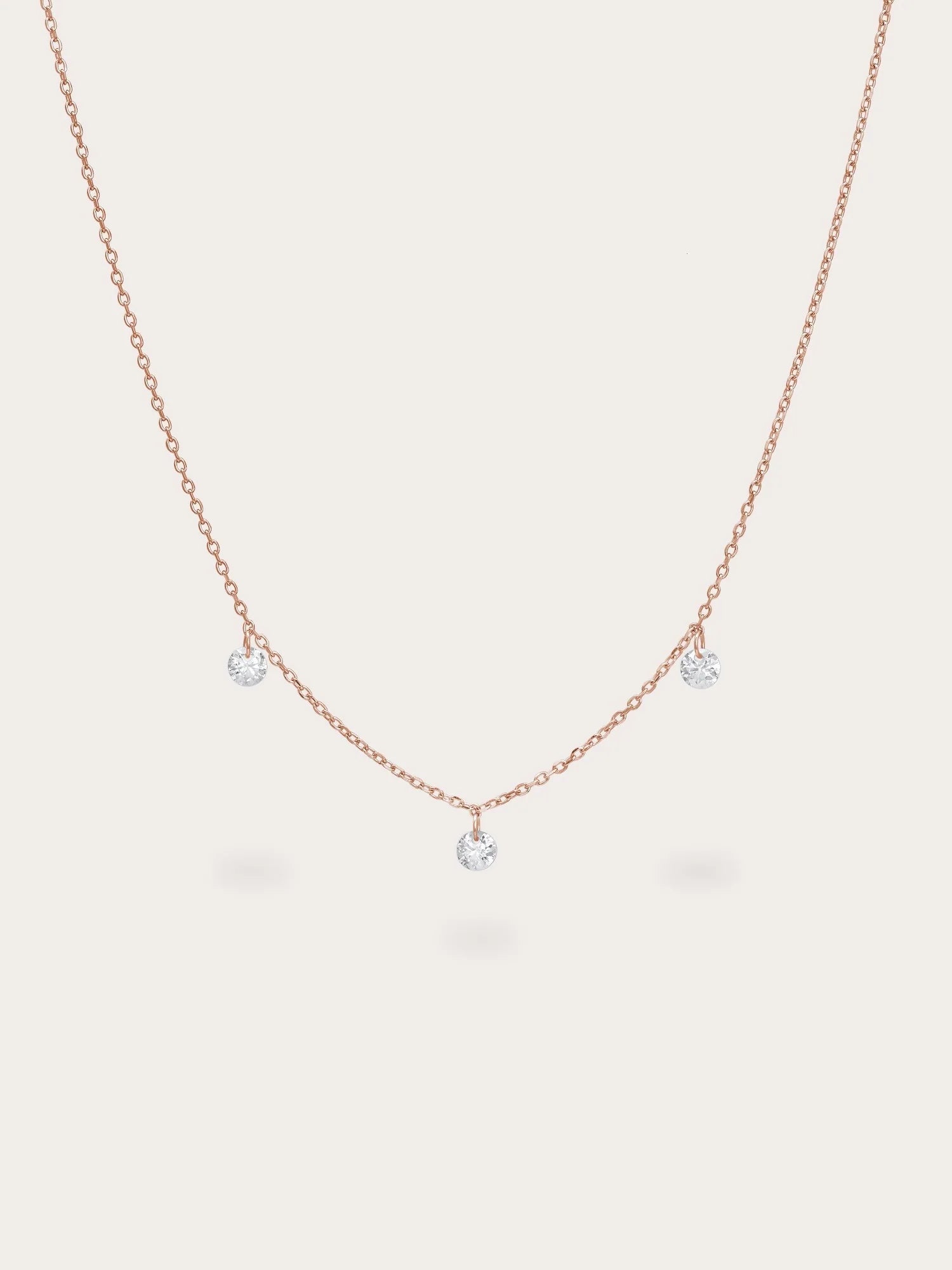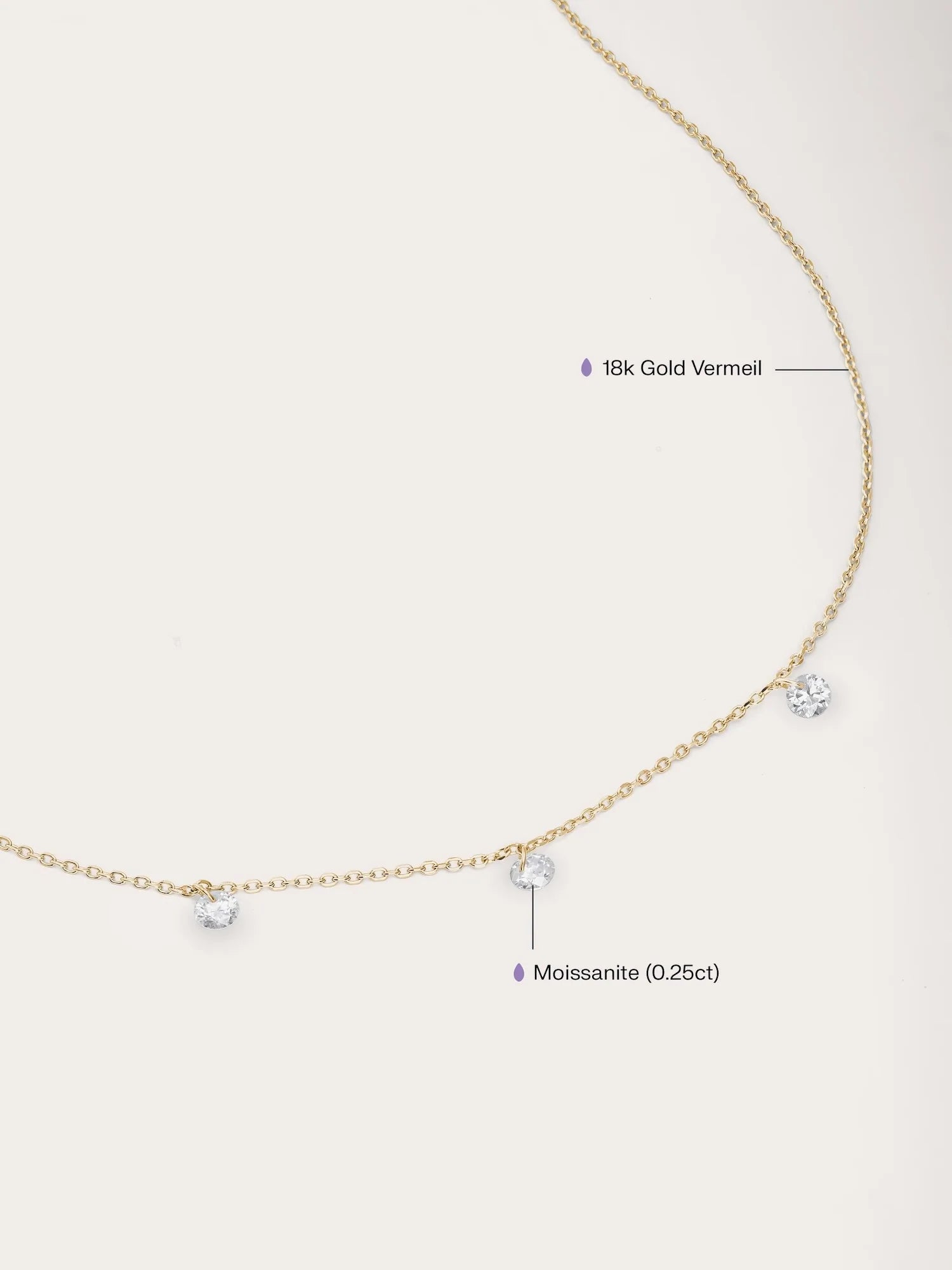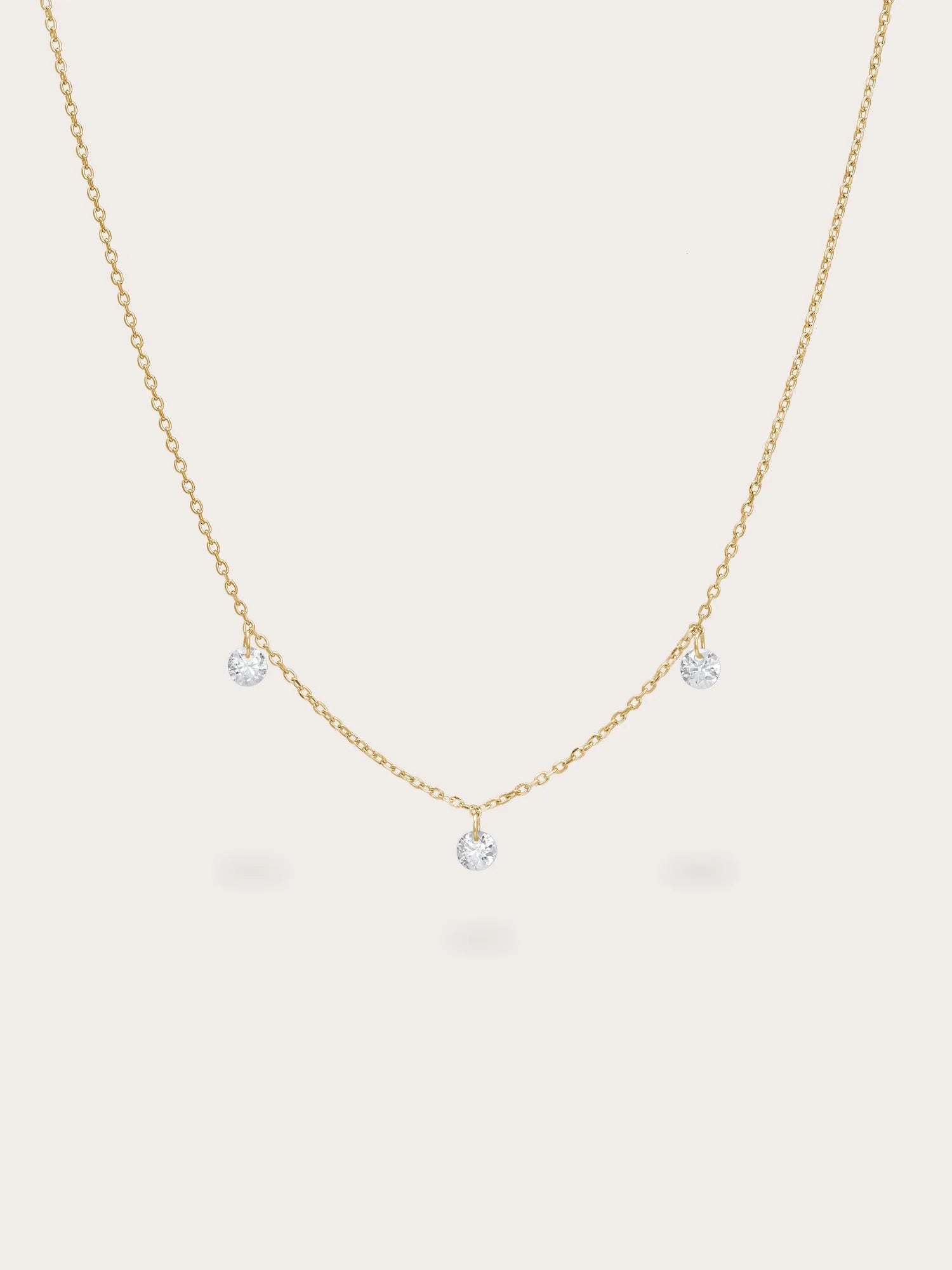 This necklace features three moissanite stones that hang delicately without prongs, reflecting light from all angles to enhance their sparkle. It is handcrafted with a type of vermeil plating on a base metal.