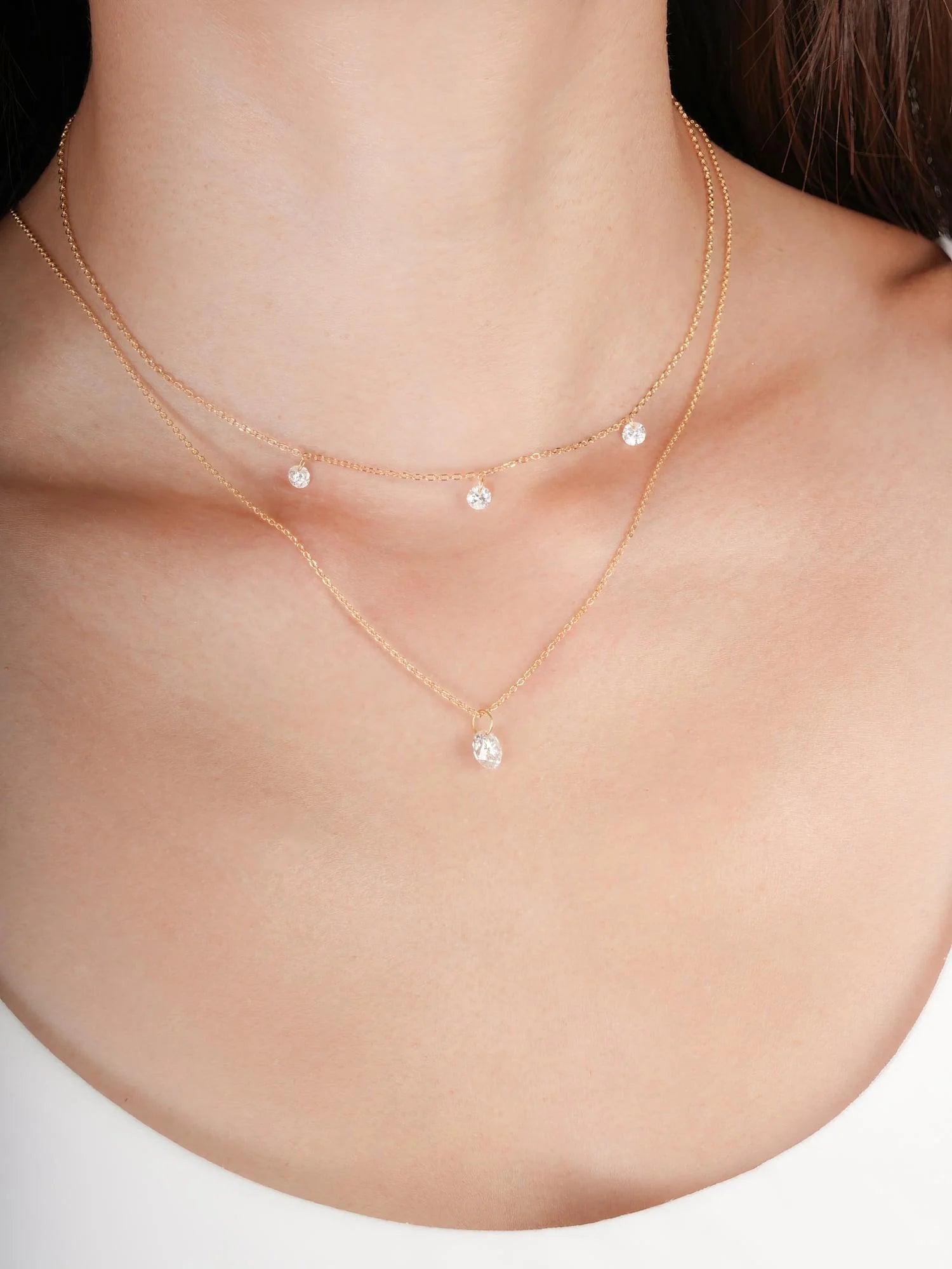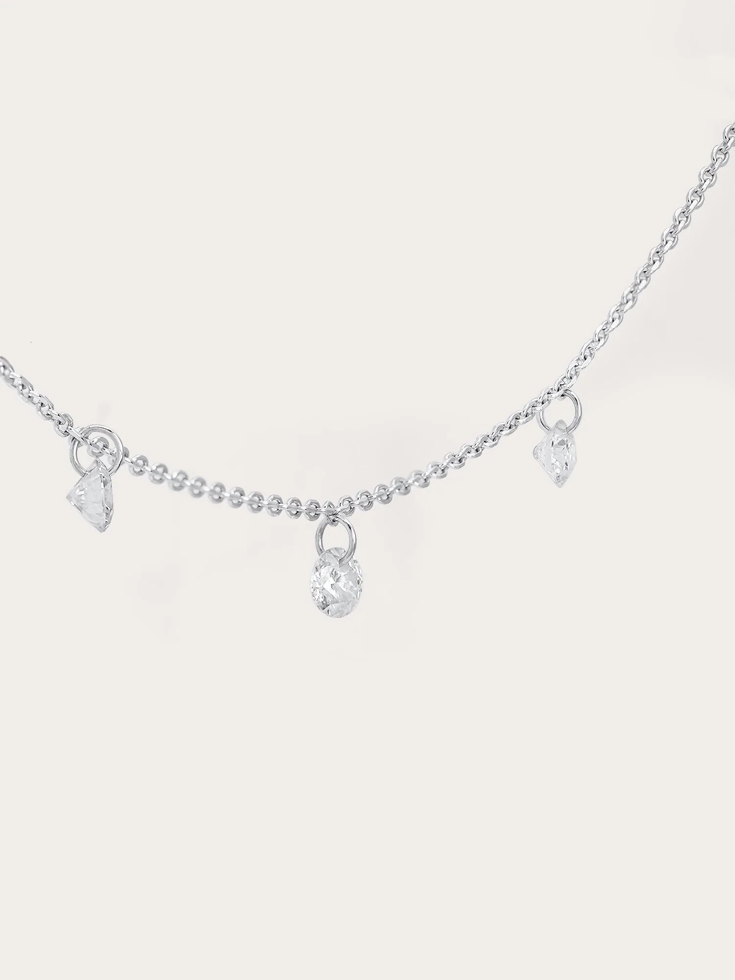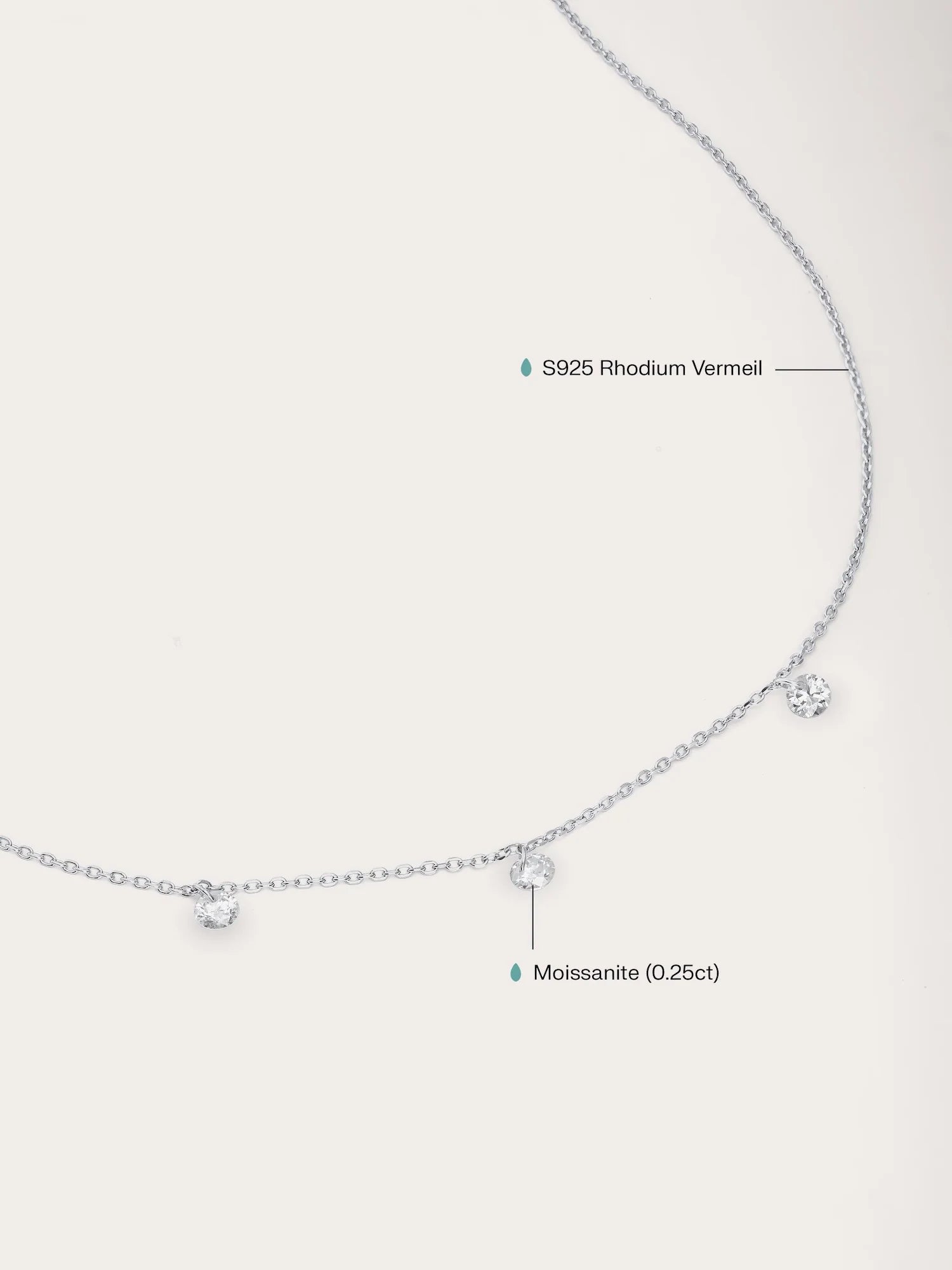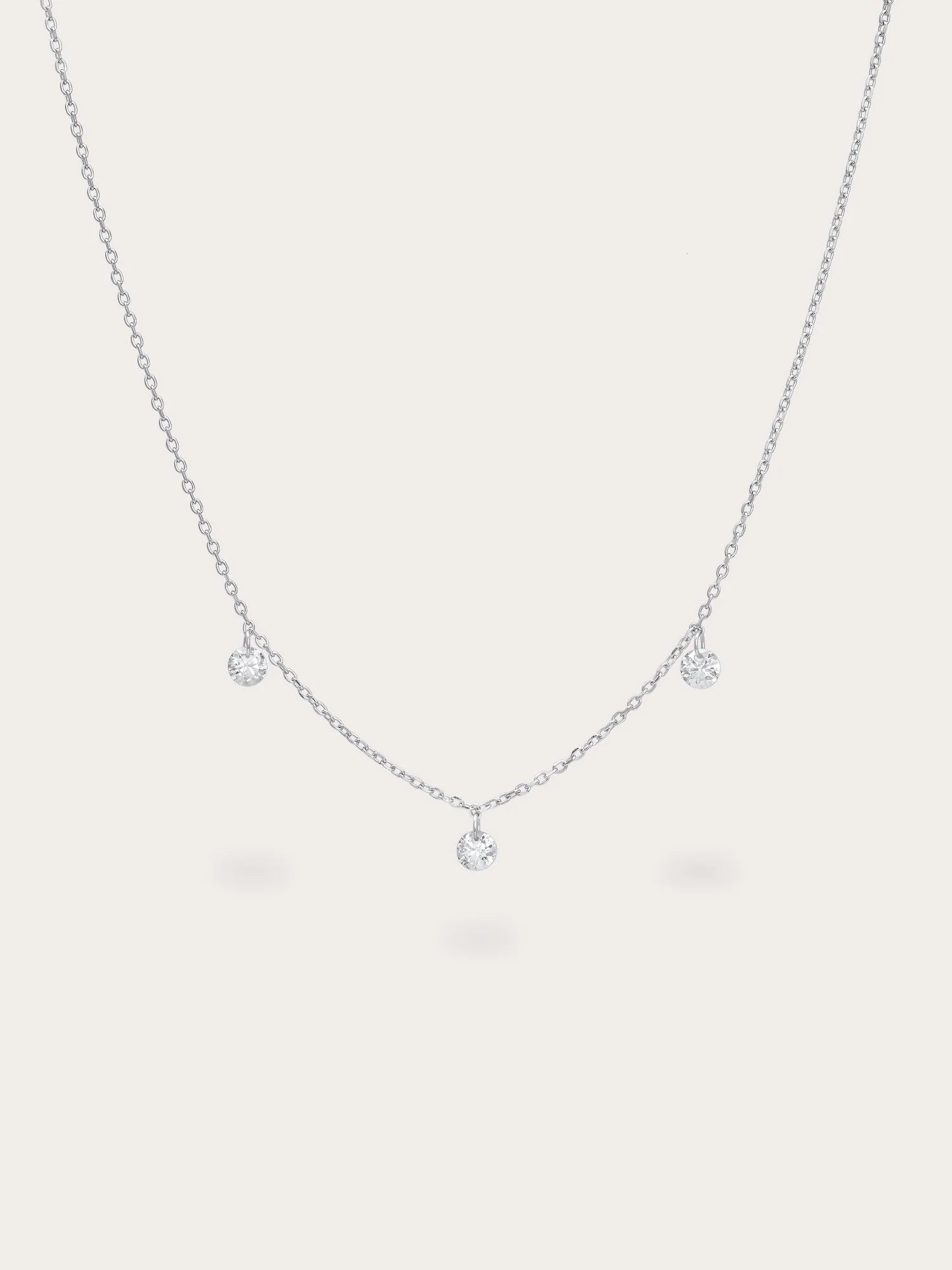 This necklace features three moissanite stones that hang delicately without prongs, reflecting light from all angles to enhance their sparkle. It is handcrafted with a type of vermeil plating on a base metal.