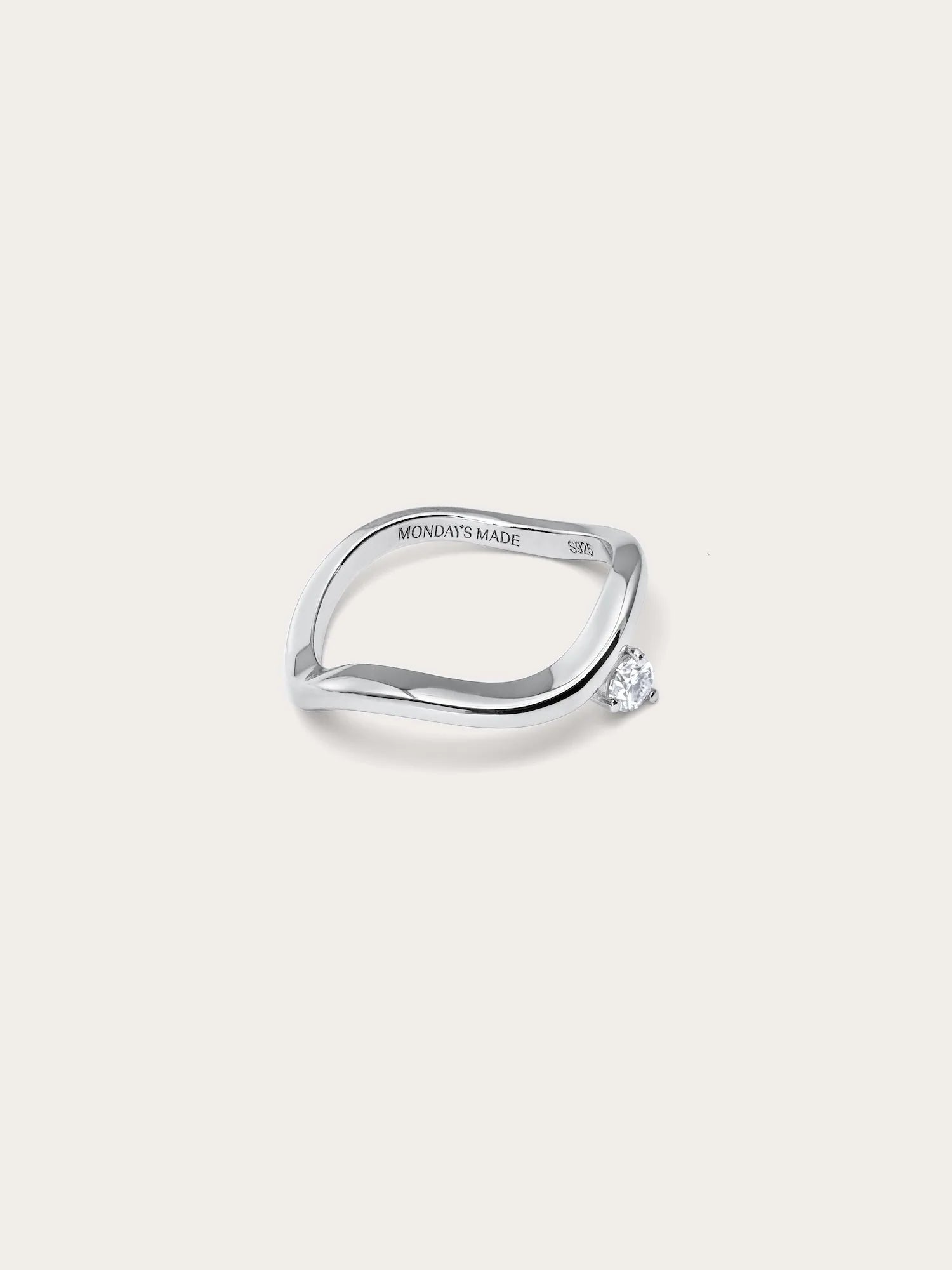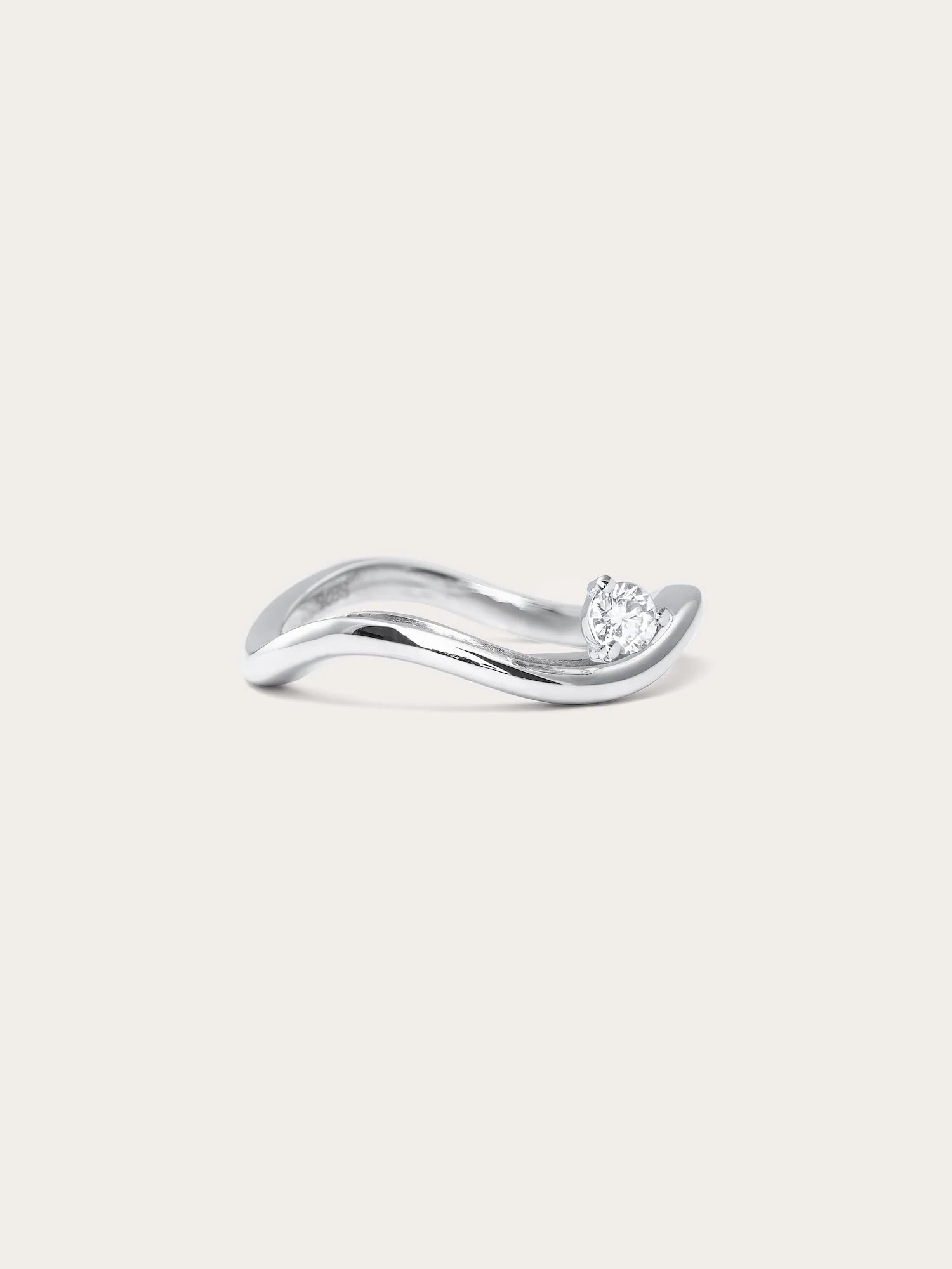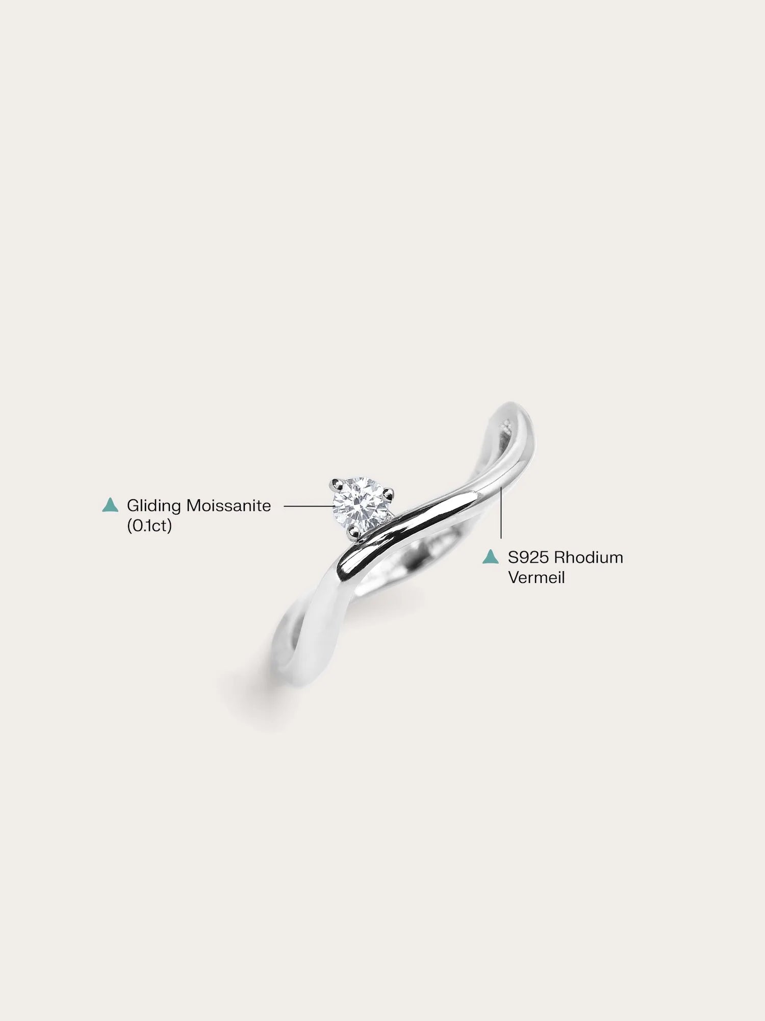 Explore the distinctive charm of this floating moissanite wave ring. It has a dazzling moissanite stone that moves along the curved band, producing a captivating floating effect. It is hand - crafted using a material with a thick rhodium plating on a base metal.