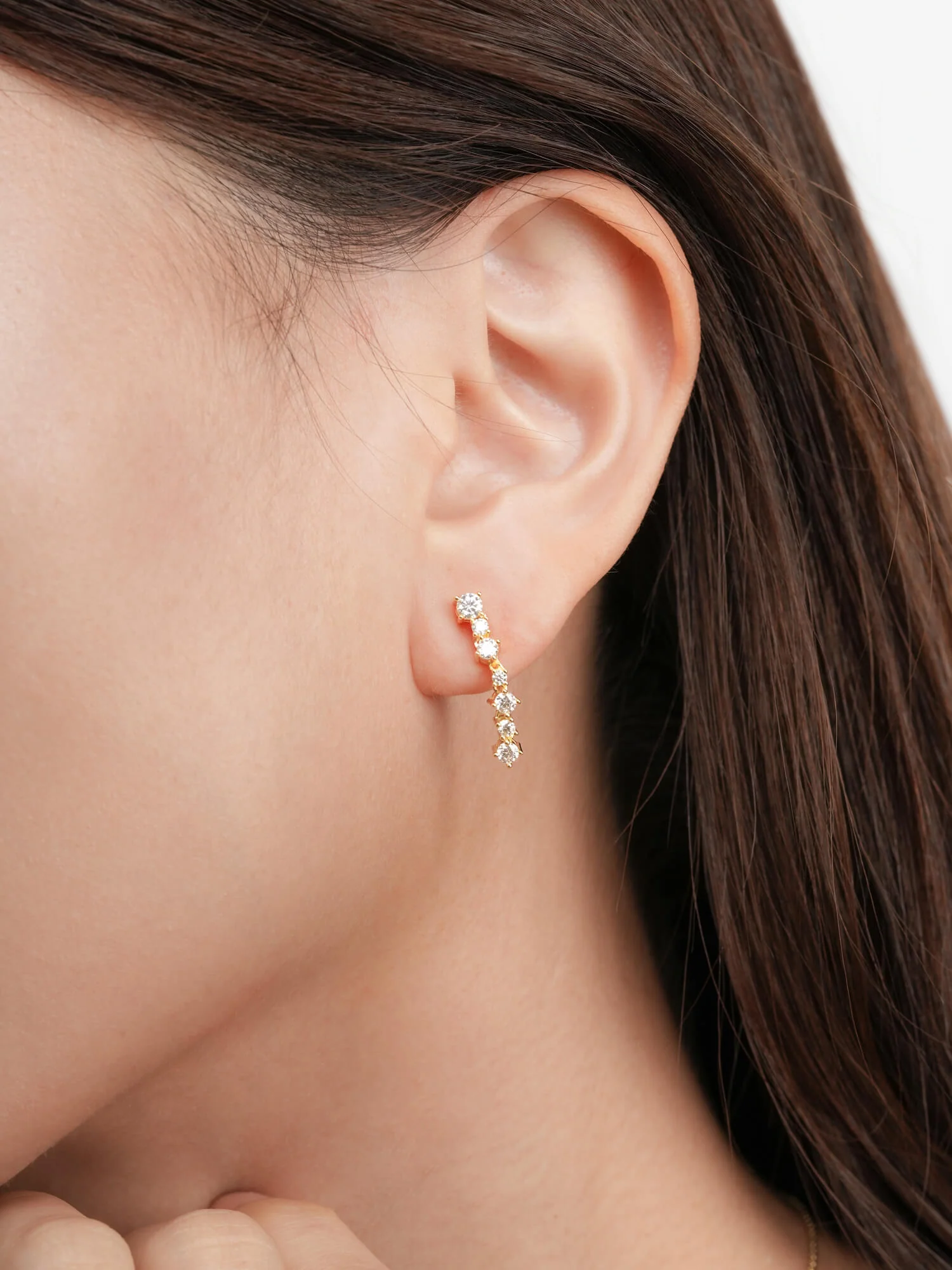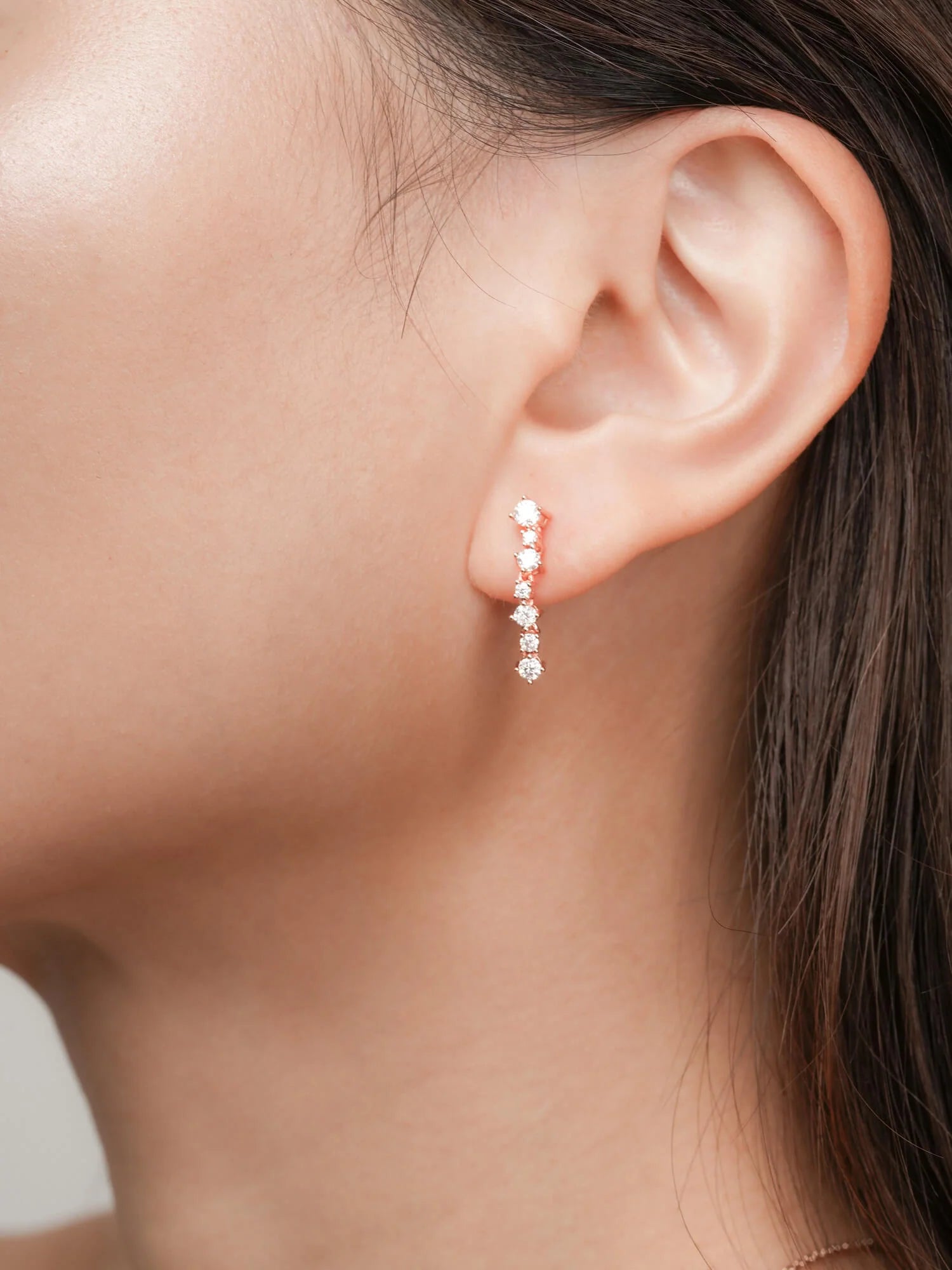 These dangle earrings feature a delicate arrangement of small, brilliant moissanite stones in various sizes, cascading with a radiant sparkle. They are handcrafted in S925 rhodium vermeil.