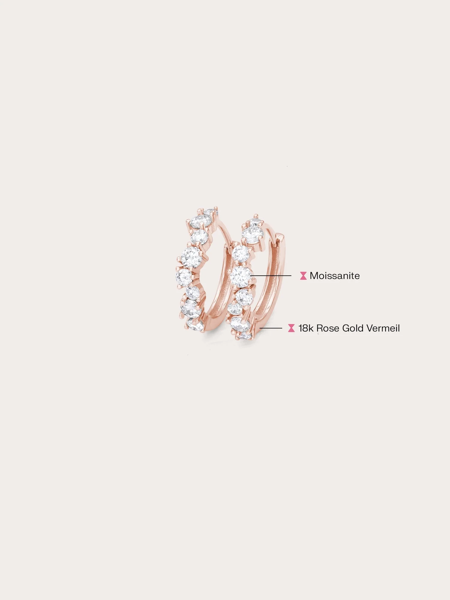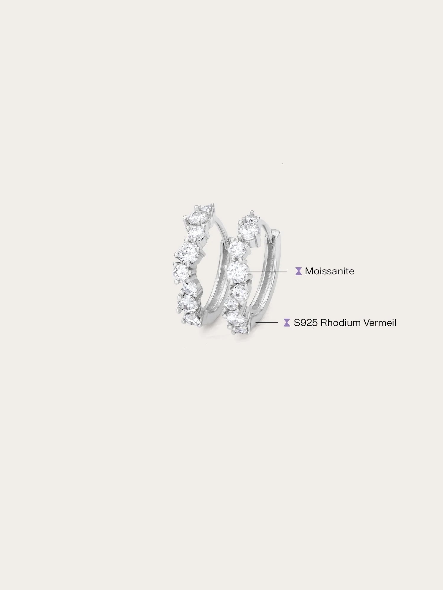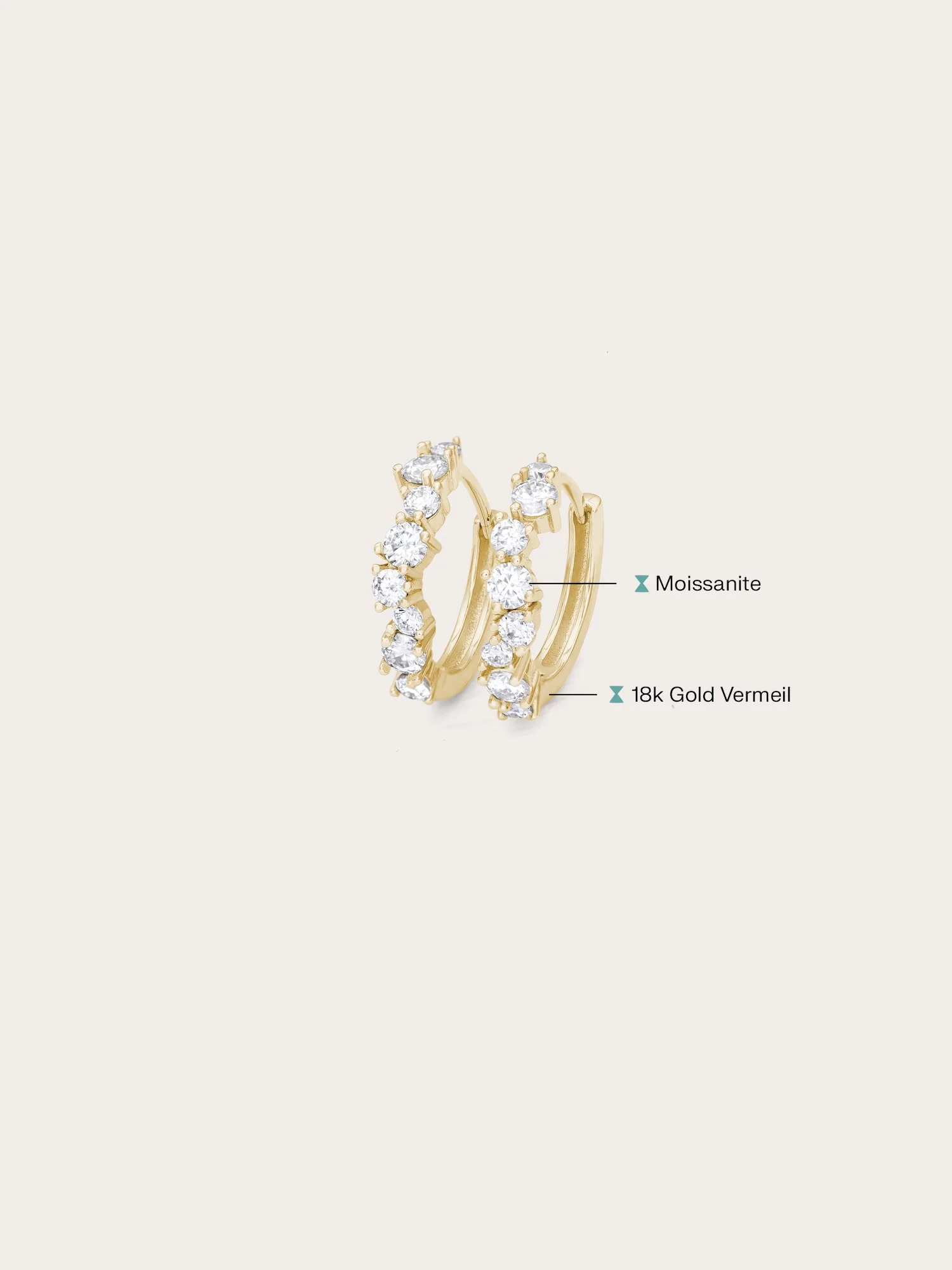 These huggie earrings are adorned with small, brilliant moissanites in different sizes. Their arrangement creates a subtle yet elegant look with a bit of sparkle.