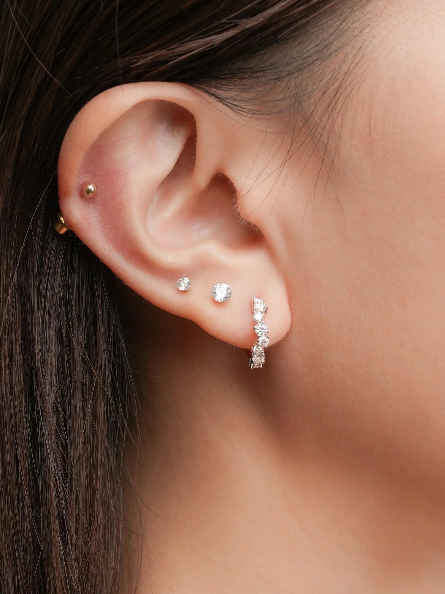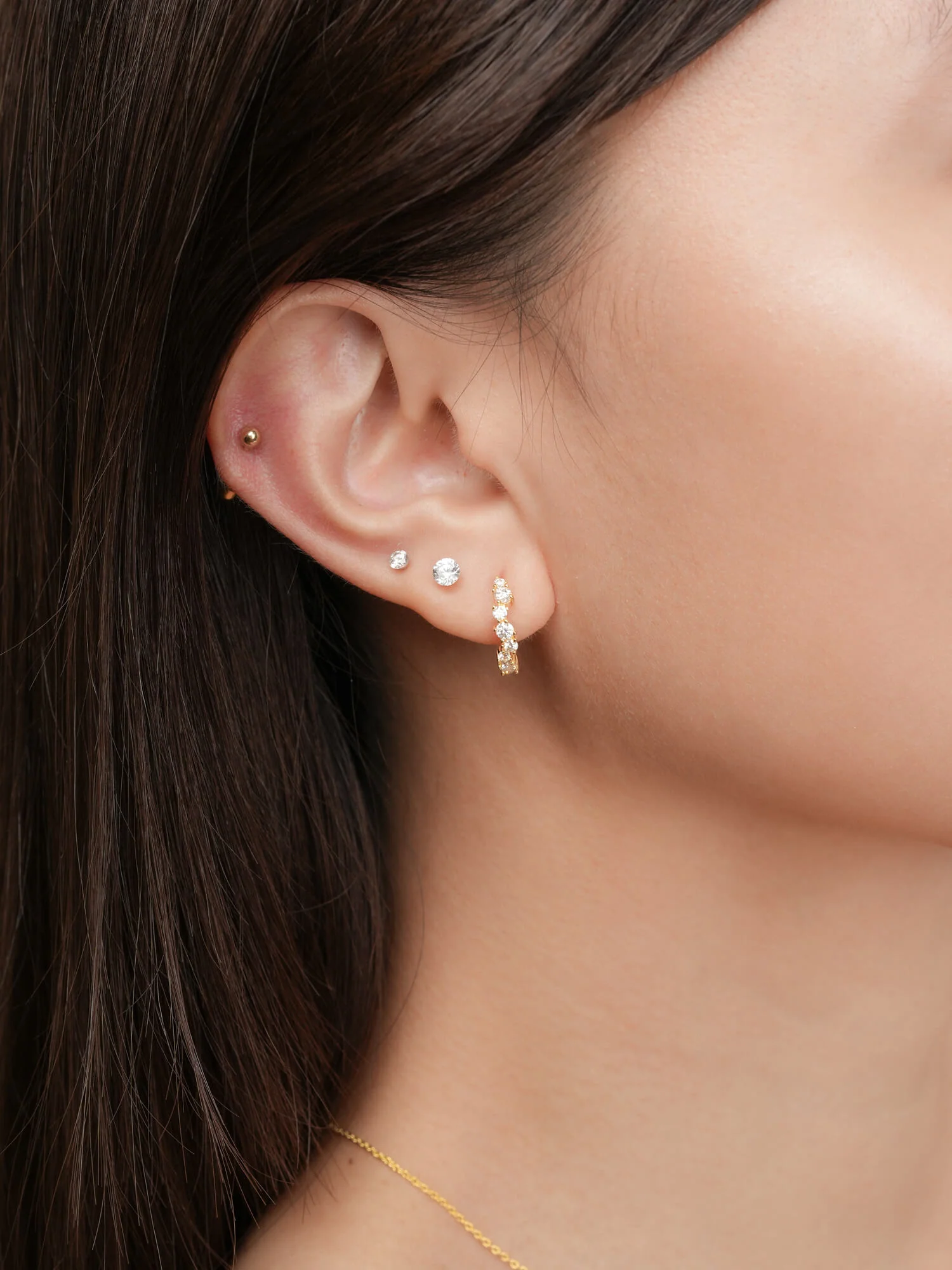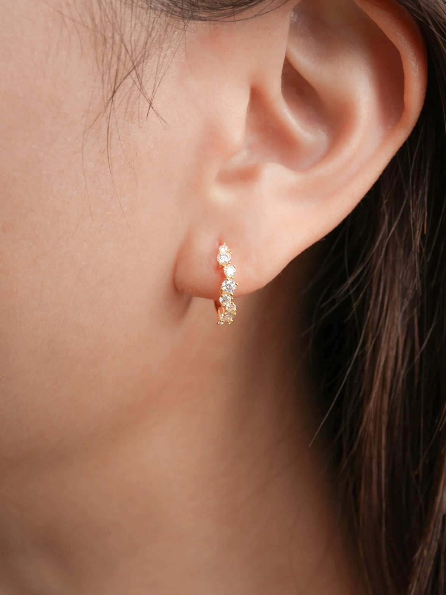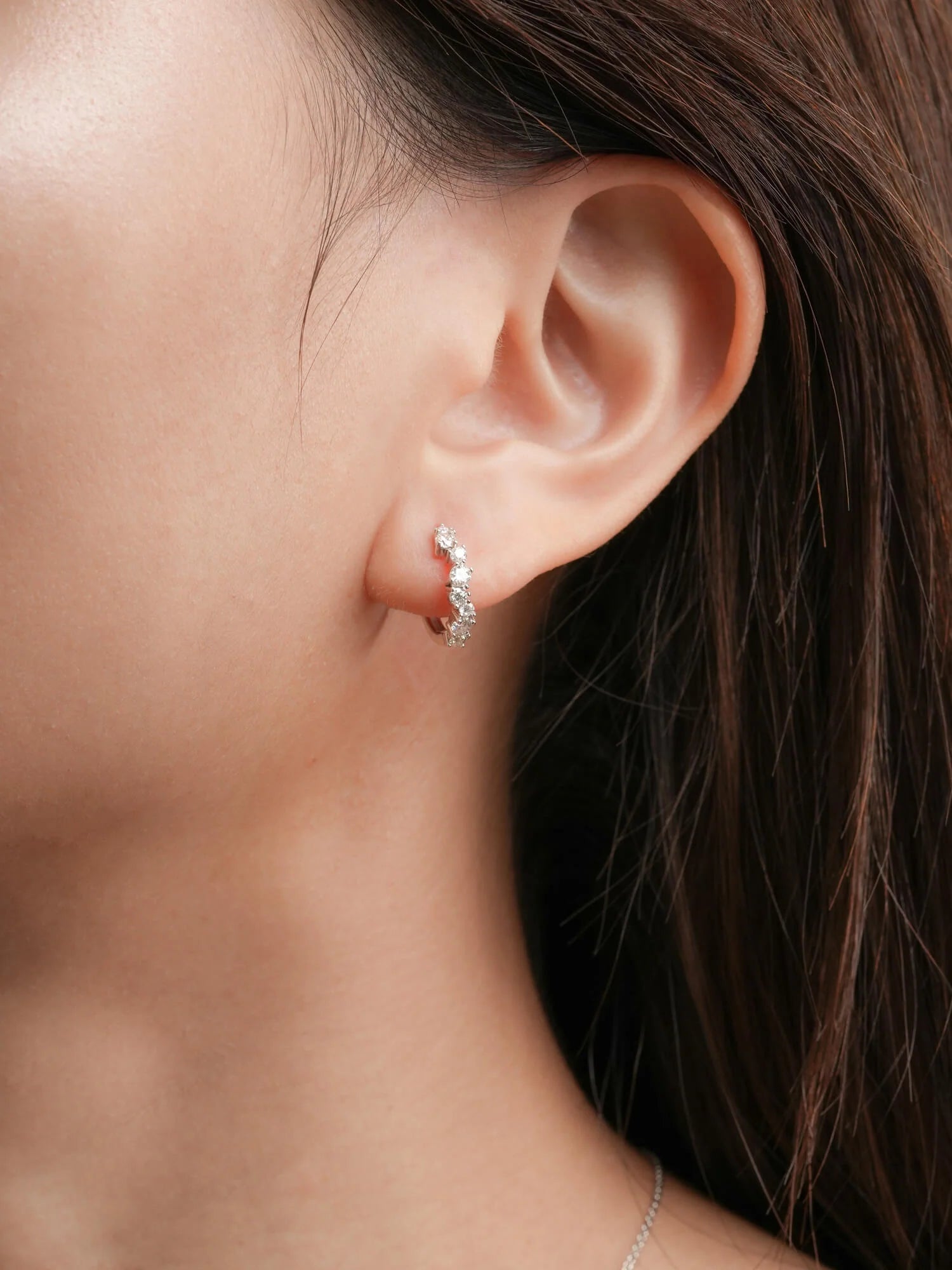 These huggie earrings are adorned with small, brilliant moissanites in different sizes. Their arrangement creates a subtle yet elegant look with a bit of sparkle.