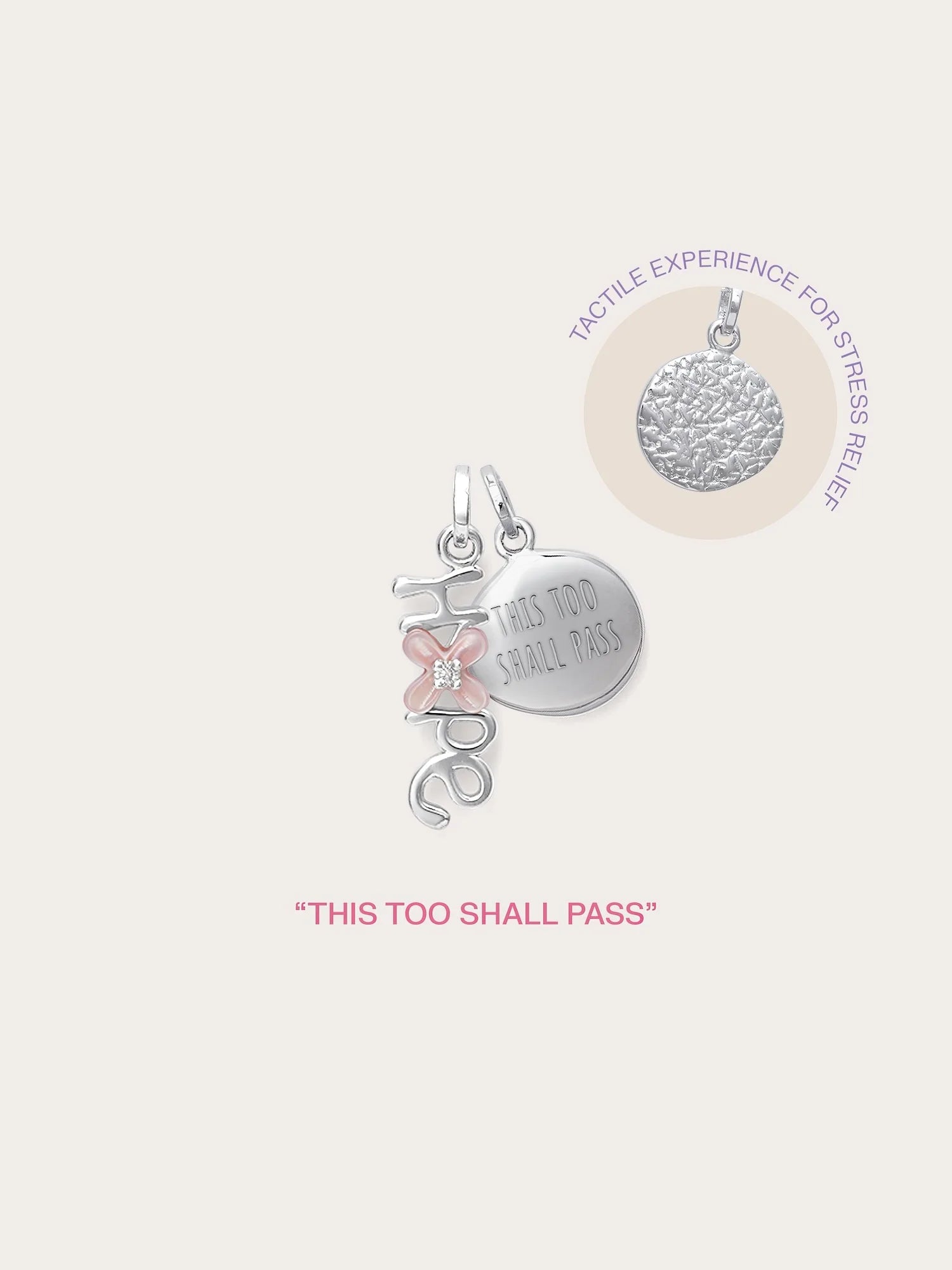 This two - piece set includes a word charm and a bean - shaped charm. The bean charm has an engraved positive message on the front and a textured back for a calming tactile feel.