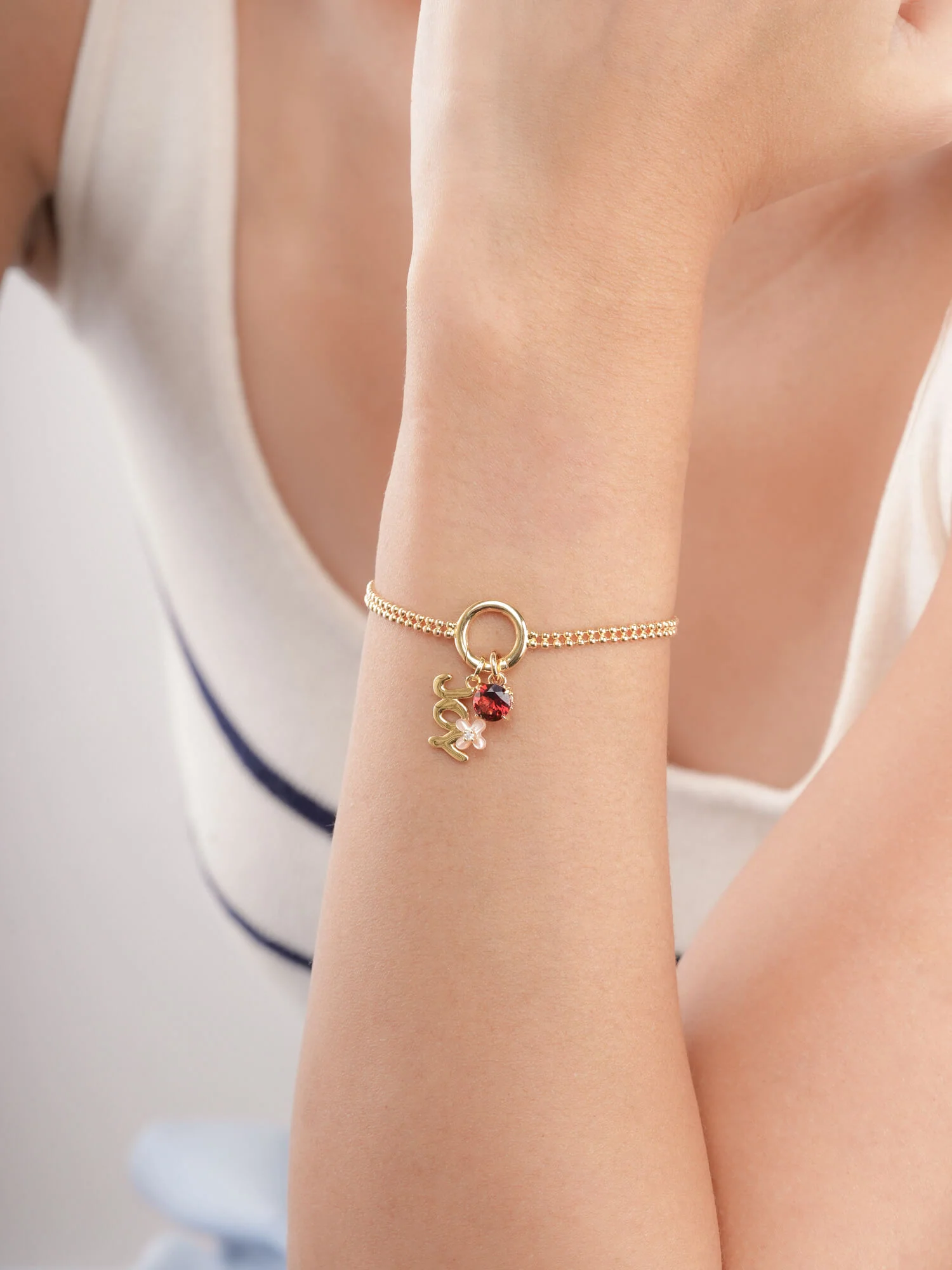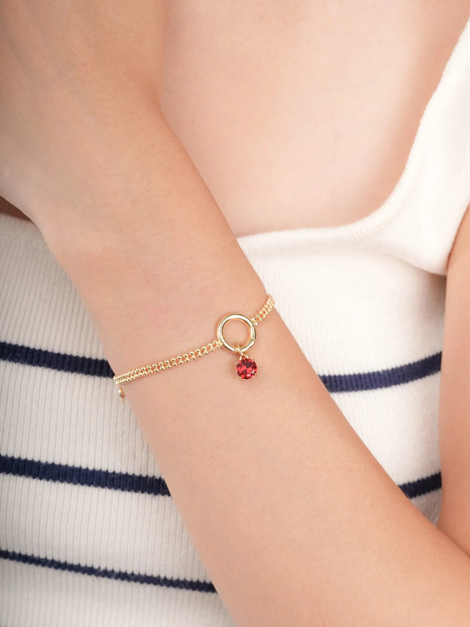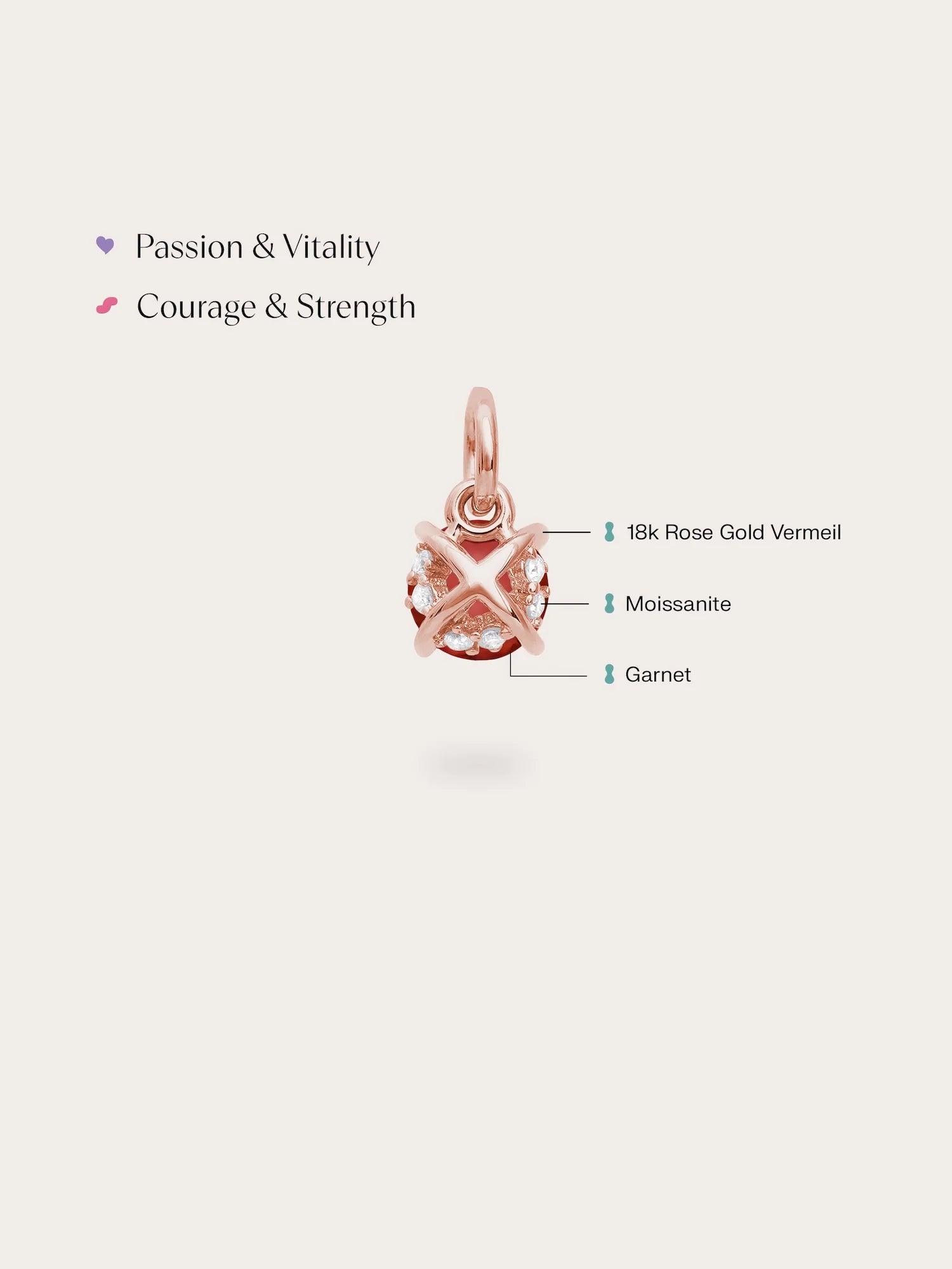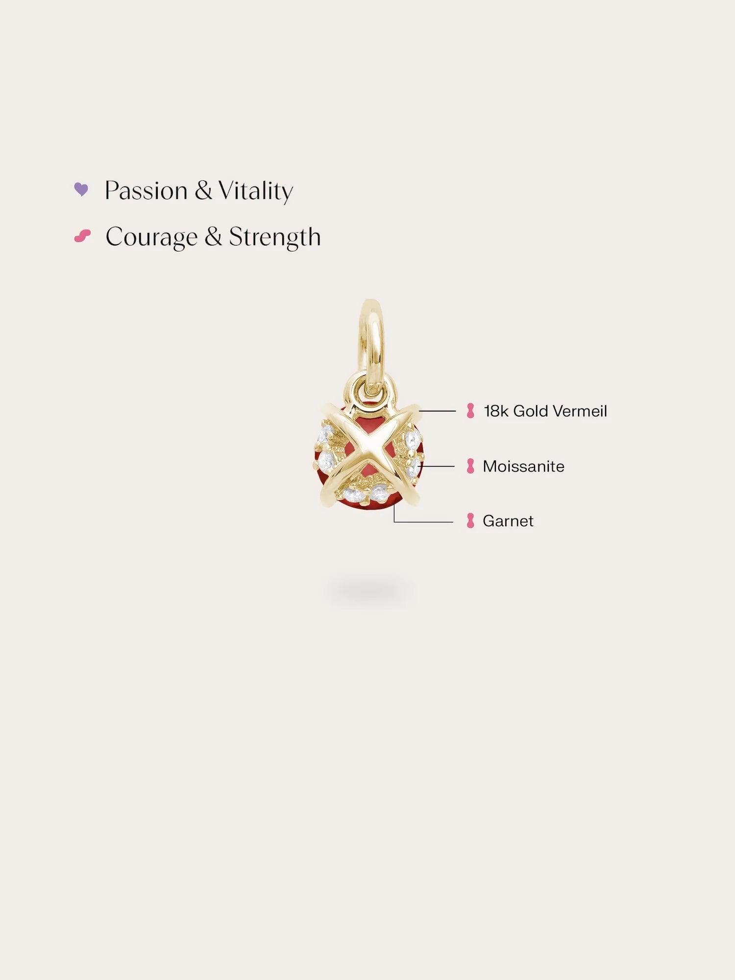 This birthstone charm features a natural, diamond-cut garnet, set in a charm inspired by a classic symbol representing love and connection.