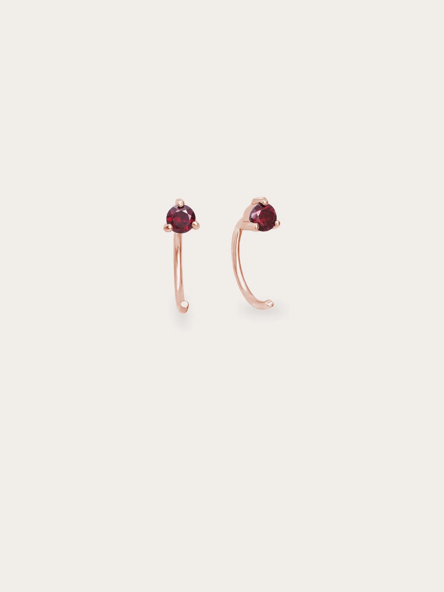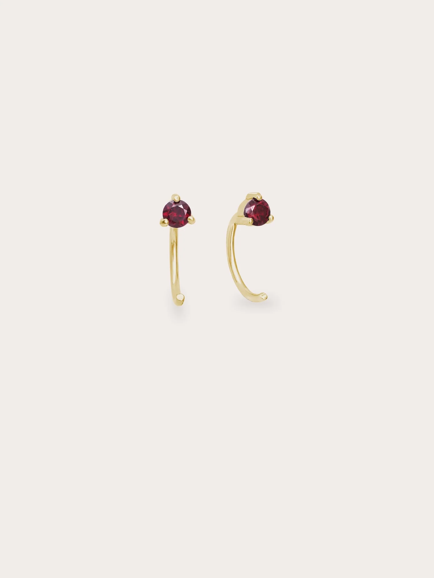 These mini hoop earrings feature natural garnet stones. They are designed for daily wear, with open hoops that are easy to put on, lightweight, versatile, and comfortable. They're suitable for the 1st, 2nd, and 3rd ear piercings. Handmade with 18k gold vermeil.