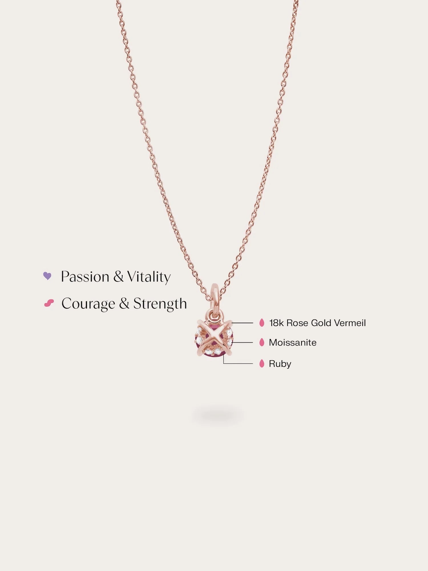 Adding a modern twist, the pendant features a hidden "X" design on the back. Accent moissanite stones are delicately set to peek out from beneath the focal stone. These embellishments create a dazzling profile, adding depth and brilliance to this meaningful piece. Handcrafted in 18k rose gold vermeil.