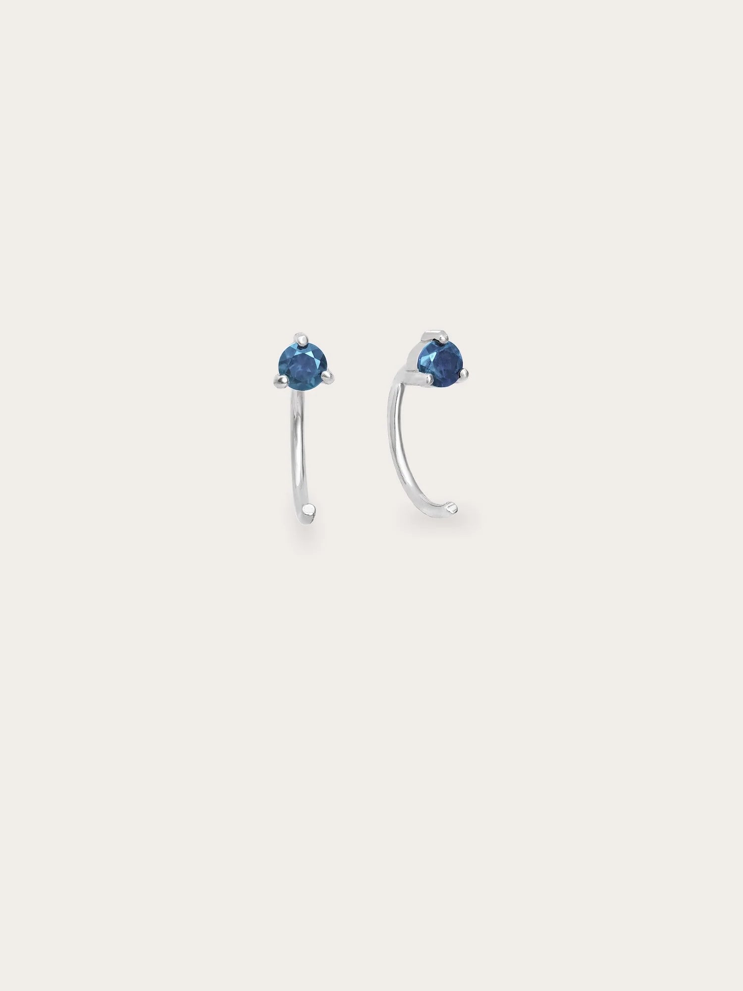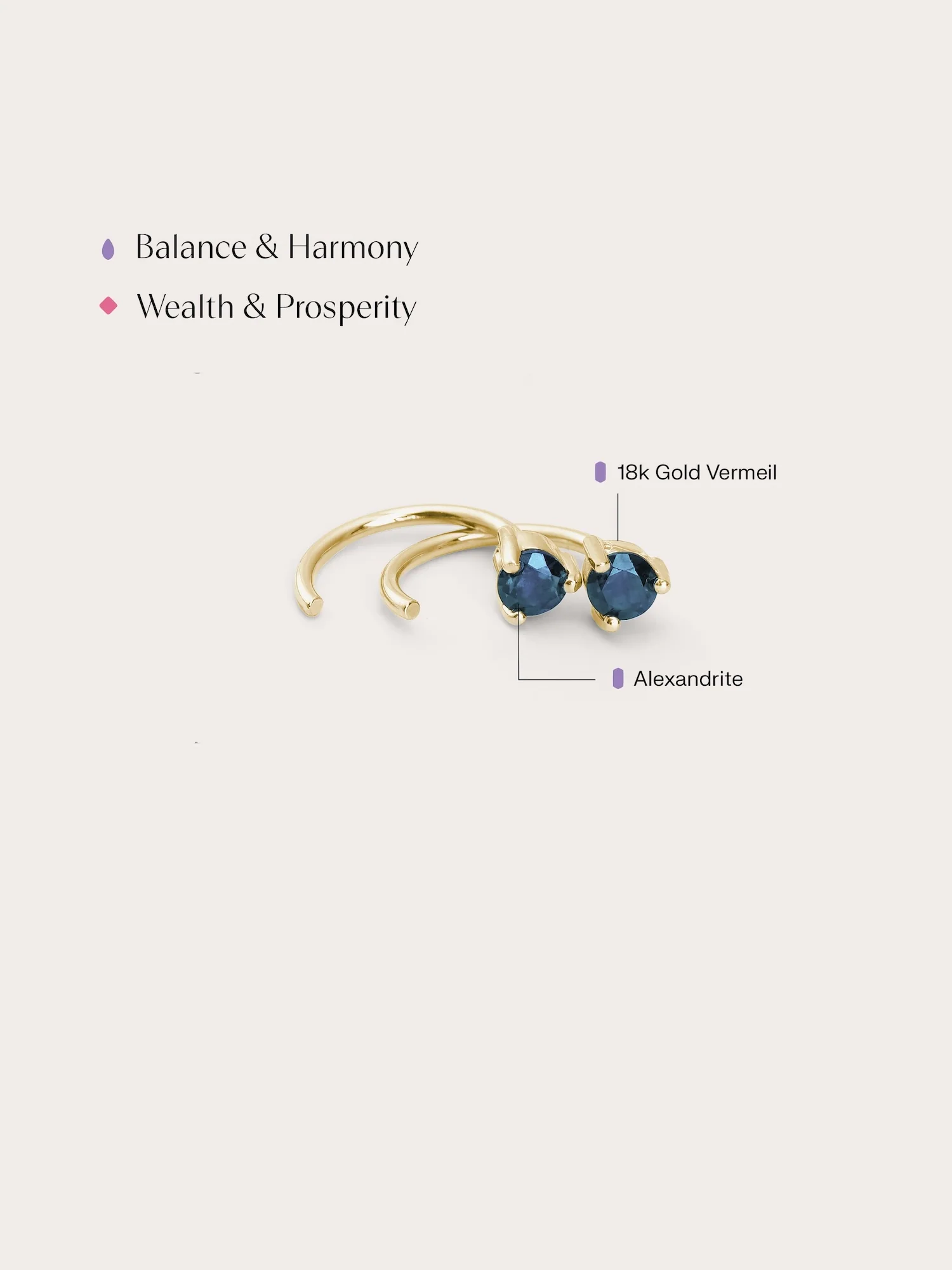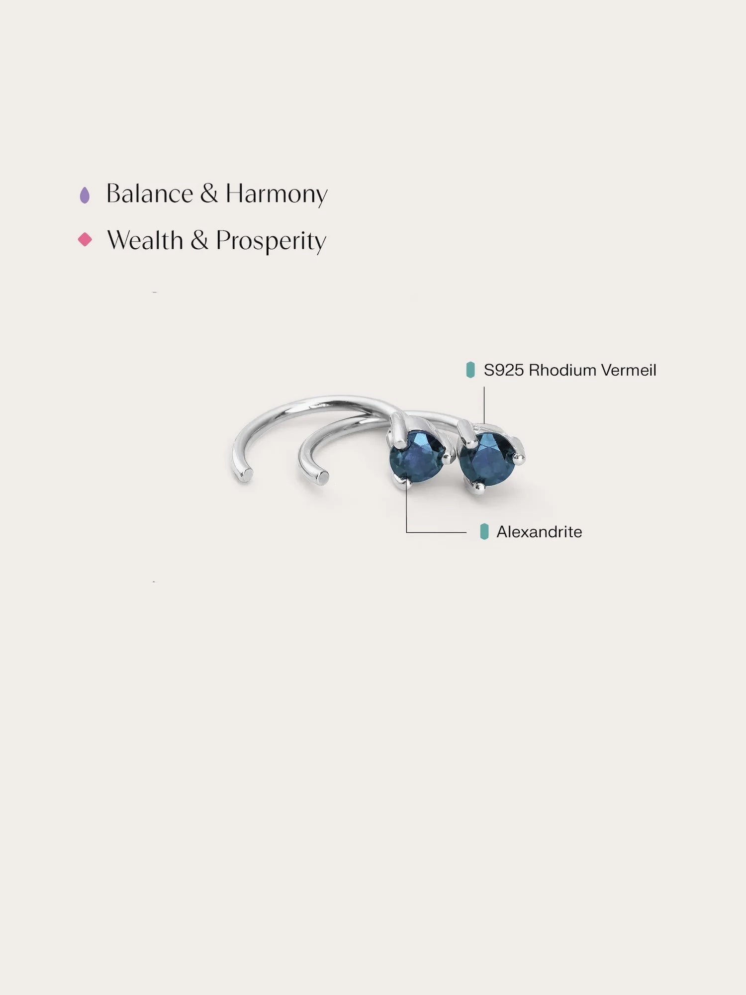 These mini hoop earrings feature lab-grown alexandrite stones. They are designed for daily wear. The open hoops are easy to wear, lightweight, versatile, and comfortable. They are suitable for the 1st, 2nd, and 3rd piercings. They are handcrafted with a type of vermeil where a thick layer of rhodium is plated on sterling silver.
