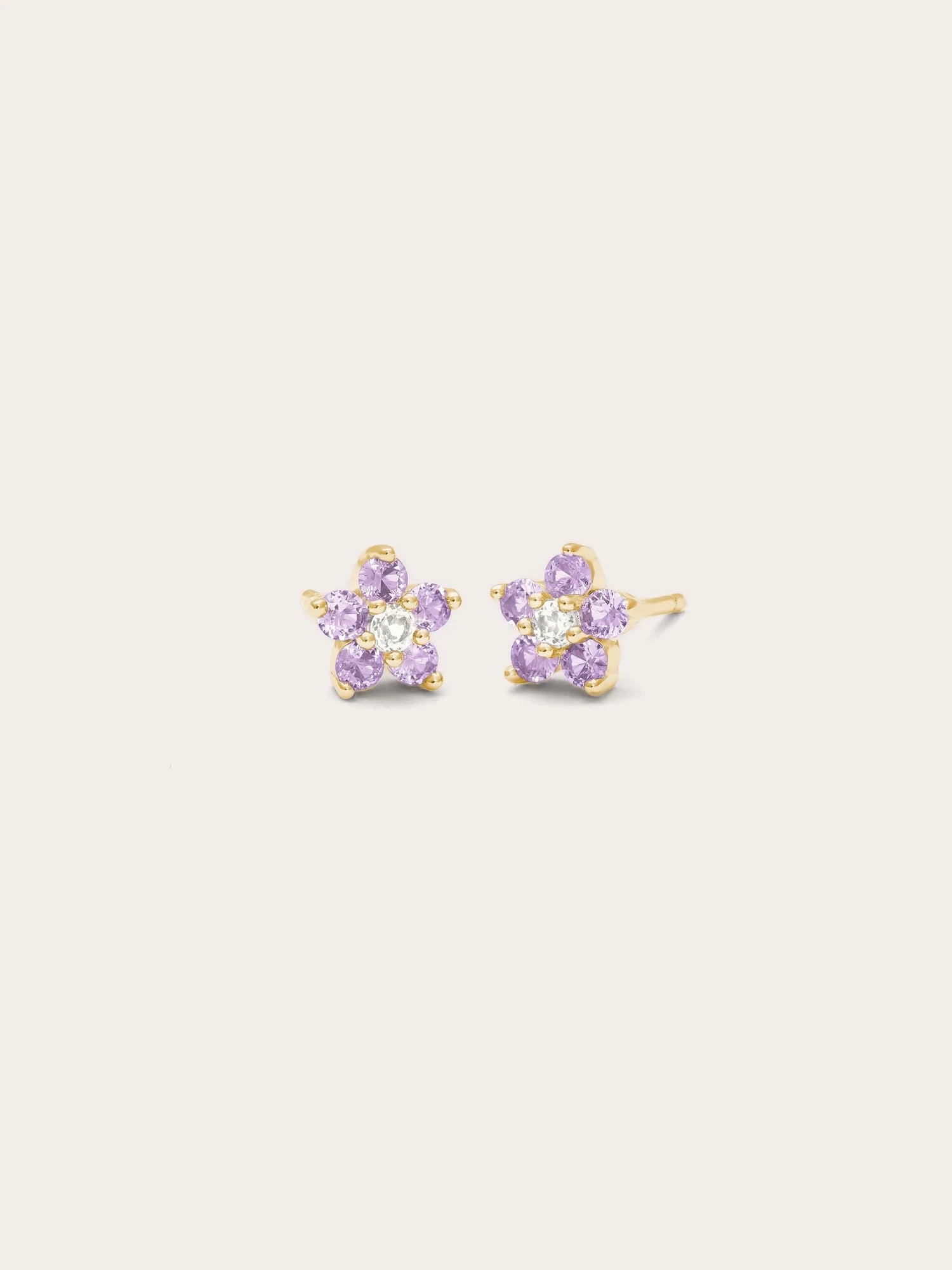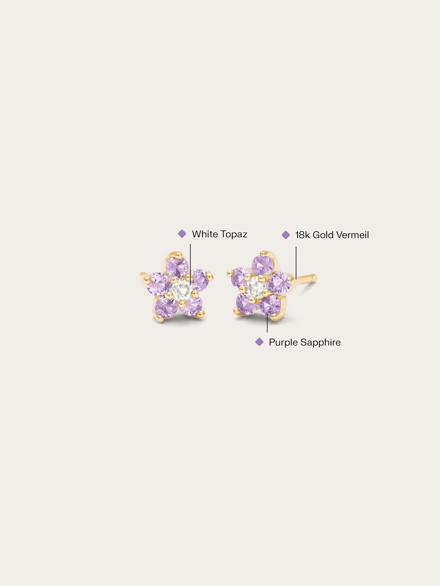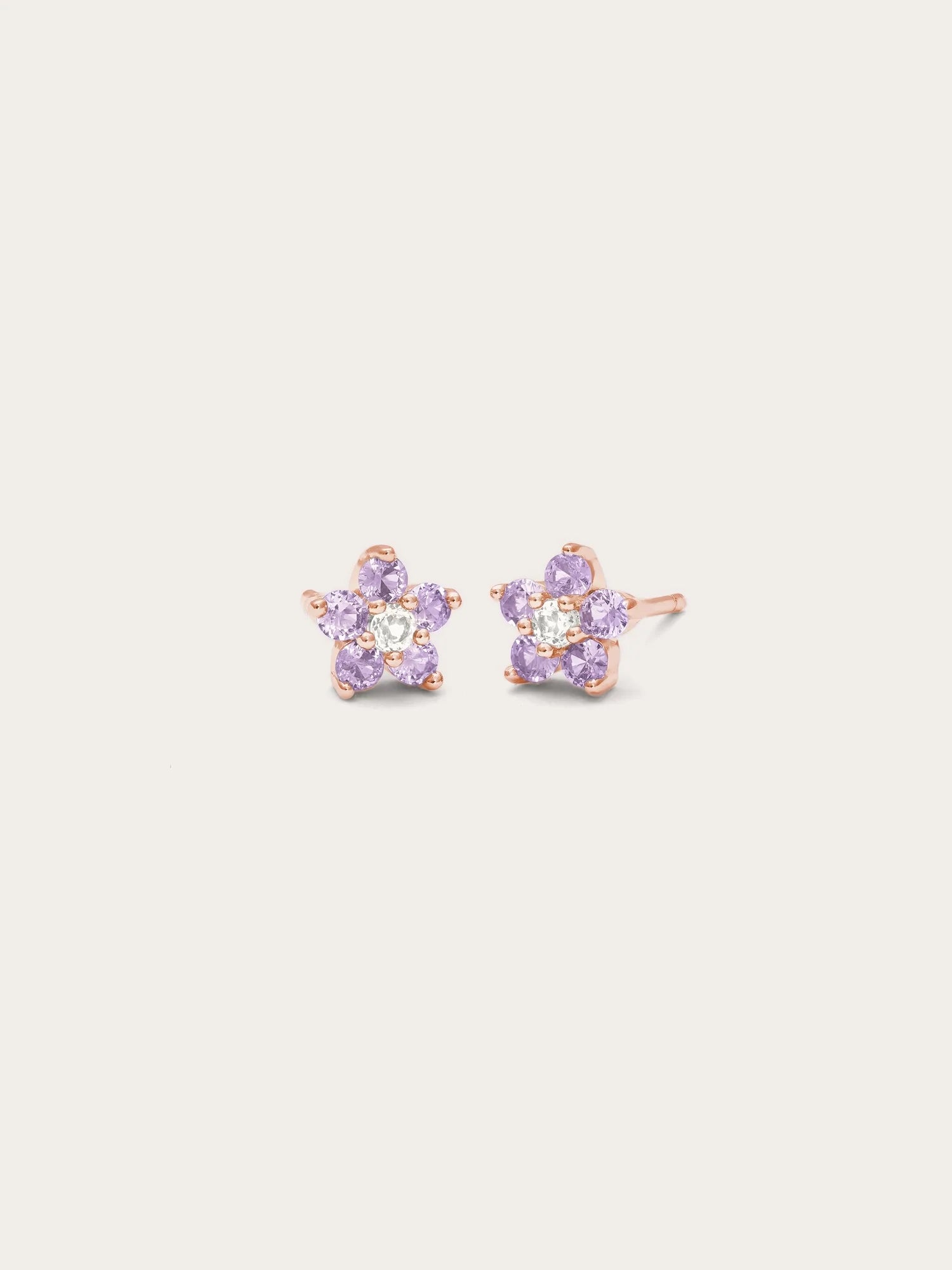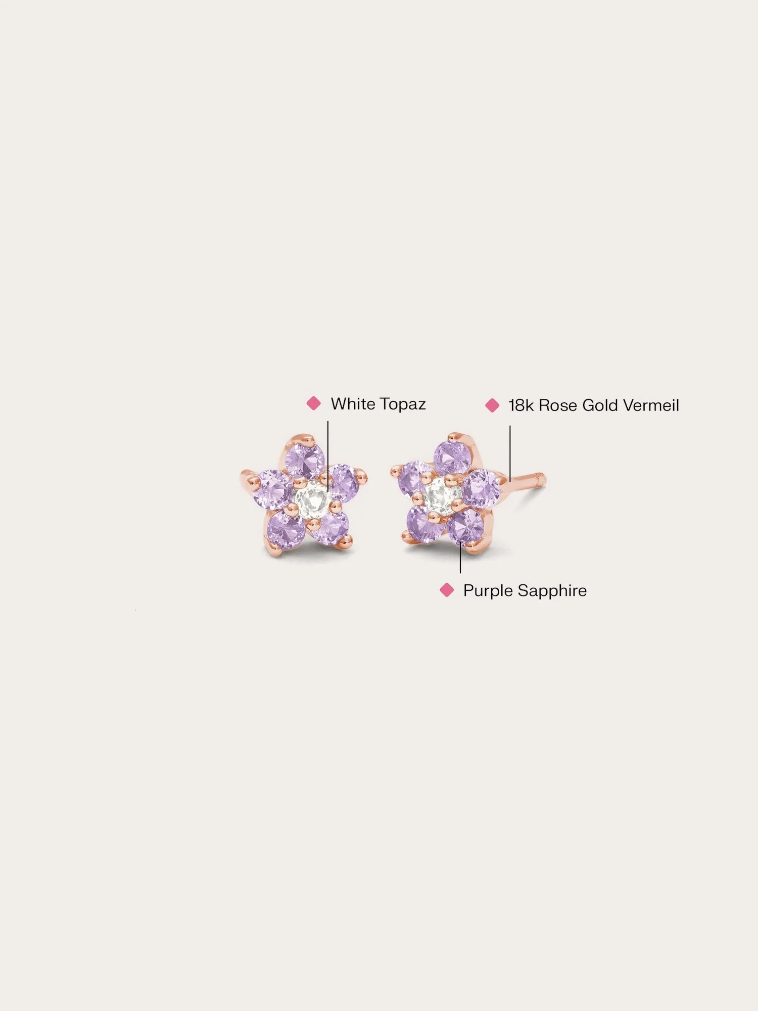 Celebrate your journey with the Lavender Flower Stud Earrings, a tribute to growth and inner wisdom. Featuring five light purple sapphire stones, these dainty flower earrings bring a soft touch of elegance and meaning to your everyday style. Handcrafted in 18k rose gold vermeil.