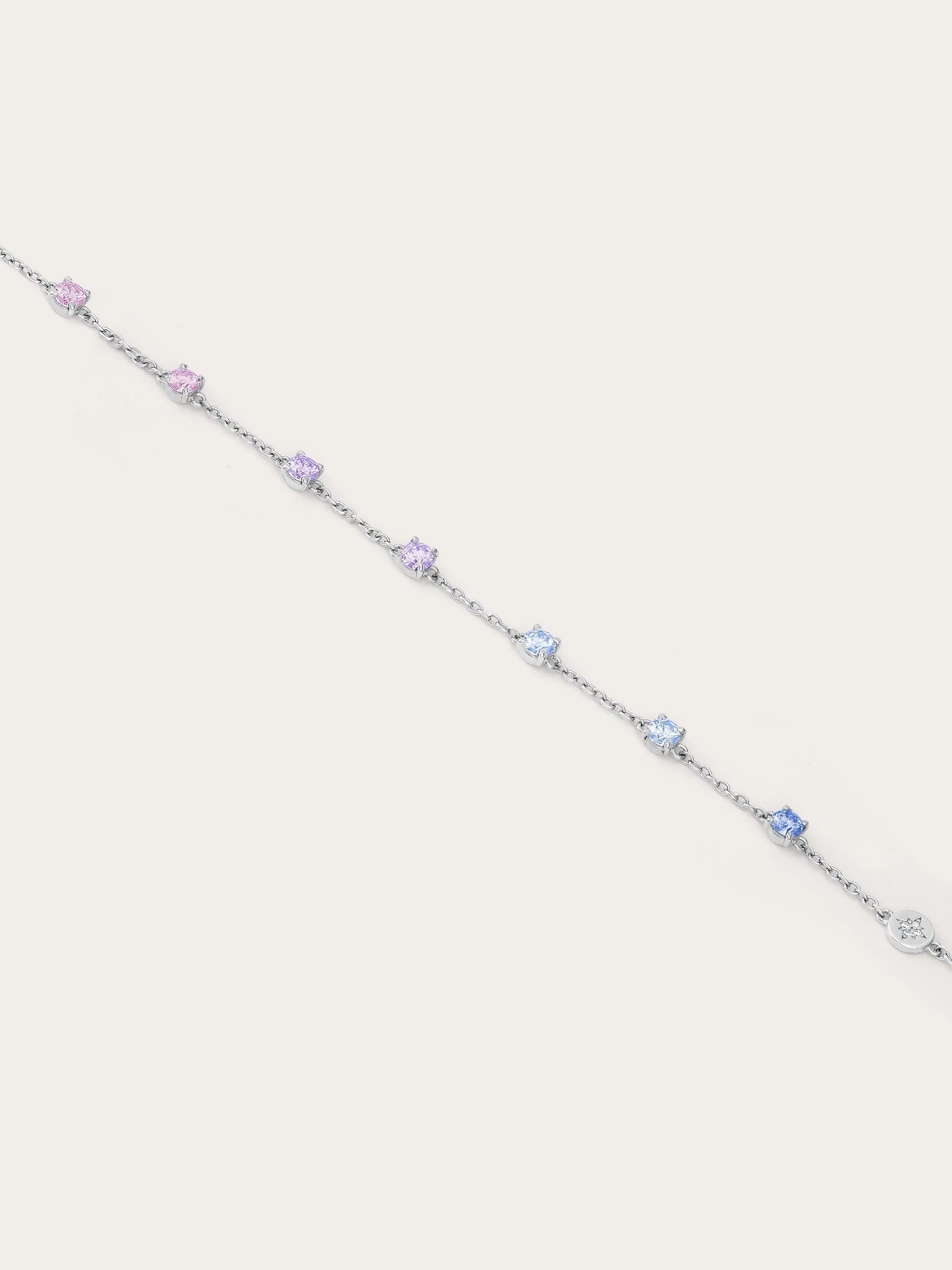 Evoking the tranquility of a lilac sunset, this bracelet showcases 7 moissanite stones with a captivating pink, purple, and blue gradient. It is handcrafted using a specific silver - rhodium plating method.