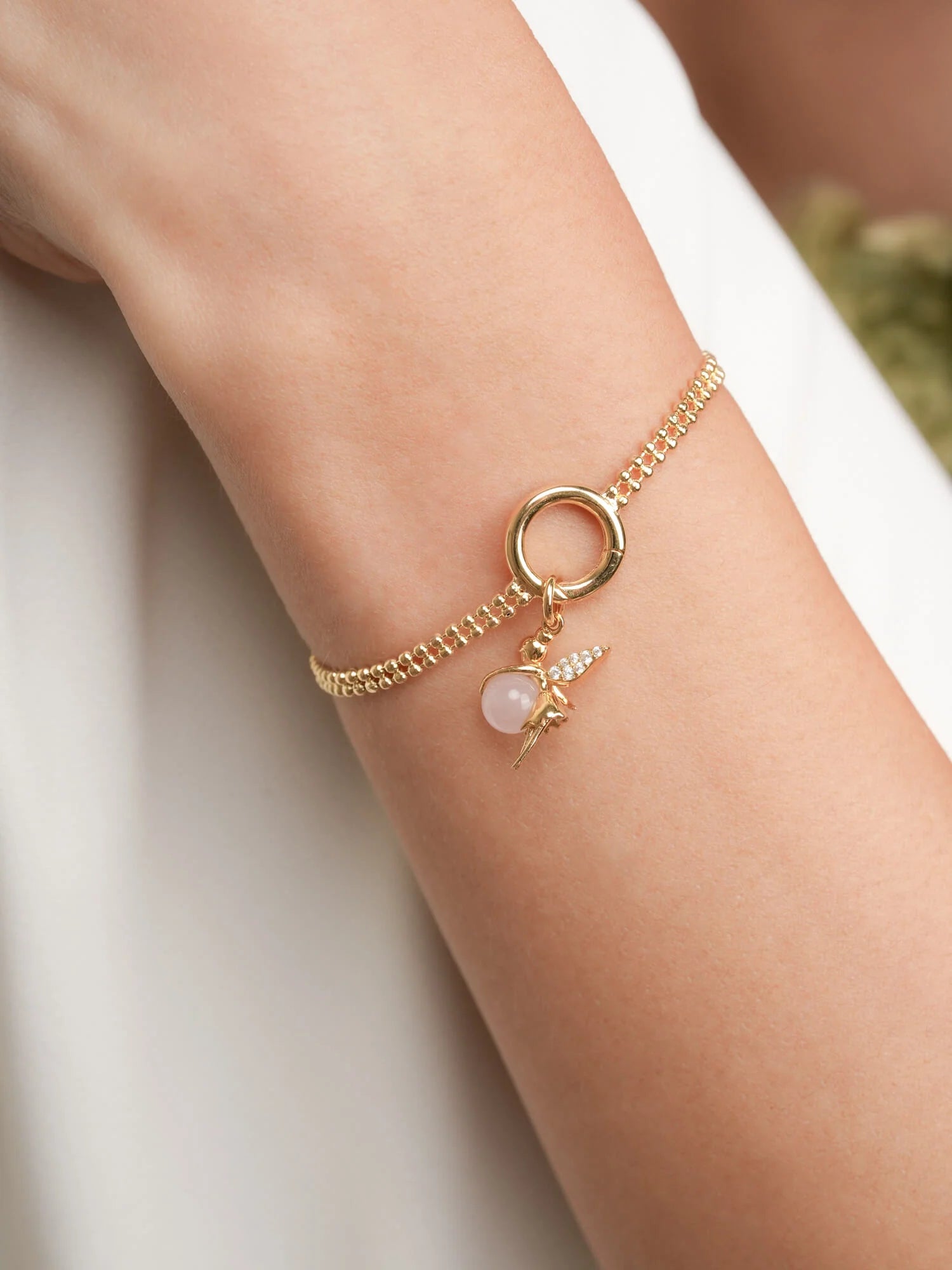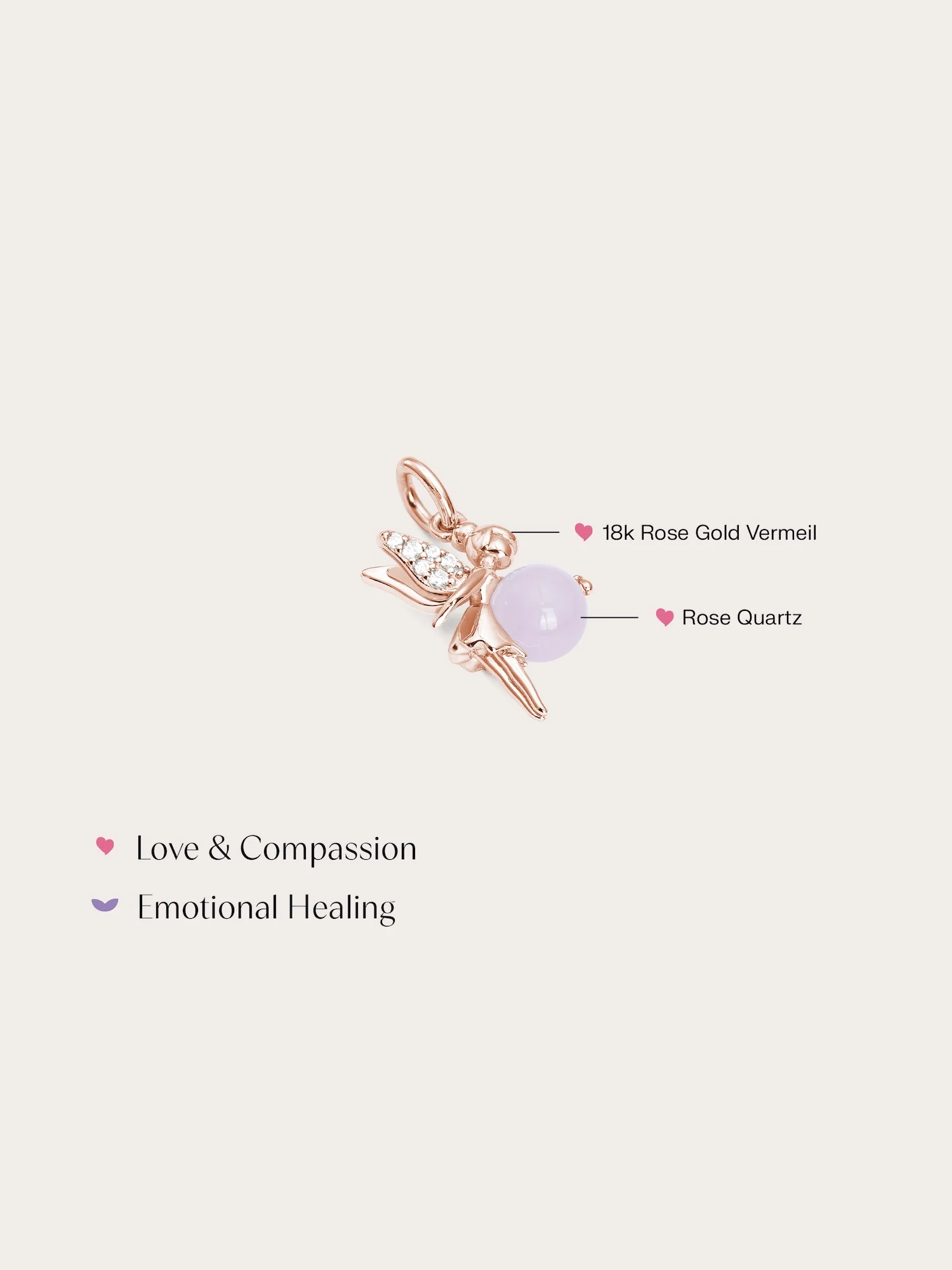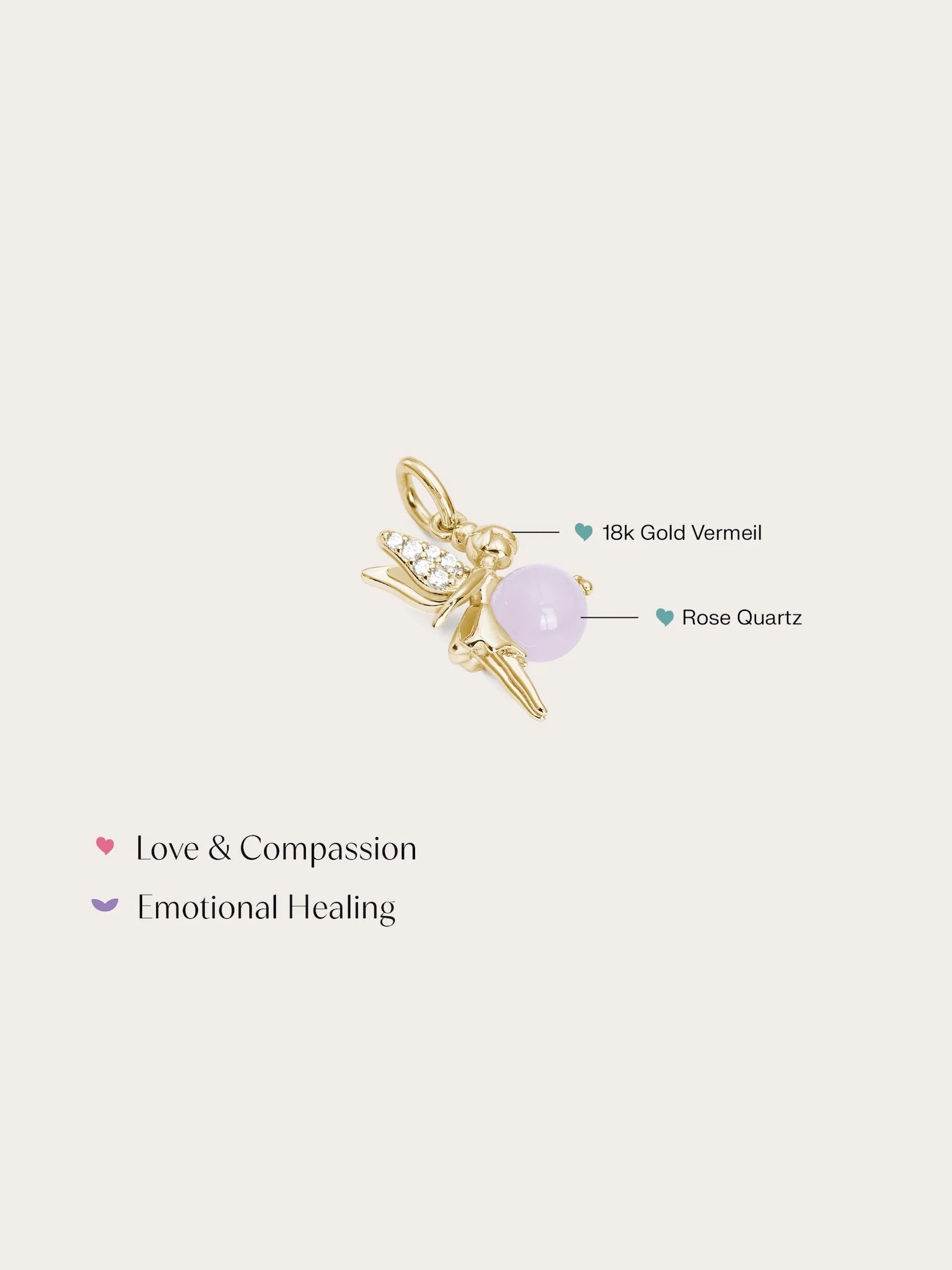 Skillfully crafted, this charm depicts a charming fairy holding a glowing rose quartz stone, conveying wishes of love, kindness, and emotional restoration. It's a meaningful memento or a considerate gift, carrying your wishes and making them come true. Handmade with 18k gold vermeil.