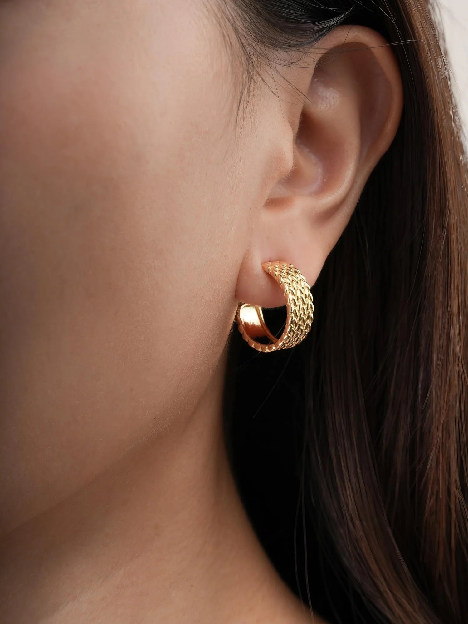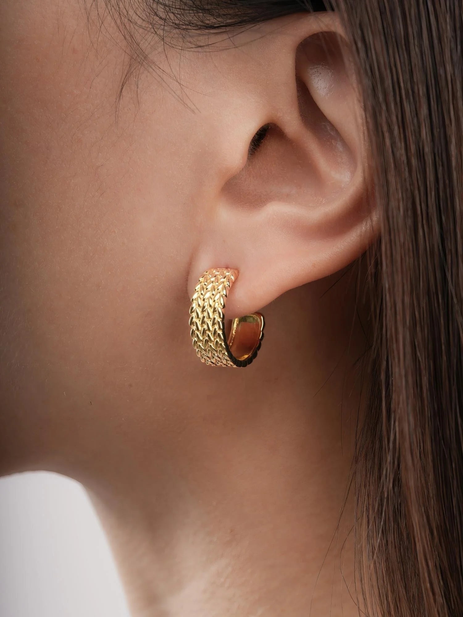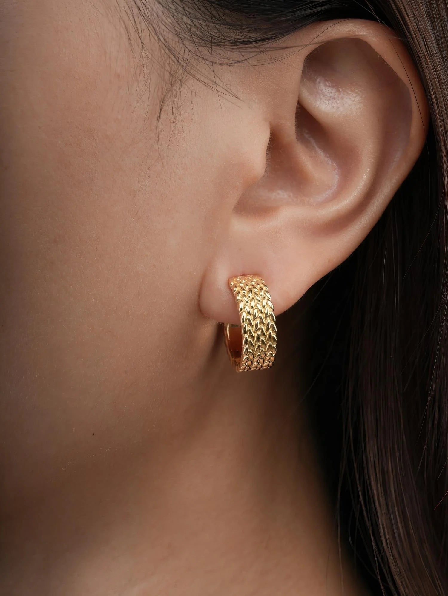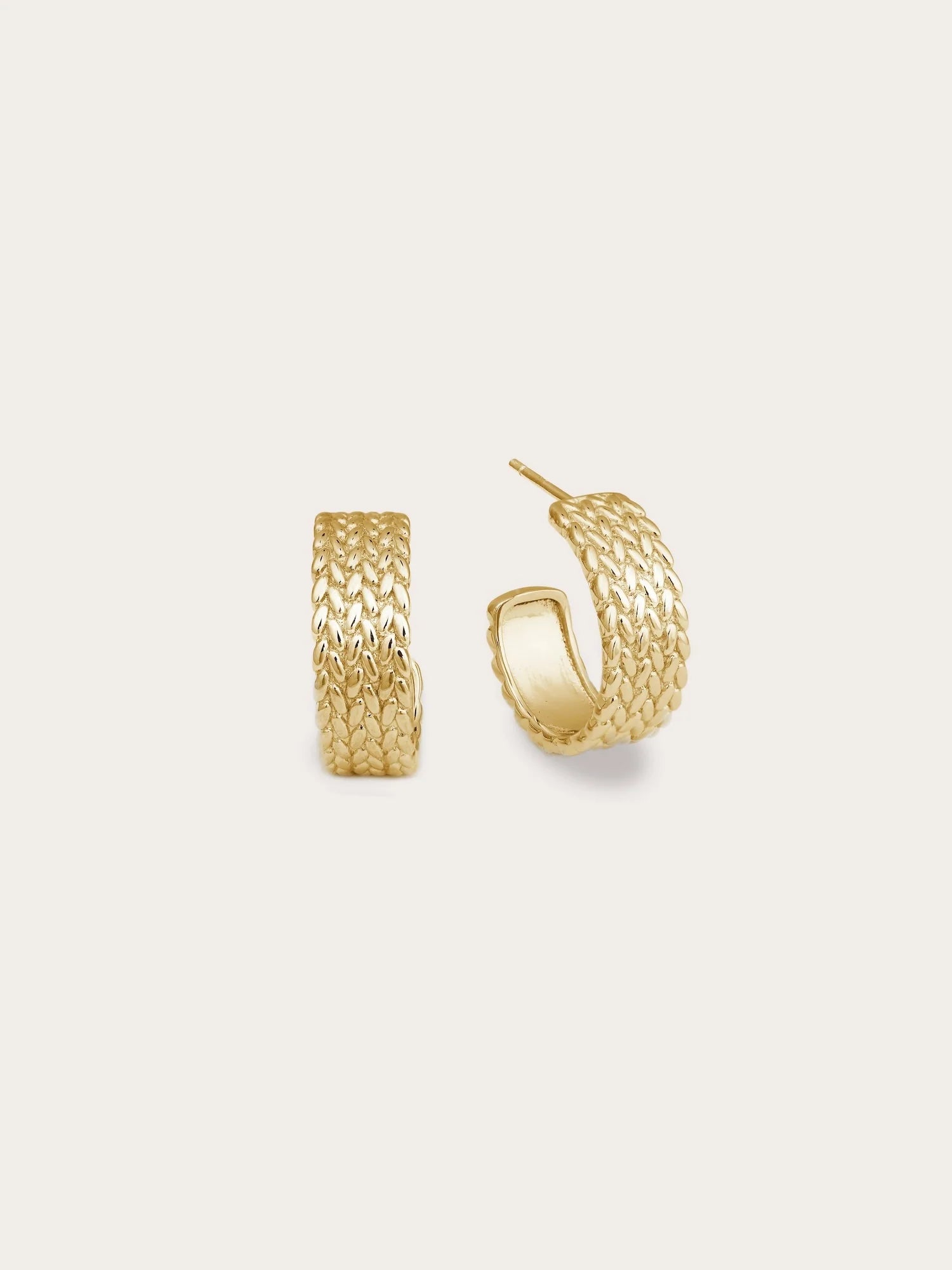 Inspired by old - style mesh watch bands, these hoop earrings combine tradition with modern elements. Their unique texture quietly showcases a trendy style. Hand - made with 18k gold vermeil.