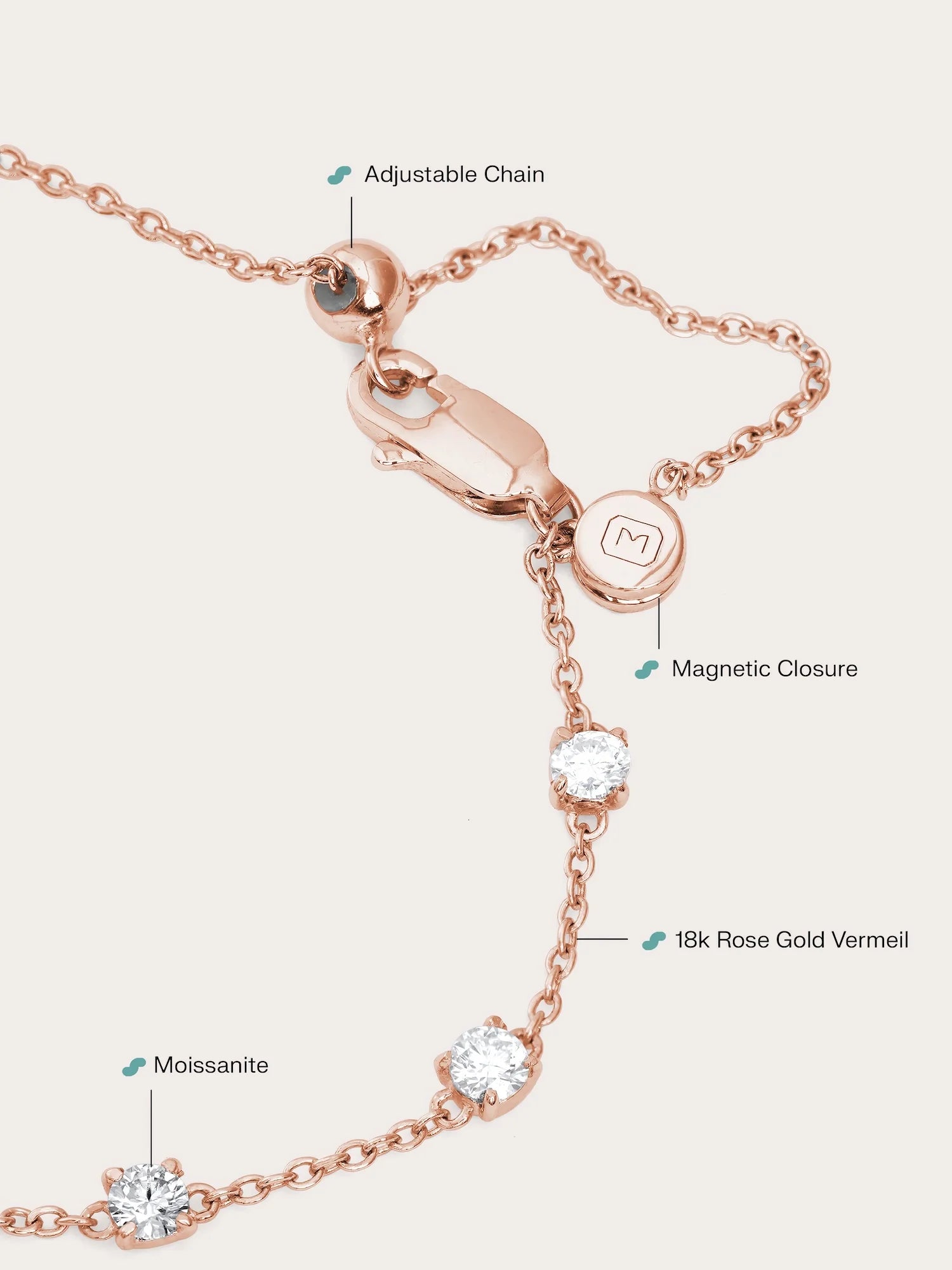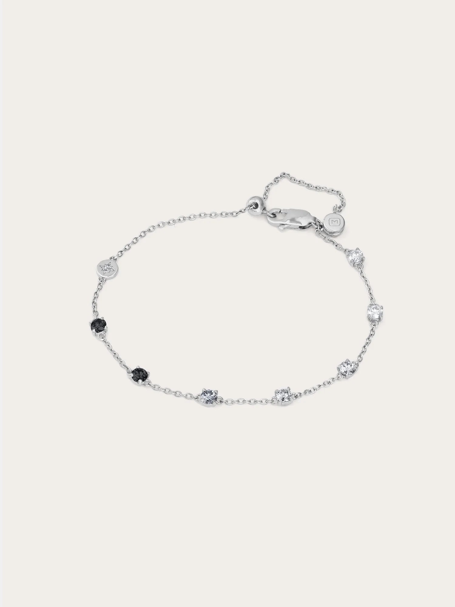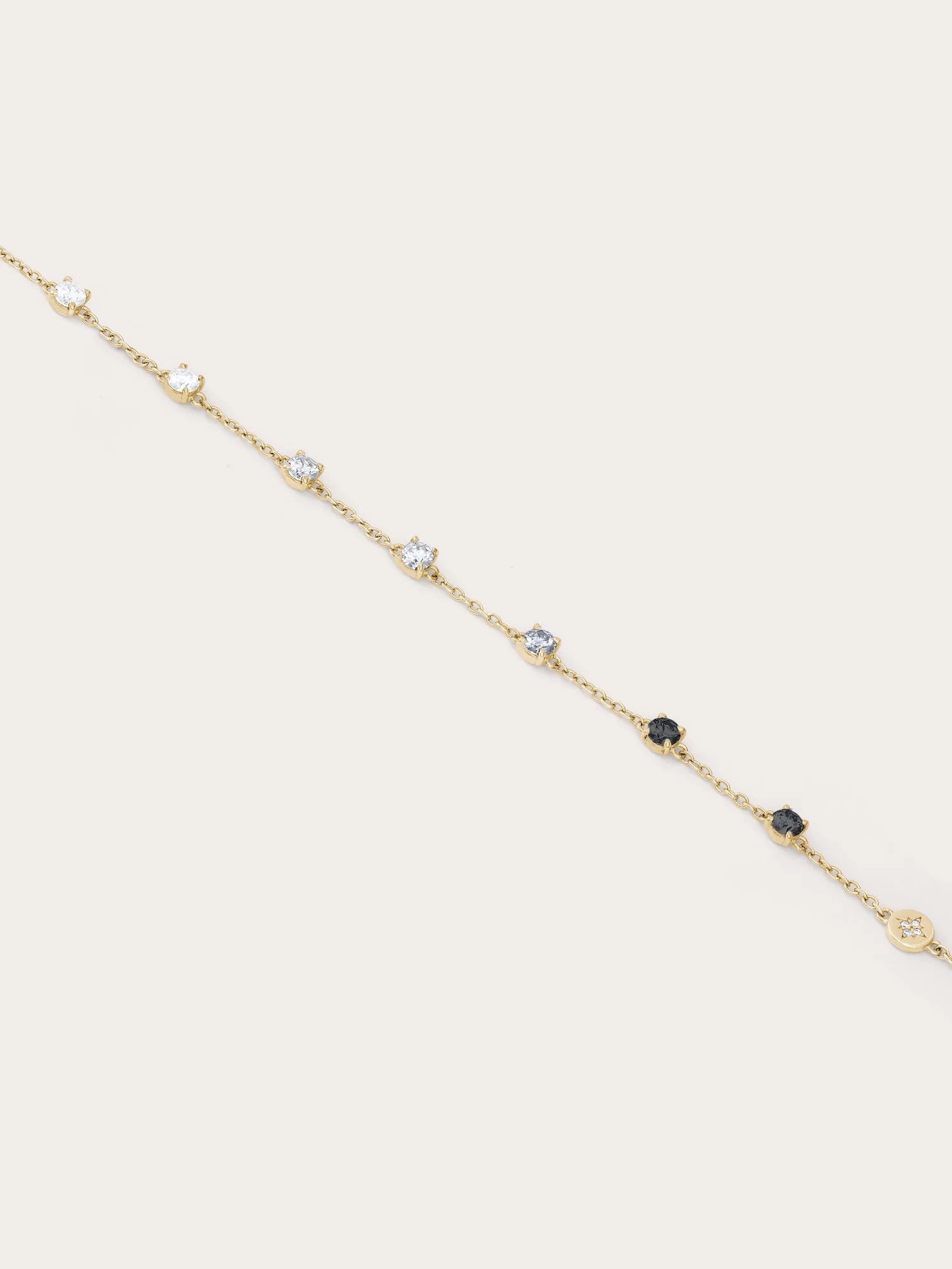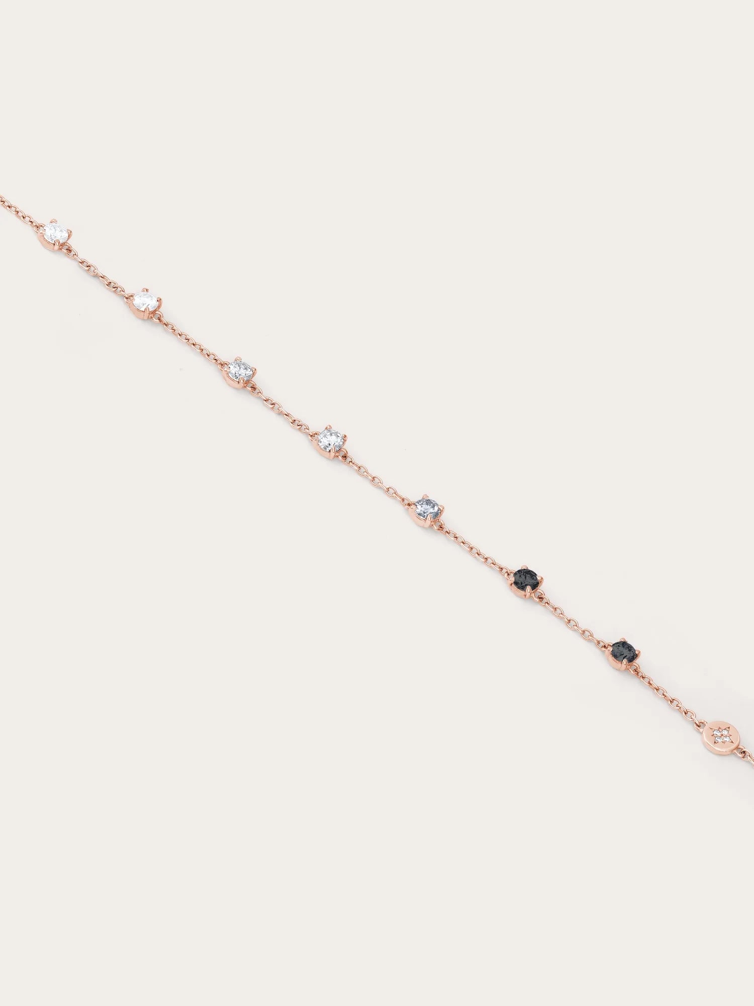 The Midnight Glow Moissanite Station Bracelet features a gradient of 7 hand-set moissanite stones transitioning from brilliant white to deep black. The refined monochrome palette and delicate design make it a versatile piece, embodying timeless style with a contemporary edge. Handcrafted in 18k rose gold vermeil.