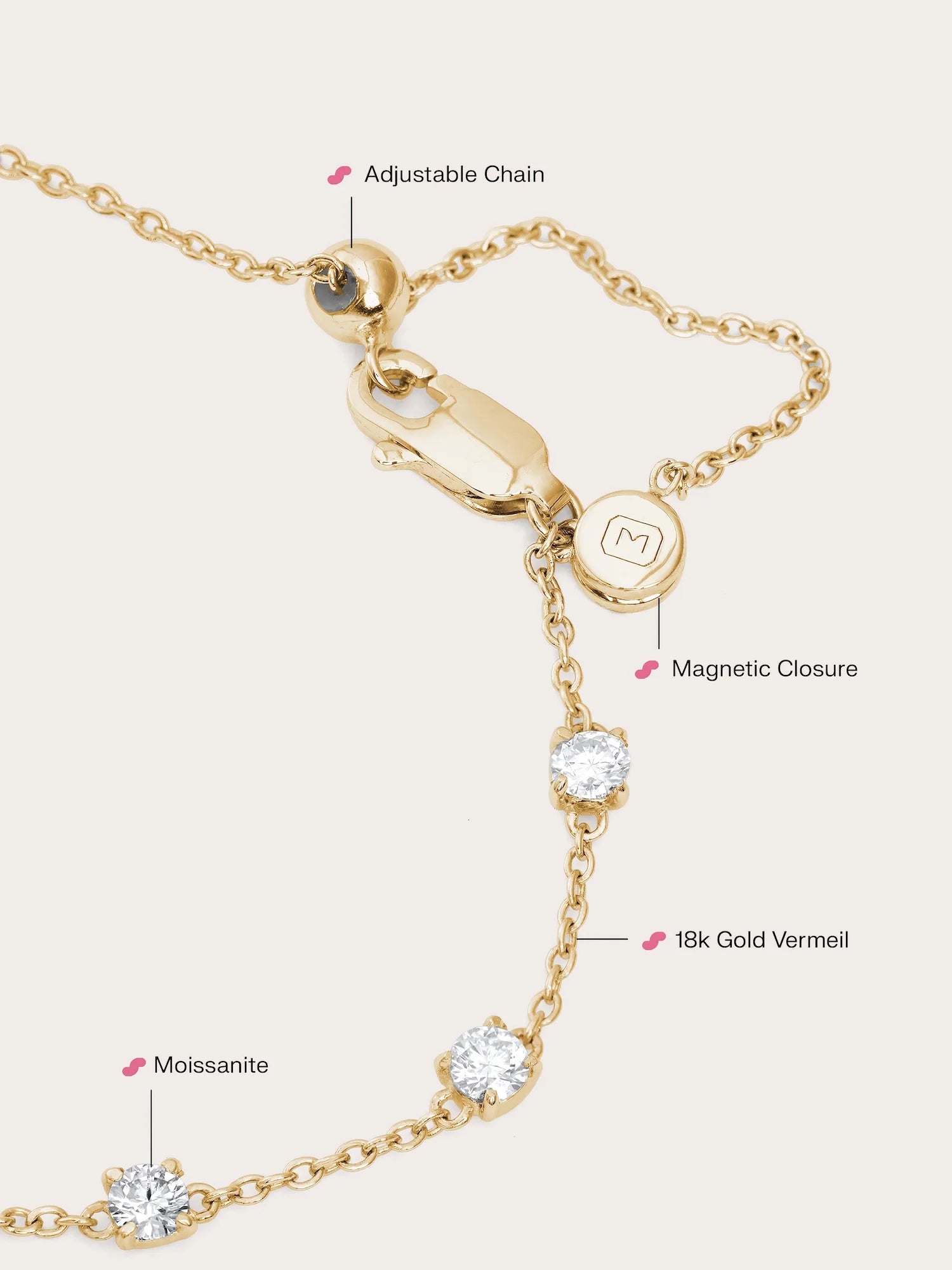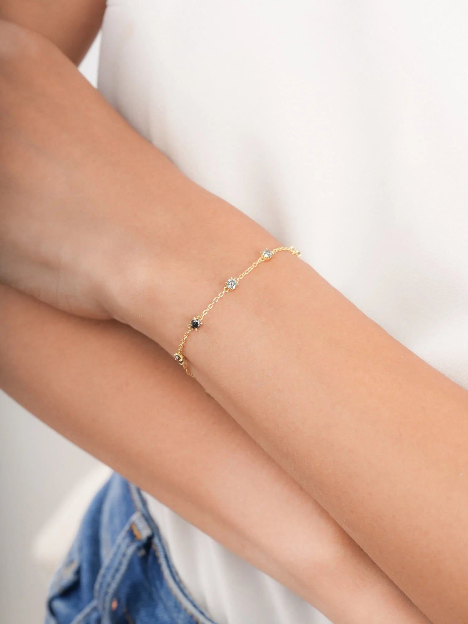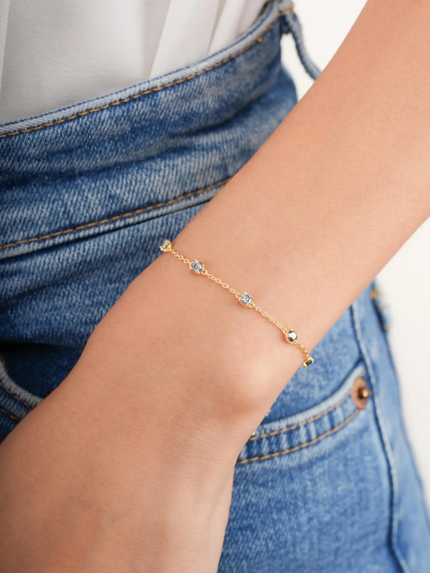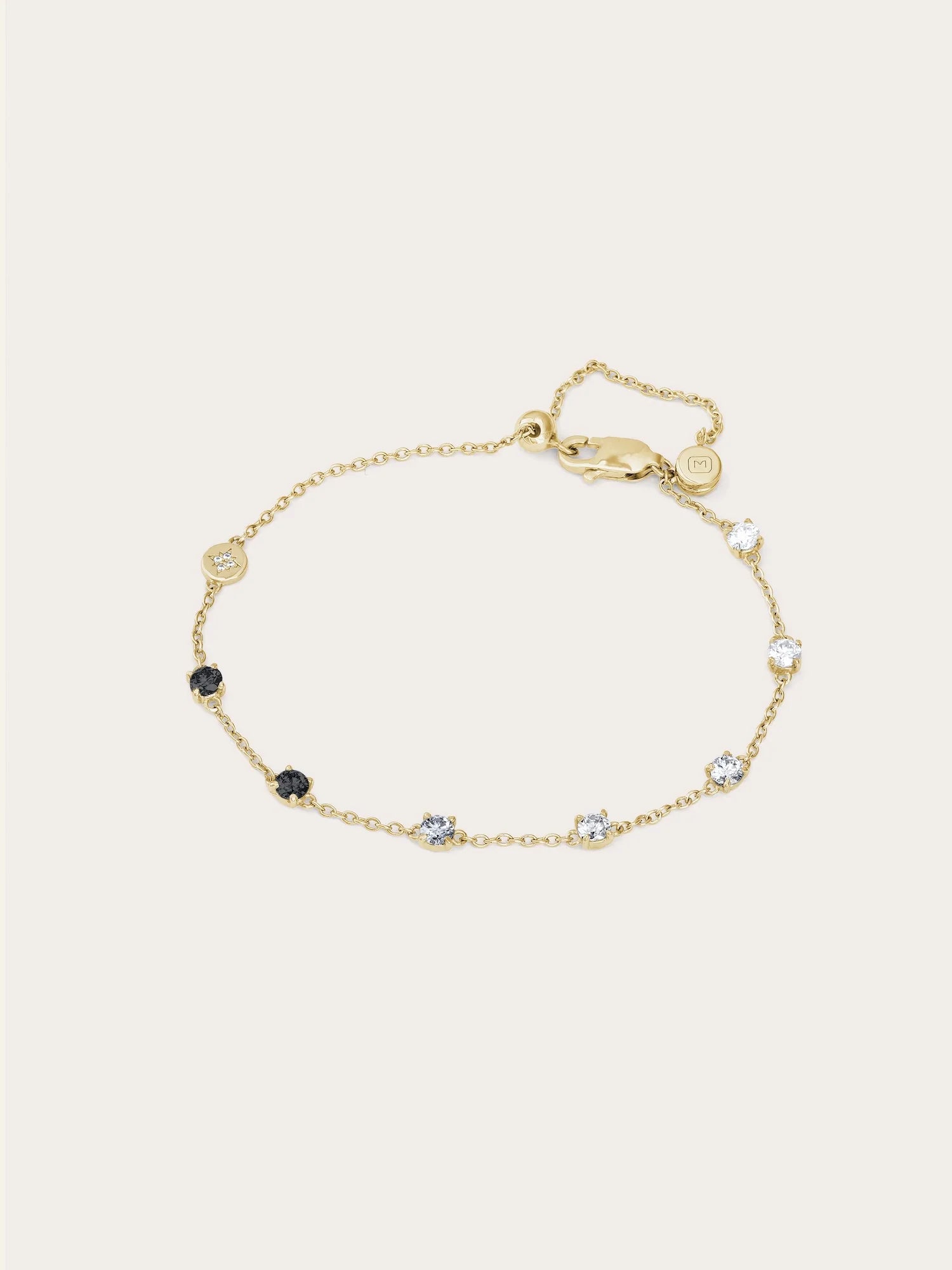 The Midnight Glow Moissanite Station Bracelet features a gradient of 7 hand-set moissanite stones transitioning from brilliant white to deep black. The refined monochrome palette and delicate design make it a versatile piece, embodying timeless style with a contemporary edge. Handcrafted in 18k rose gold vermeil.