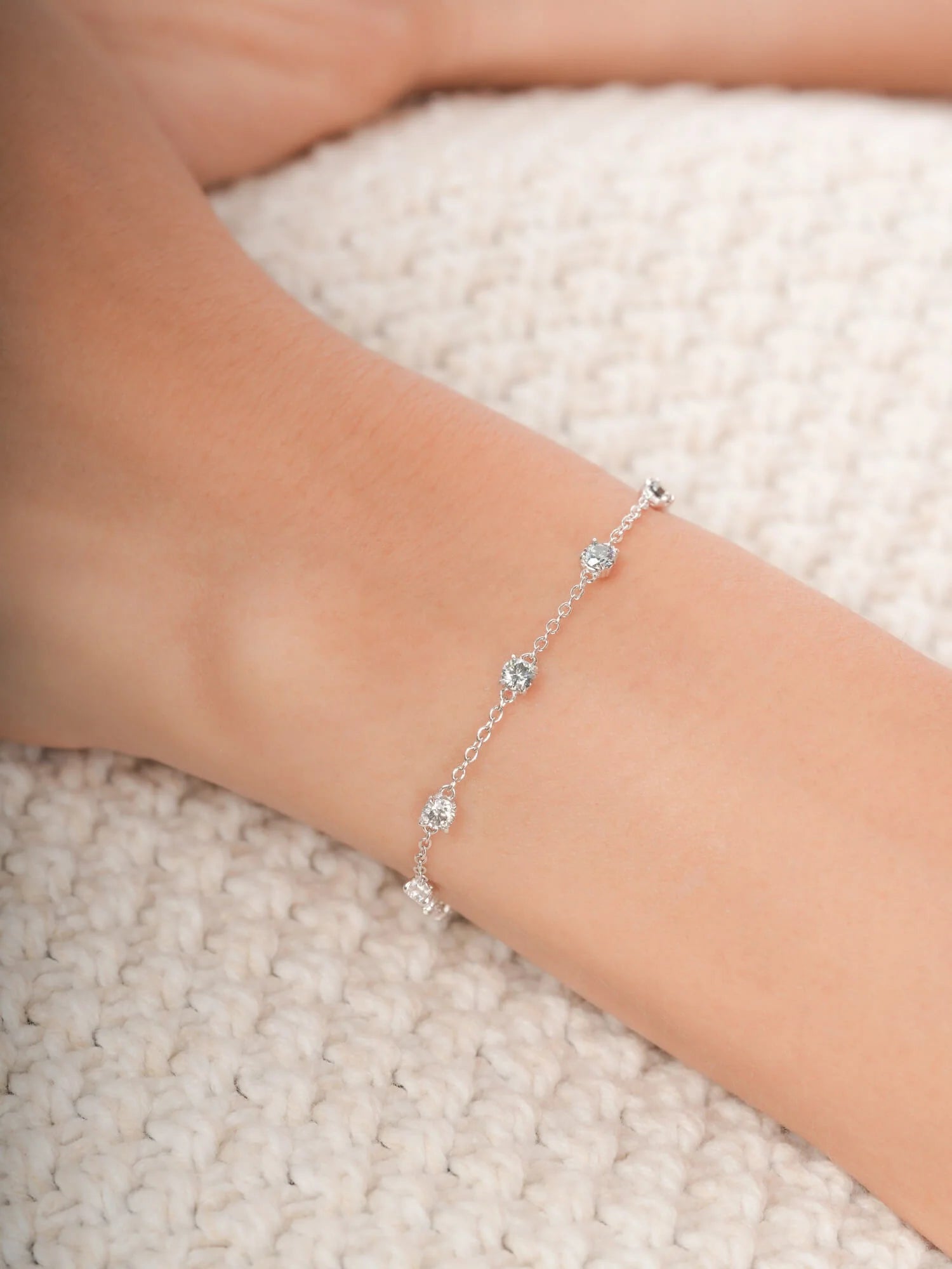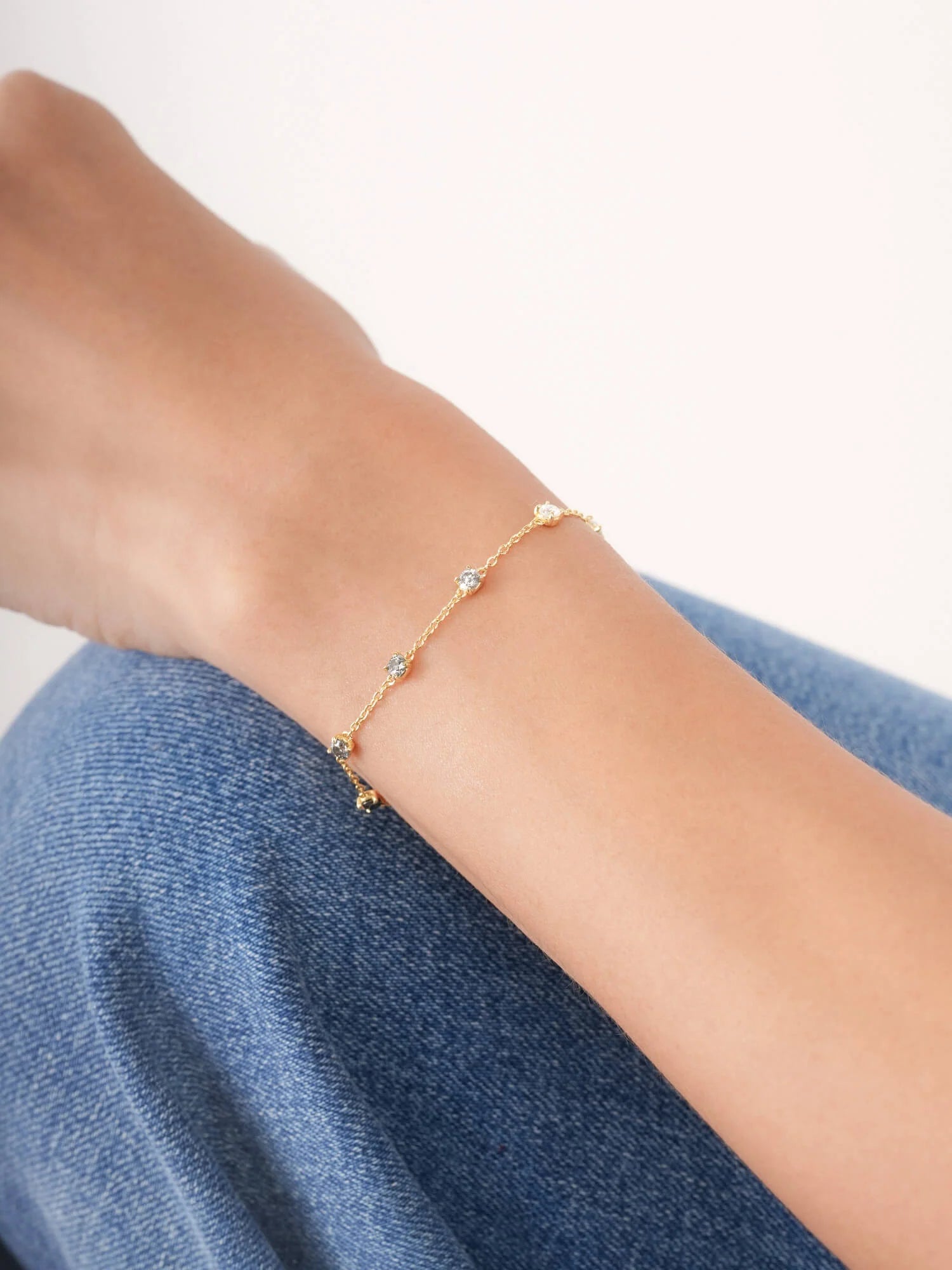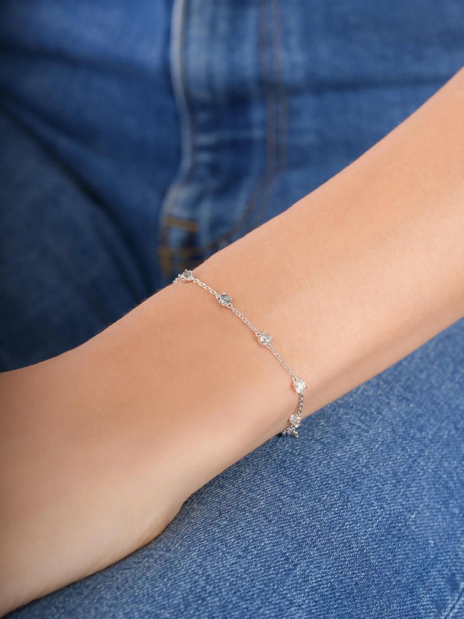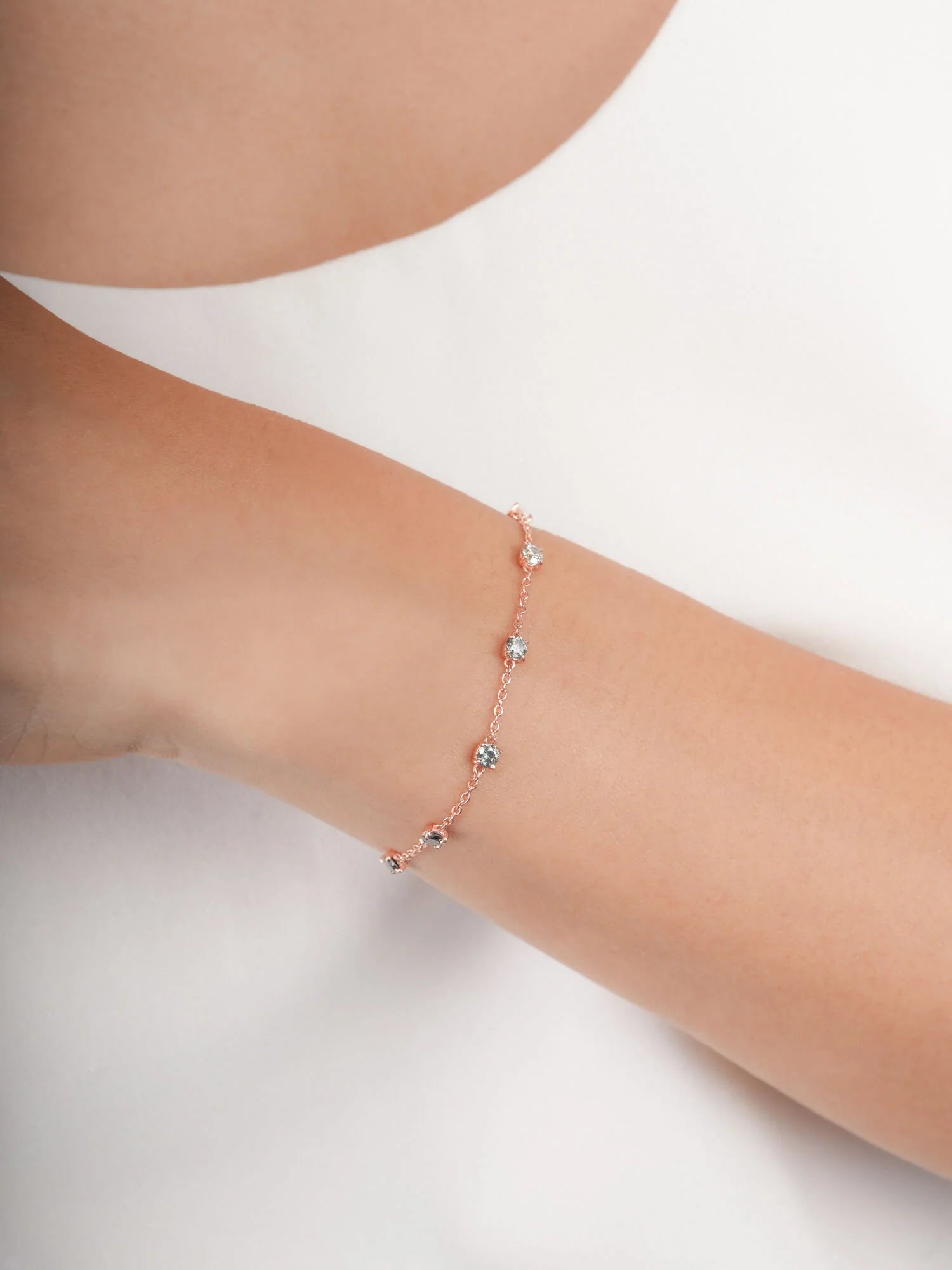The Midnight Glow Moissanite Station Bracelet features a gradient of 7 hand-set moissanite stones transitioning from brilliant white to deep black. The refined monochrome palette and delicate design make it a versatile piece, embodying timeless style with a contemporary edge. Handcrafted in 18k rose gold vermeil.