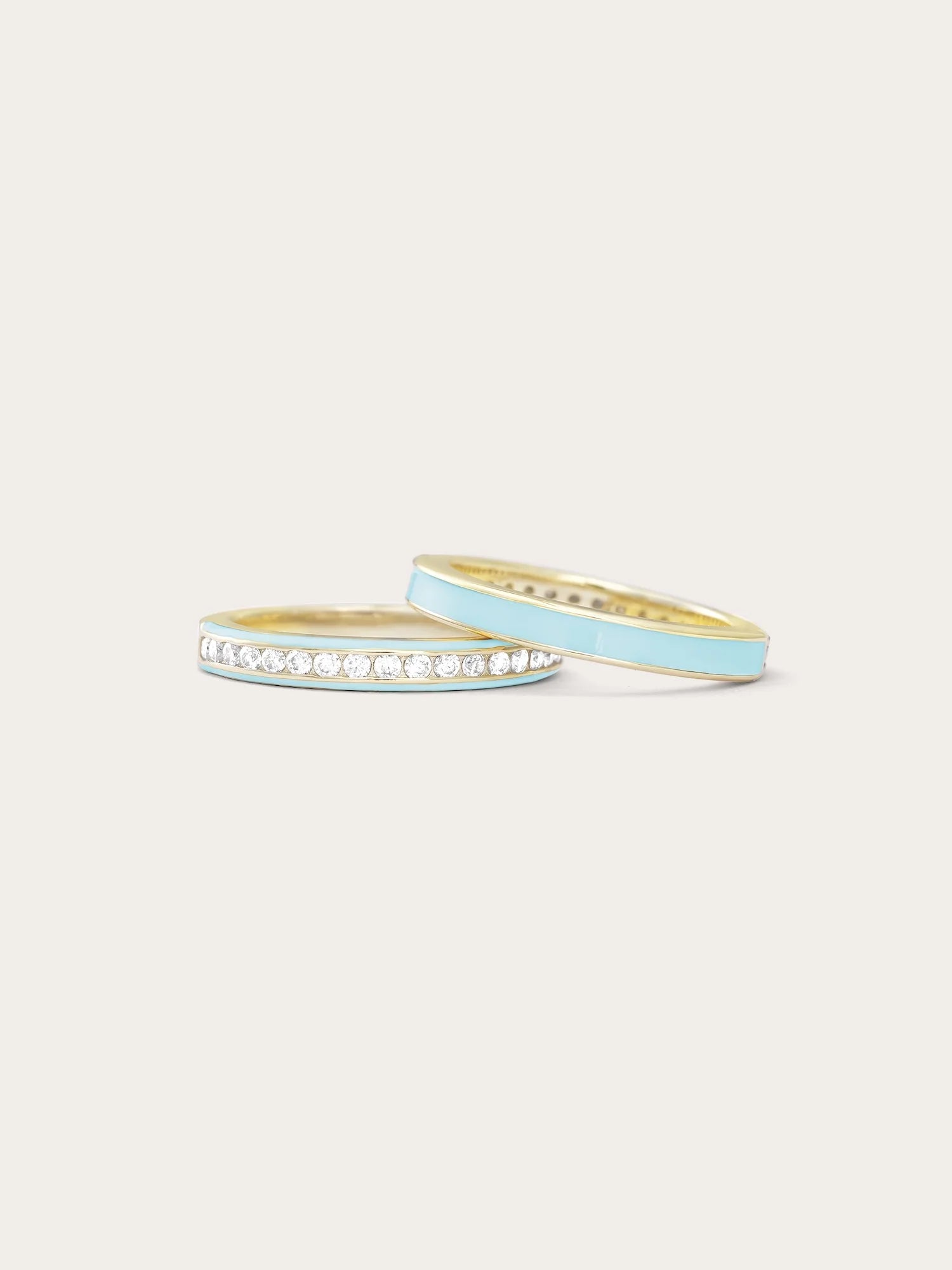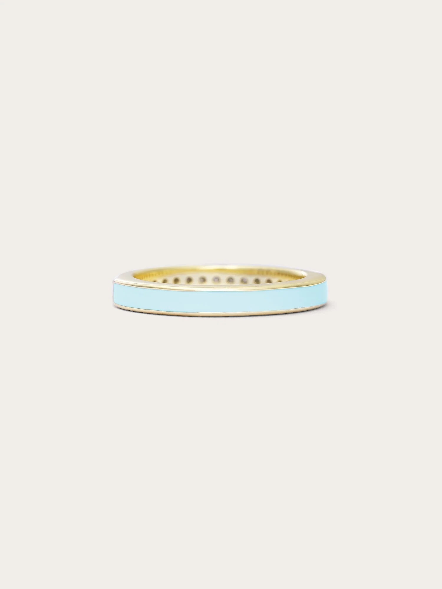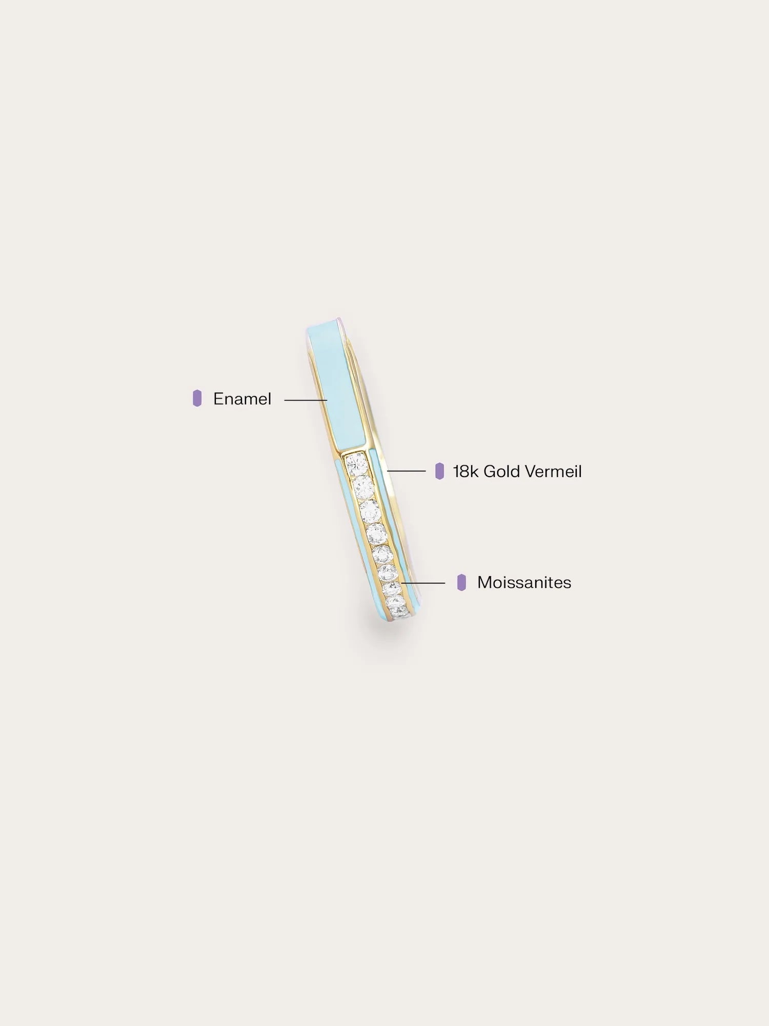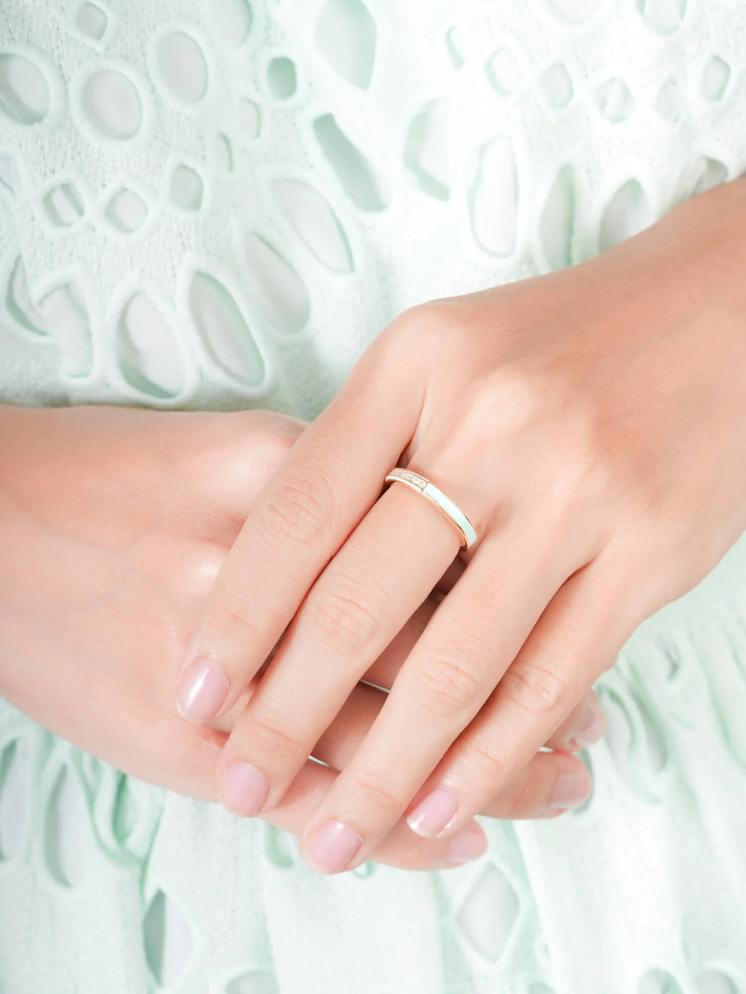 This reversible mint green enamel ring provides two styles in one piece. One side has a smooth pastel mint green enamel surface, and the other side shines with a row of pavé moissanites. It's hand - crafted using 18k gold vermeil.