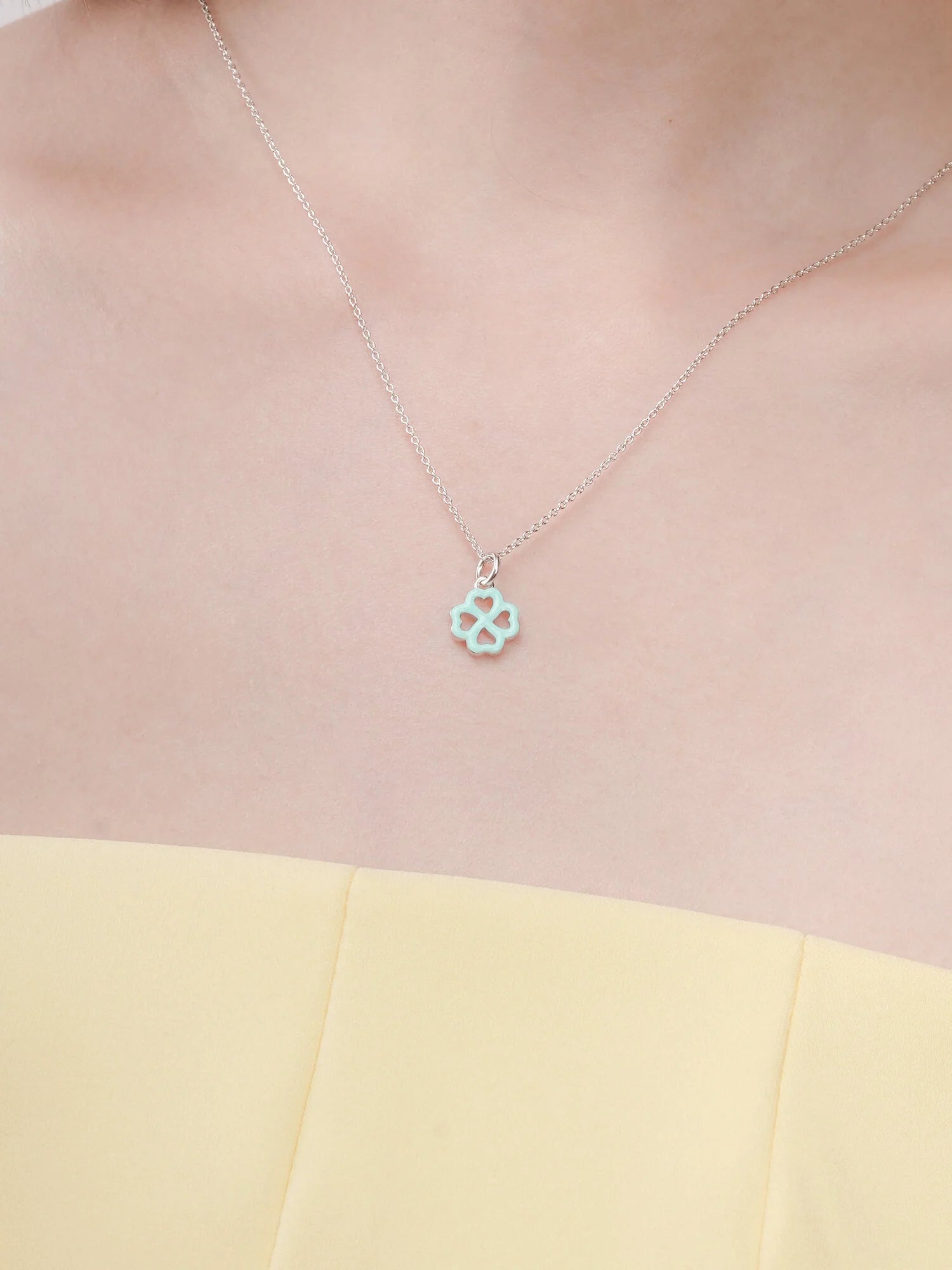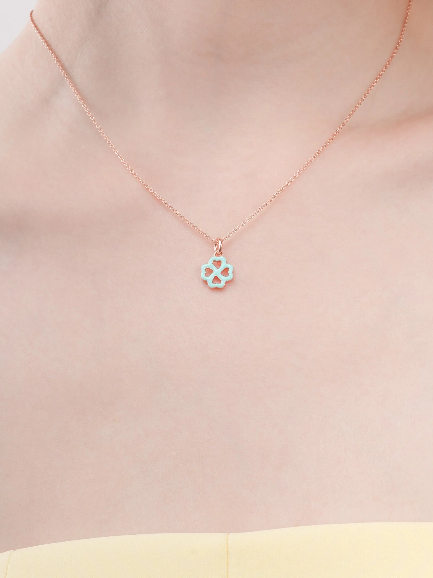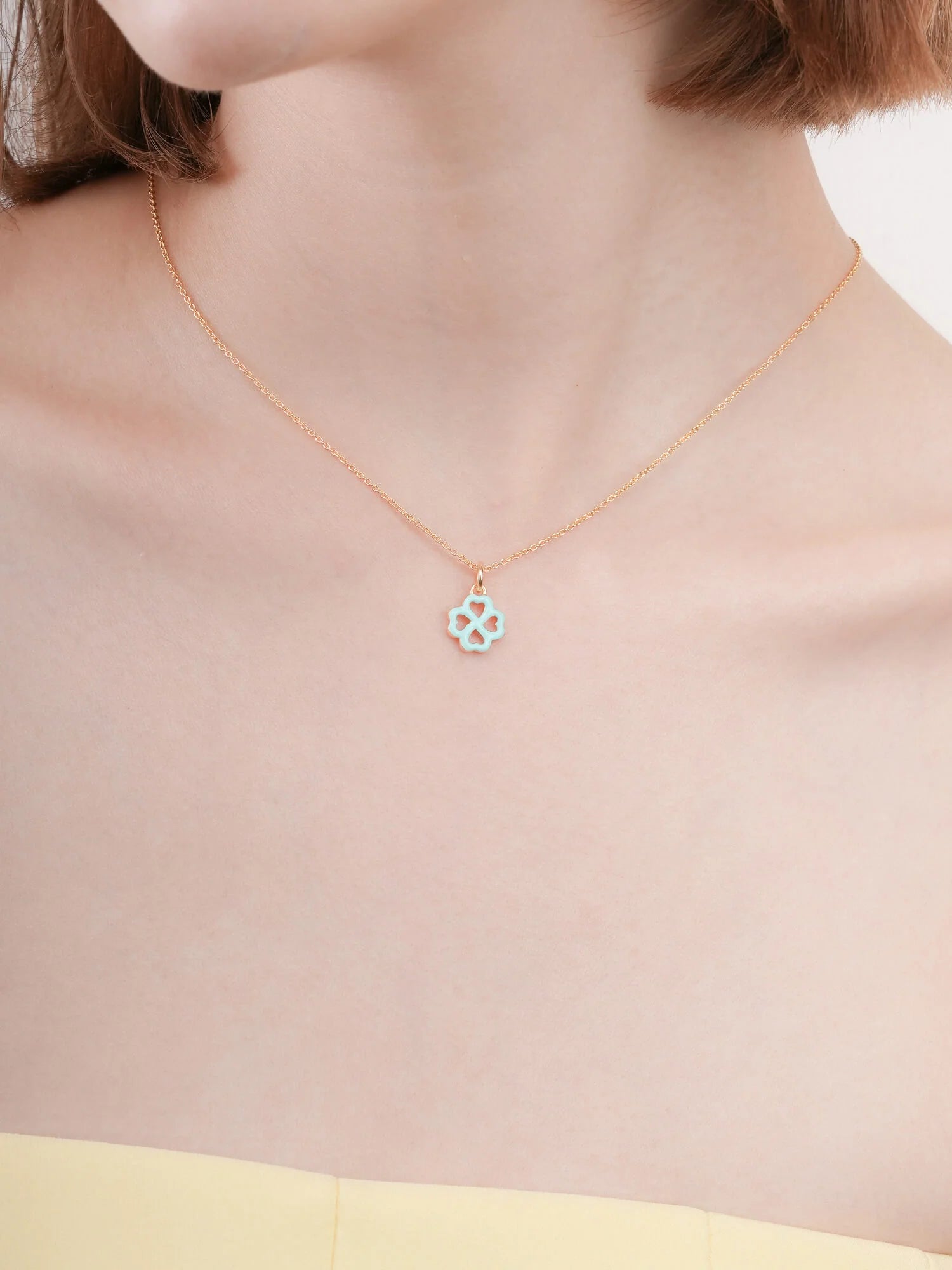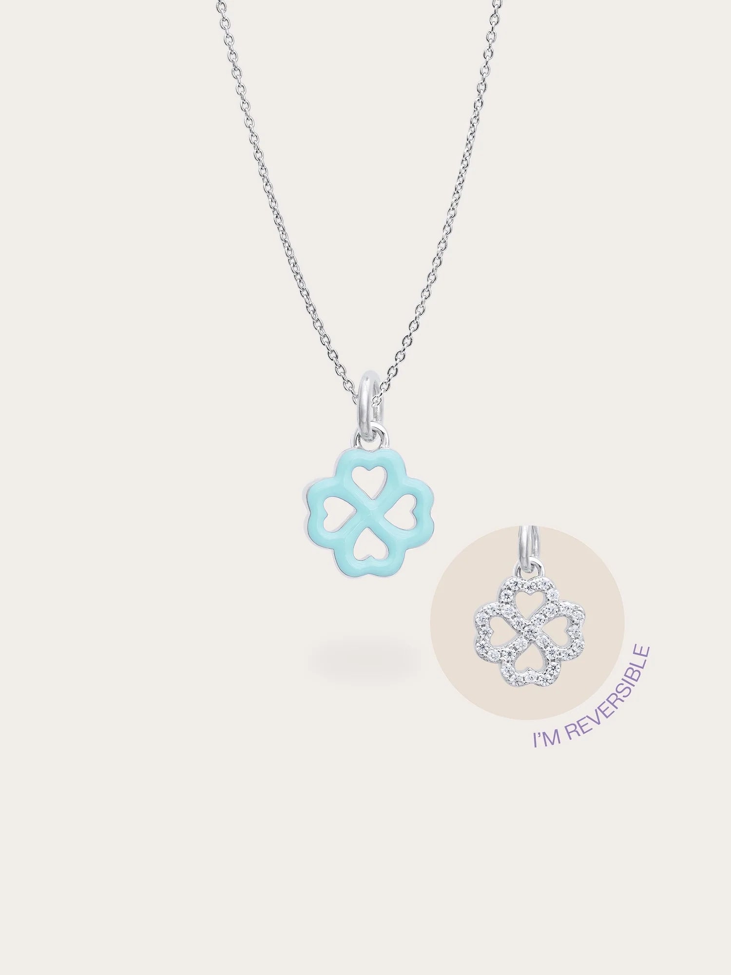 This is a clover-shaped reversible necklace with mint green enamel. It offers two different looks in one pendant. You can wear the pastel mint green enamel side for a casual daily look, or flip it to the side with shimmering pavé moissanites for a classic and elegant style. It is handcrafted using a certain plating technique.