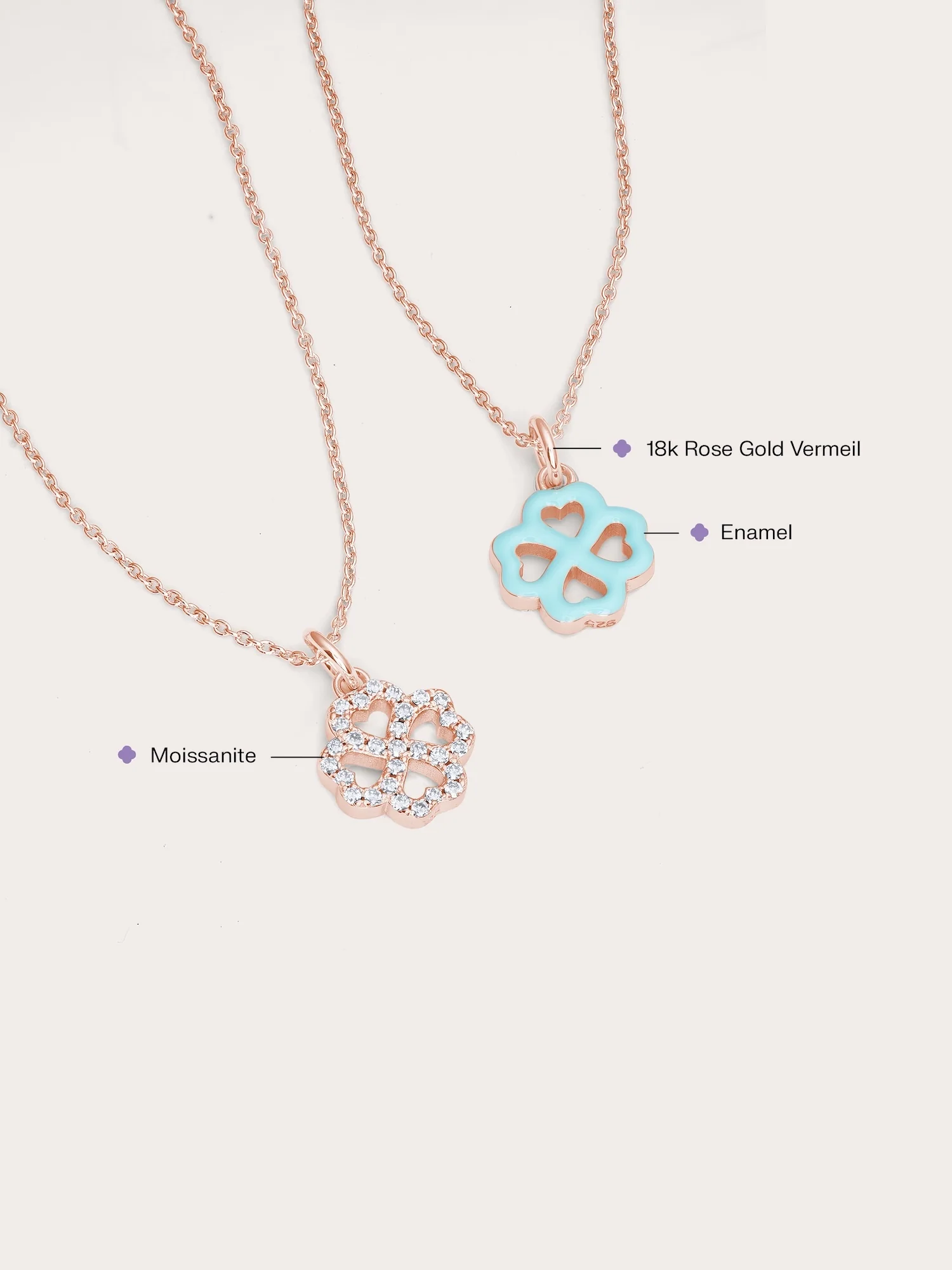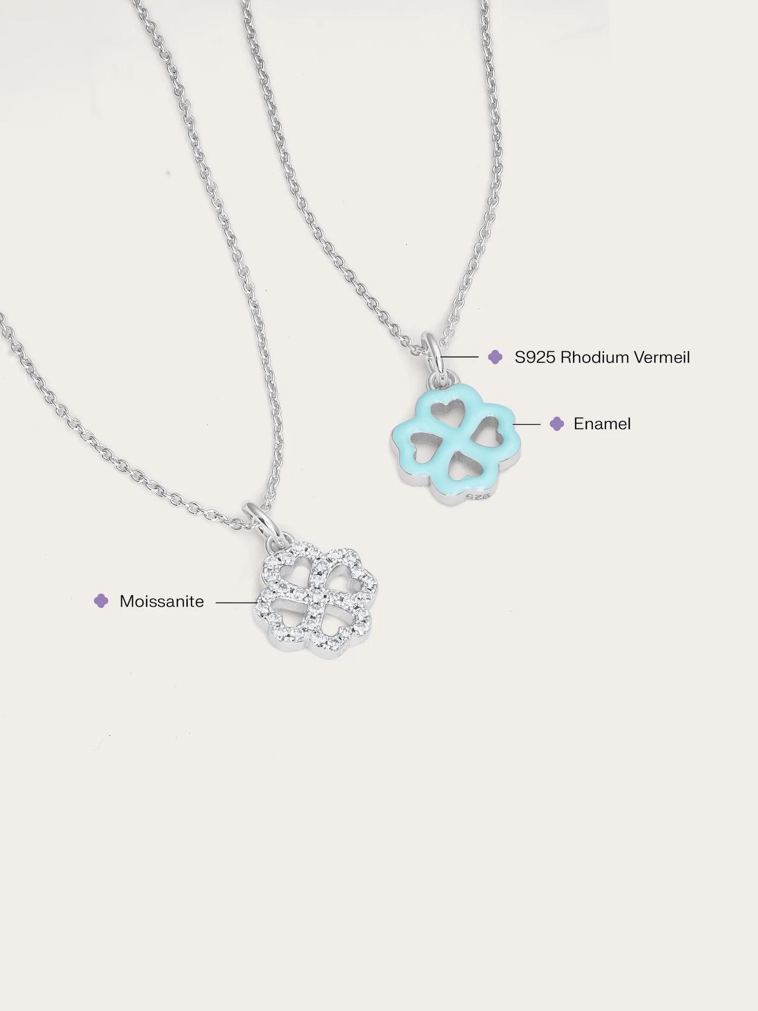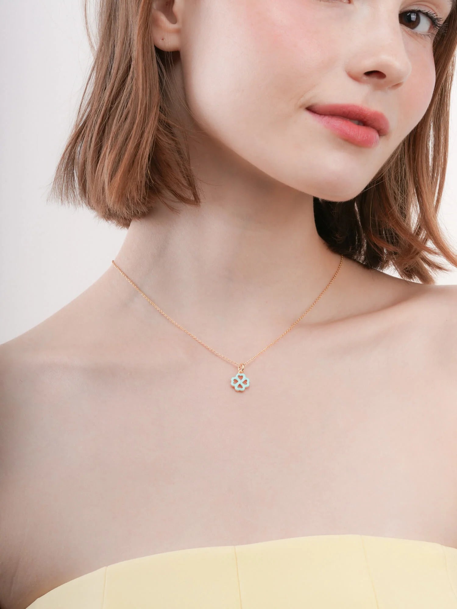This is a clover-shaped reversible necklace with mint green enamel. It offers two different looks in one pendant. You can wear the pastel mint green enamel side for a casual daily look, or flip it to the side with shimmering pavé moissanites for a classic and elegant style. It is handcrafted using a certain plating technique.