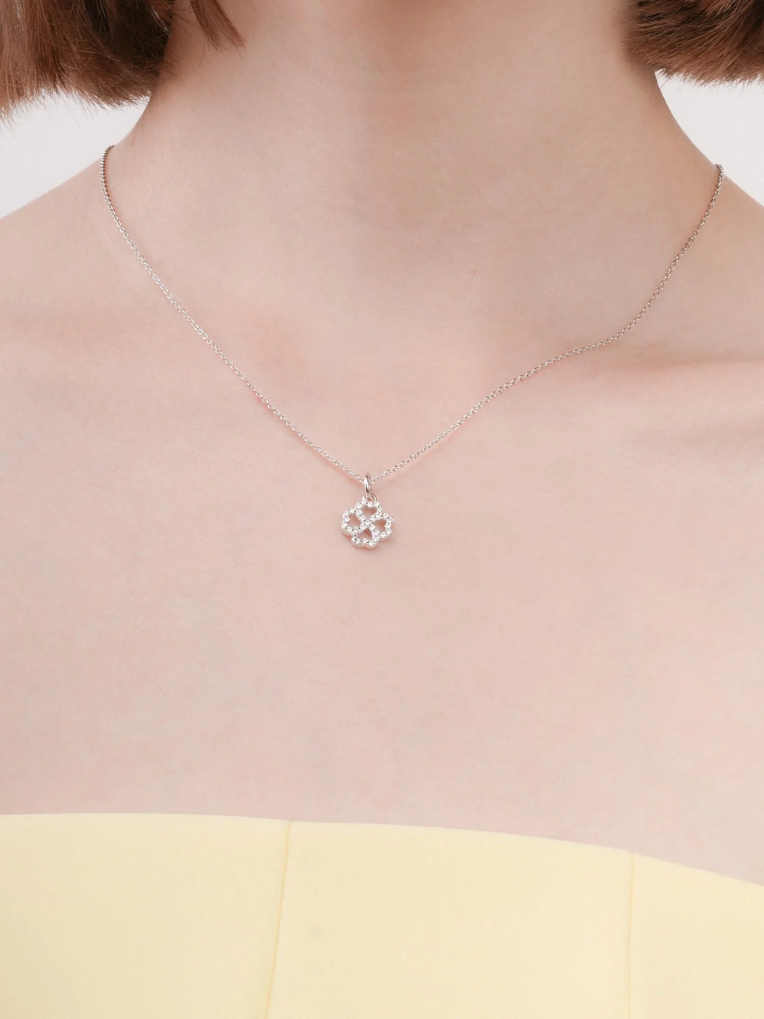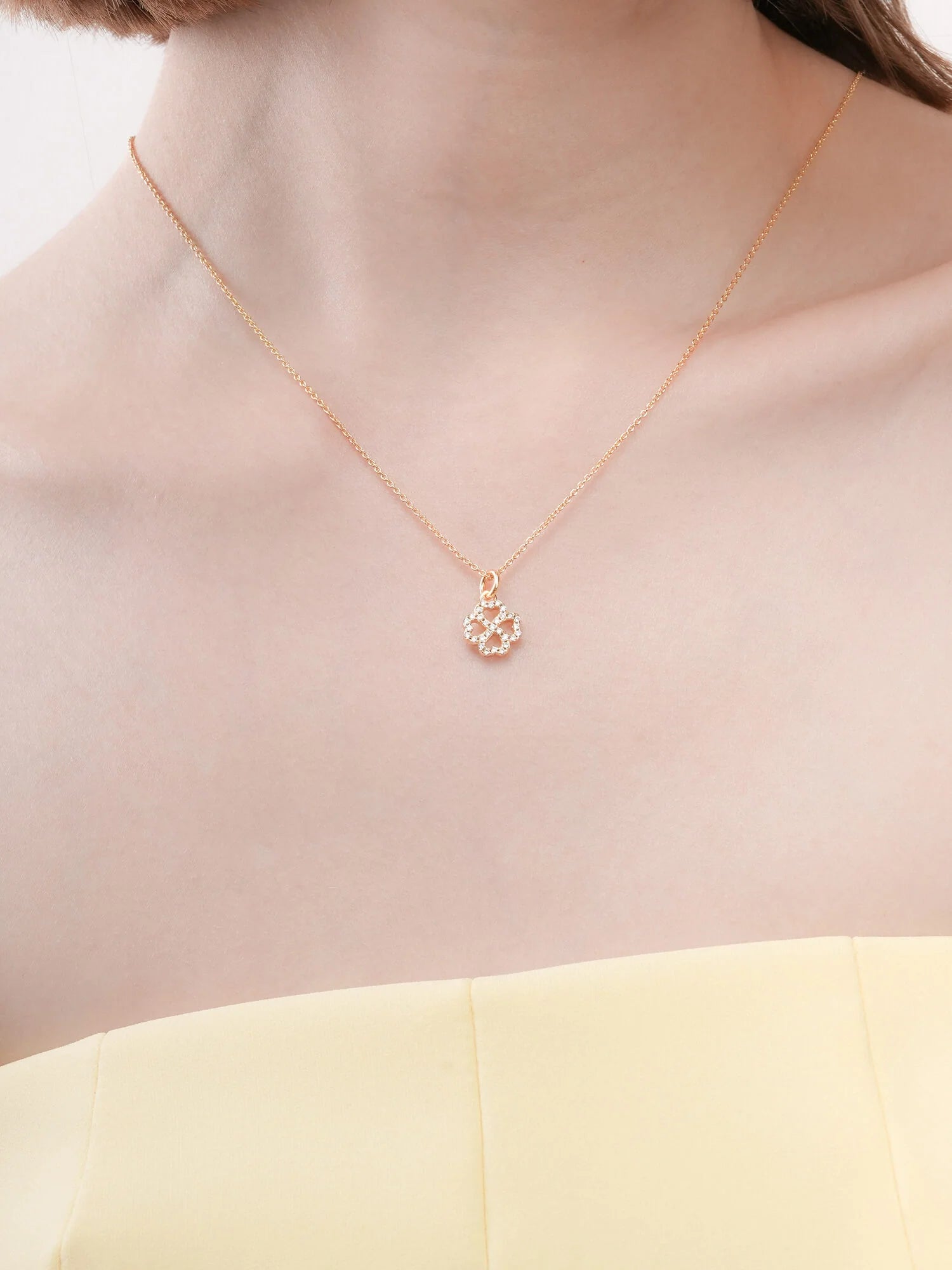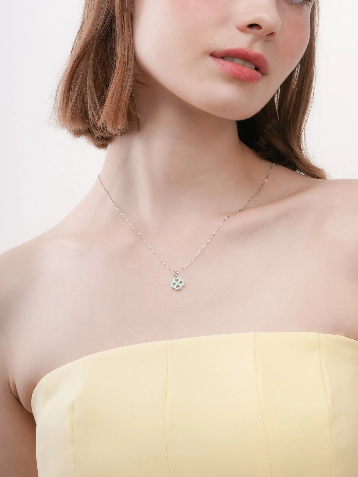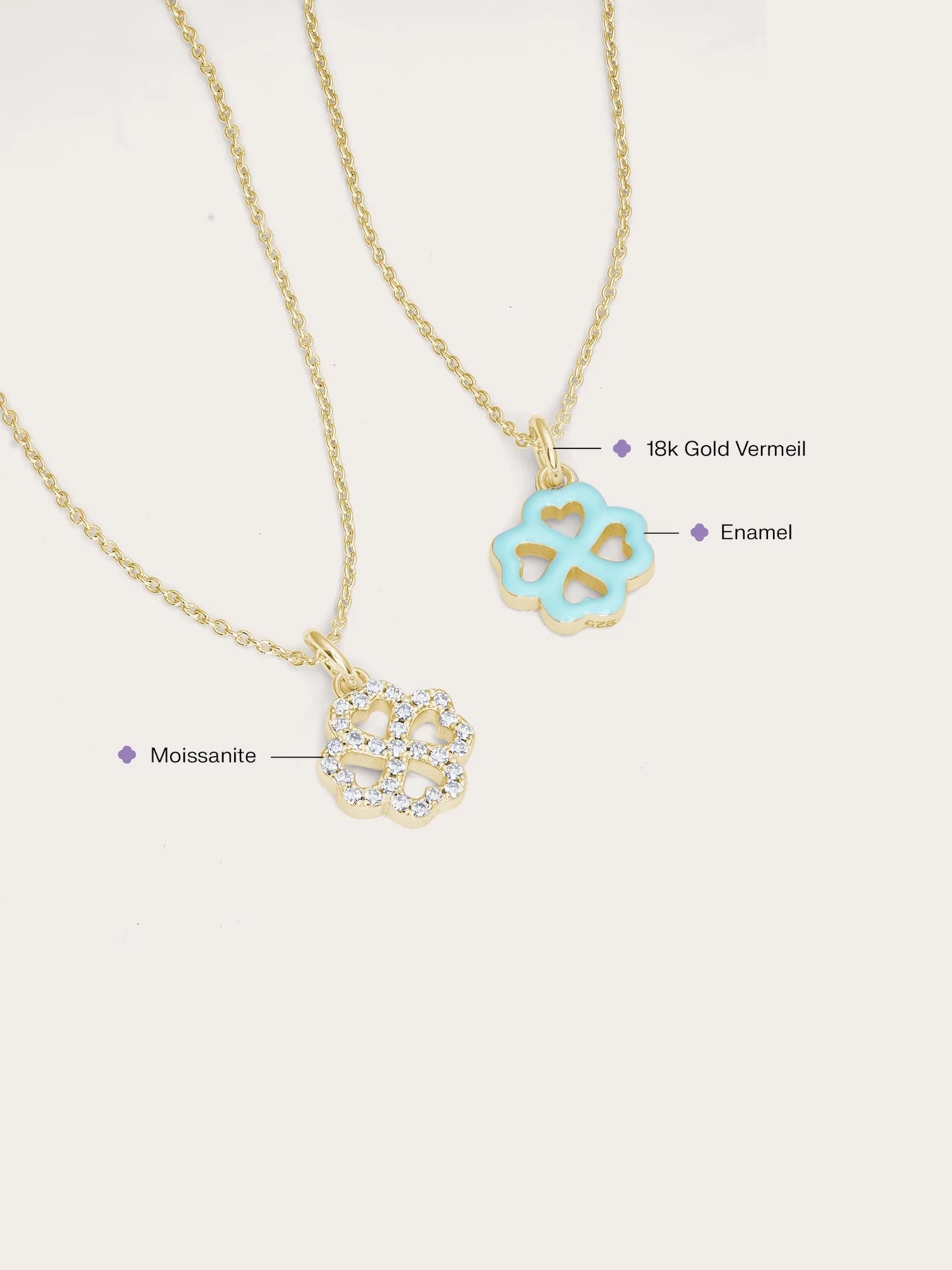 This is a clover-shaped reversible necklace with mint green enamel. It offers two different looks in one pendant. You can wear the pastel mint green enamel side for a casual daily look, or flip it to the side with shimmering pavé moissanites for a classic and elegant style. It is handcrafted using a certain plating technique.
