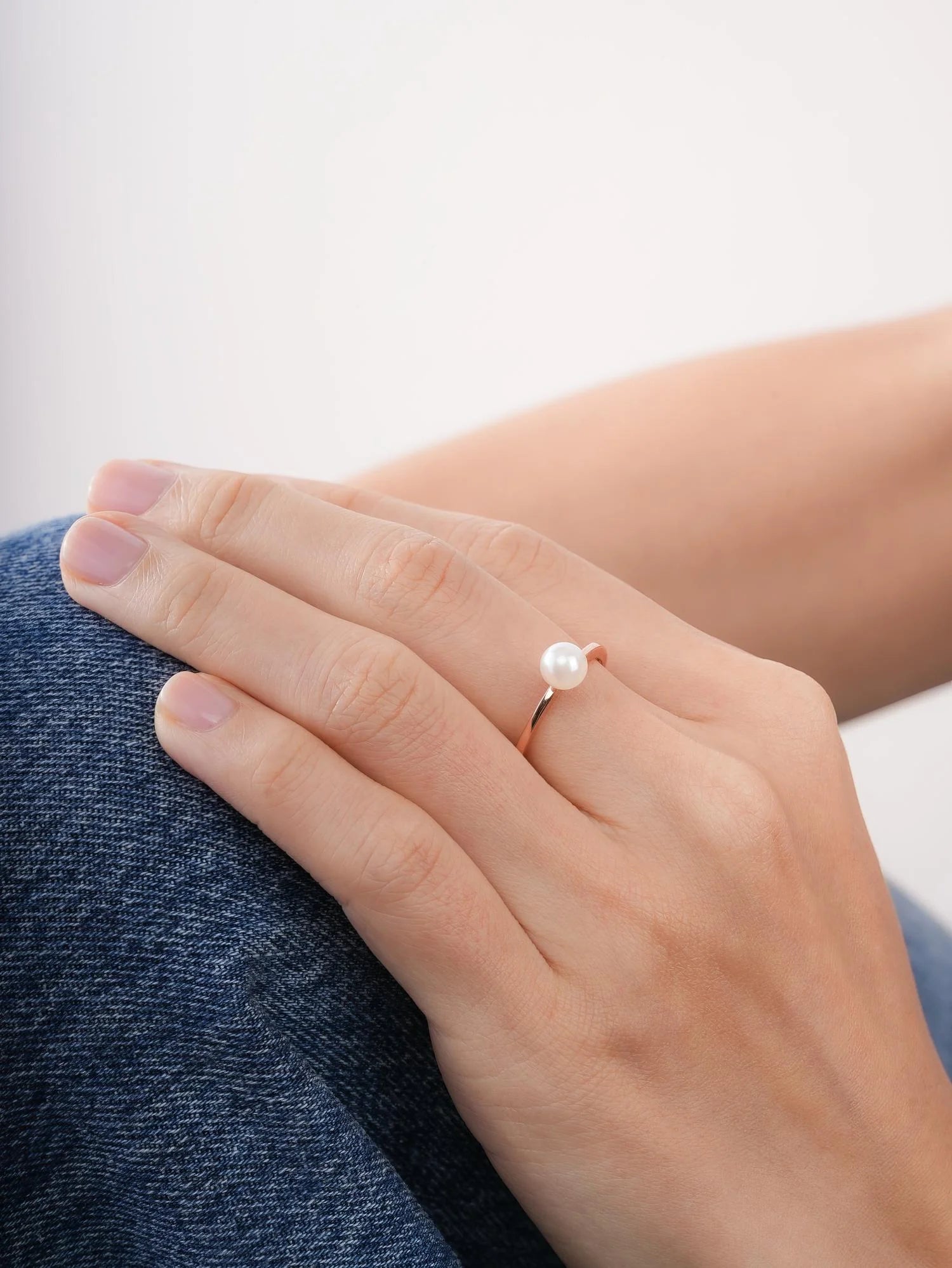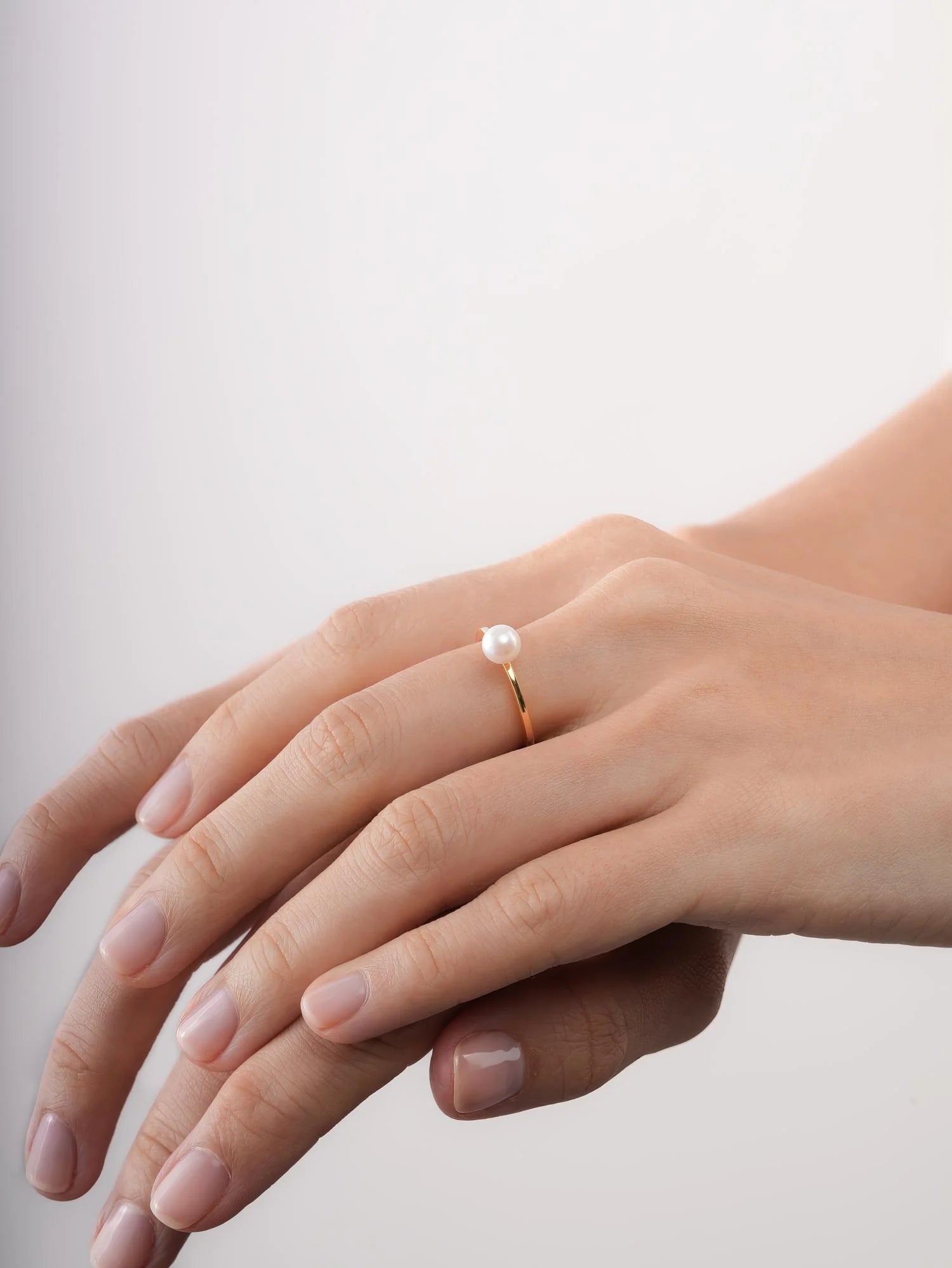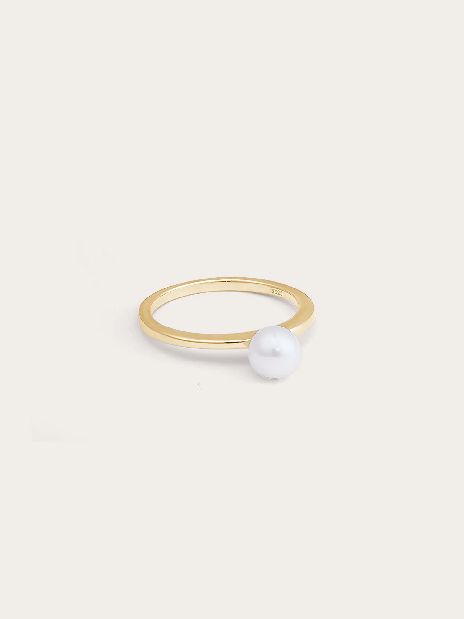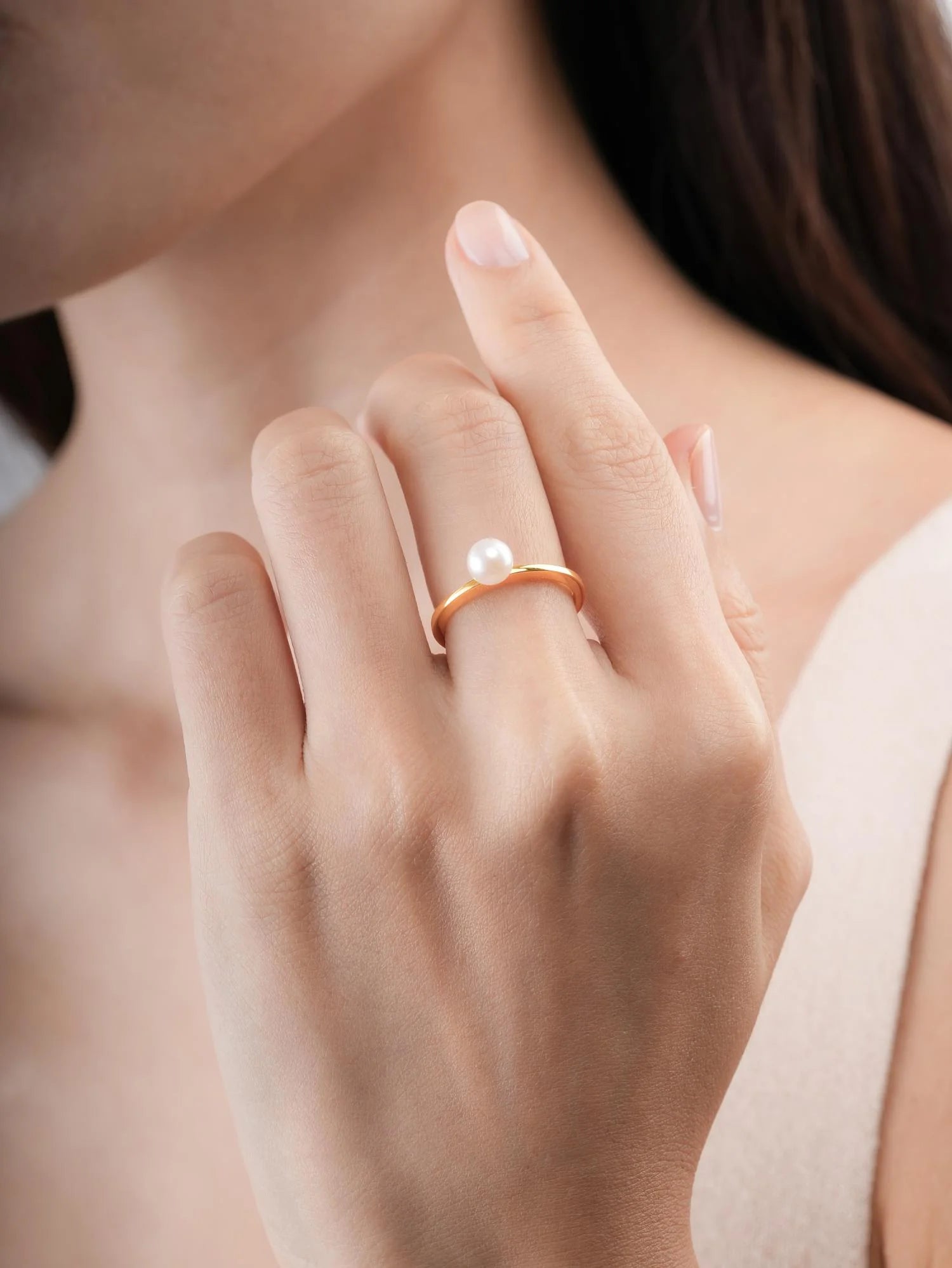 This classic ring features a single pearl on a thin band. The pearls are saltwater cultured, known for their excellent luster and perfect roundness. It's handcrafted with a gold-plated layer on silver.