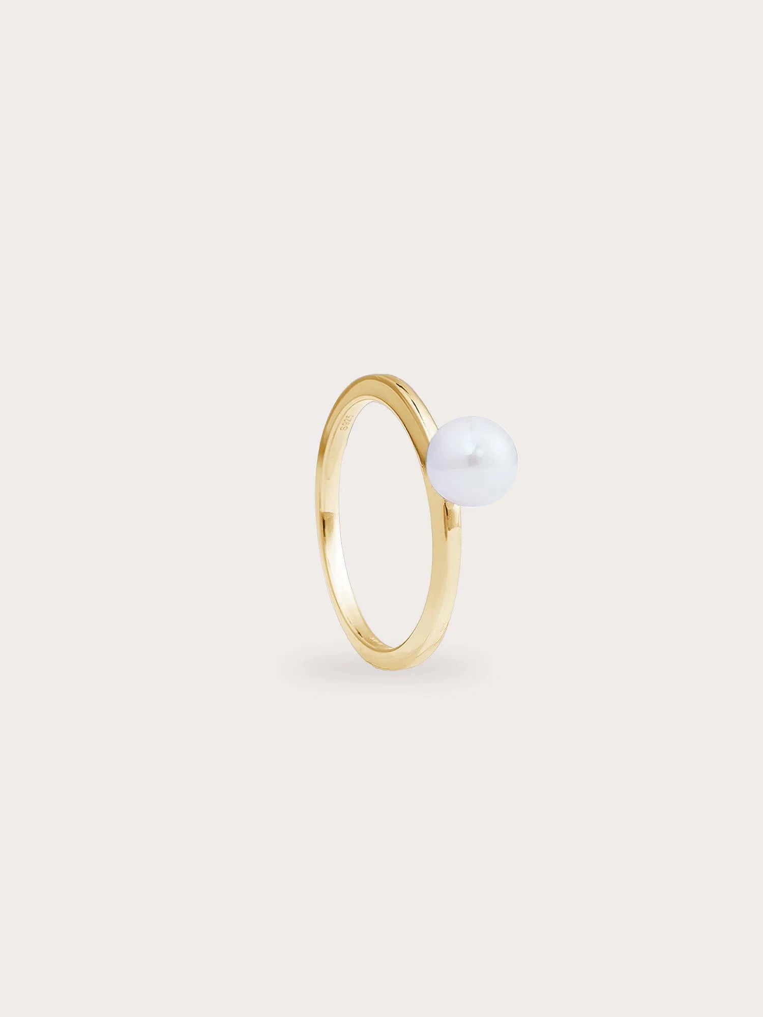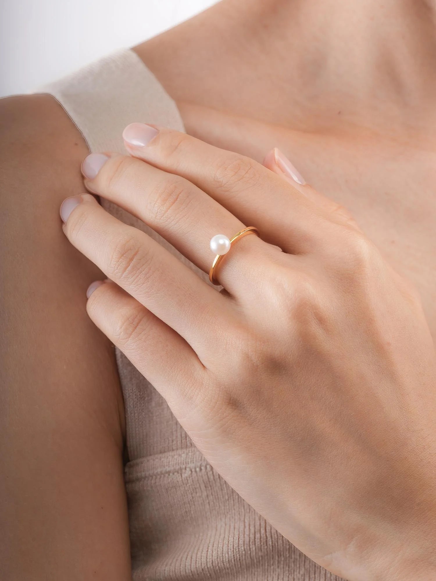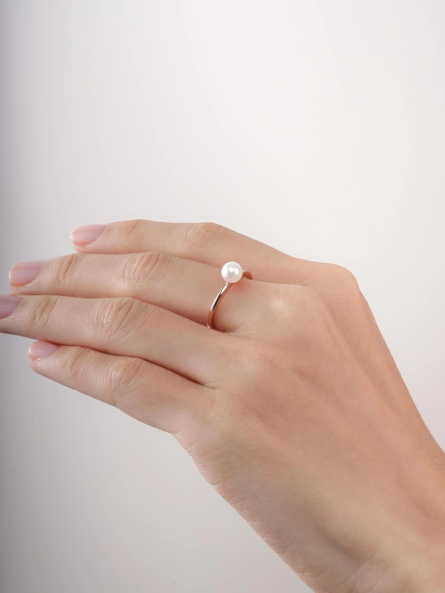 This classic ring features a single pearl on a thin band. The pearls are saltwater cultured, known for their excellent luster and perfect roundness. It's handcrafted with a gold-plated layer on silver.