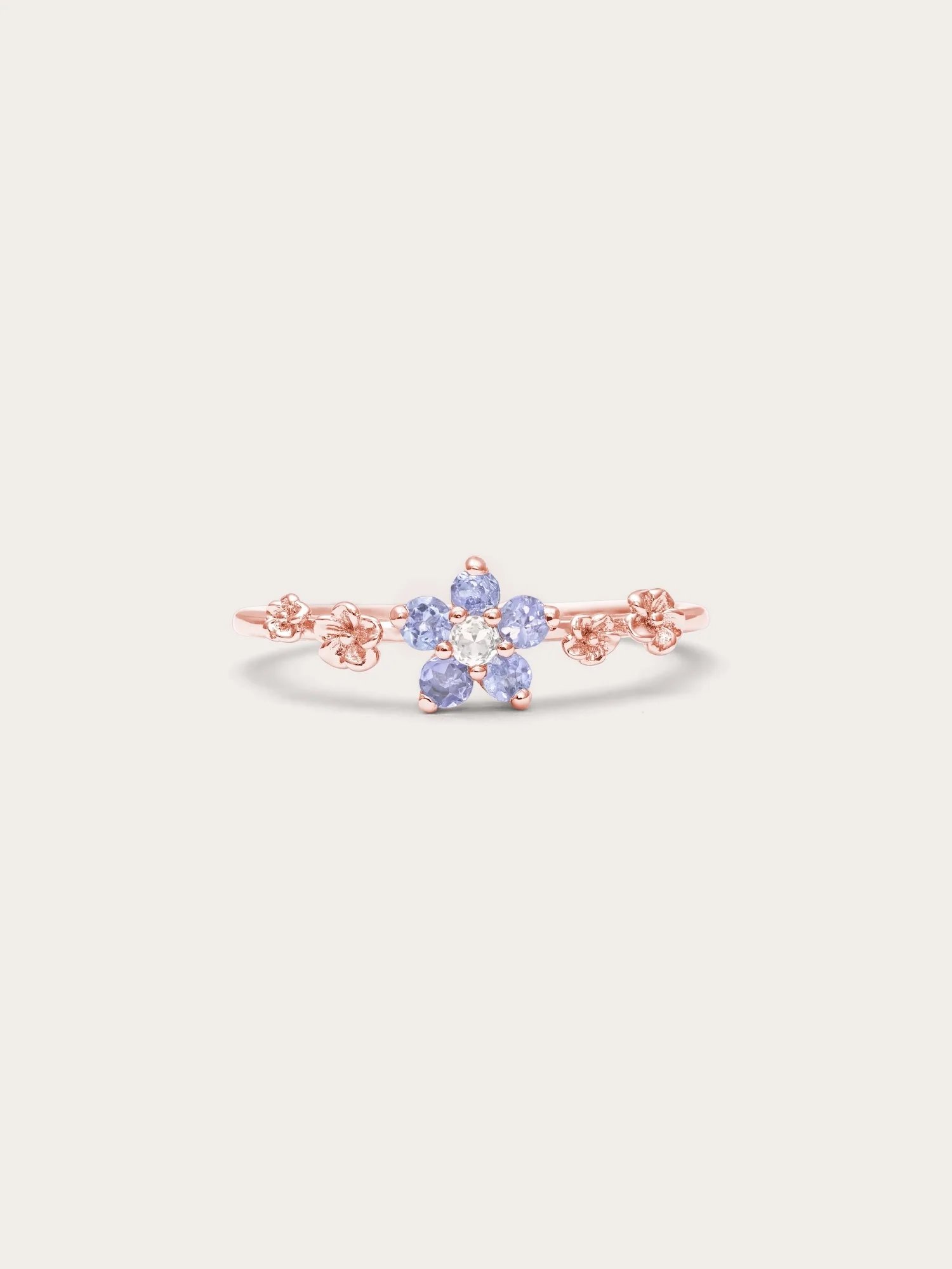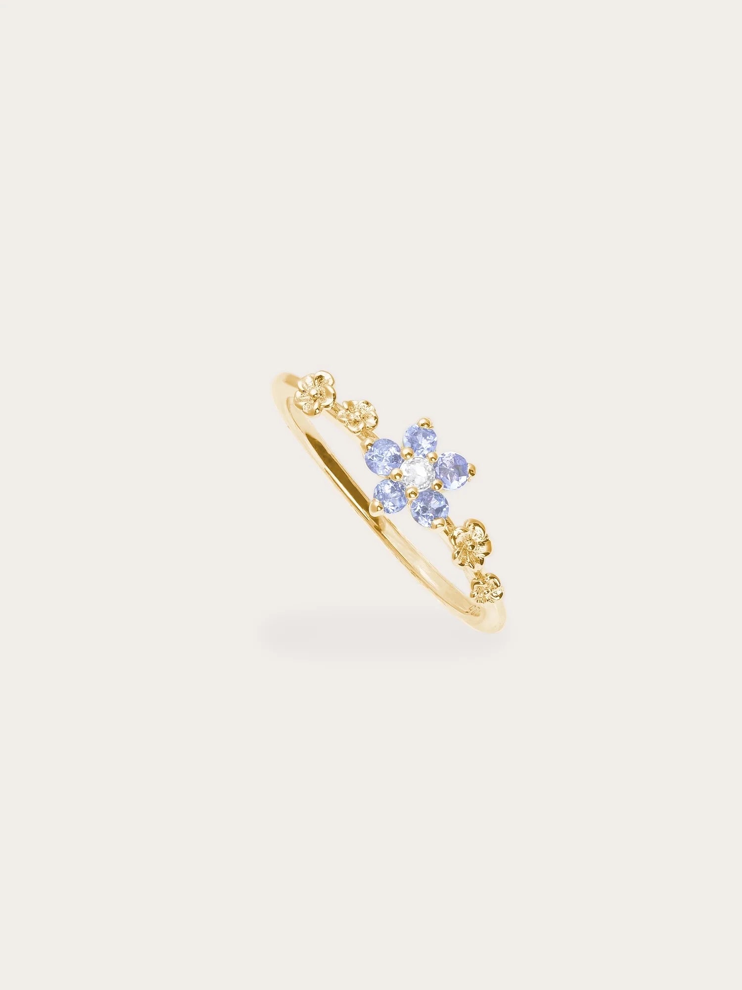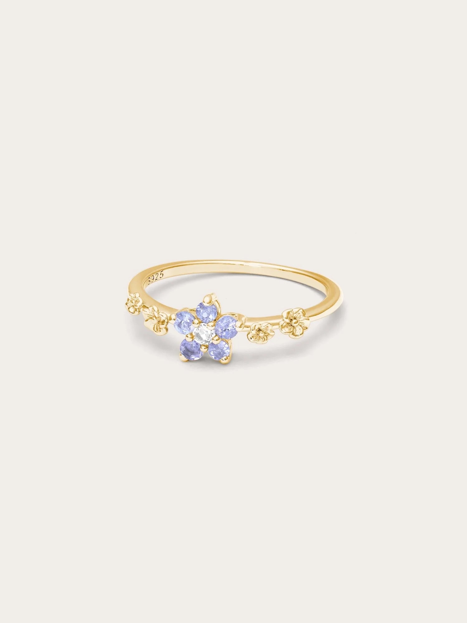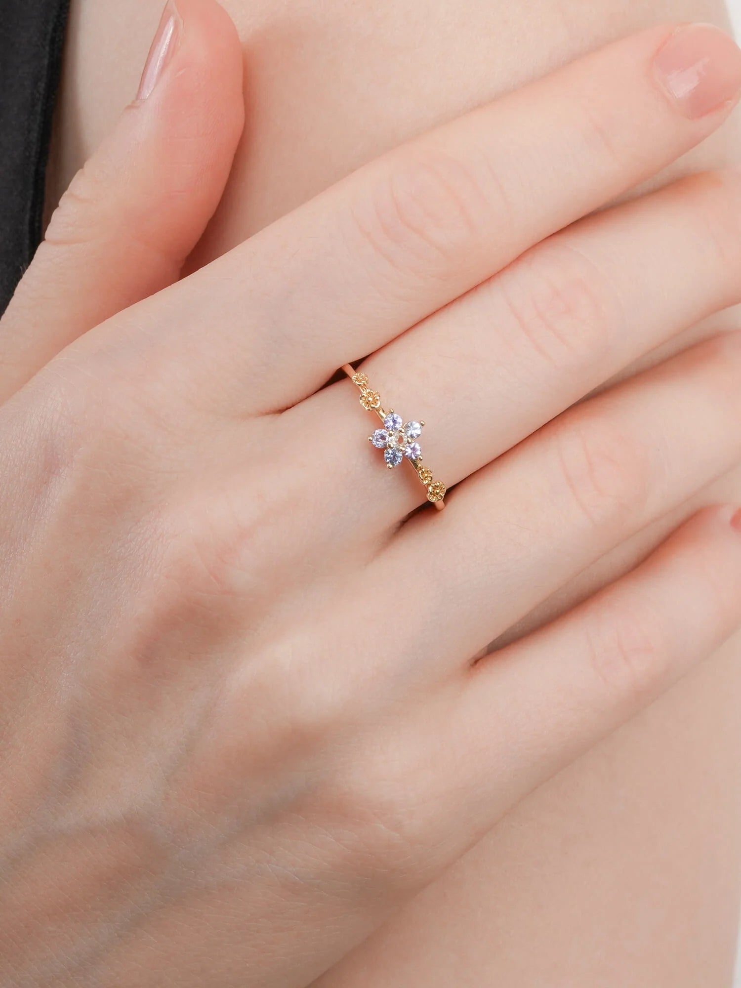 This ring embodies timeless beauty and new beginnings. The flower - shaped center has five pastel ombré tanzanite stones, and the tapered ring band is decorated with small floral accents. It is hand - made with S925 rhodium vermeil.
