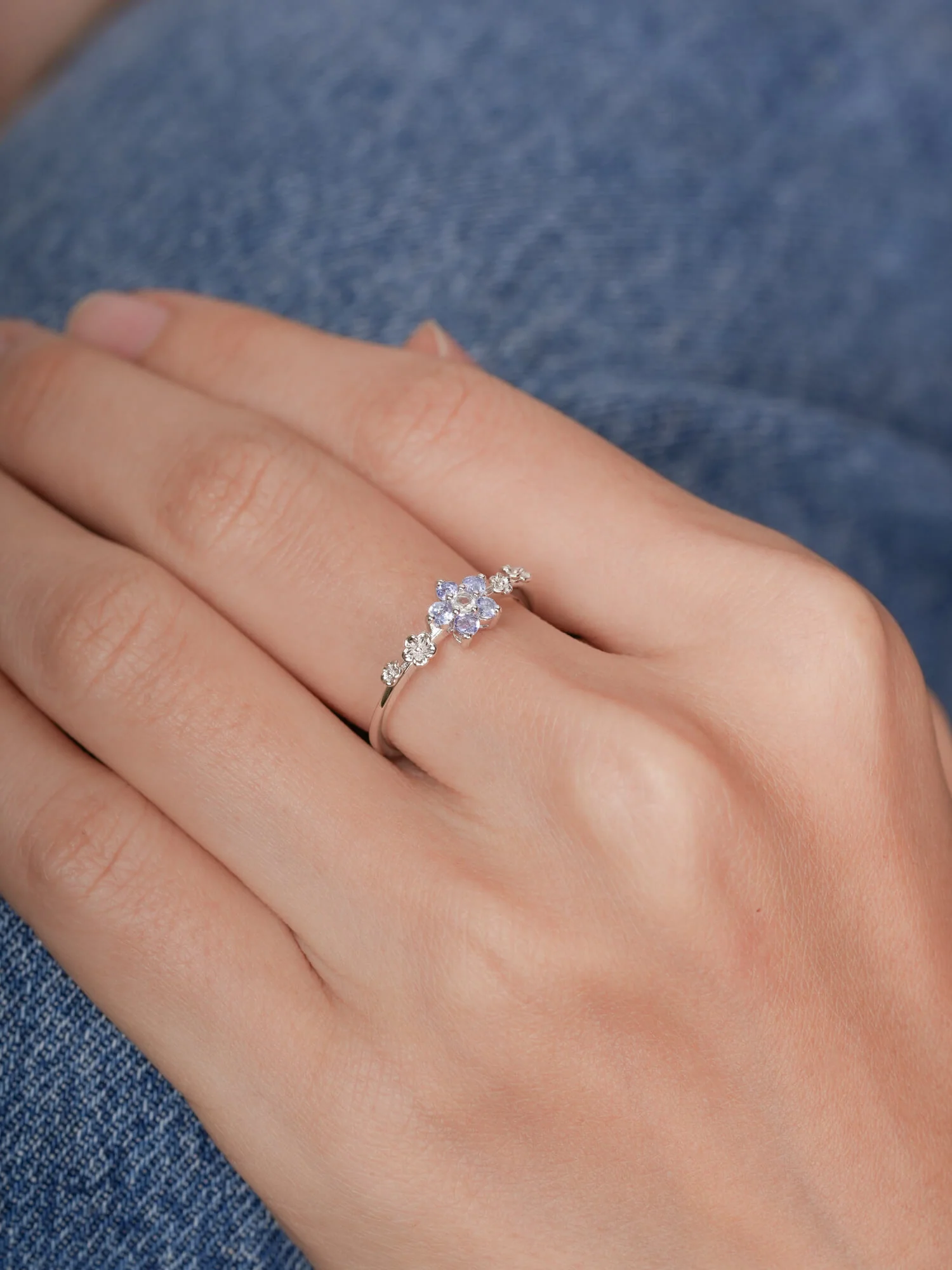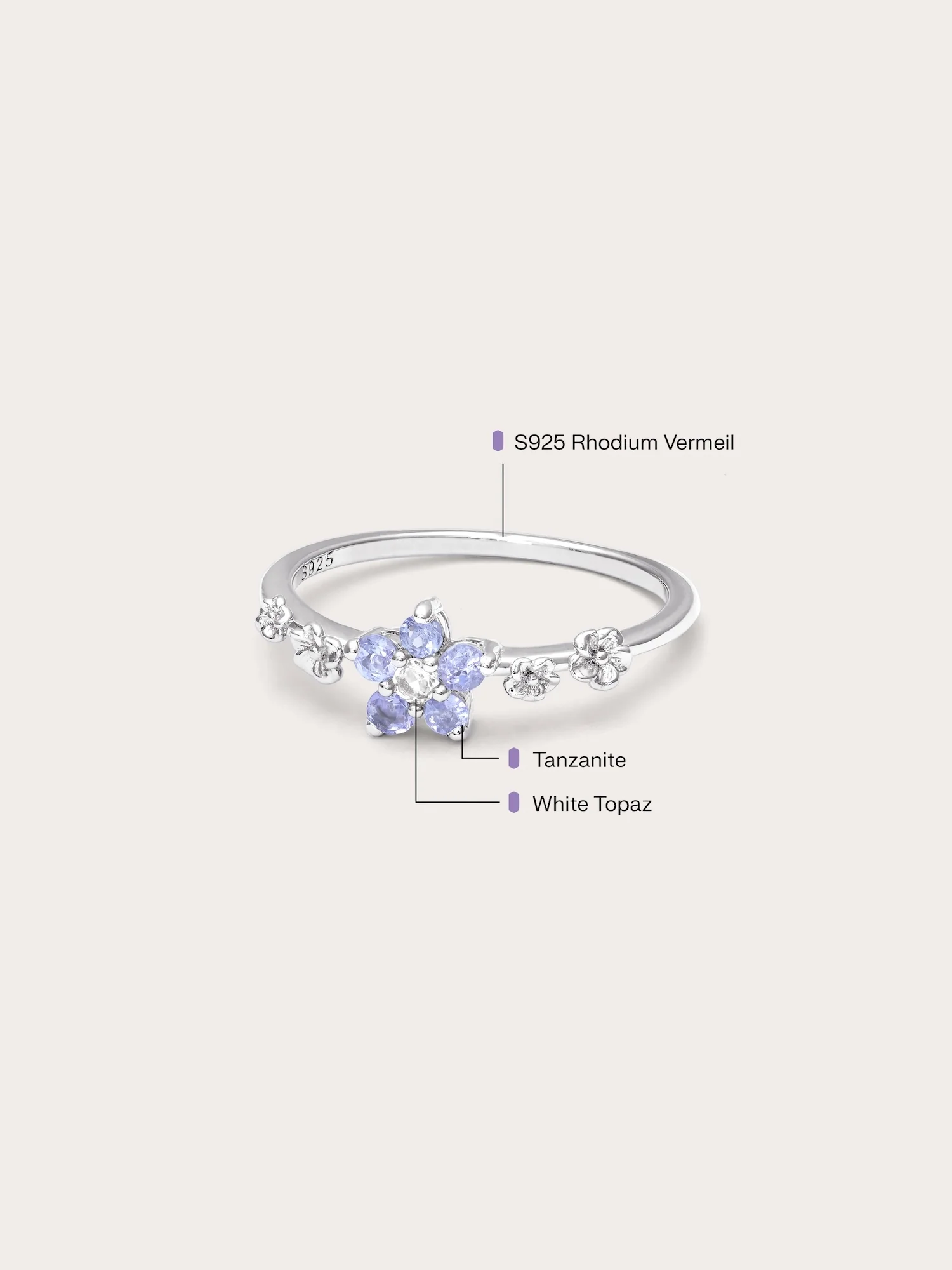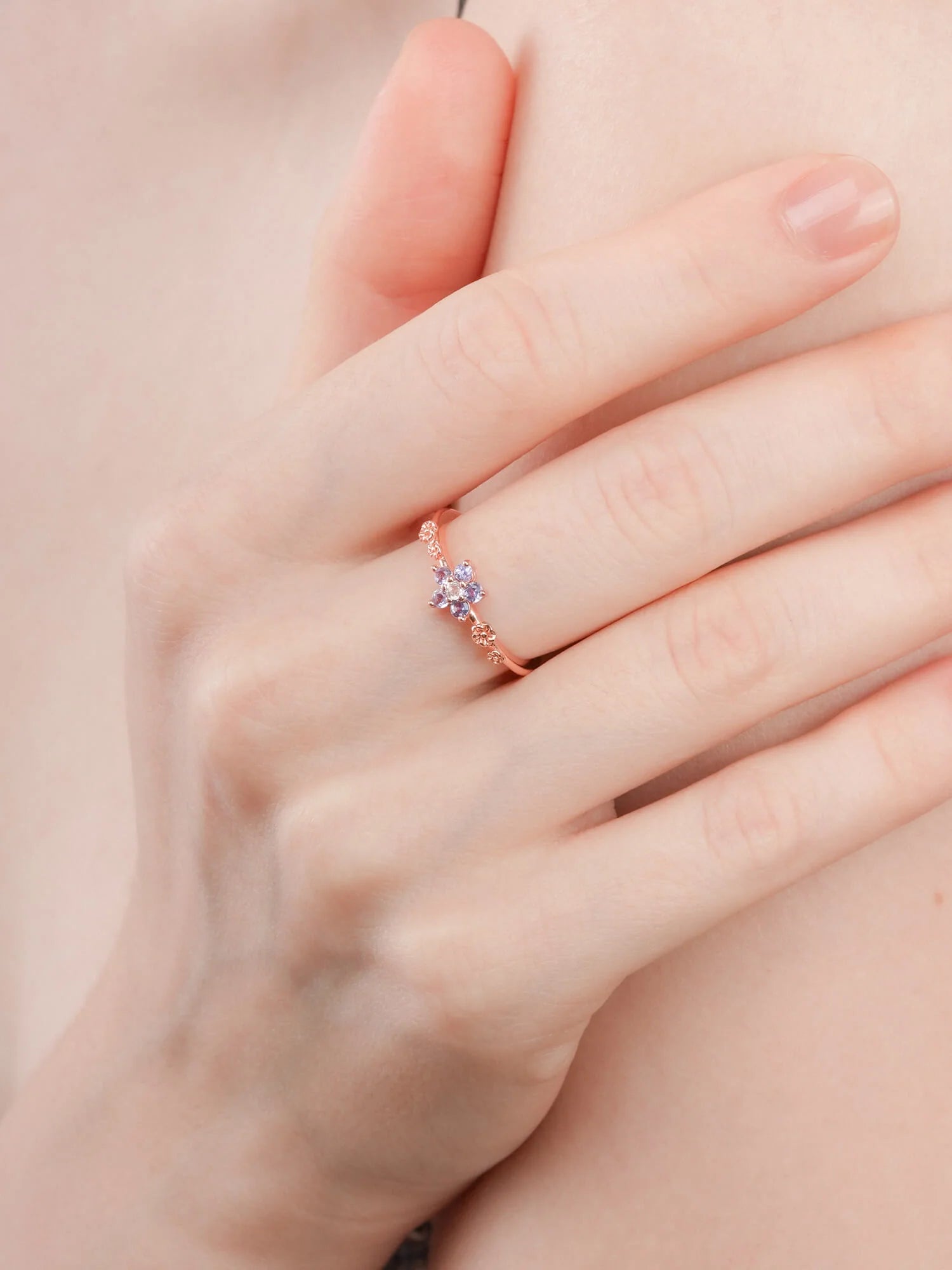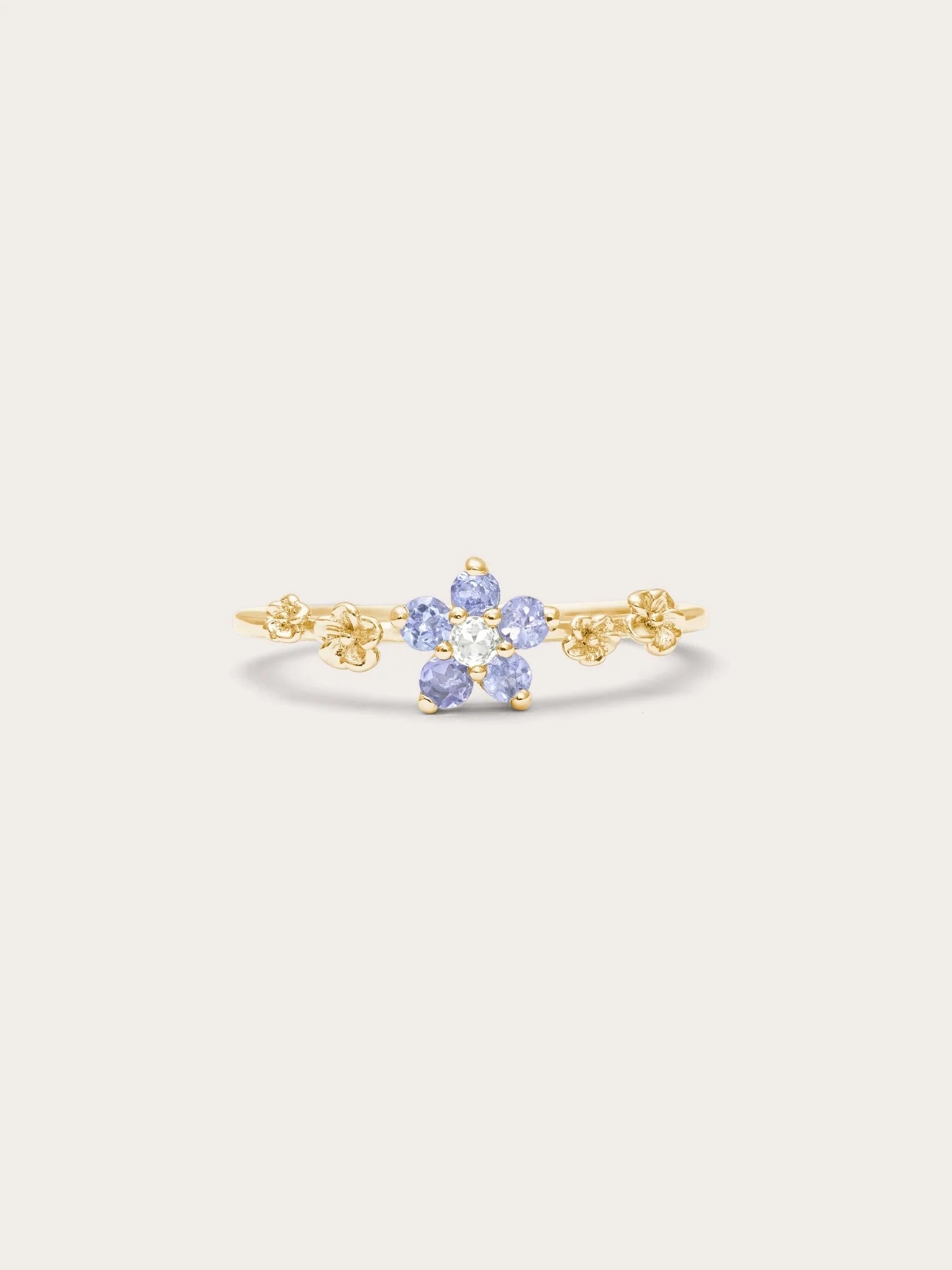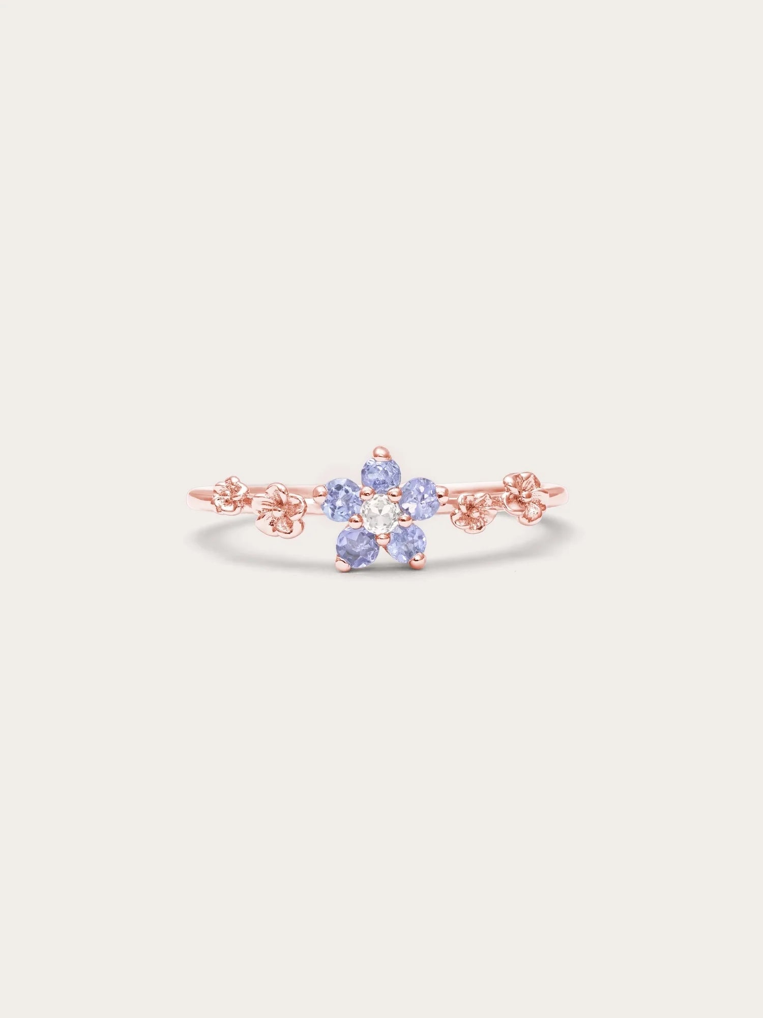 This ring embodies timeless beauty and new beginnings. The flower - shaped center has five pastel ombré tanzanite stones, and the tapered ring band is decorated with small floral accents. It is hand - made with S925 rhodium vermeil.