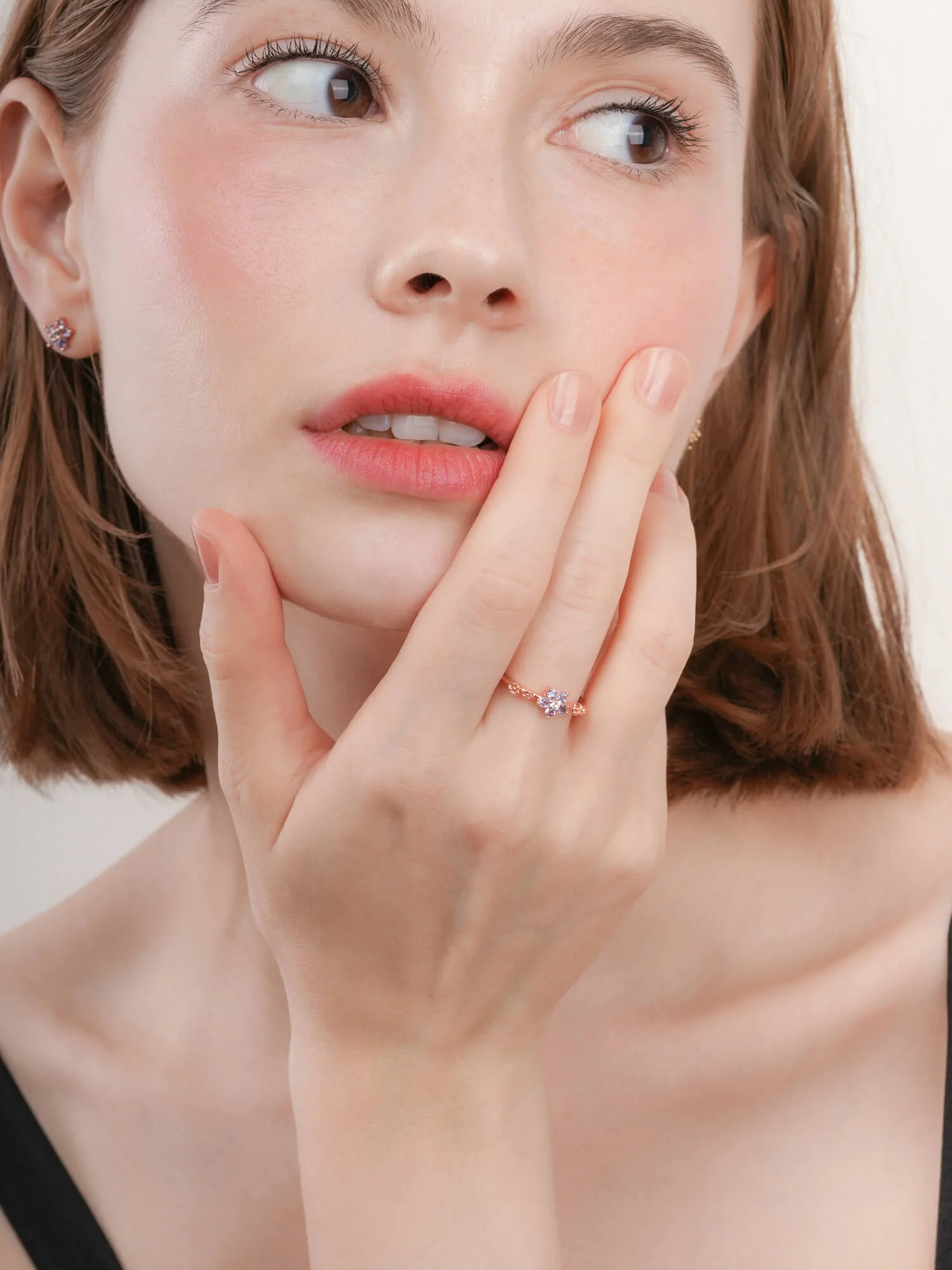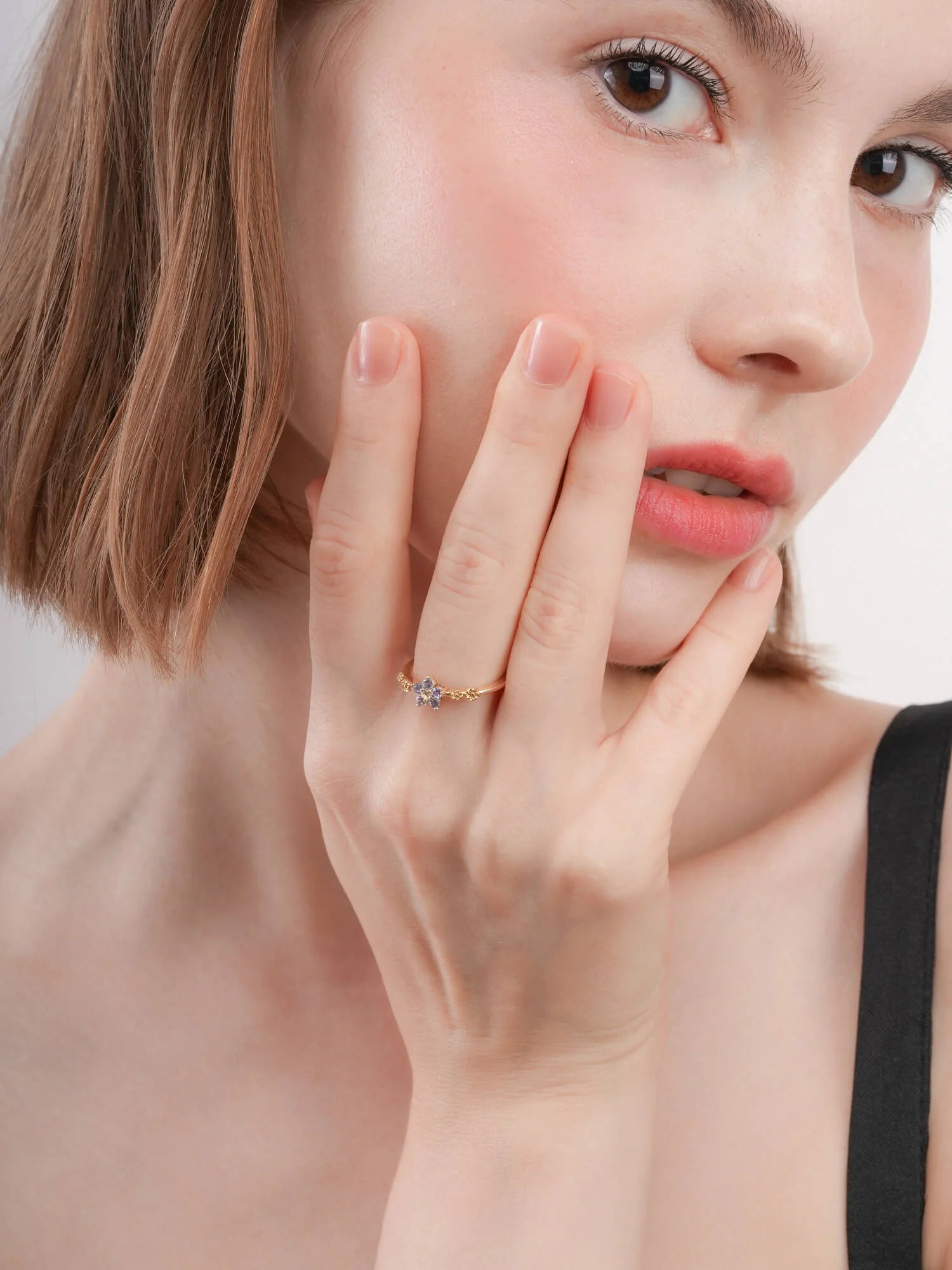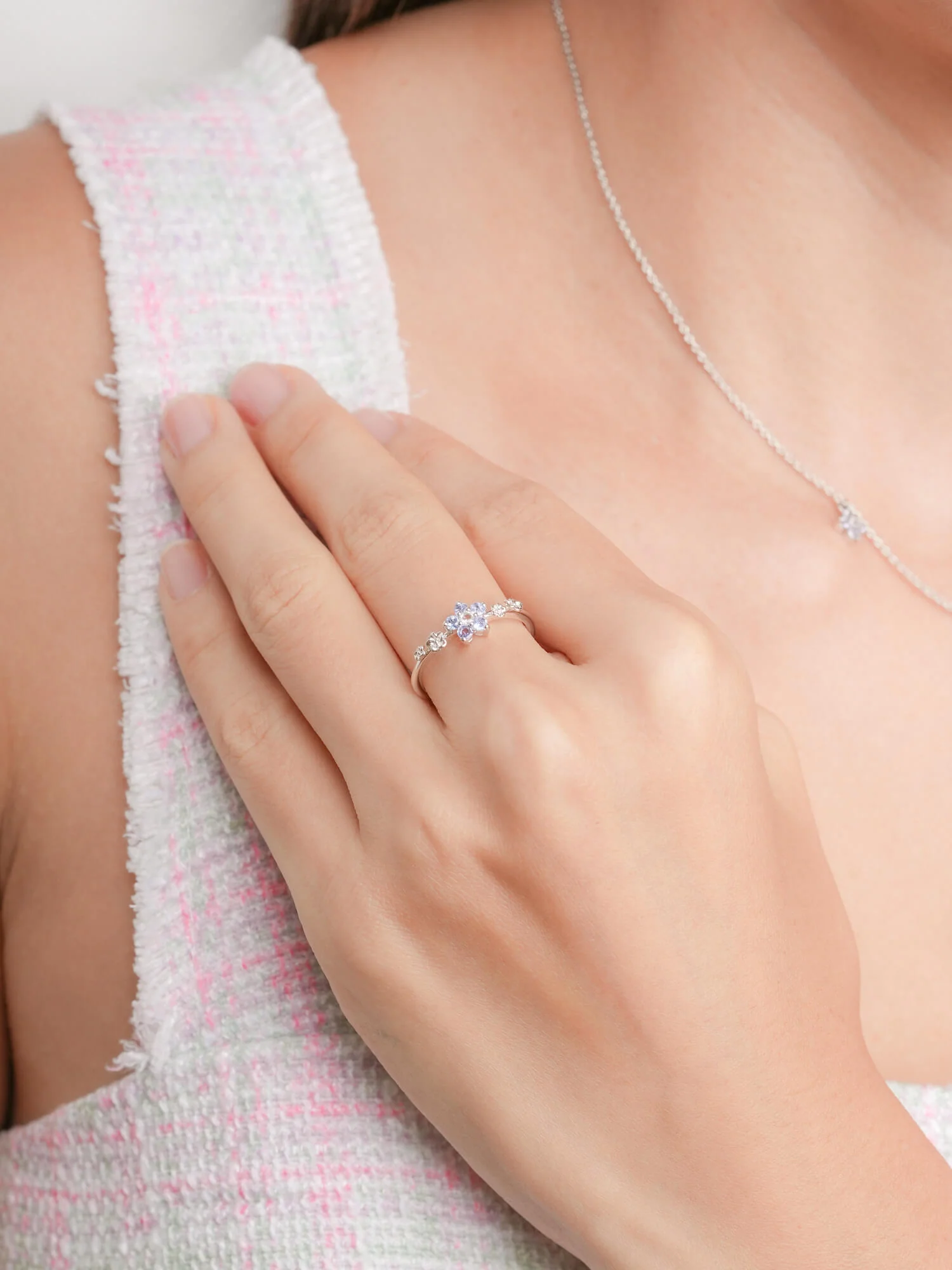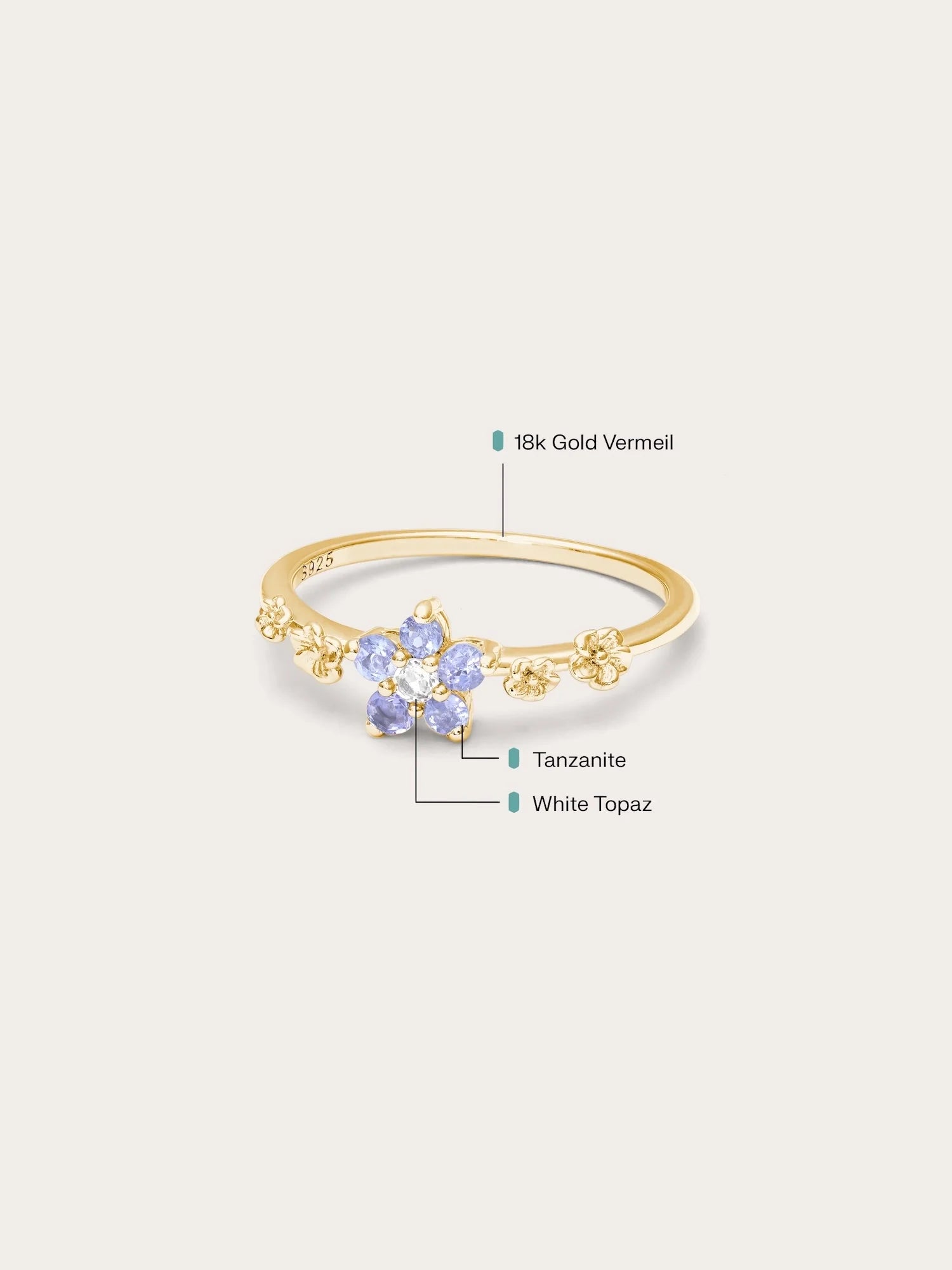 This ring embodies timeless beauty and new beginnings. The flower - shaped center has five pastel ombré tanzanite stones, and the tapered ring band is decorated with small floral accents. It is hand - made with S925 rhodium vermeil.