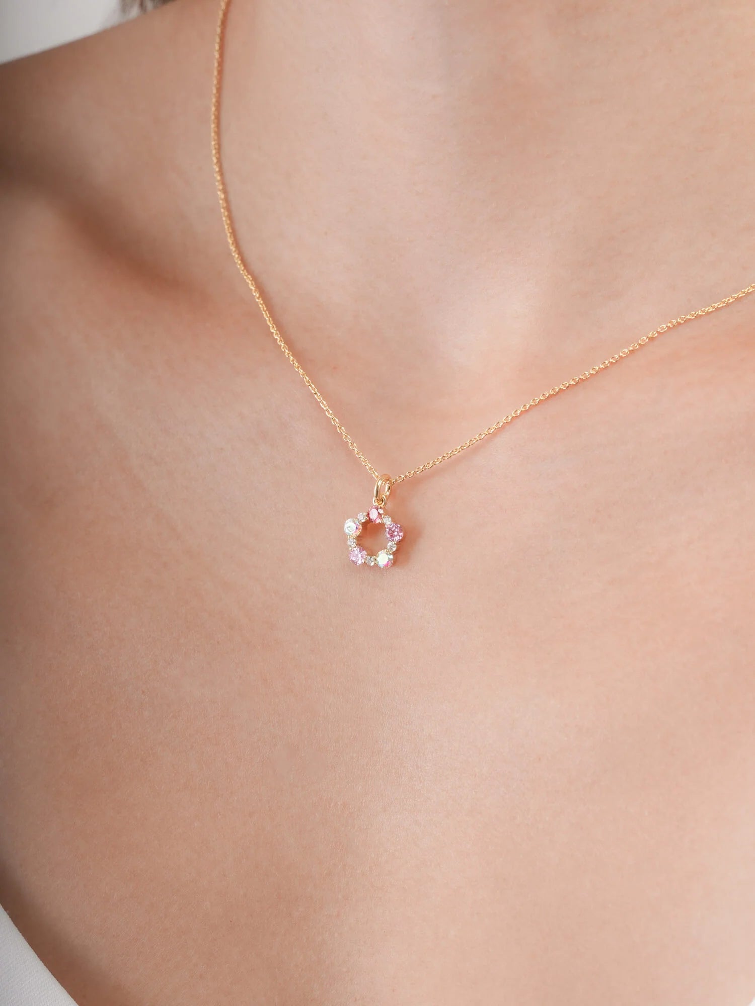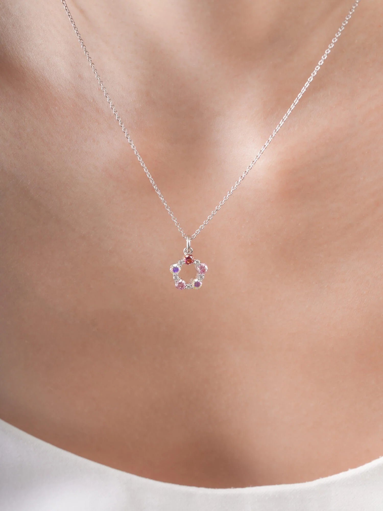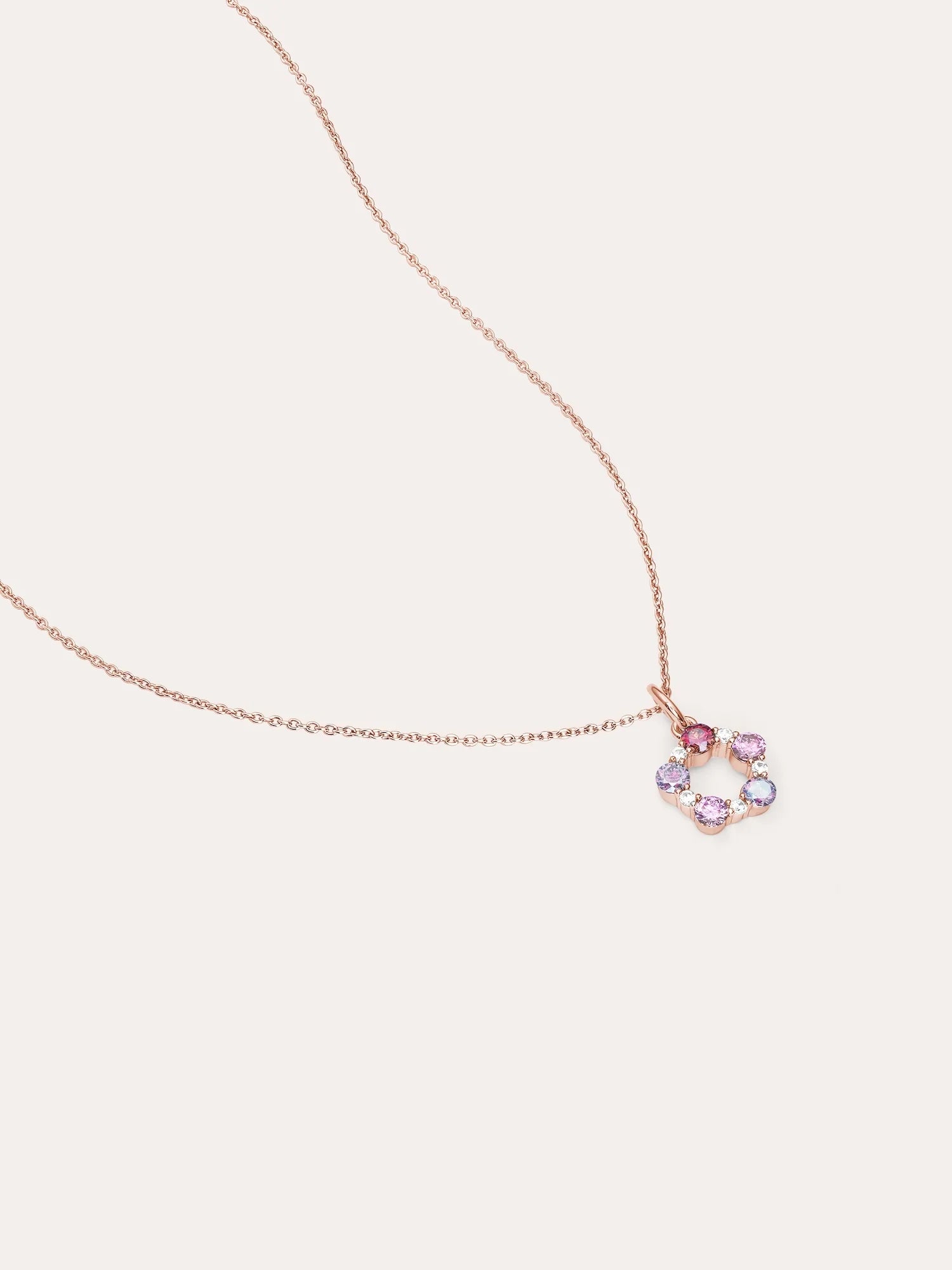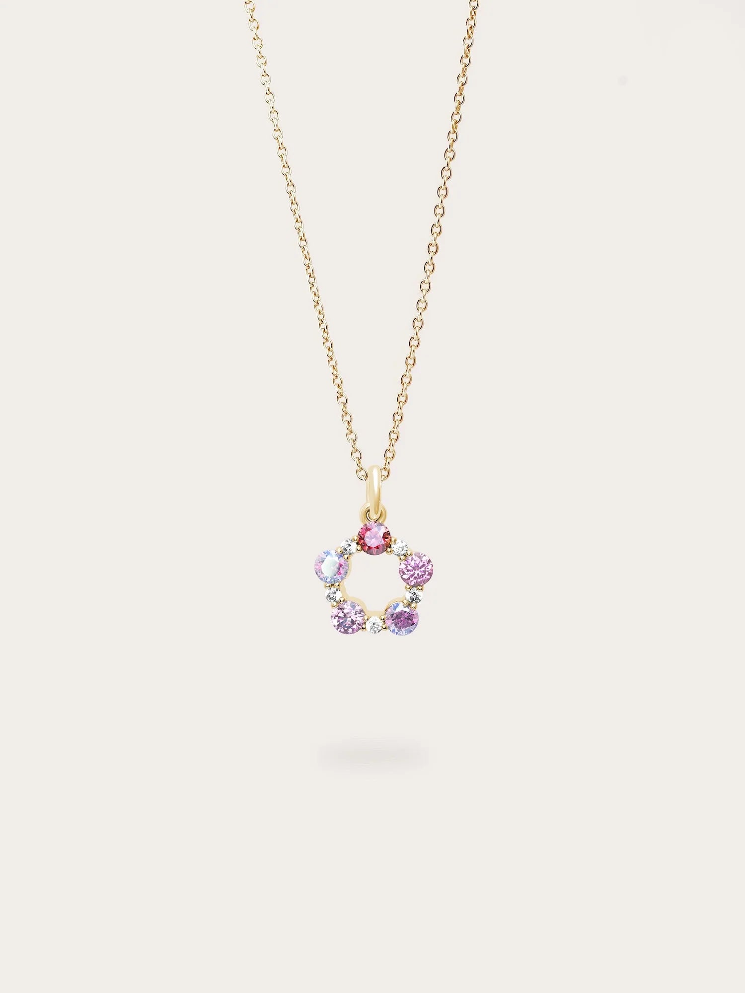 Inspired by the vivid colors of spring, this necklace features 5 moissanite stones arranged in ombre shades of red, pink, and white. Crafted in 18k gold vermeil, it captures the charm of blooming meadows.