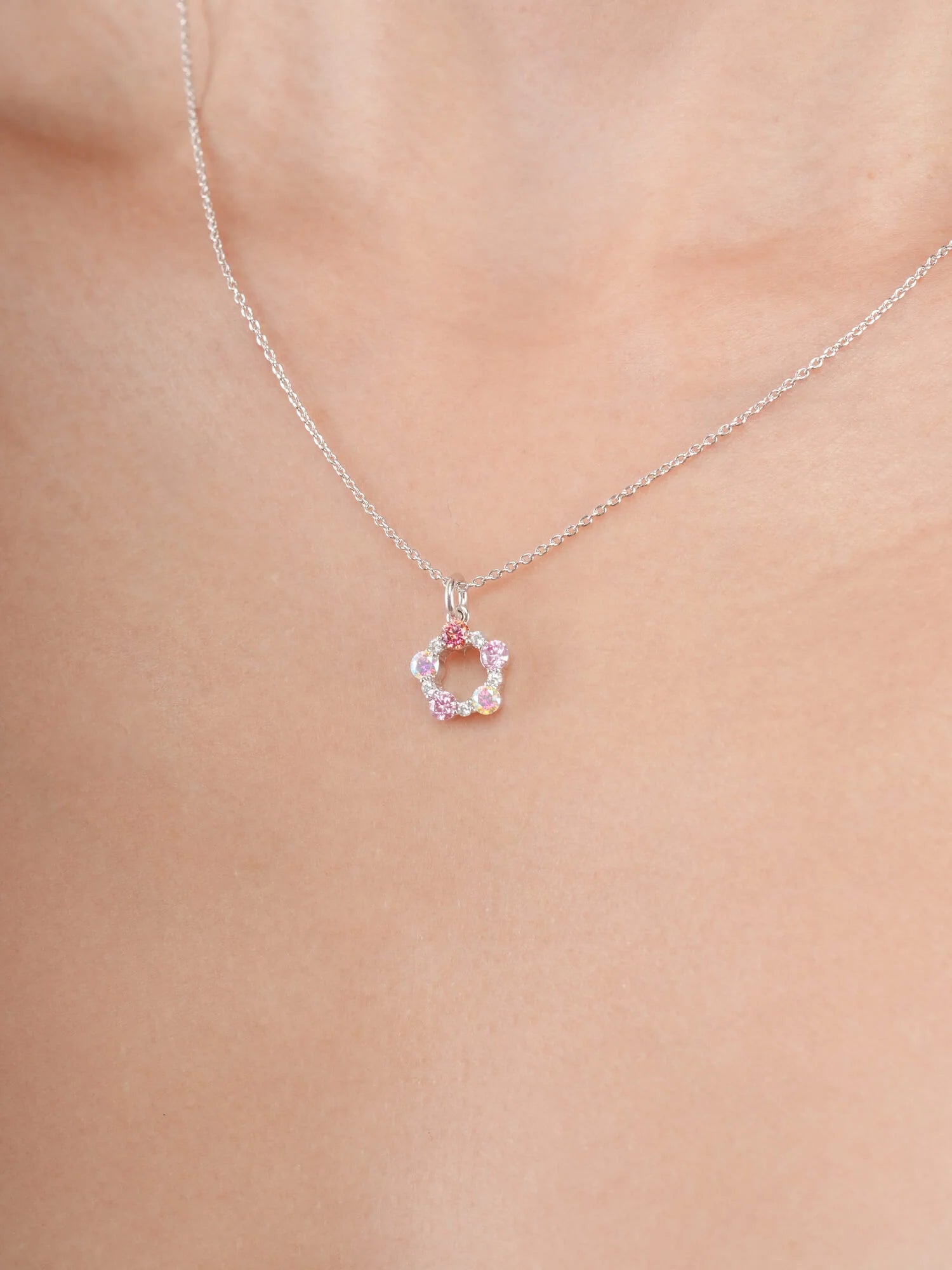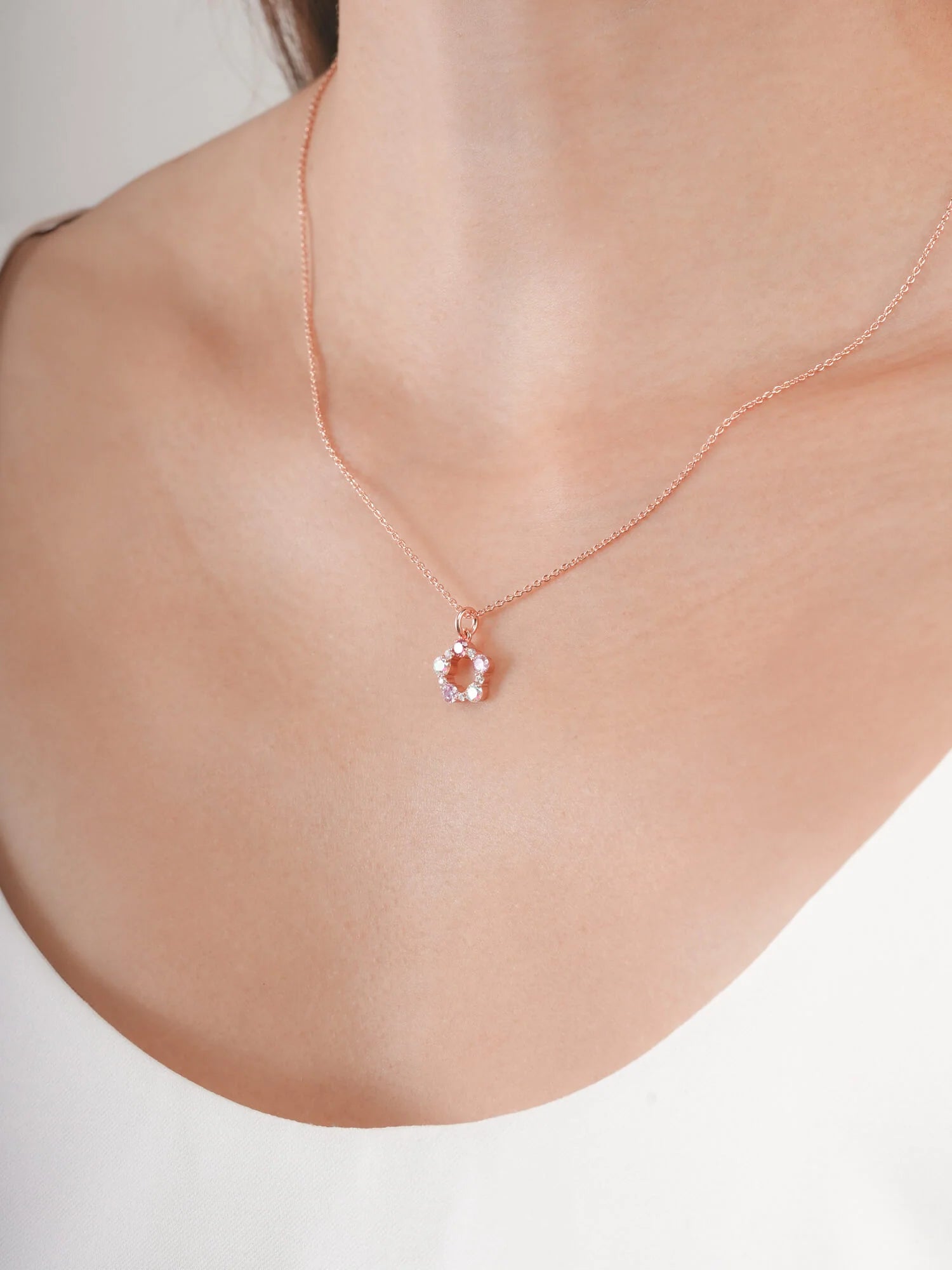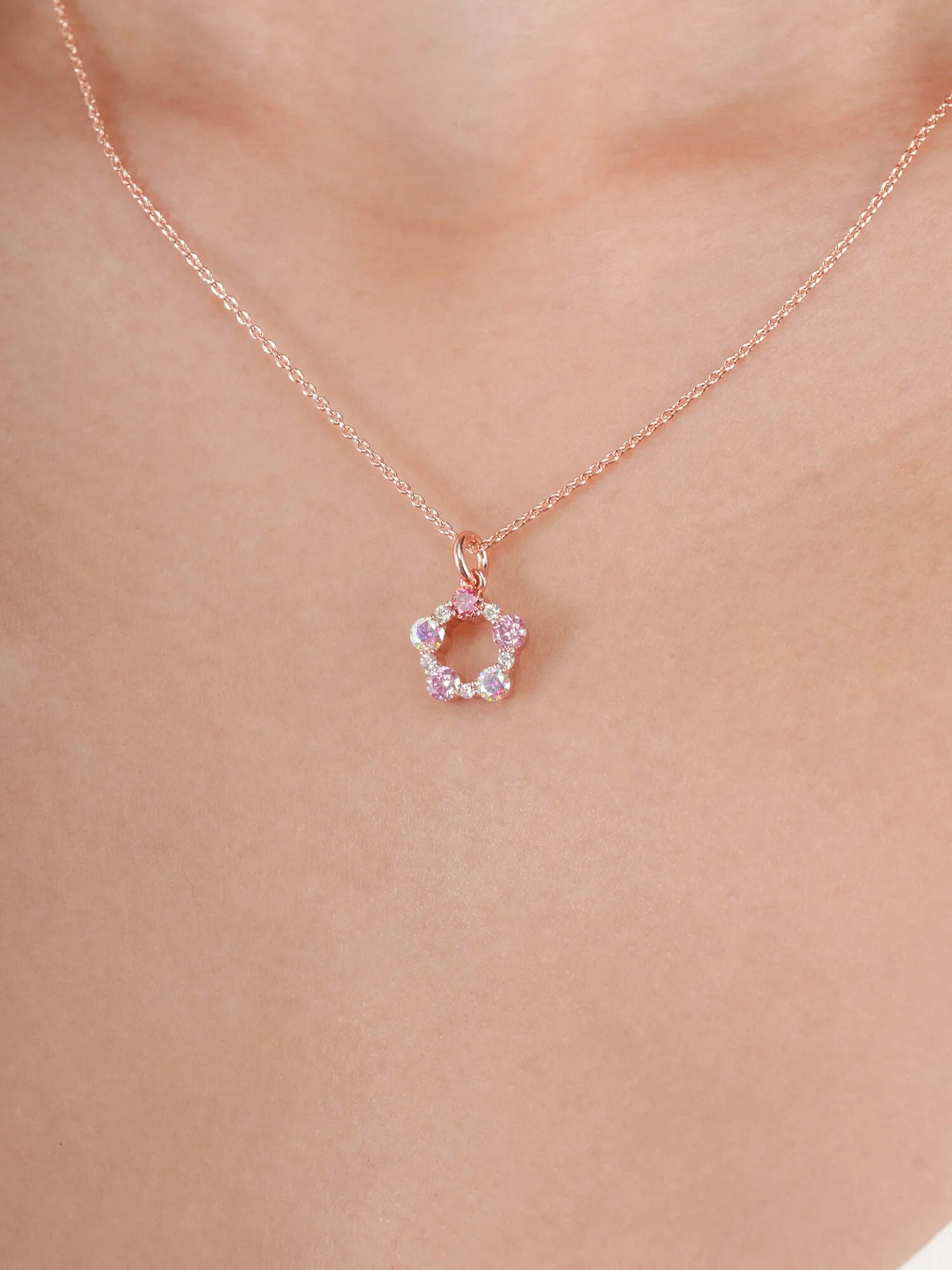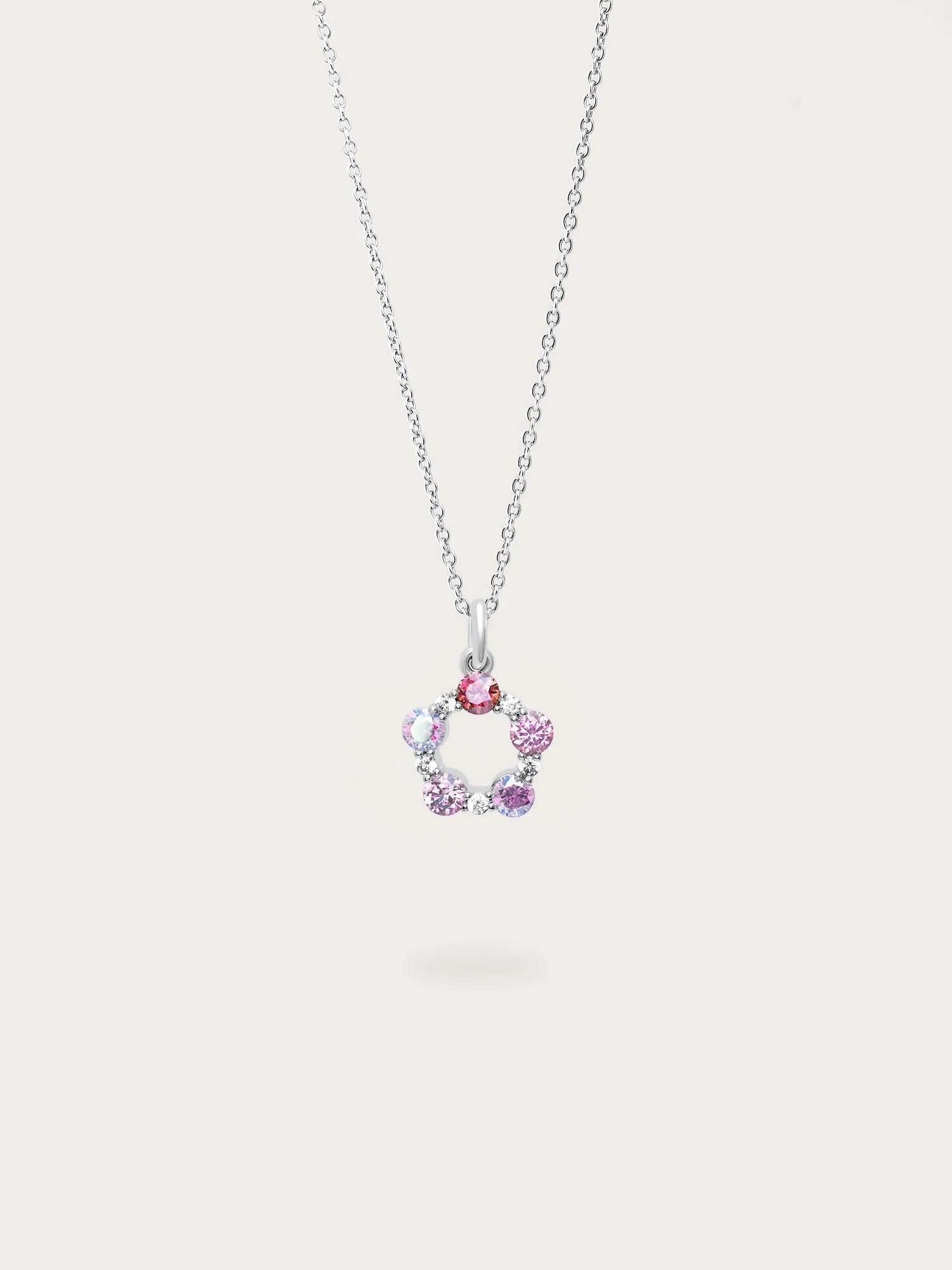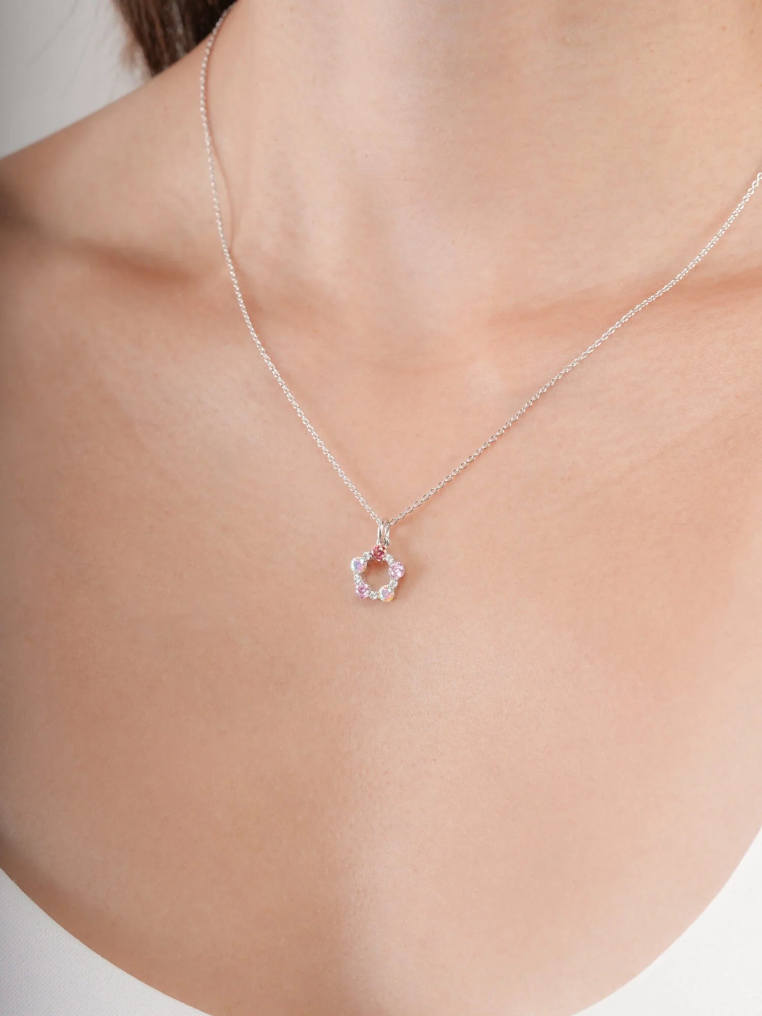 Inspired by the vivid colors of spring, this necklace features 5 moissanite stones arranged in ombre shades of red, pink, and white. Crafted in 18k gold vermeil, it captures the charm of blooming meadows.