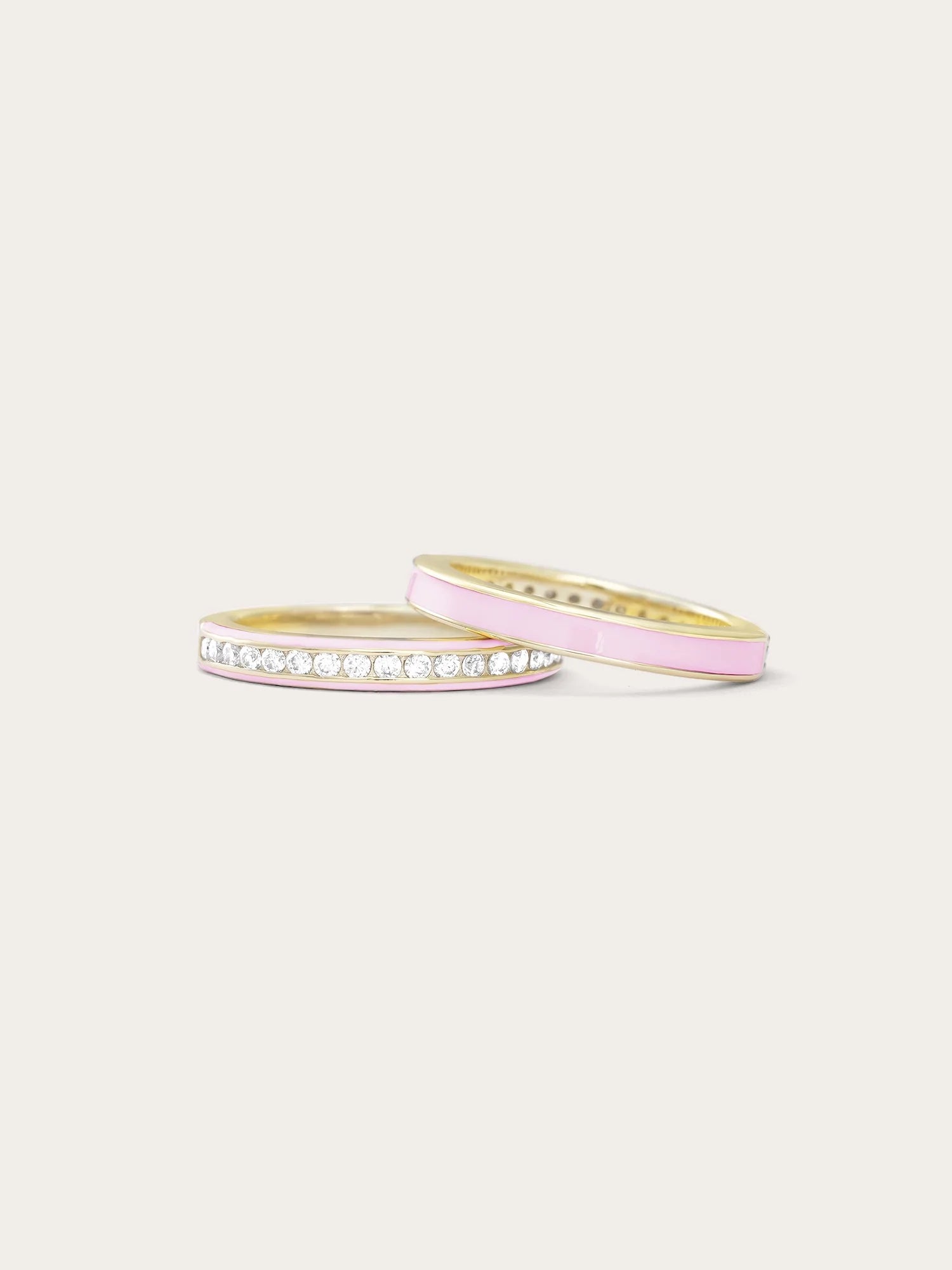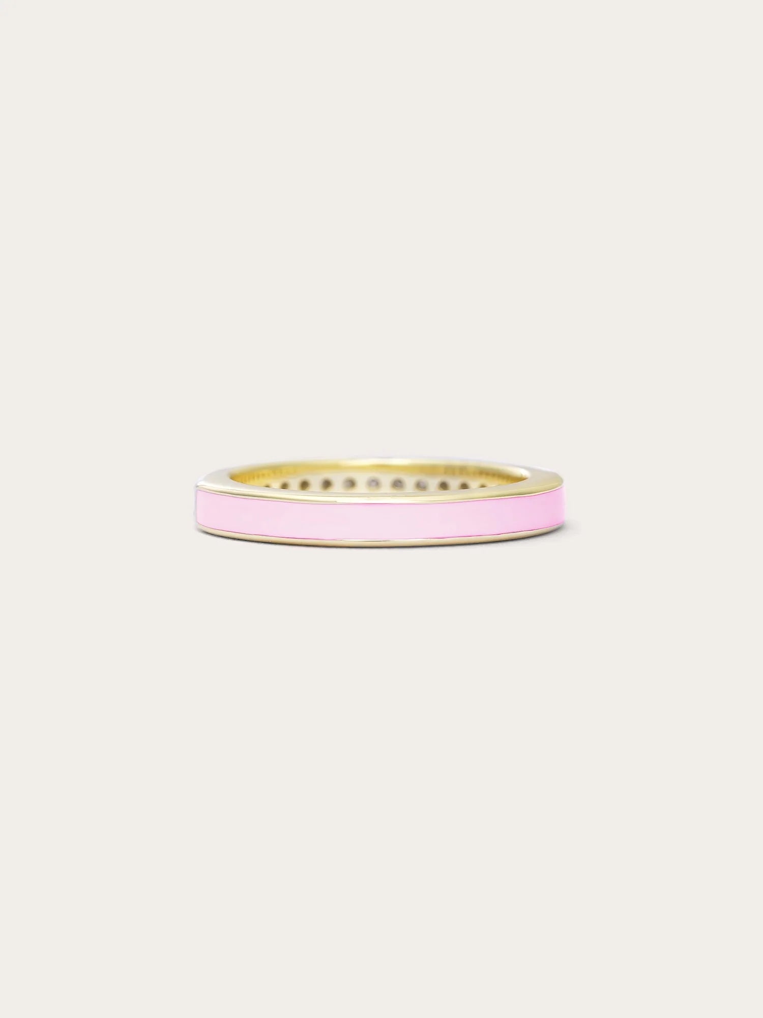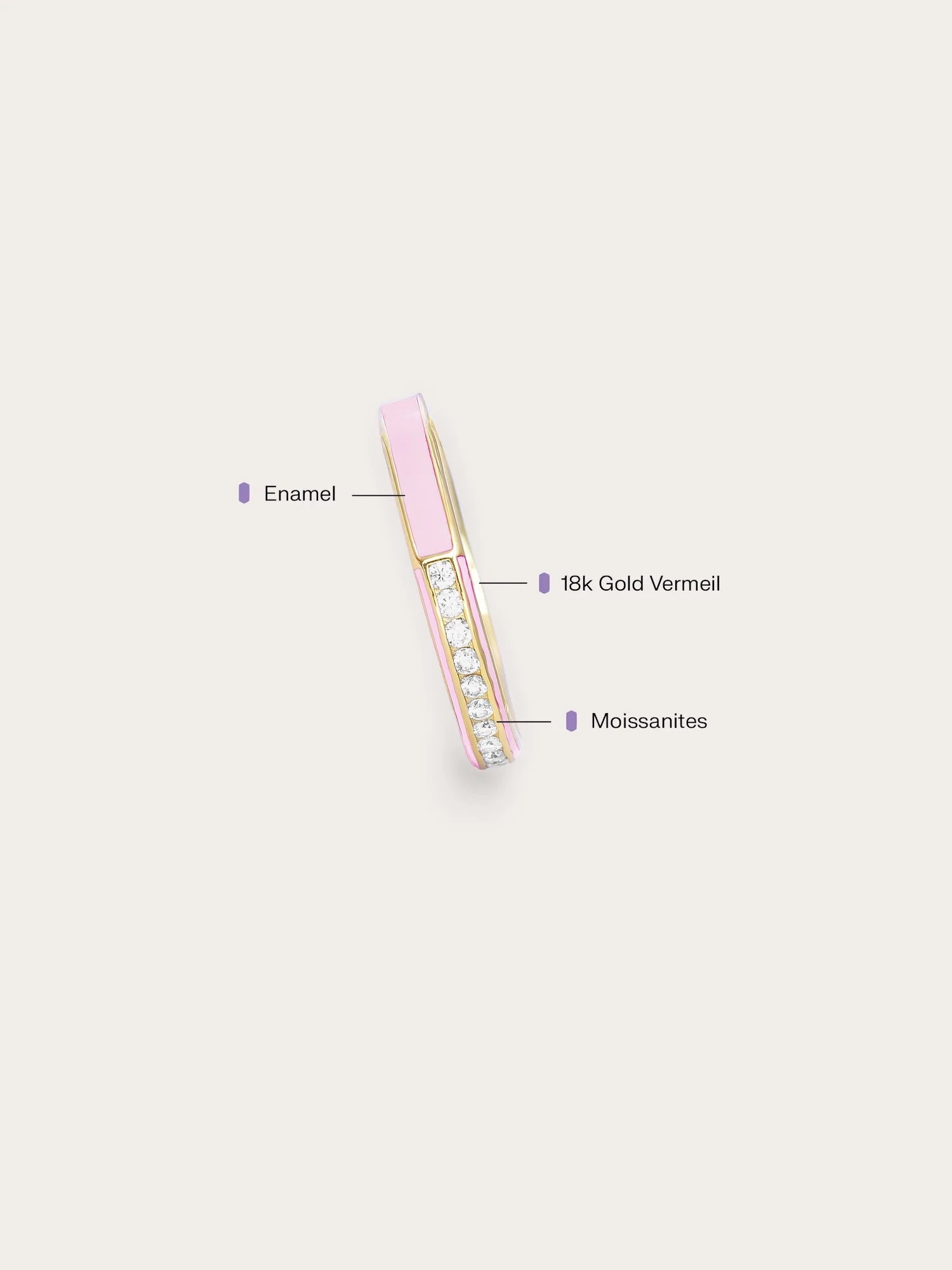 The Pink Enamel Moissanite Band is a reversible pink enamel ring designed to offer two styles in one. One side features a smooth pastel pink enamel finish, while the other sparkles with a row of pavé moissanites. Handcrafted in 18k gold vermeil.