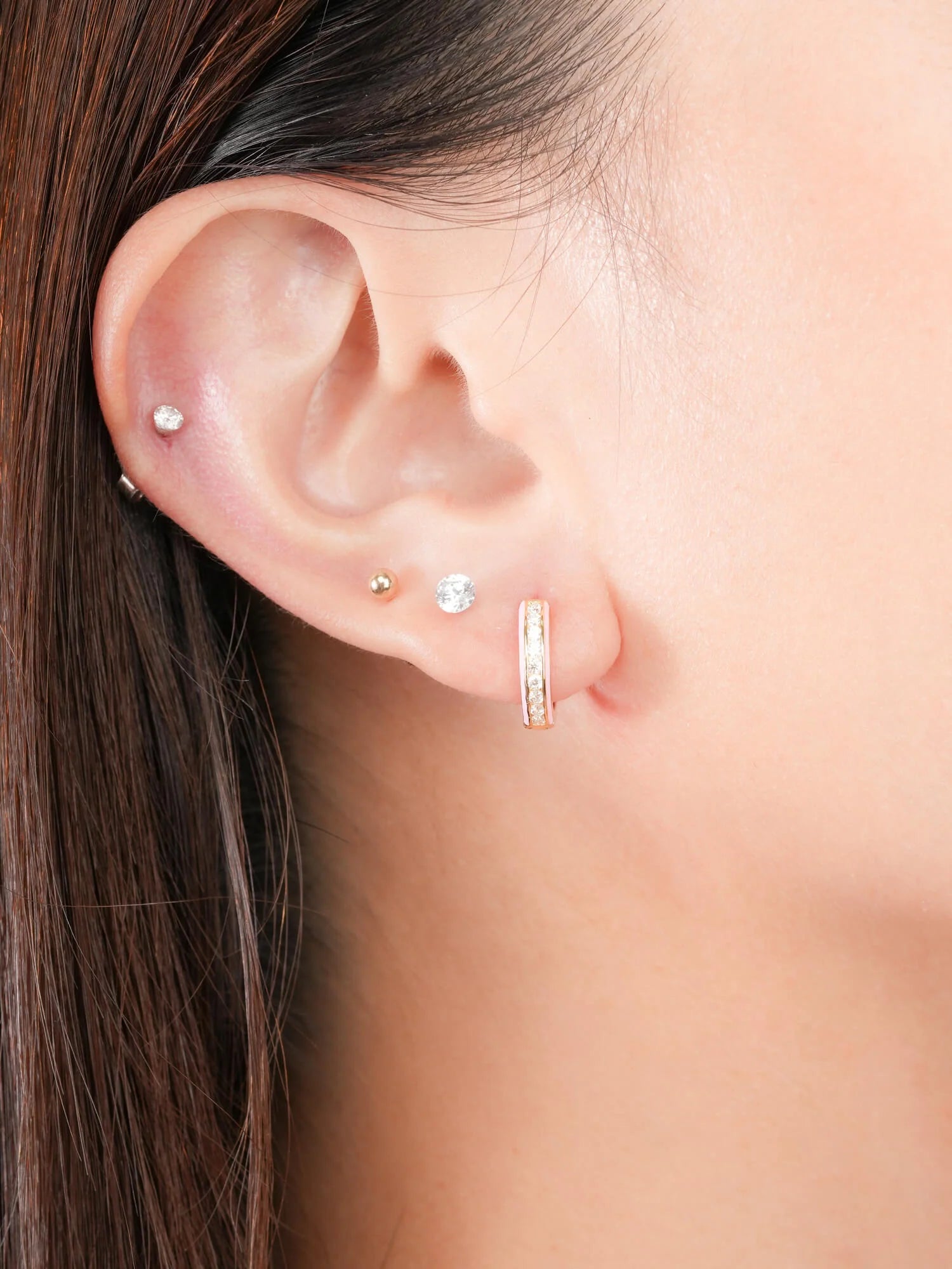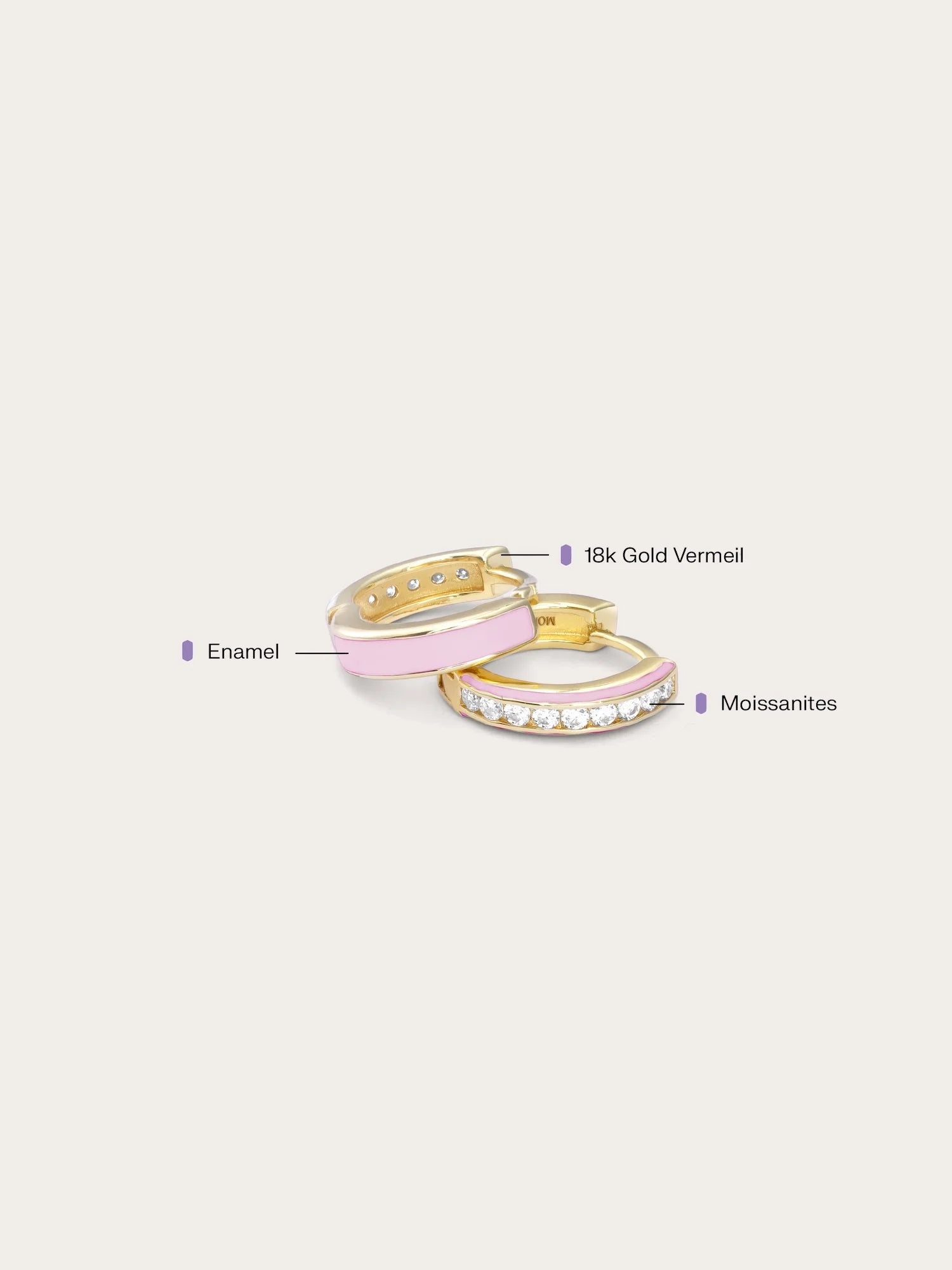 You can wear these reversible huggie earrings in two ways. One side sparkles with pavé moissanites (with a touch of color), and the other side has a simple pastel pink enamel finish. They are hand - crafted with 18k gold vermeil.