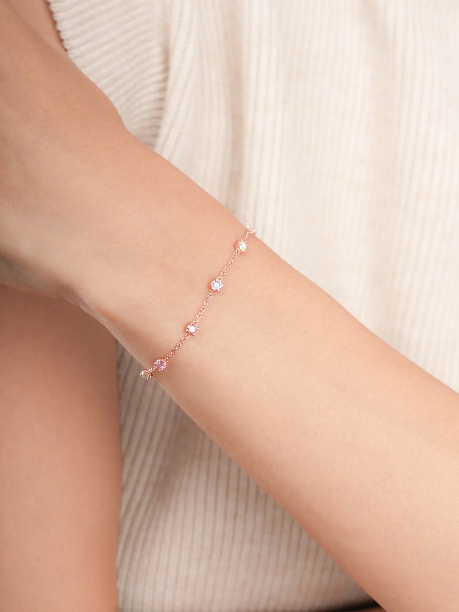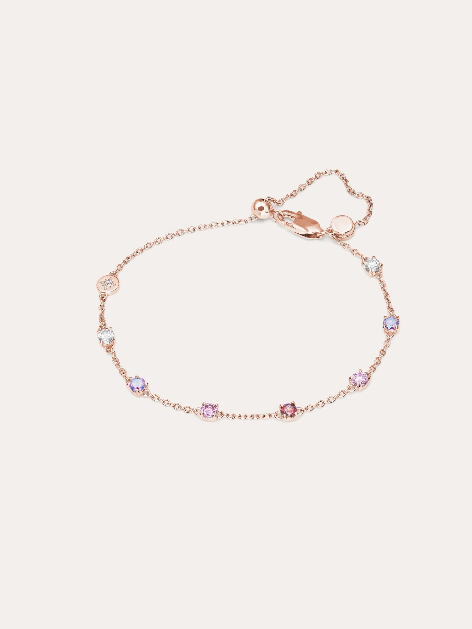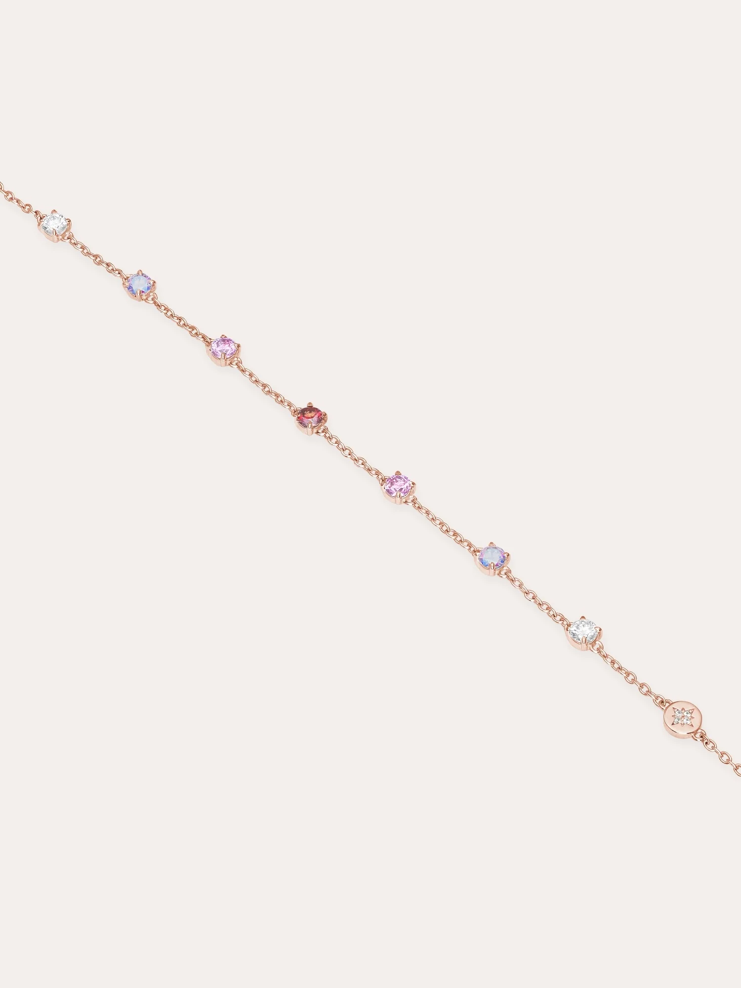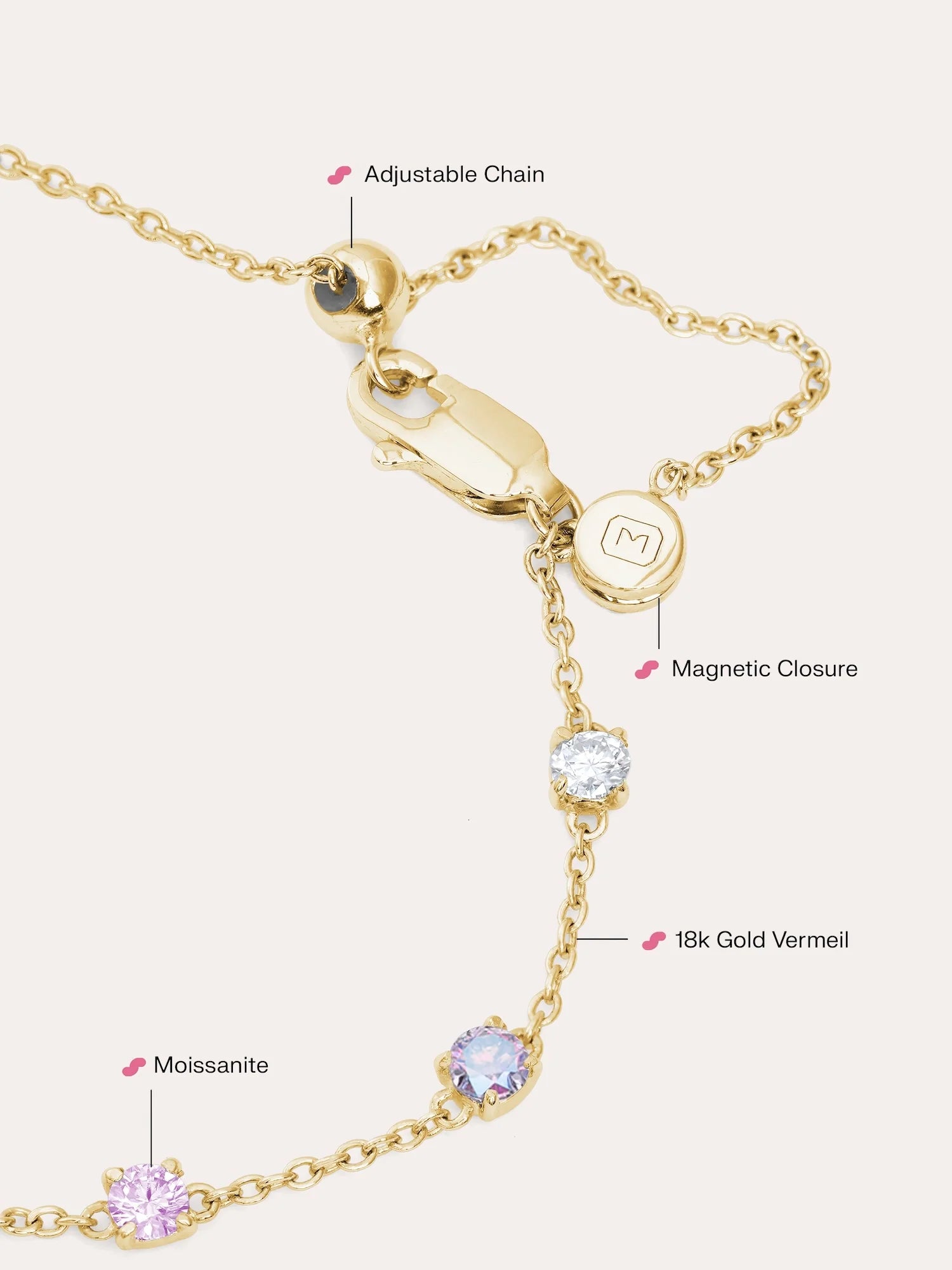This bracelet features a gradient of 7 hand-set moissanite stones in ombre shades of red, pink, and white. Inspired by the beautiful colors of spring flowers, this delicate design symbolizes new beginnings. It is handcrafted in 18k gold vermeil.